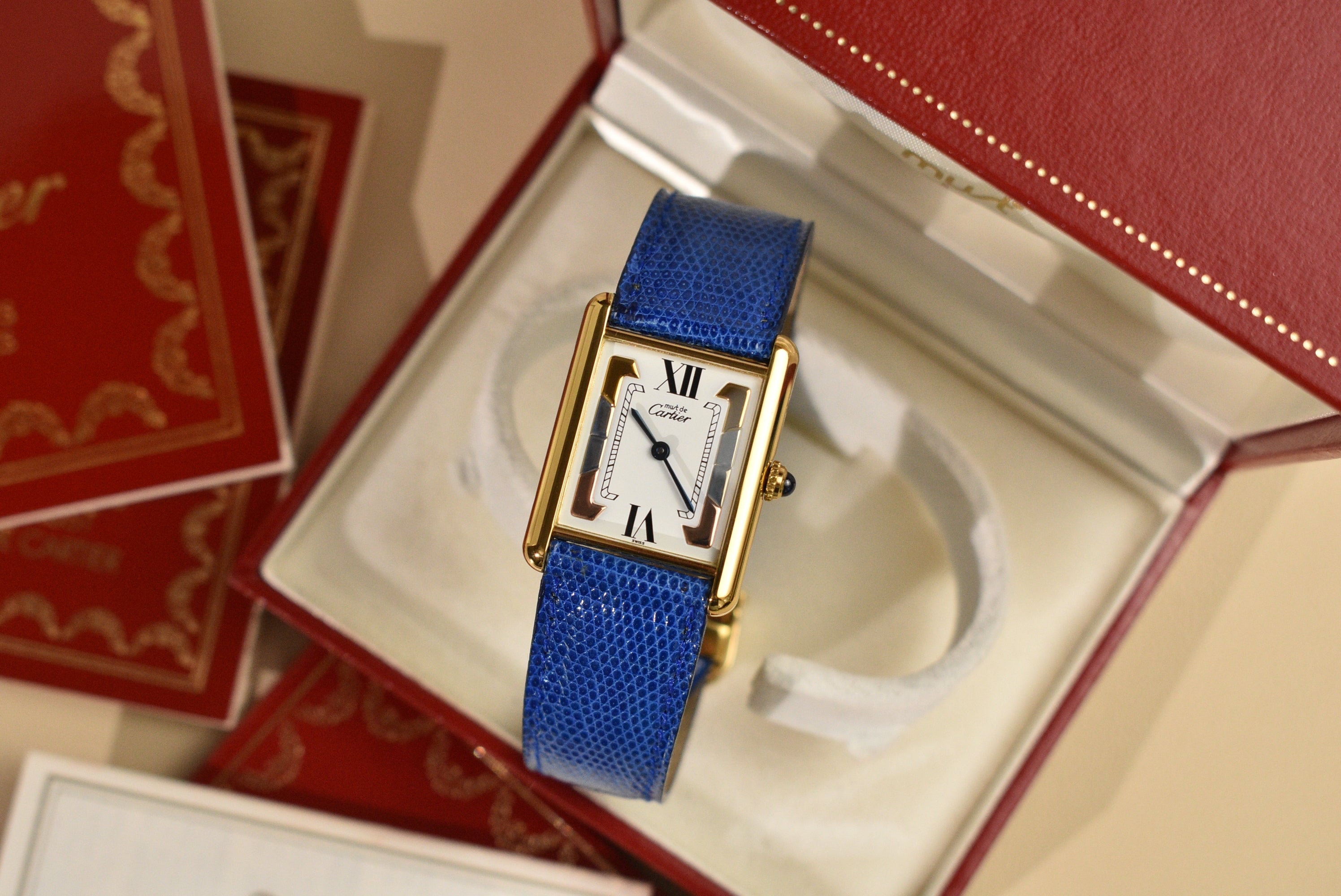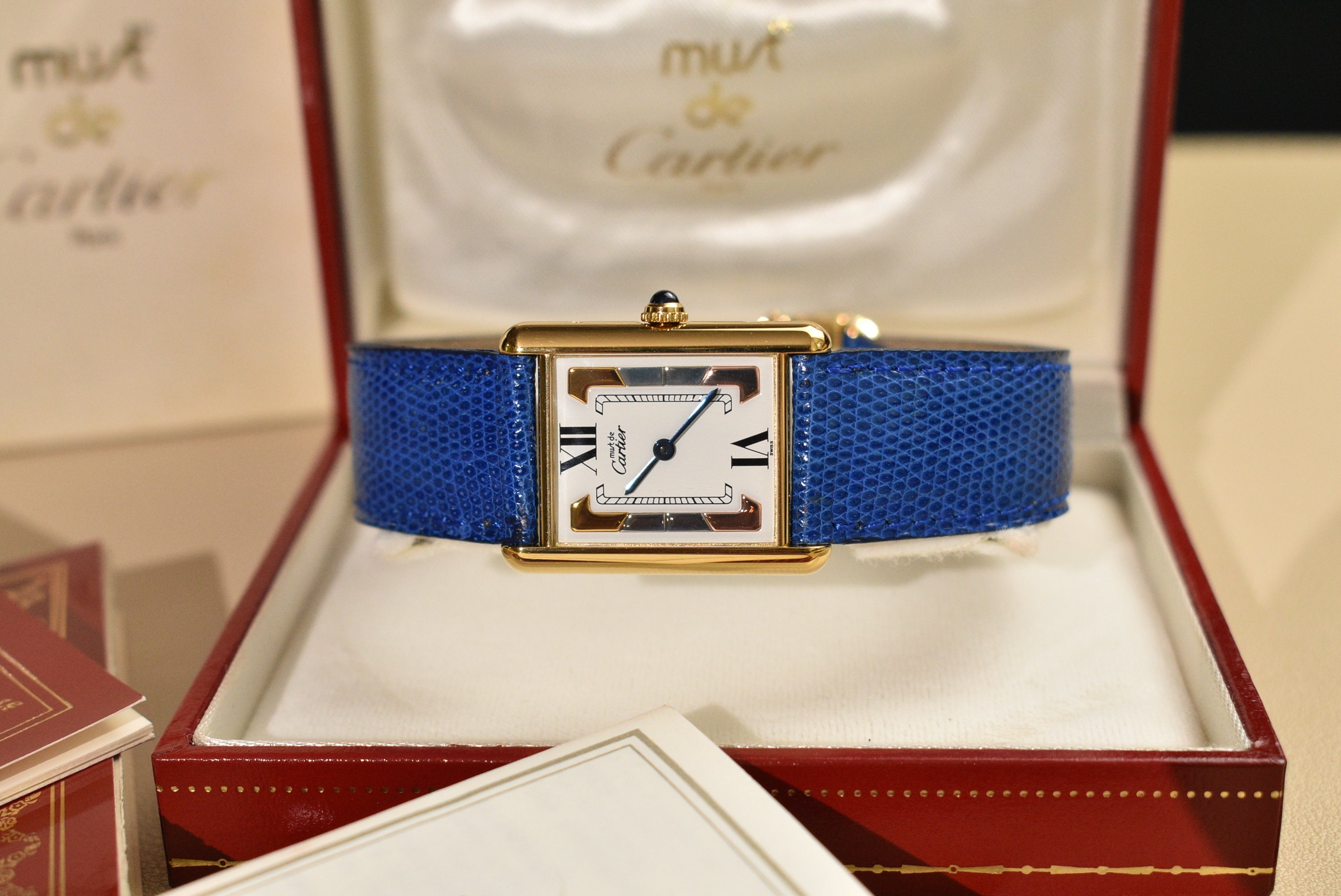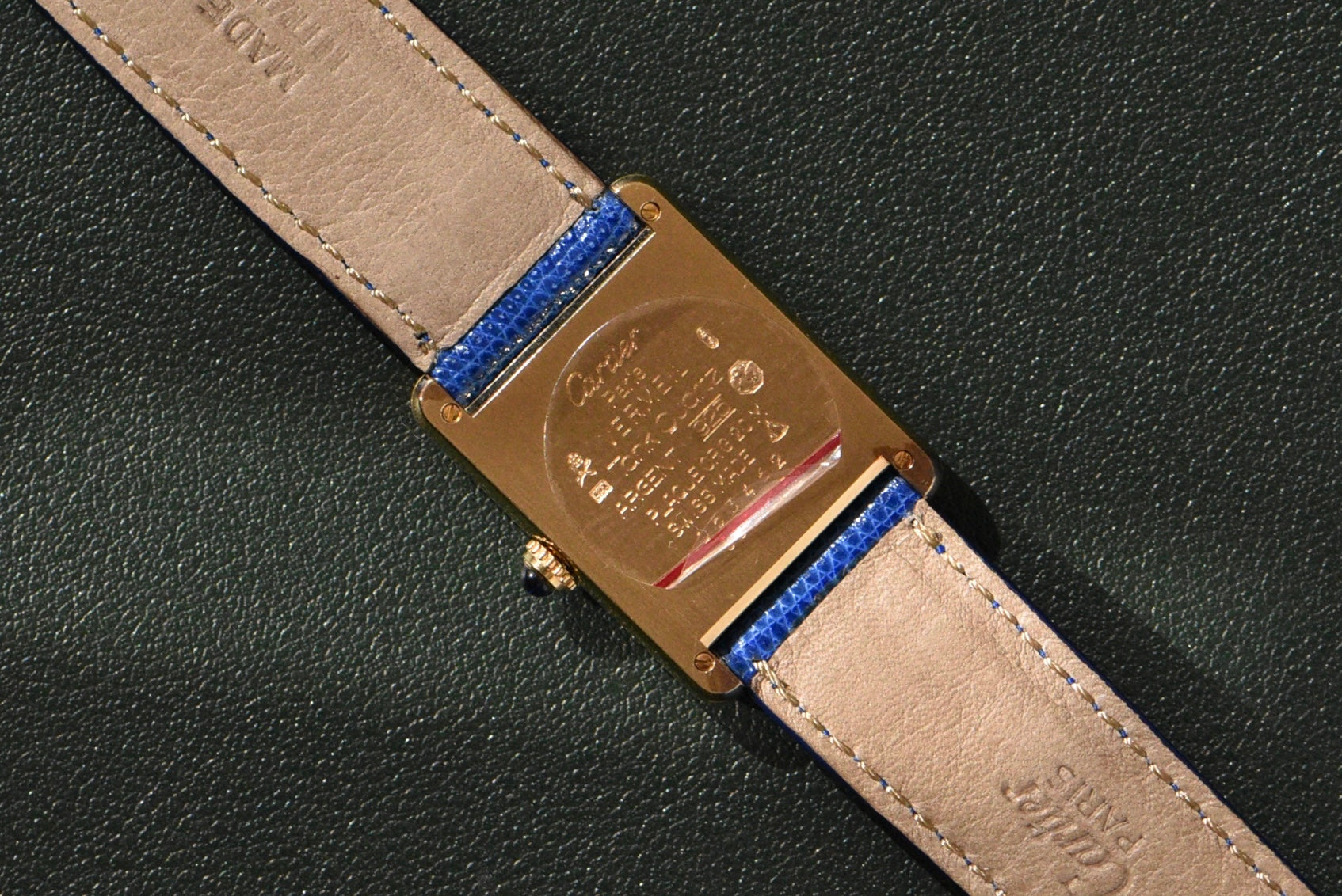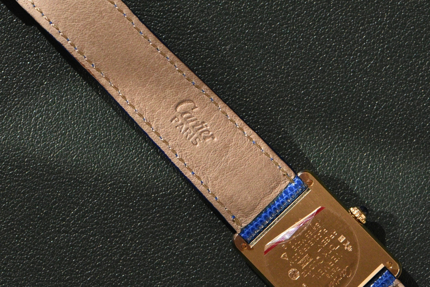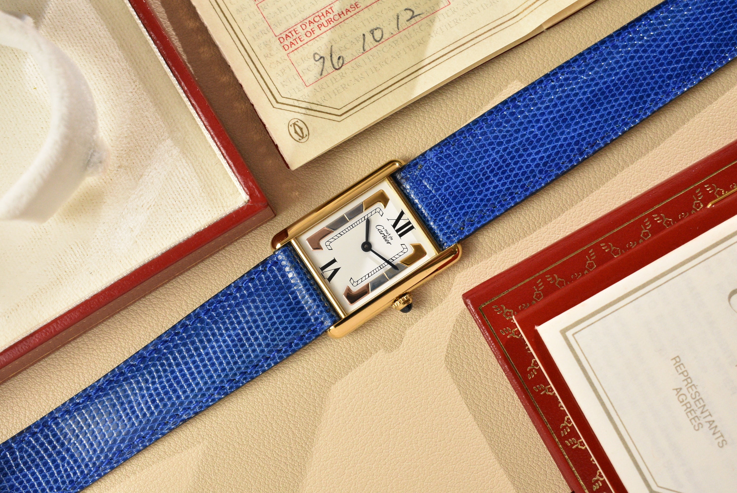 This dial is relatively uncommon in the world of neo-vintage Tanks. The watch is brand new and unworn with its original lizard blue strap. The watch is a complete set from 1996. A very rare find when it comes to condition, it even has its original case back still intact.