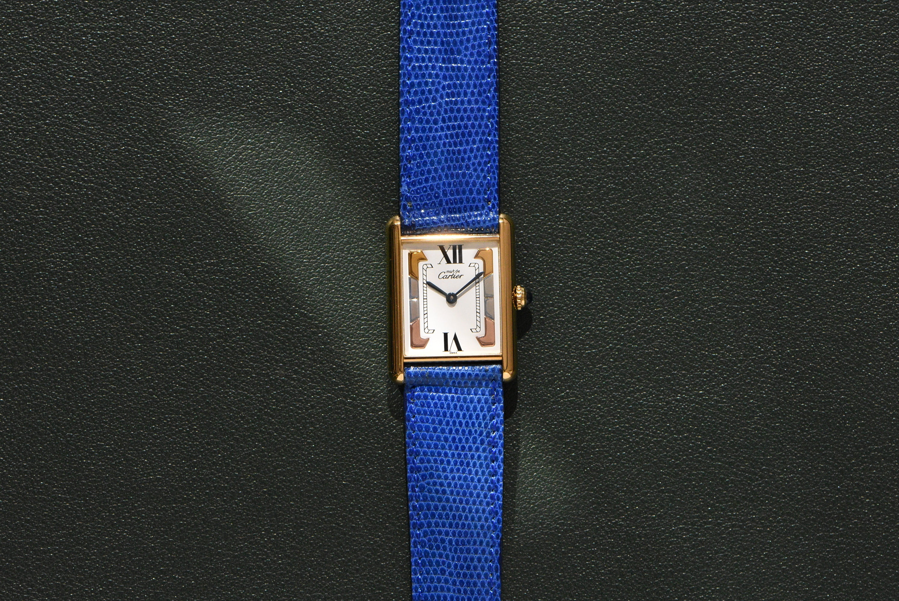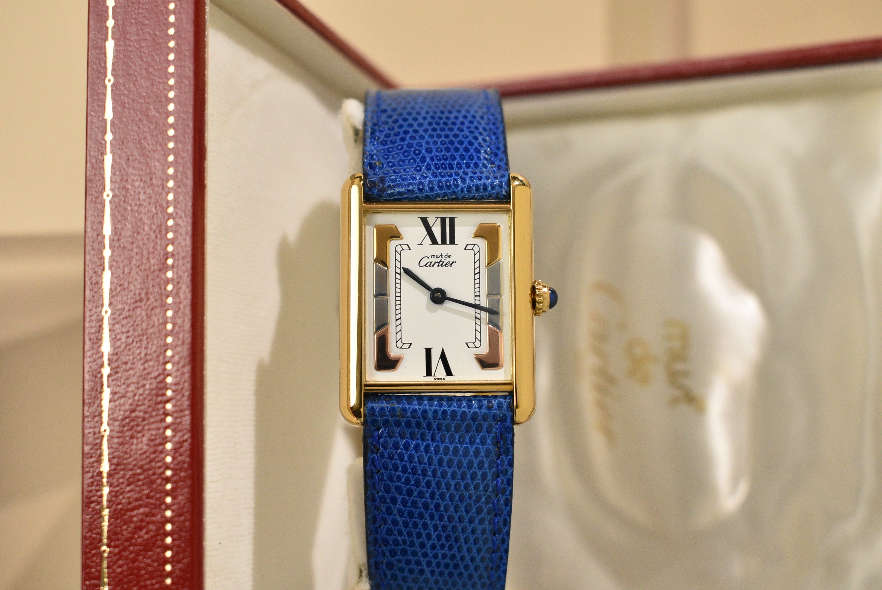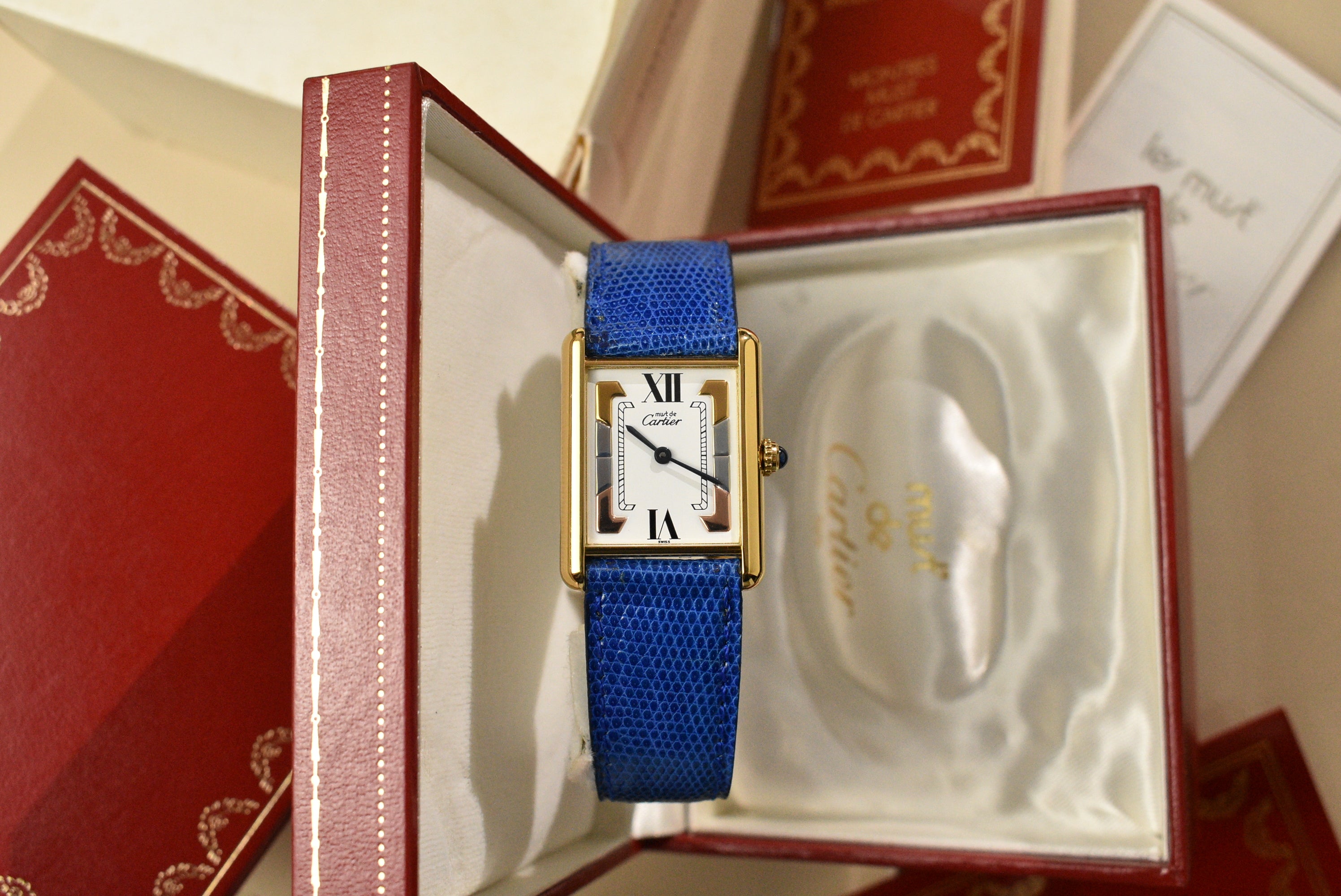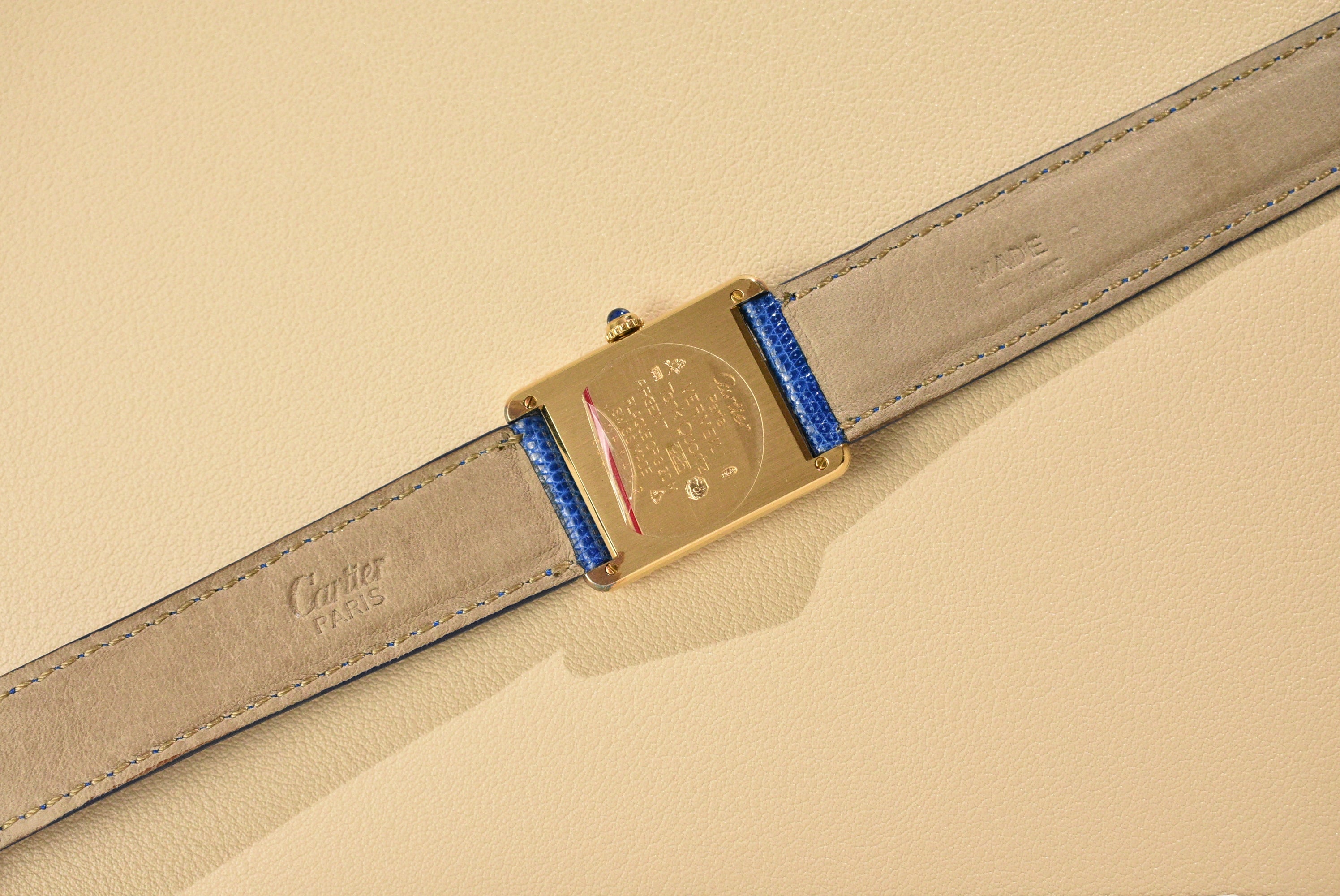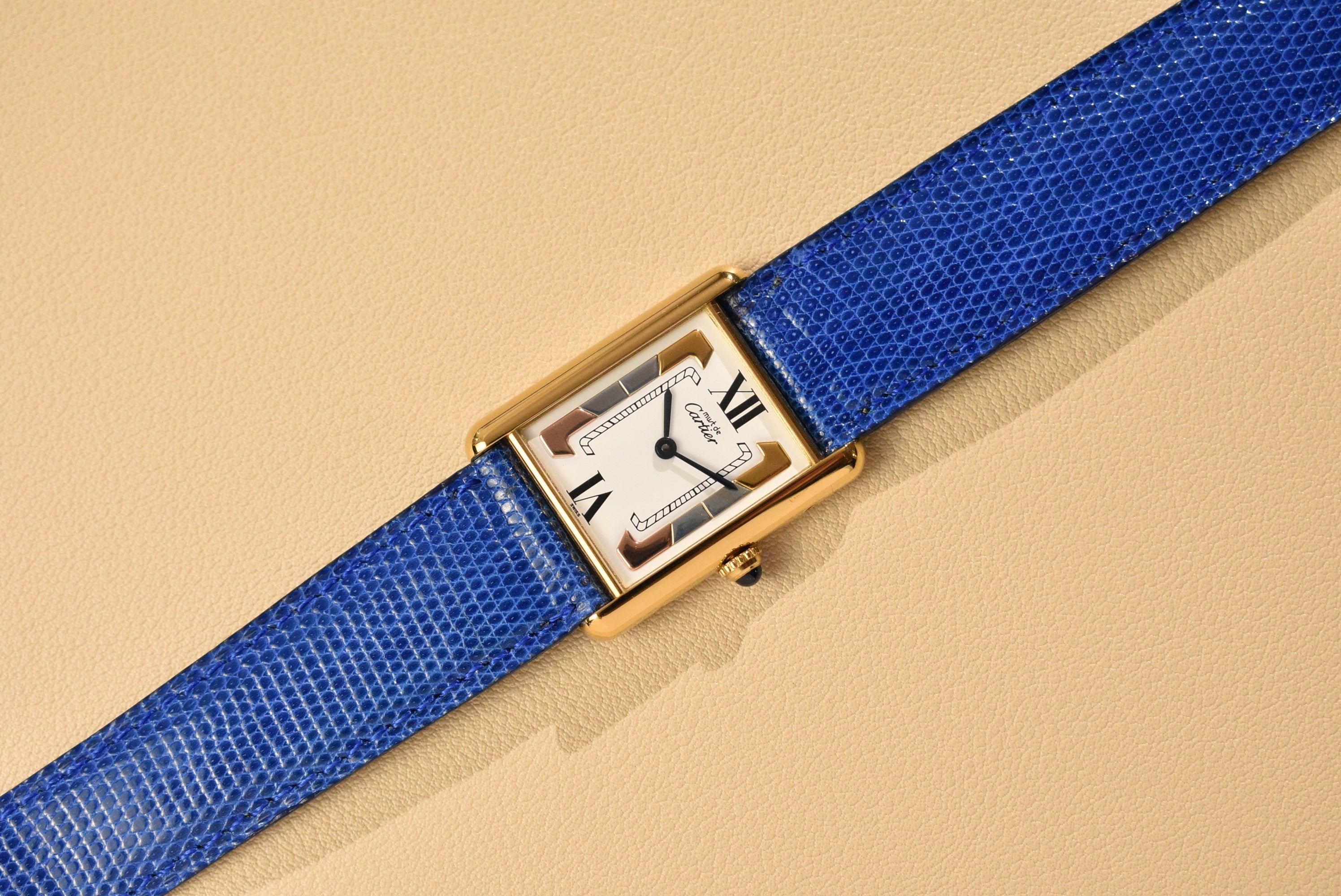 This dial is relatively uncommon in the world of neo-vintage Tanks. The watch is brand new and unworn with its original lizard blue strap. The watch is a complete set from 1996. A very rare find when it comes to condition, it even has its original case back still intact.