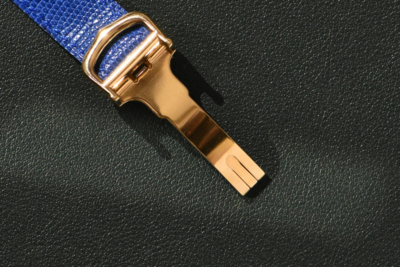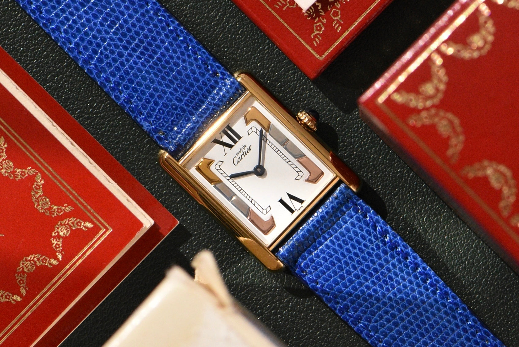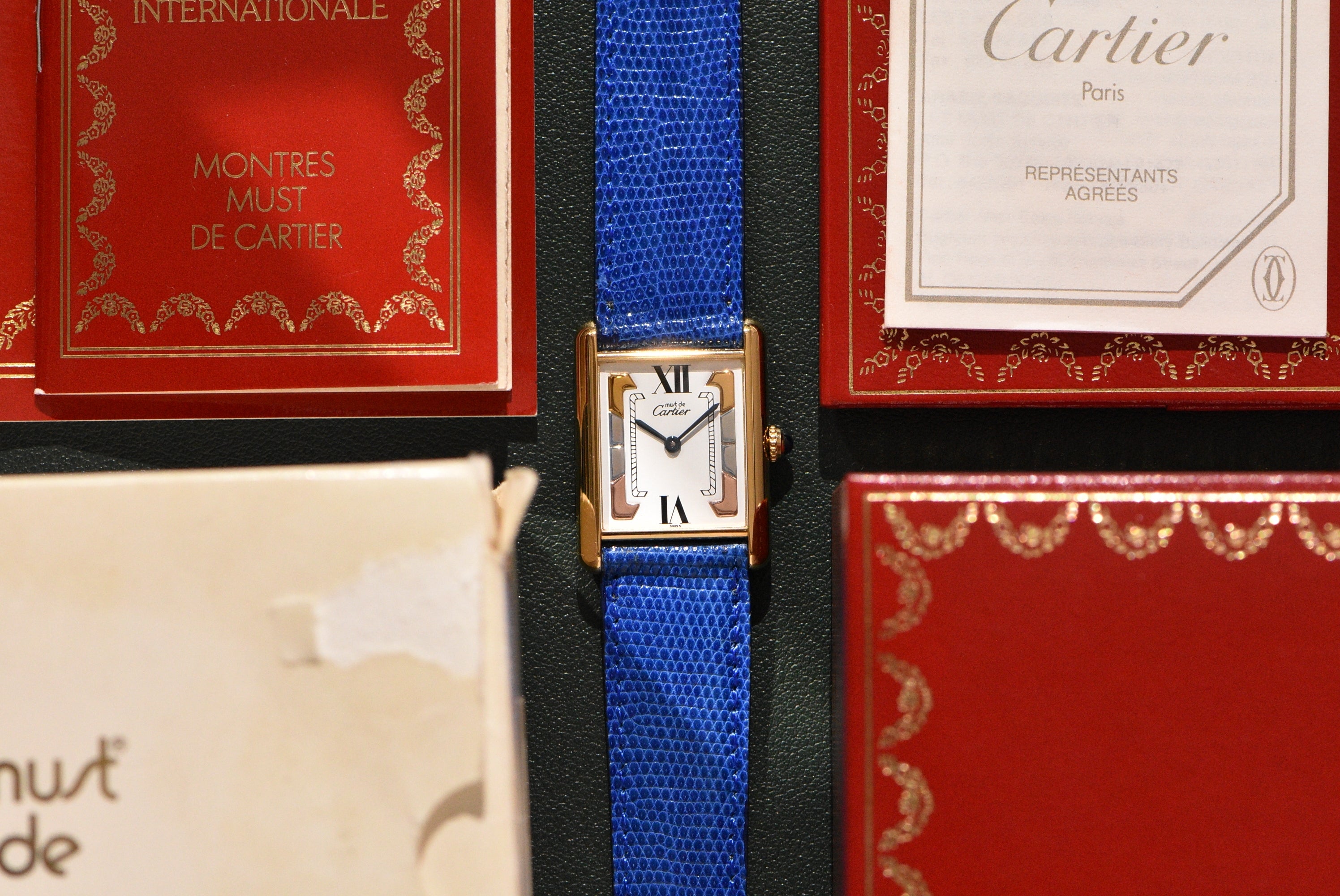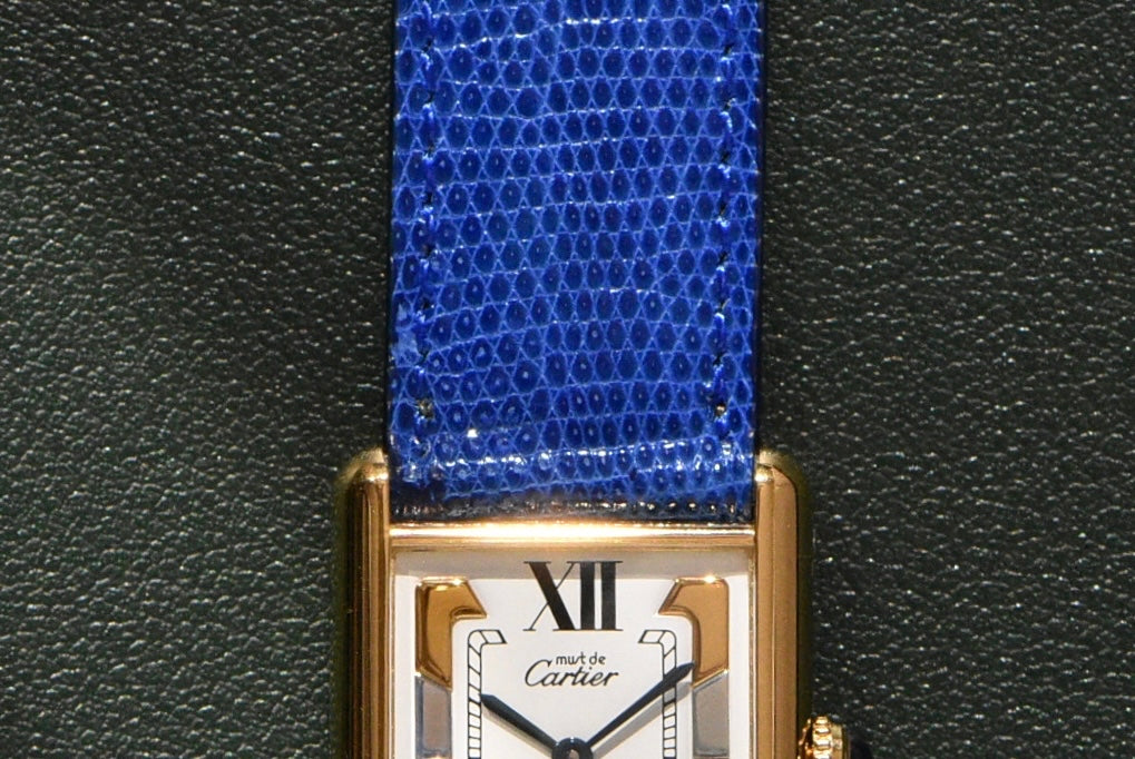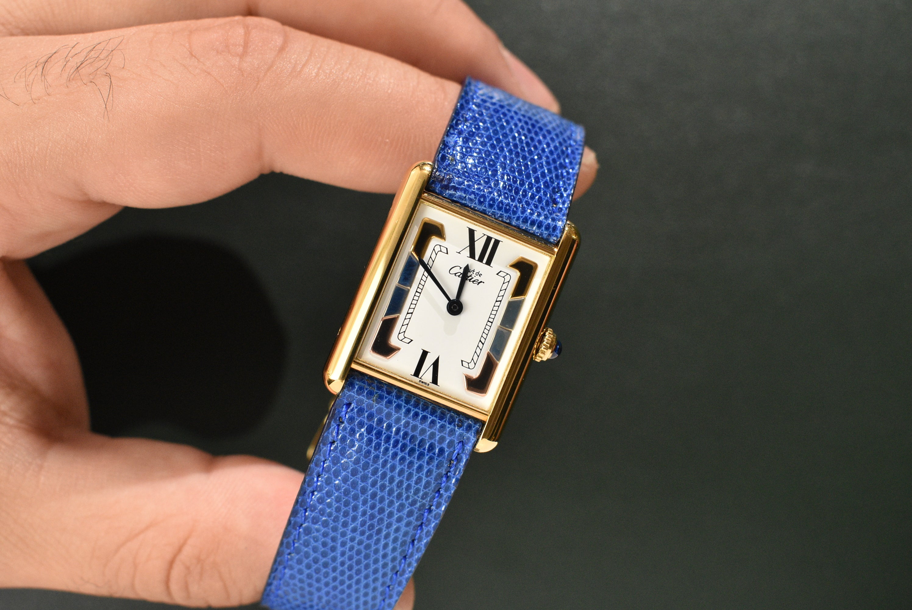 This dial is relatively uncommon in the world of neo-vintage Tanks. The watch is brand new and unworn with its original lizard blue strap. The watch is a complete set from 1996. A very rare find when it comes to condition, it even has its original case back still intact.