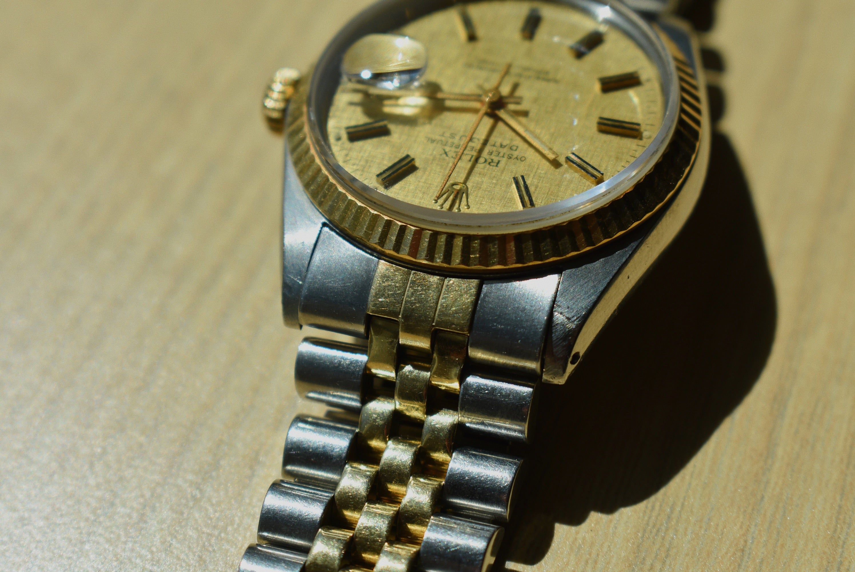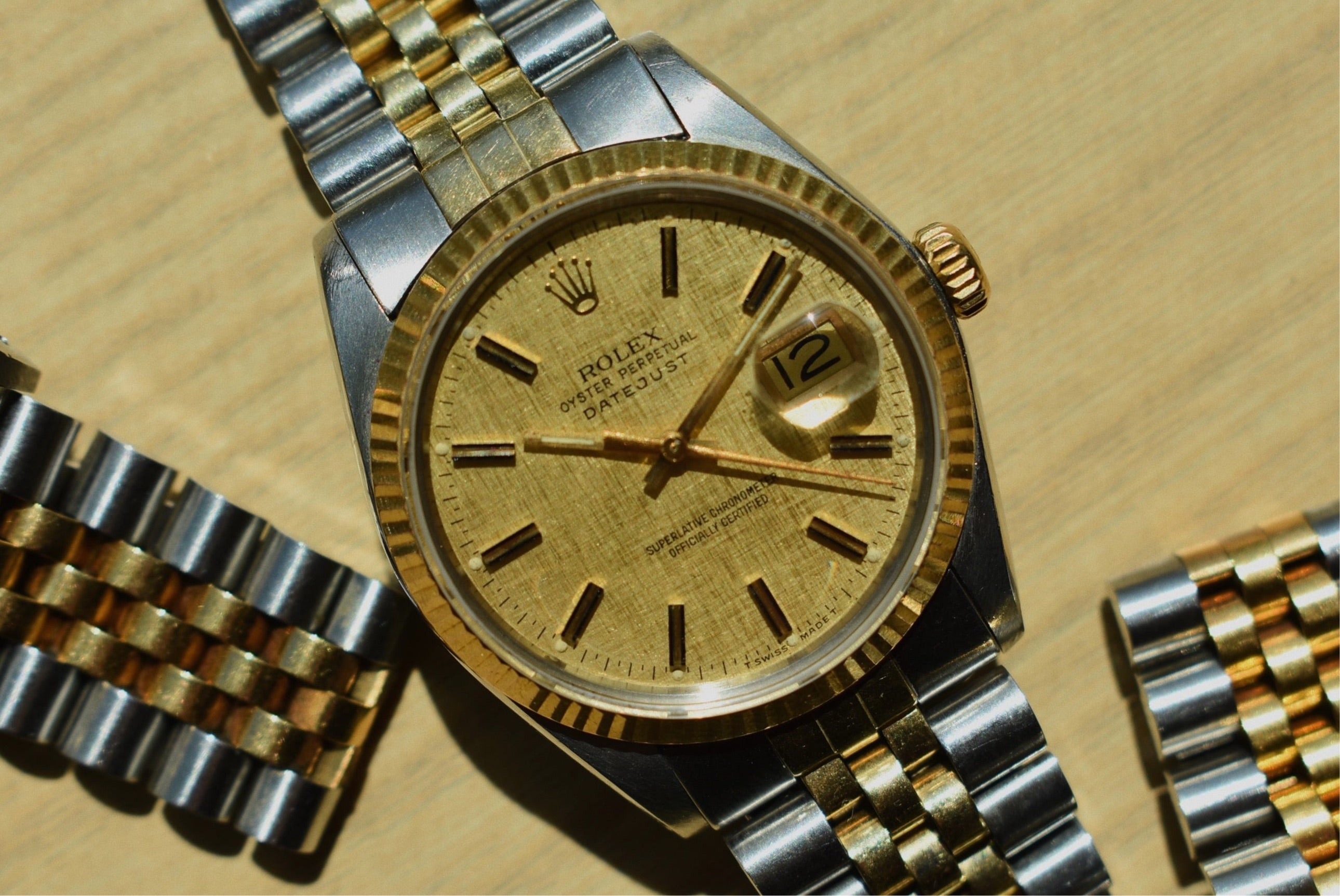 You really can’t go wrong with a linen dial. The way the light bounces off the linen pattern is like no other and it is so much more noticeable on a champagne dial like this.