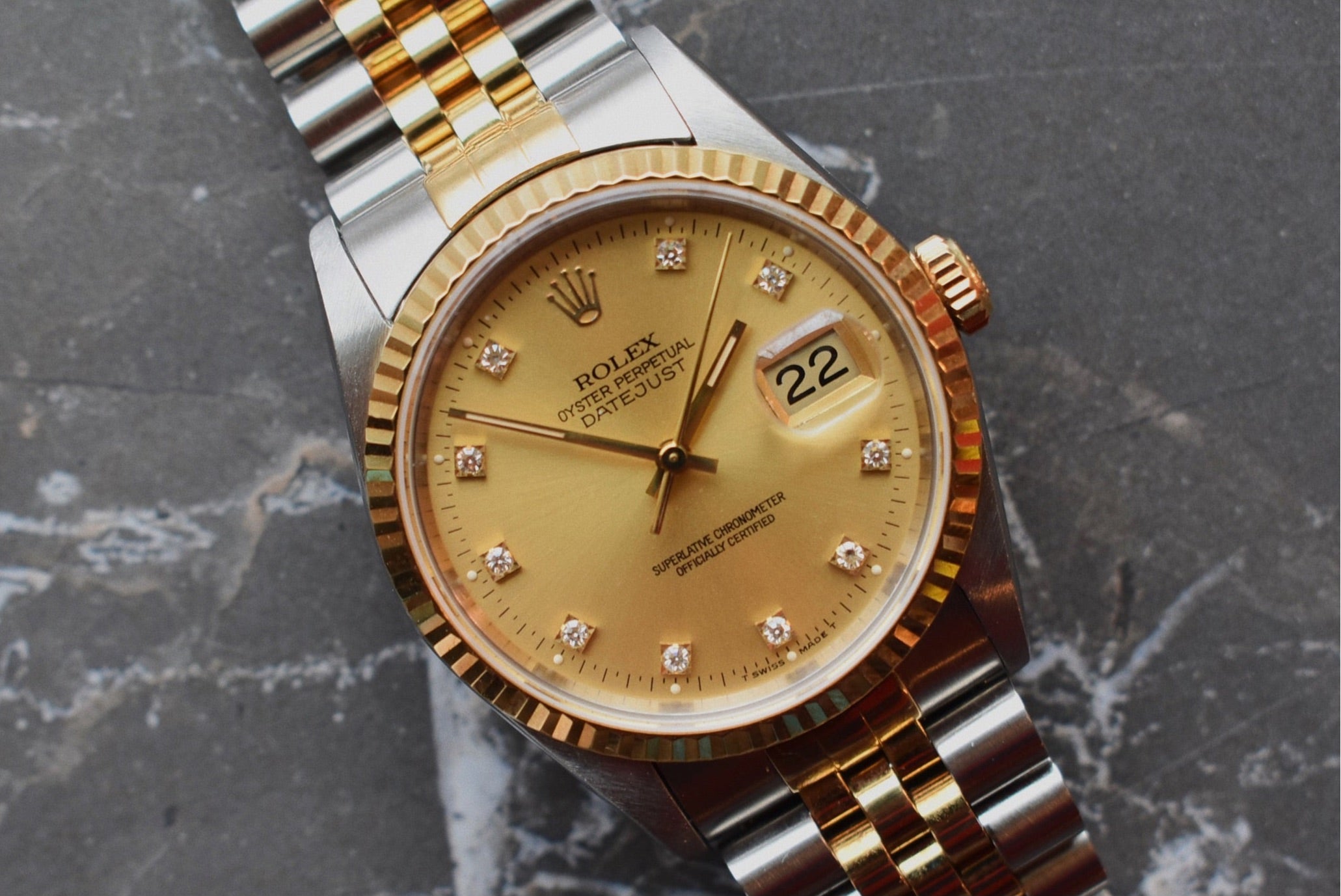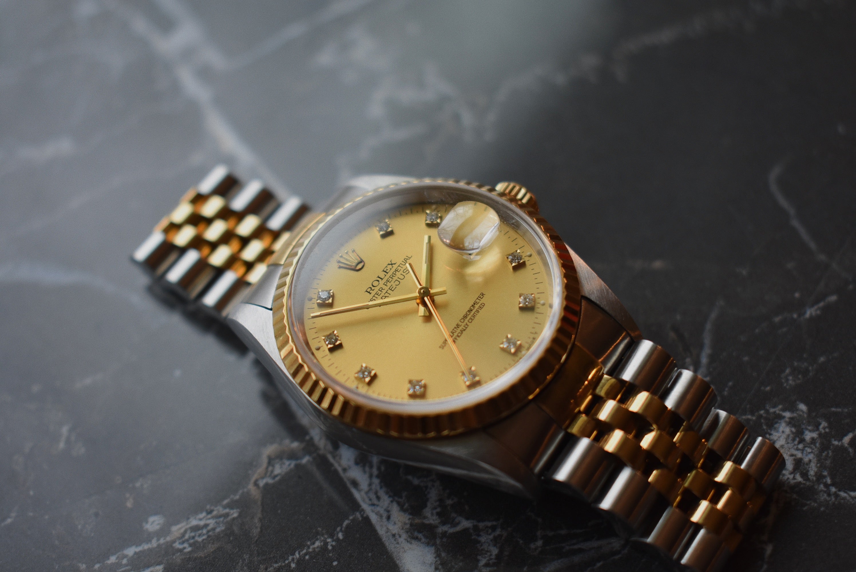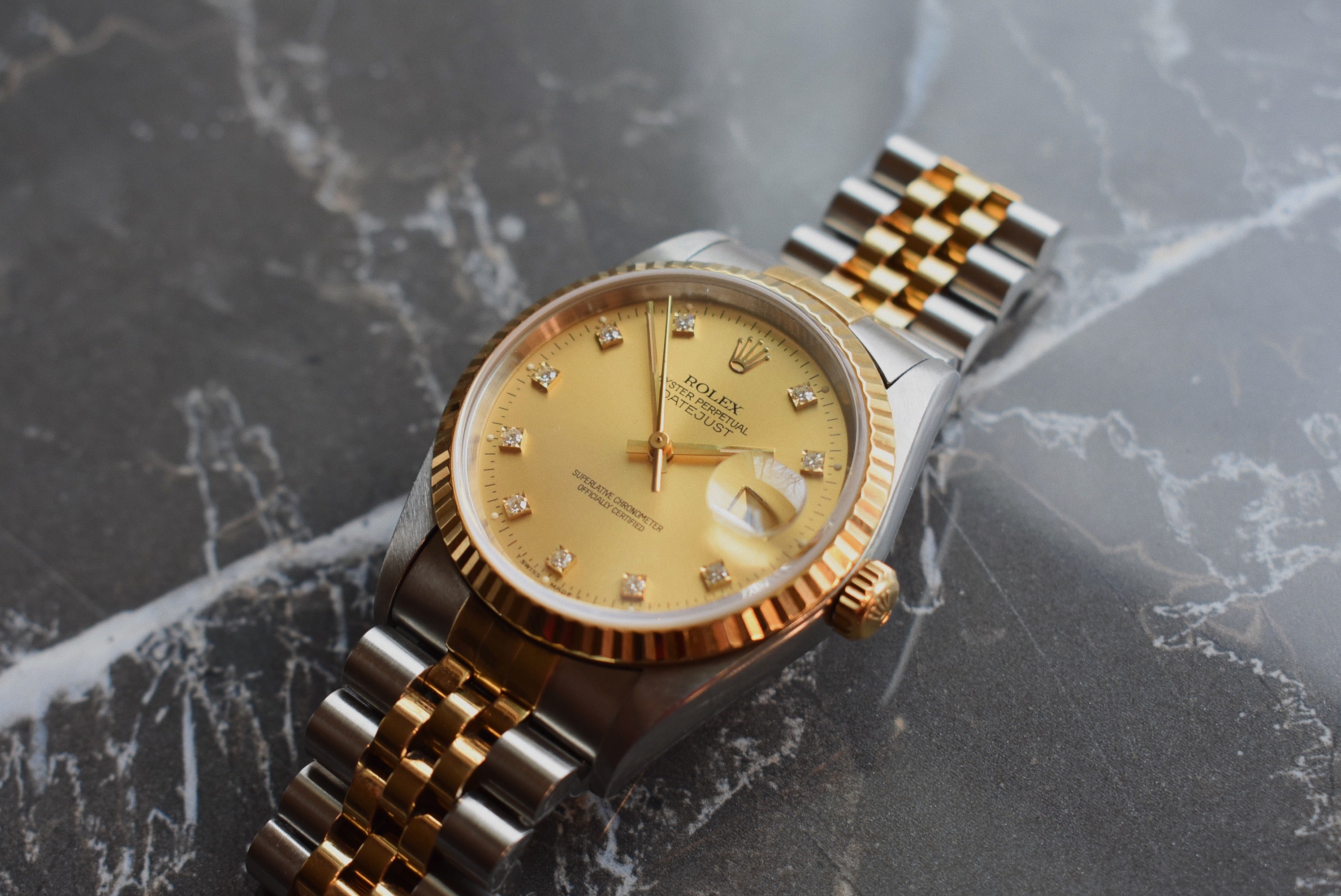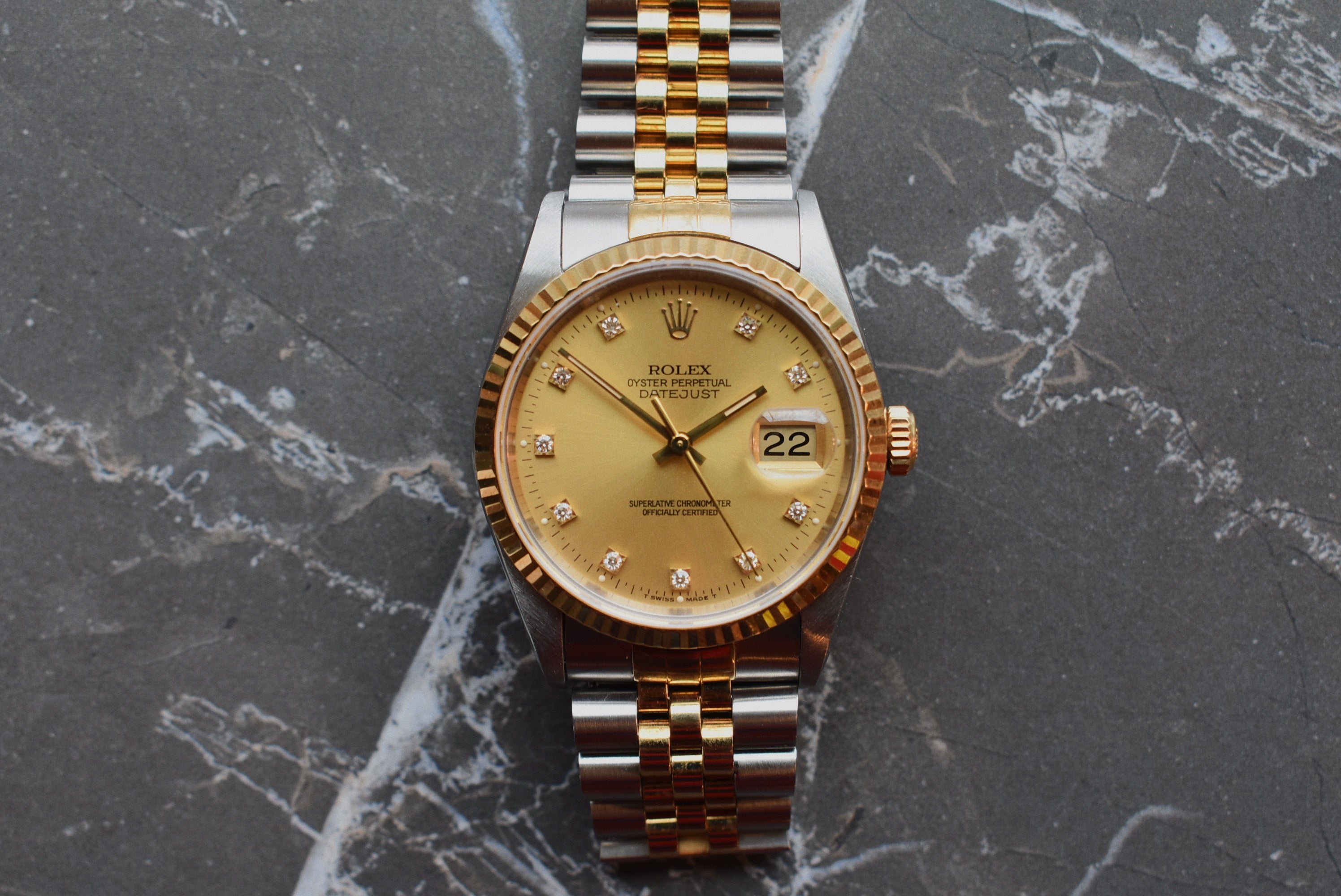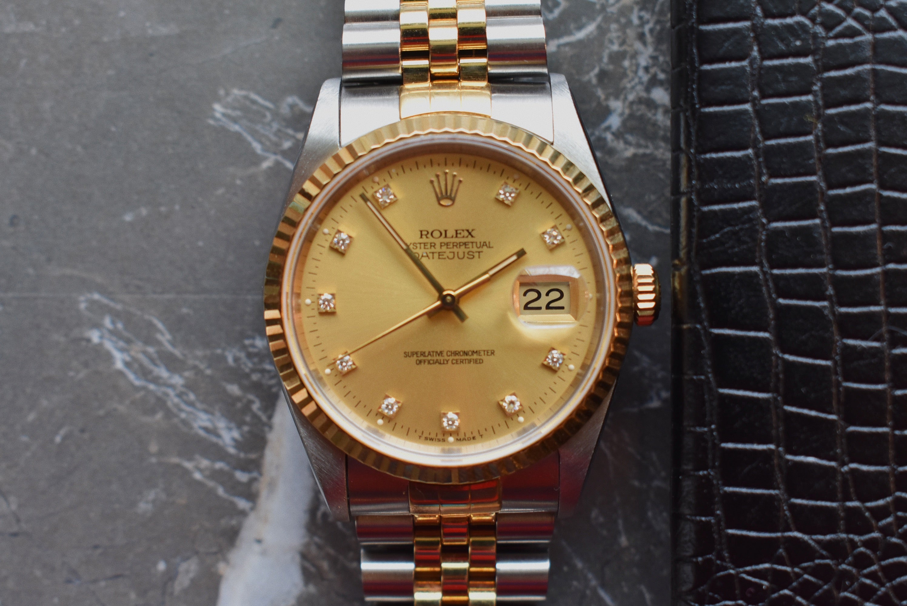A true watch enthusiast knows that aftermarket diamonds are just not the way to go when investing your money in a timepiece. That being said, factory Rolex’s can still be had for under $10k and here is a perfect example. A clean condition Reference 16233 with the small diamond hour markers.