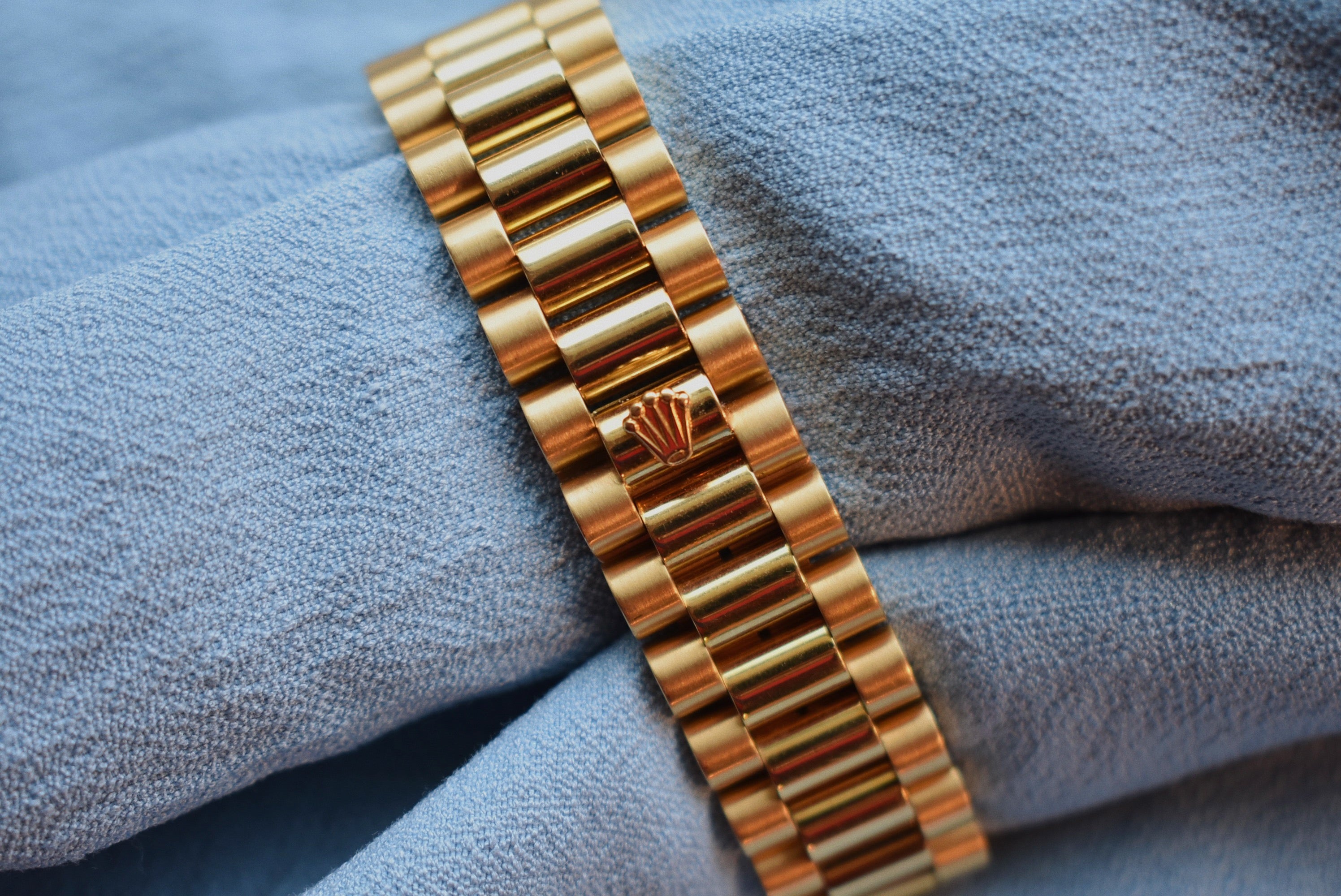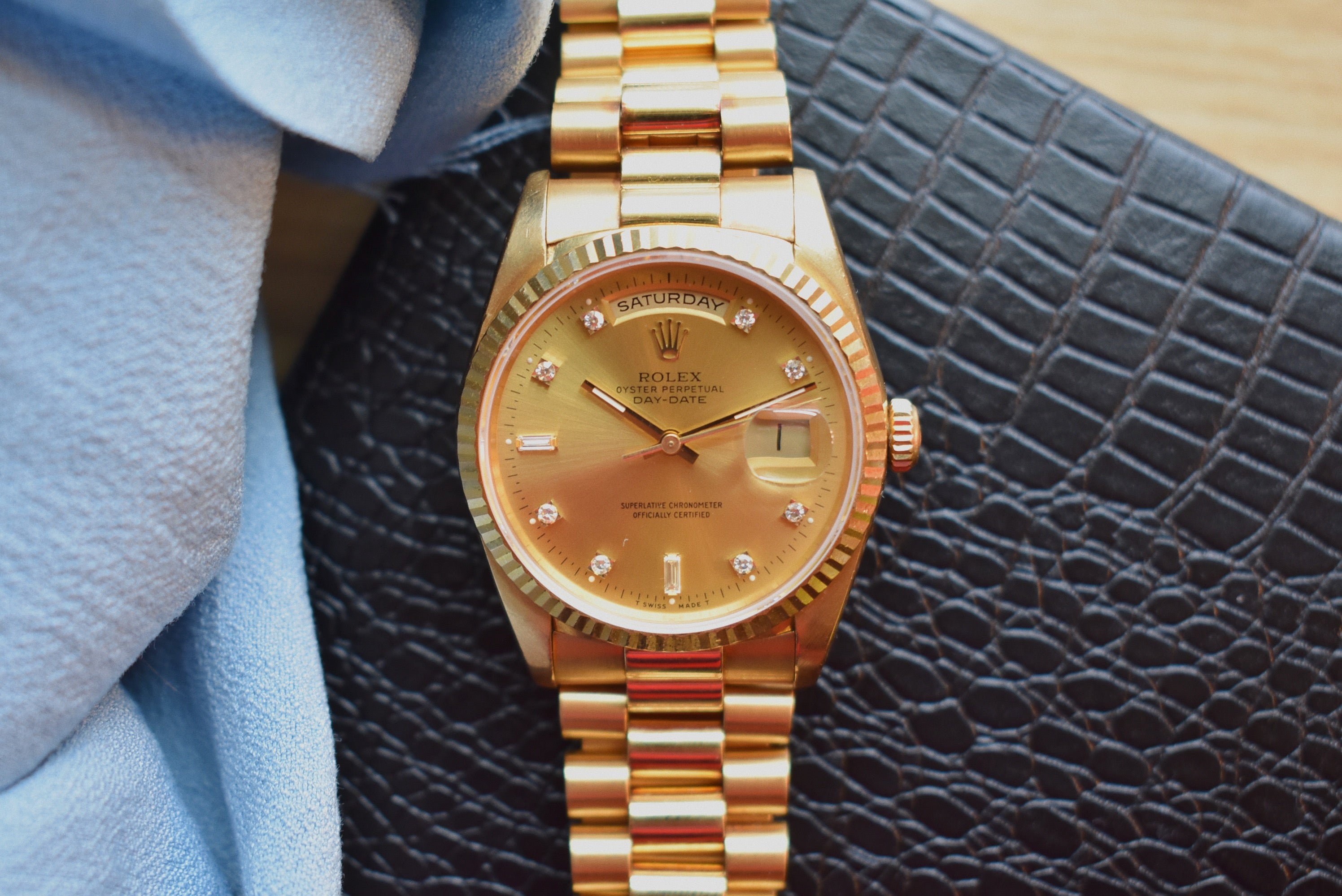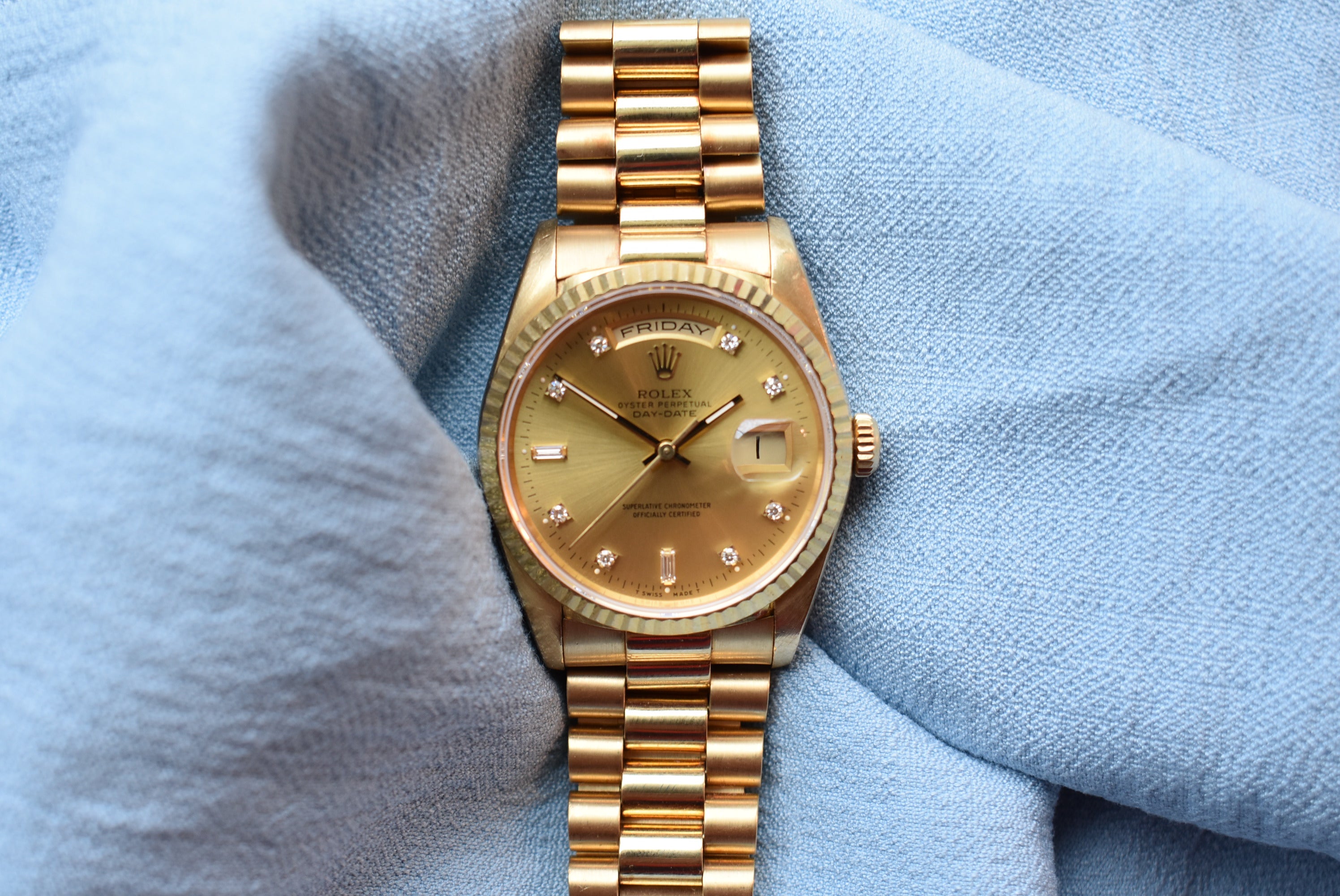 Even Tony Soprano didn’t have a DayDate this nice! Yes, he did have a beautiful Solid Gold Rolex but his didn’t come with a beautiful factory diamond dial like this one. The dial gives it a bit more pop, not like a solid gold Rolex needed more anyways.