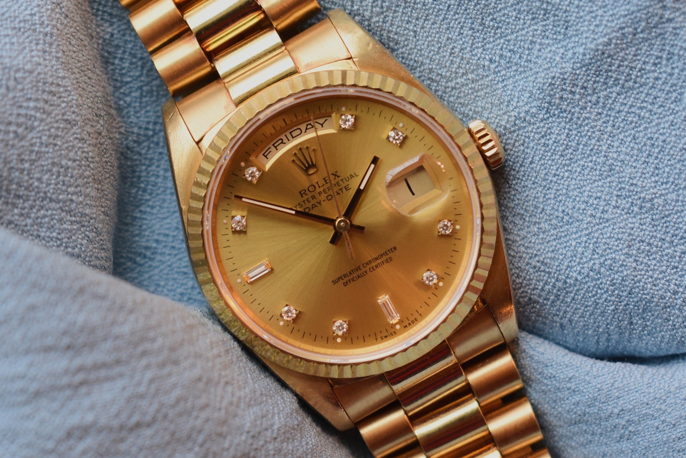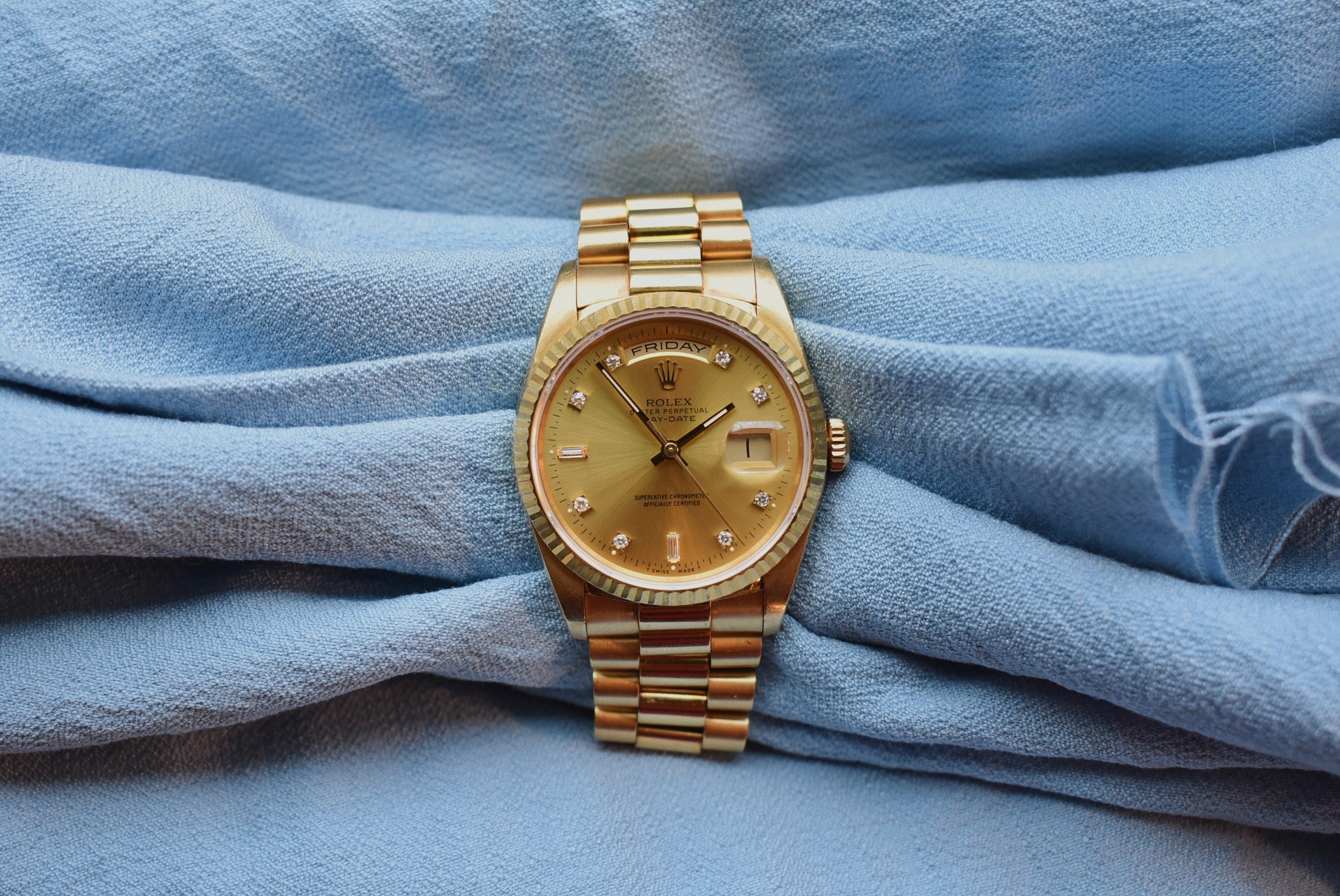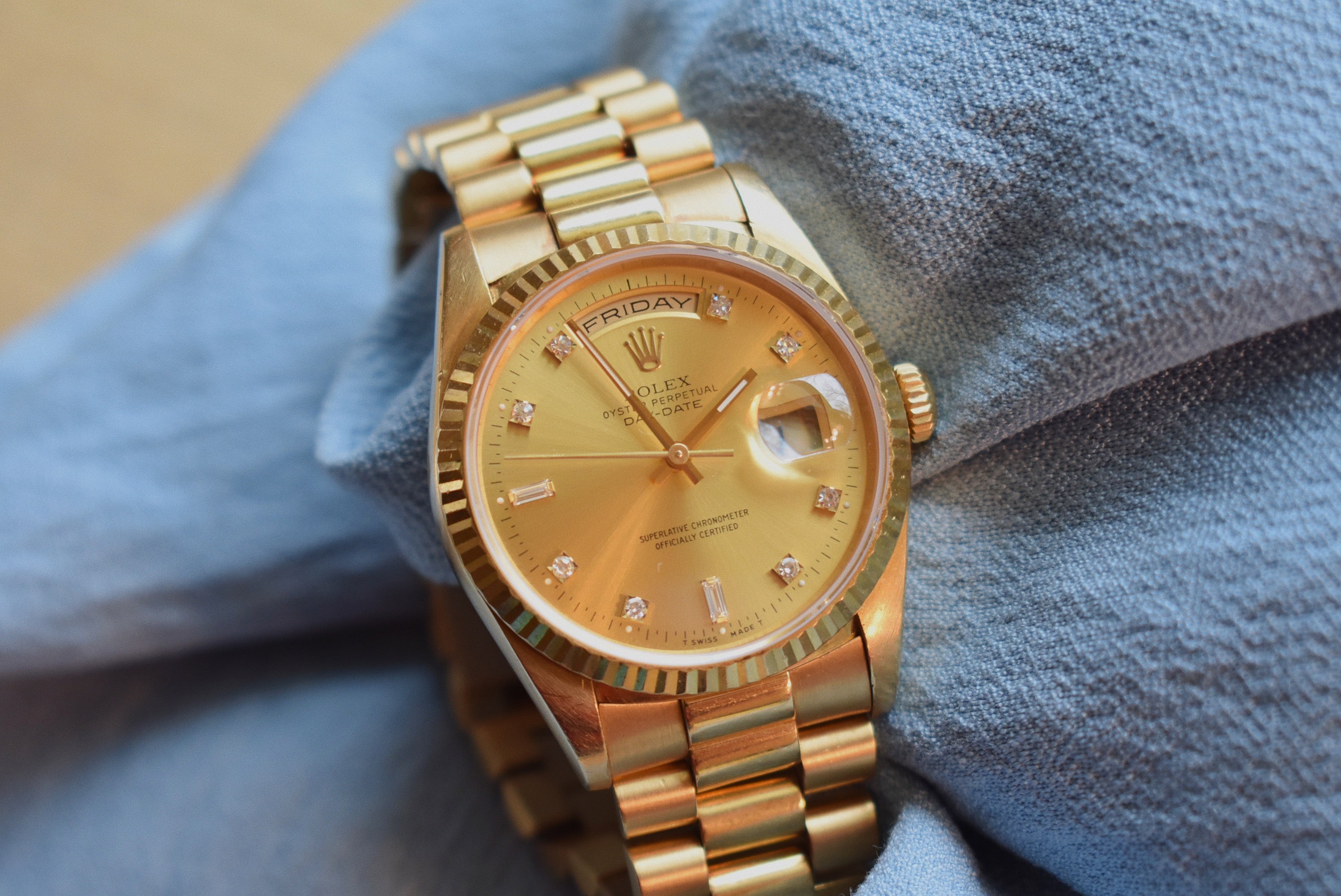 Even Tony Soprano didn’t have a DayDate this nice! Yes, he did have a beautiful Solid Gold Rolex but his didn’t come with a beautiful factory diamond dial like this one. The dial gives it a bit more pop, not like a solid gold Rolex needed more anyways.