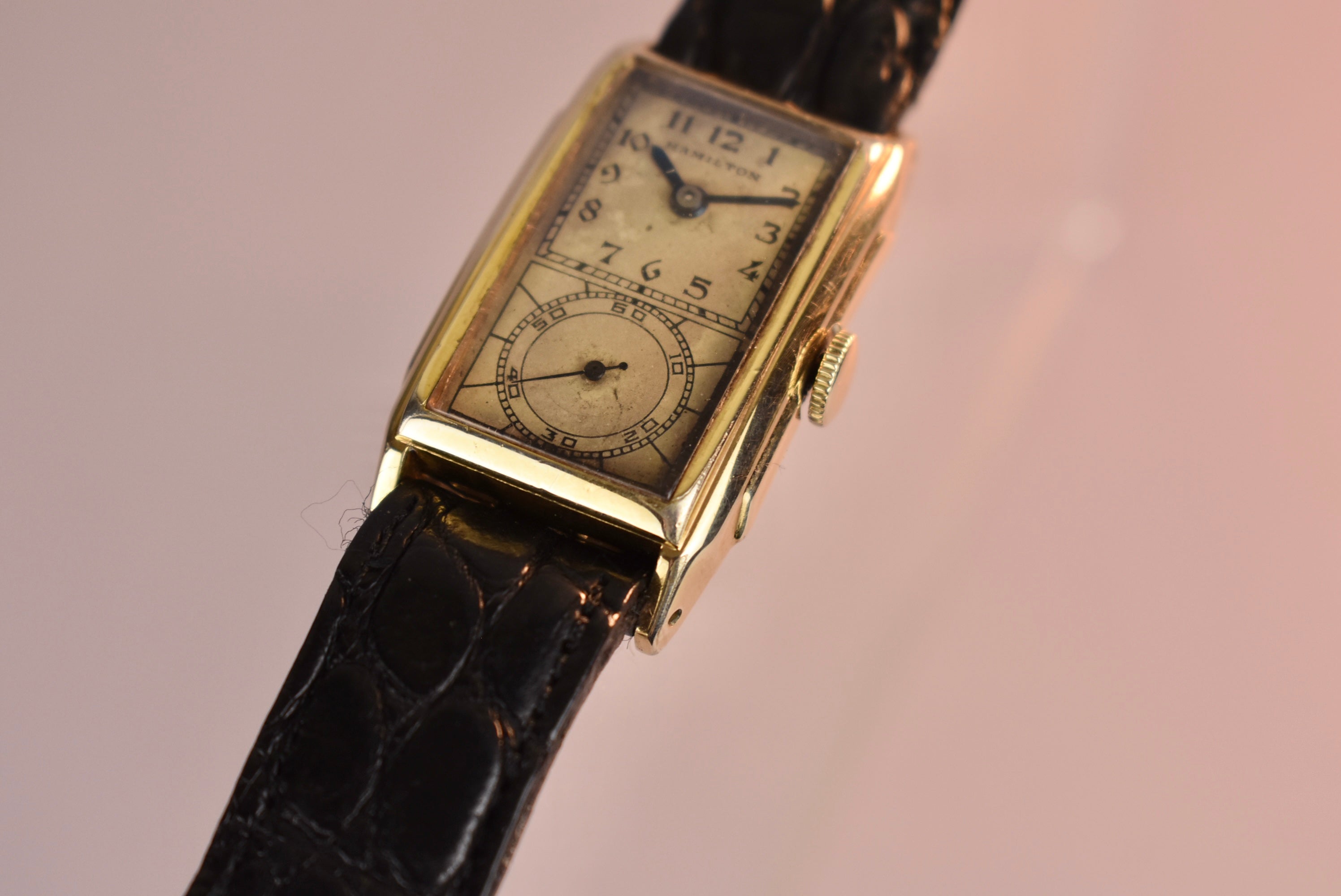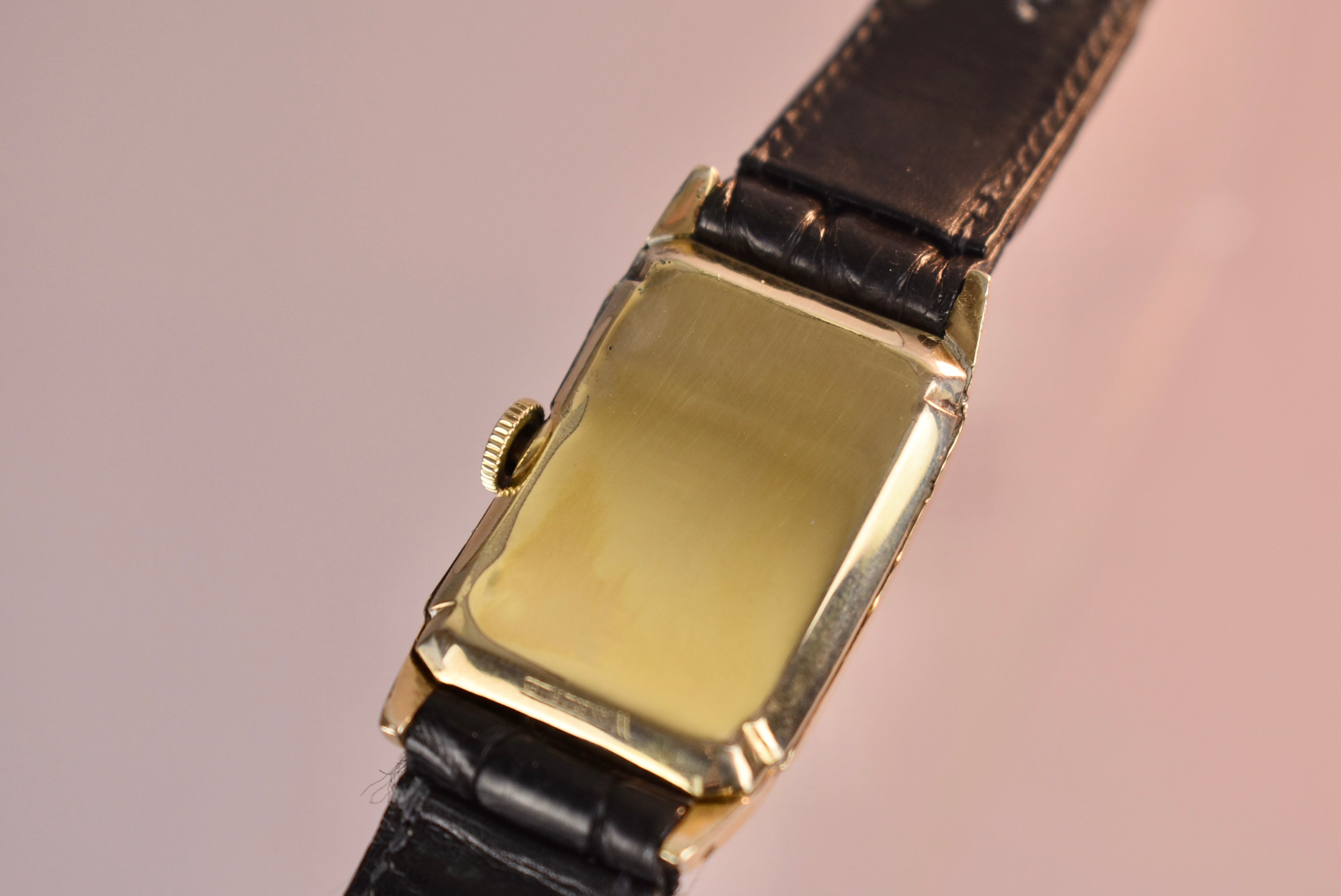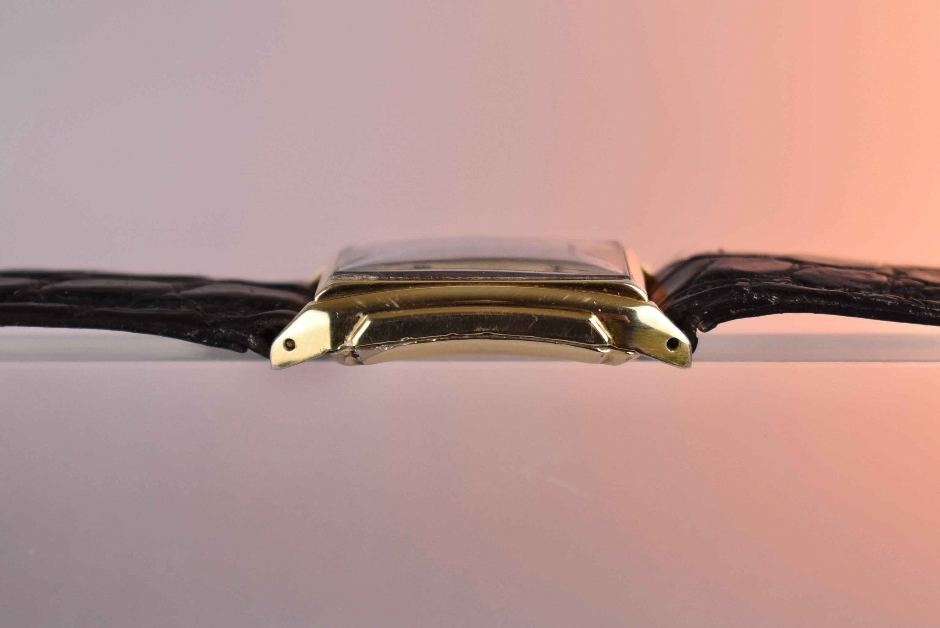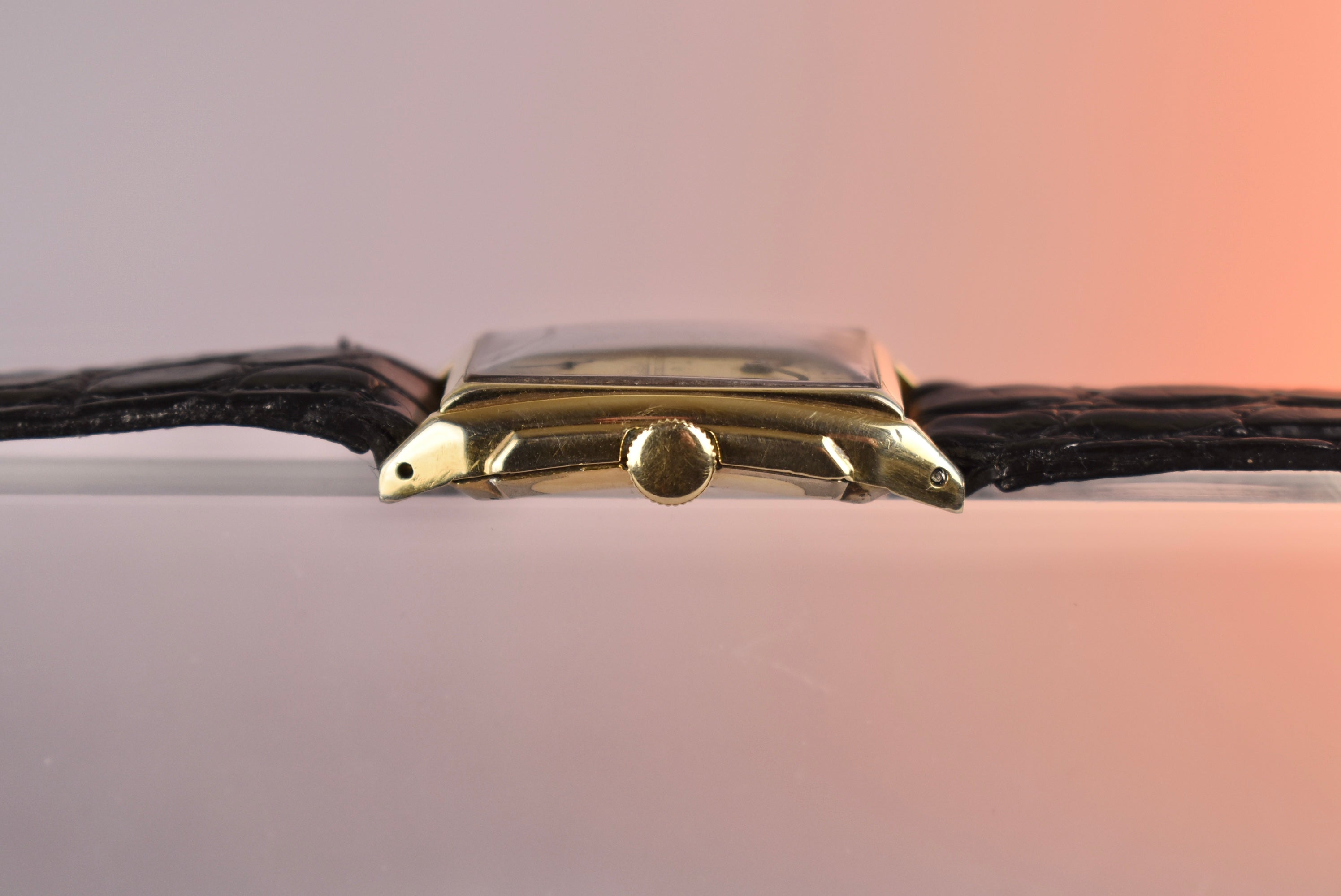 This example has a beautiful curved stepped case with an art deco design. The dial has gained a clean and even patina correct to its age. Then the font and layout, a stunning cathedral style dial ties the whole watch together.