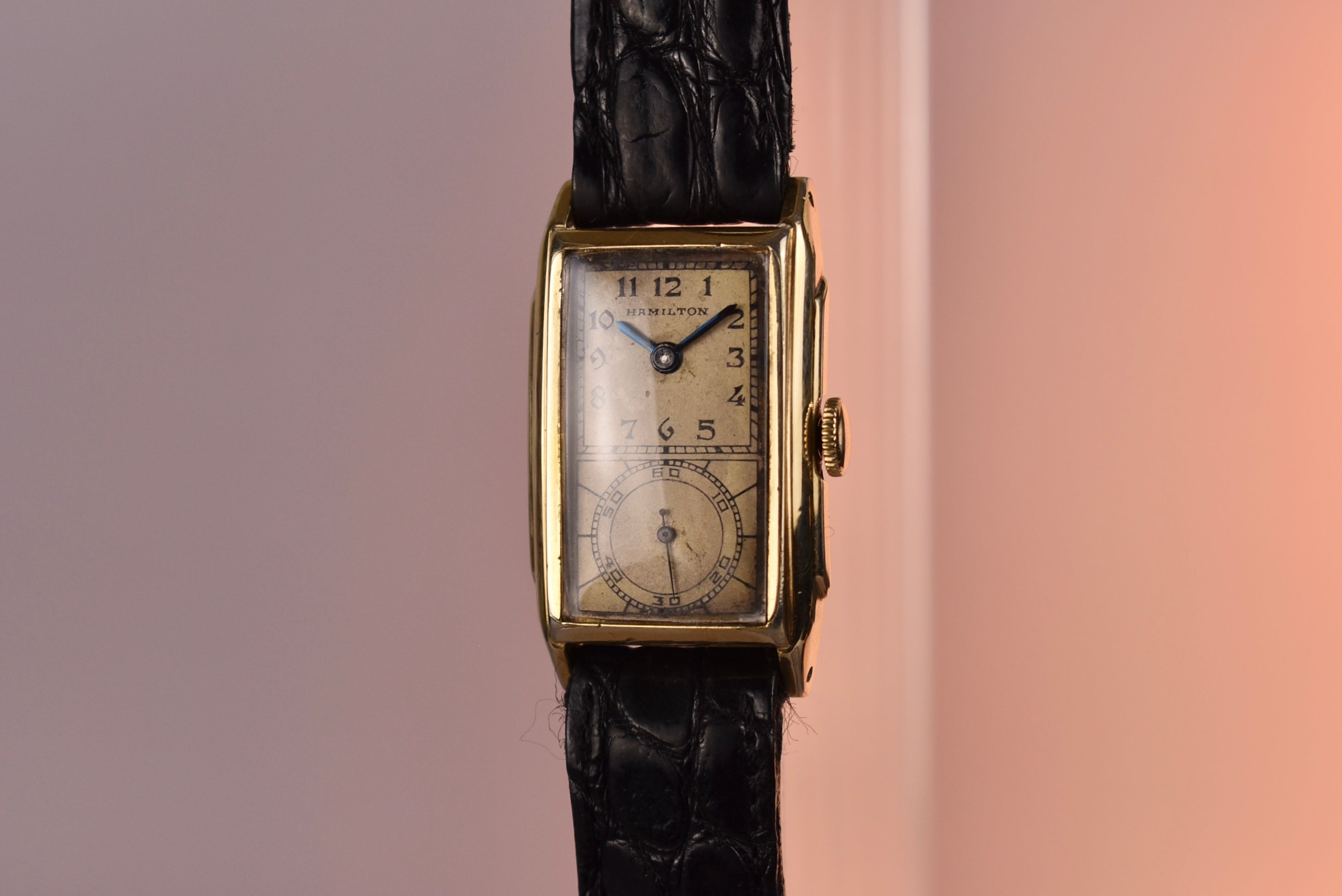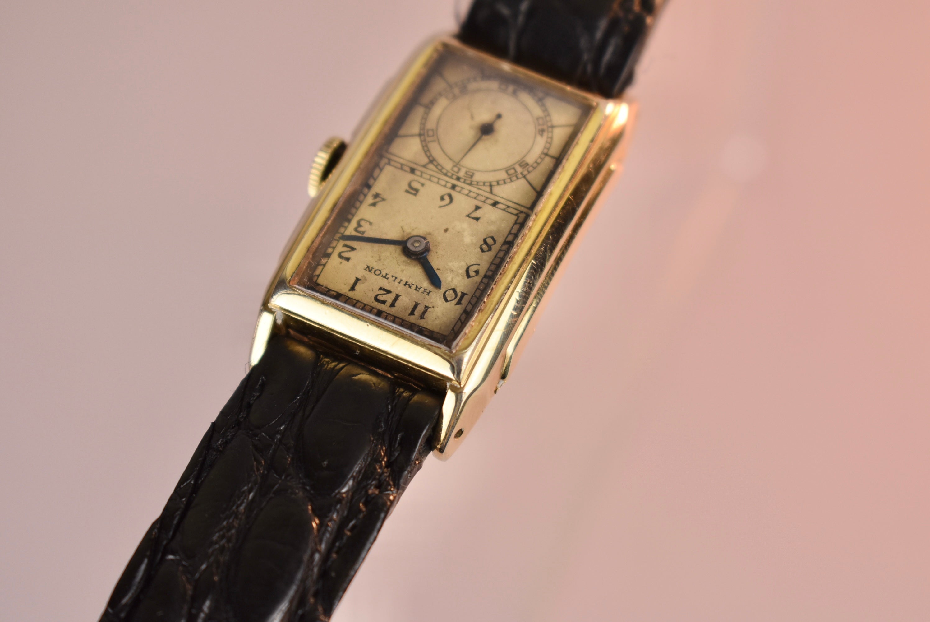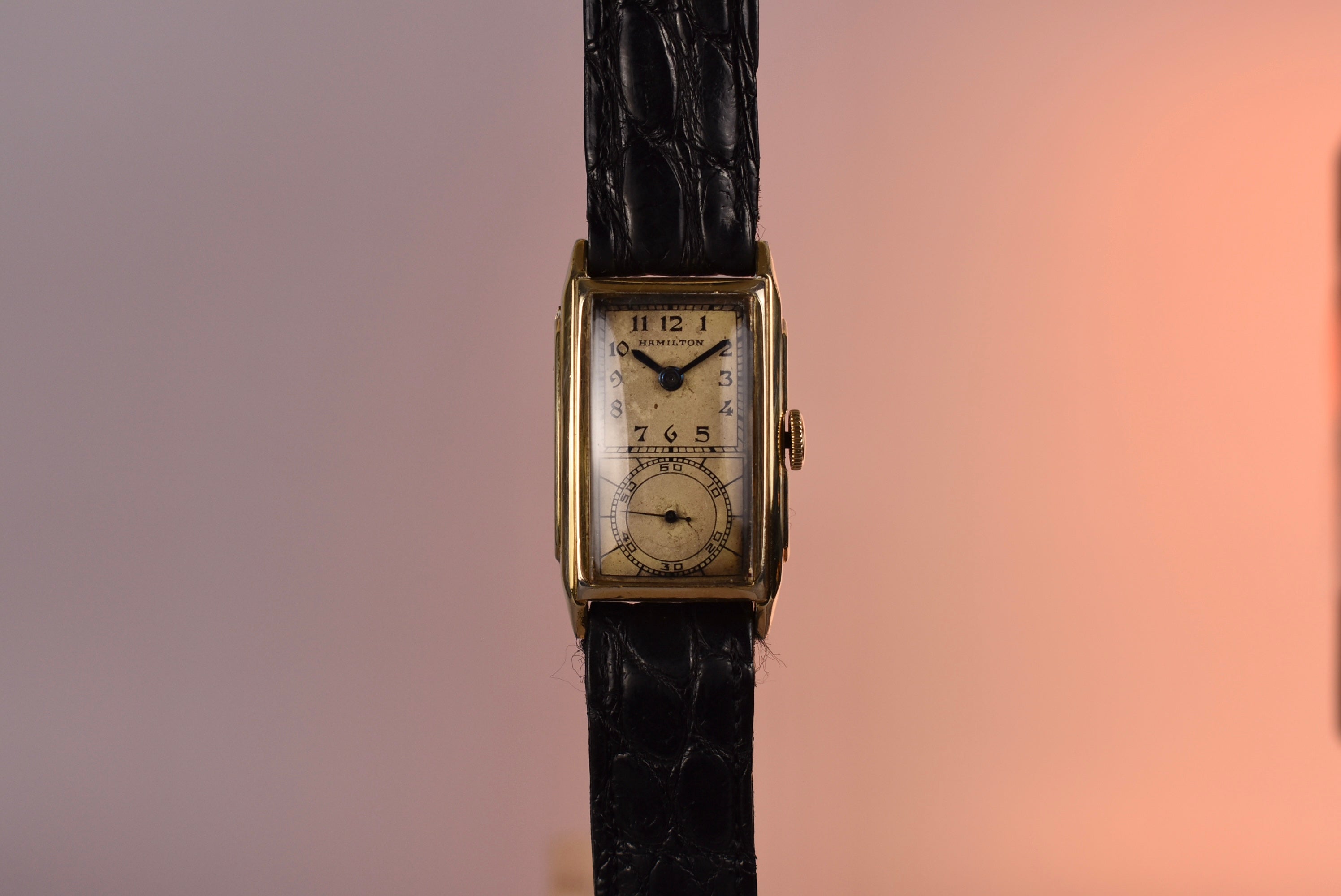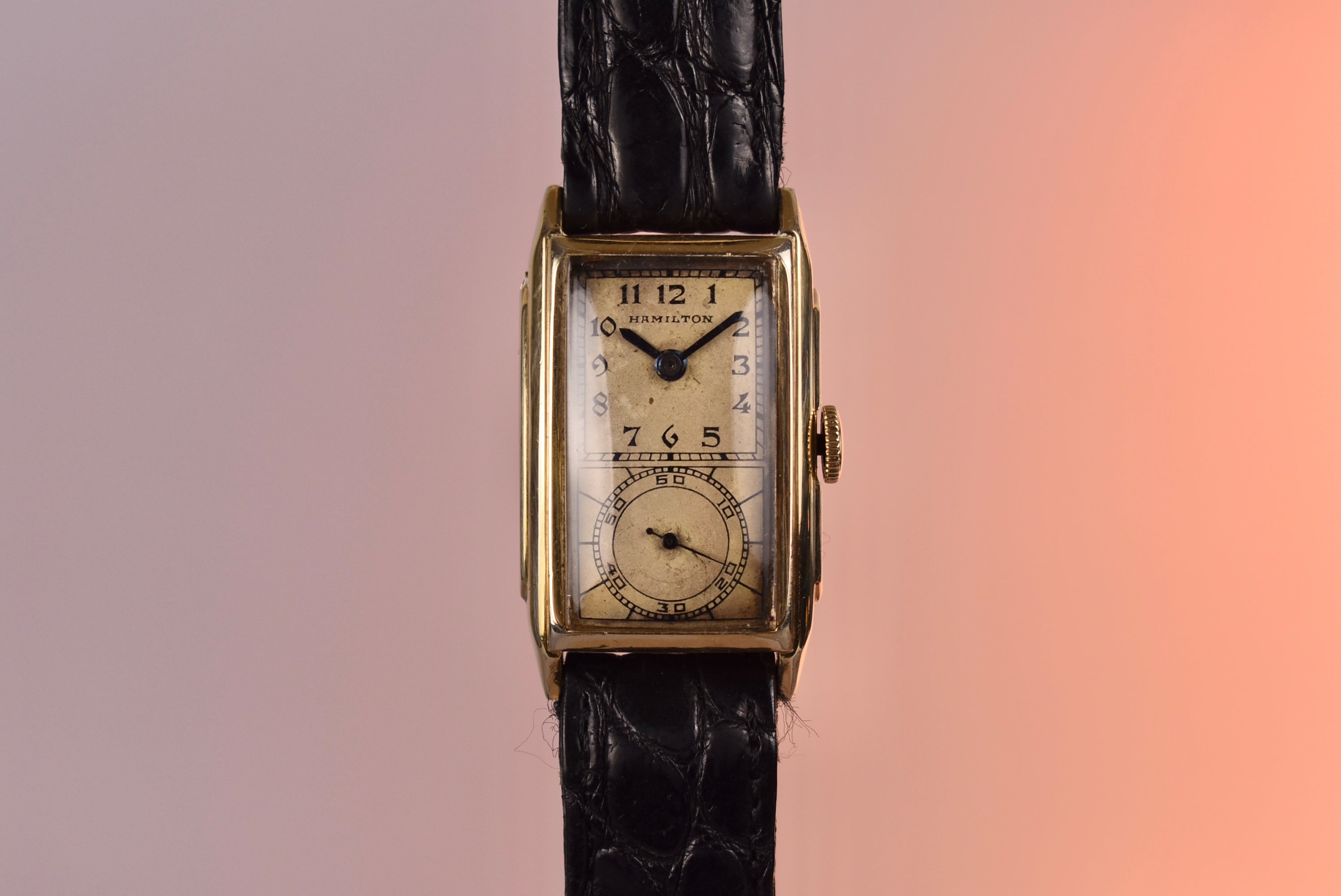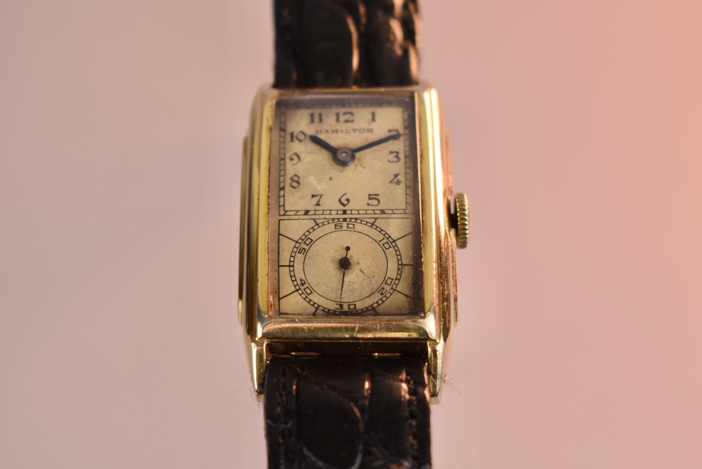 This example has a beautiful curved stepped case with an art deco design. The dial has gained a clean and even patina correct to its age. Then the font and layout, a stunning cathedral style dial ties the whole watch together.