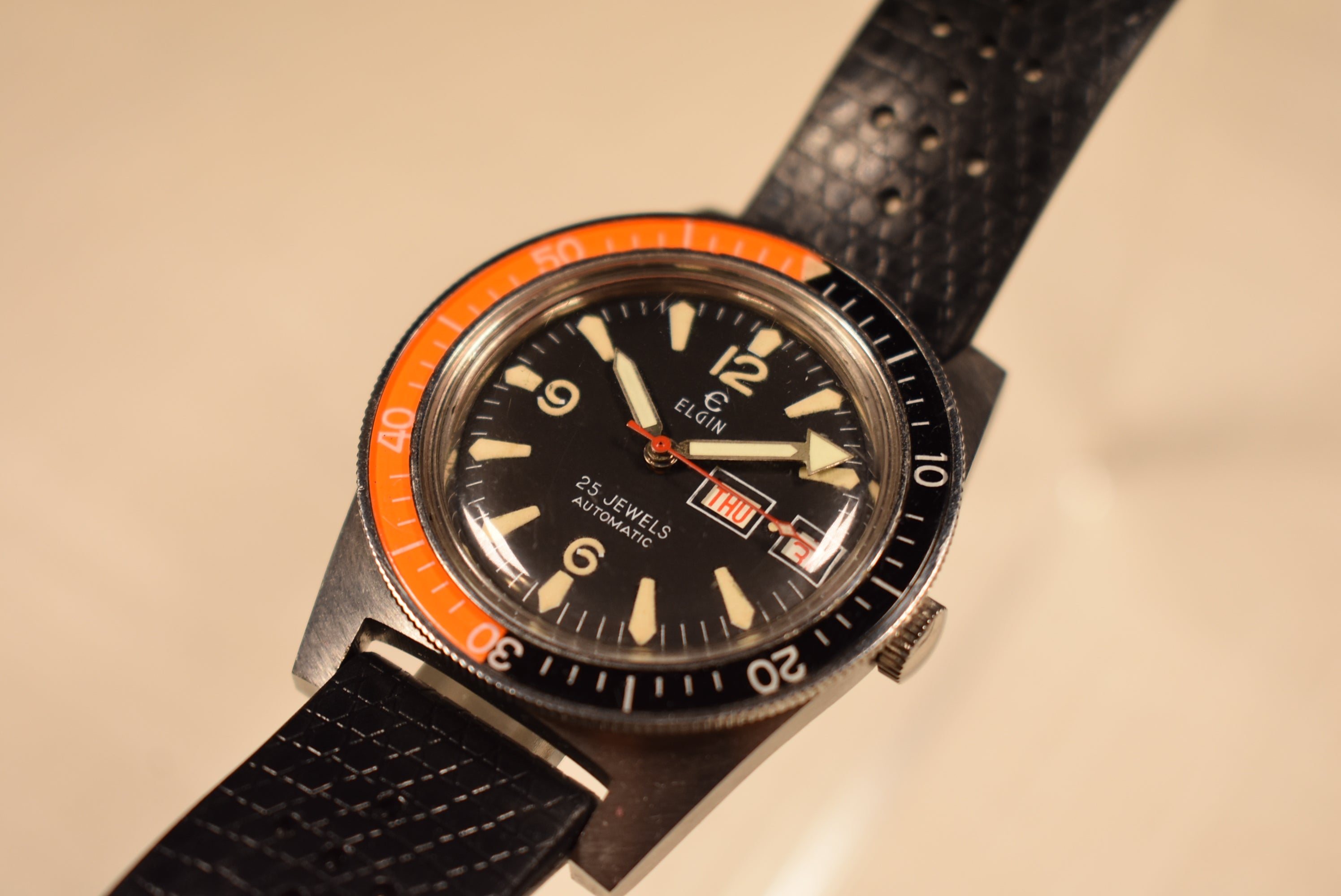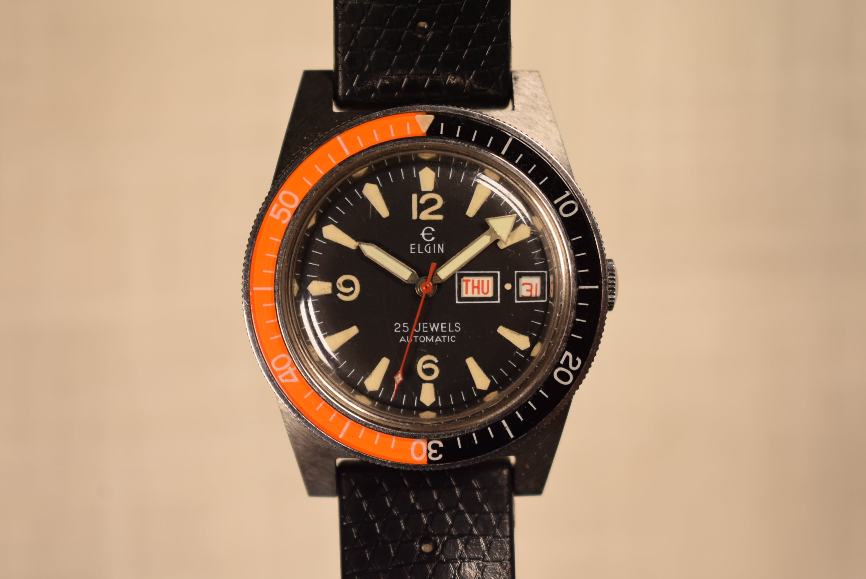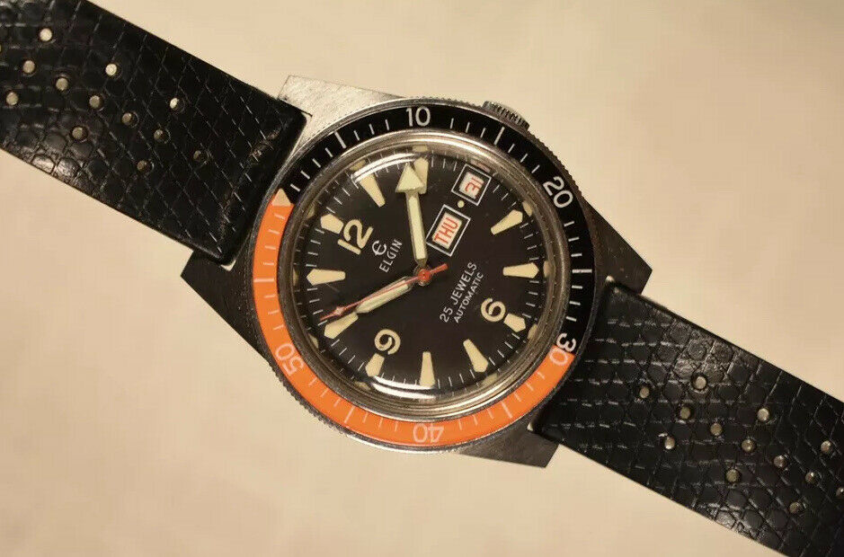 This Elgin Skin Diver features an amazing orange Bakelite bezel. The dial Lume has amazing patina and has turned into a creamy color. The watch is 37mm by 40mm with a 19mm lug width. The watch features an Elgin Day-Date automatic movement. The watch is running great with the date window functioning properly. However, the watches service history is unknown. THis model also features the caliber M135 also known as the PUW 1463.