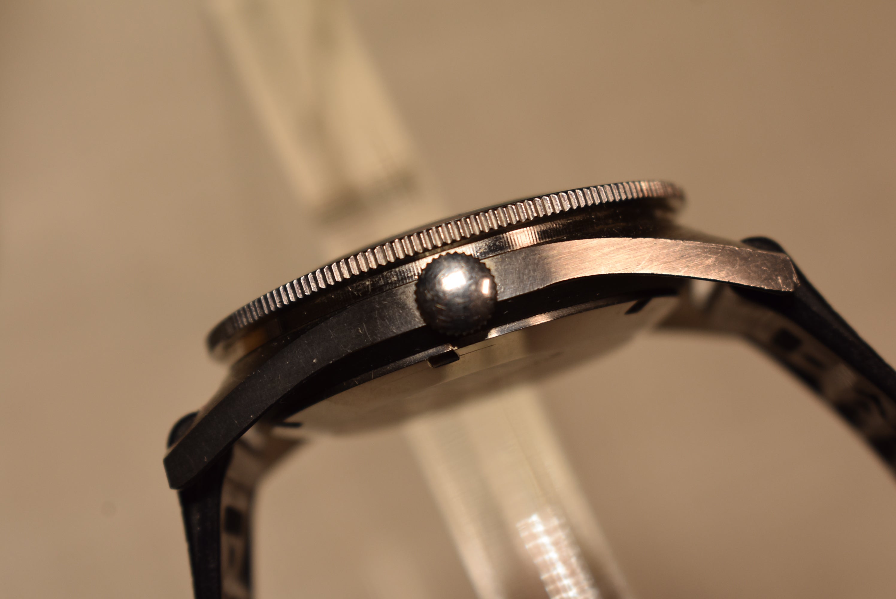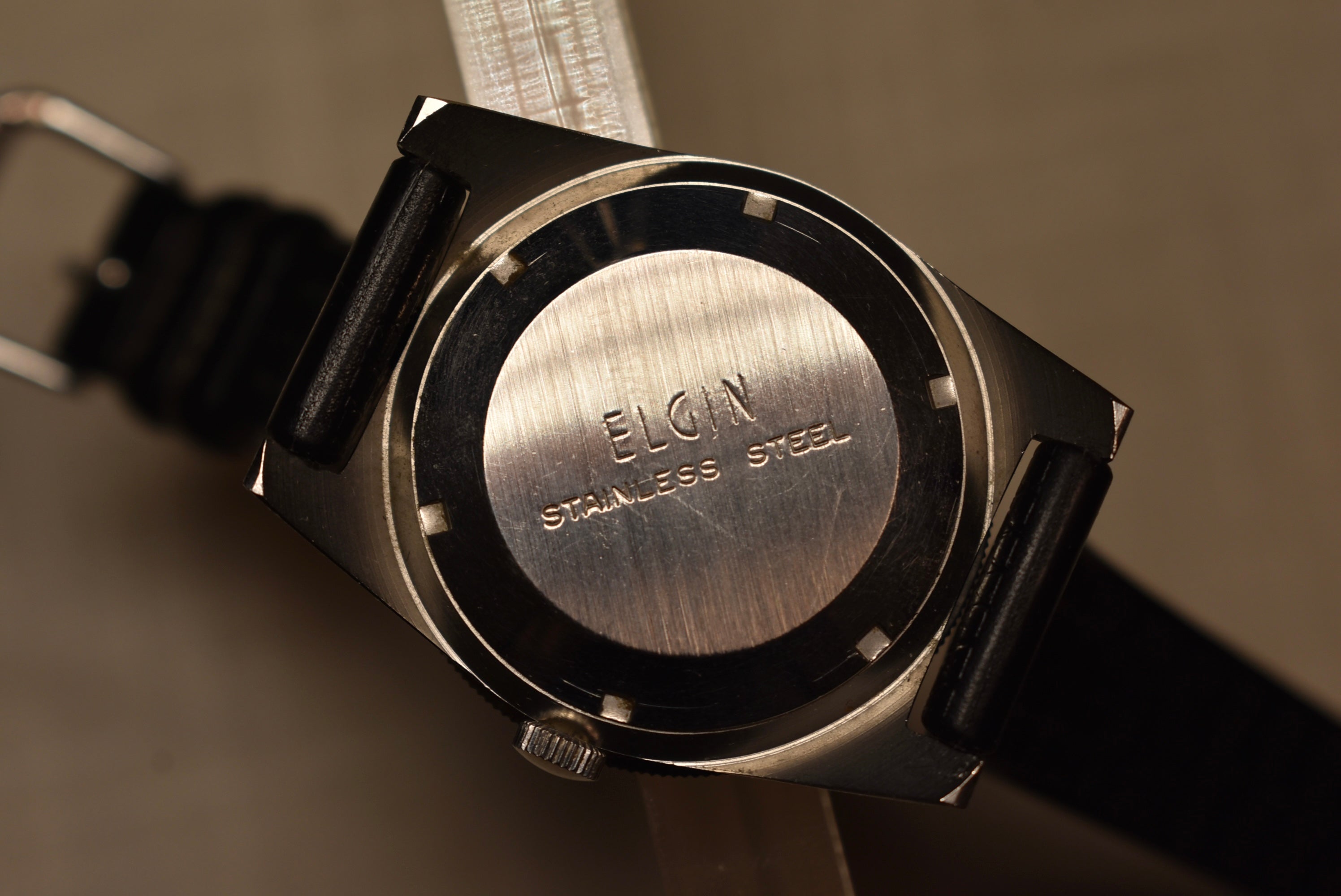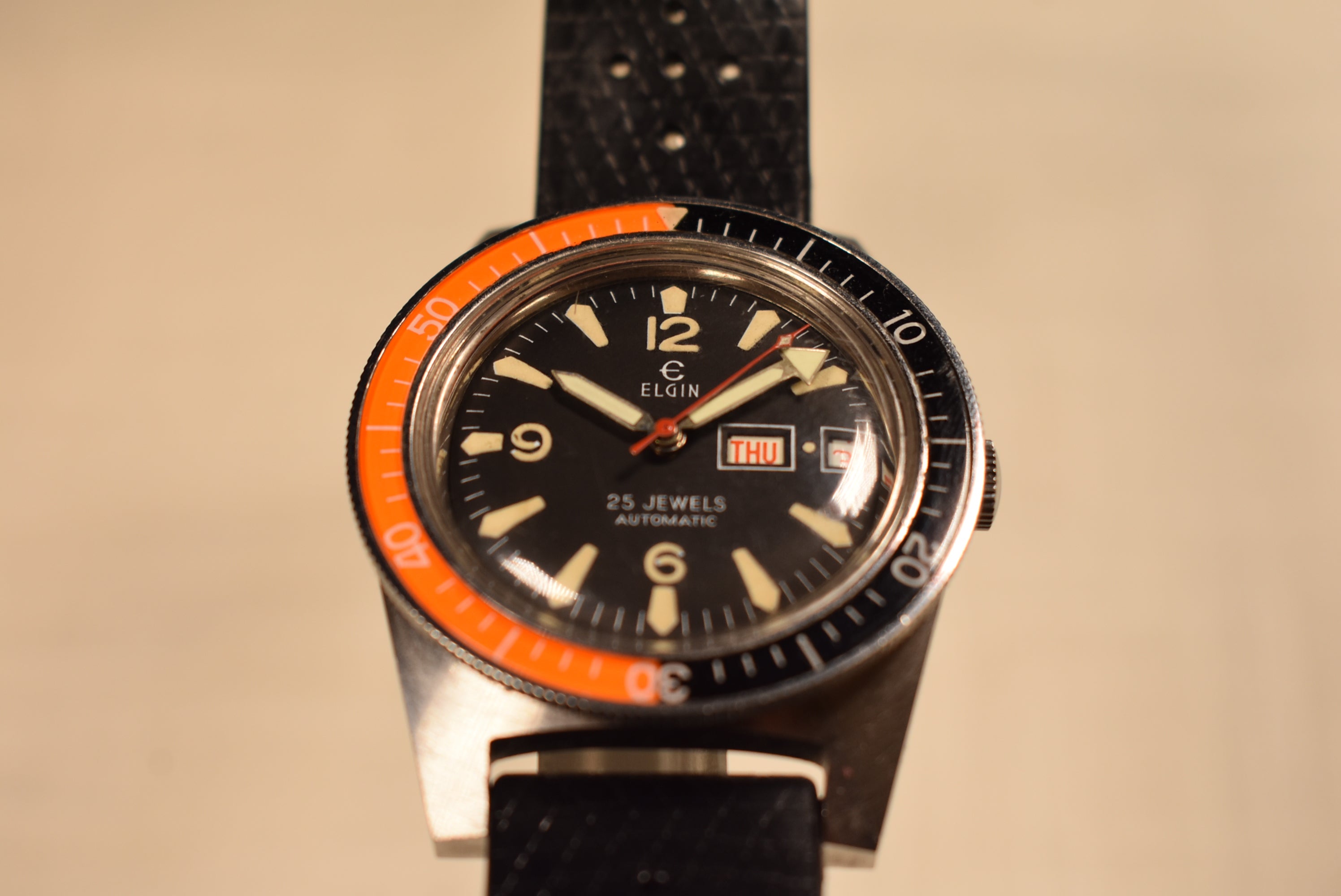 This Elgin Skin Diver features an amazing orange Bakelite bezel. The dial Lume has amazing patina and has turned into a creamy color. The watch is 37mm by 40mm with a 19mm lug width. The watch features an Elgin Day-Date automatic movement. The watch is running great with the date window functioning properly. However, the watches service history is unknown. THis model also features the caliber M135 also known as the PUW 1463.