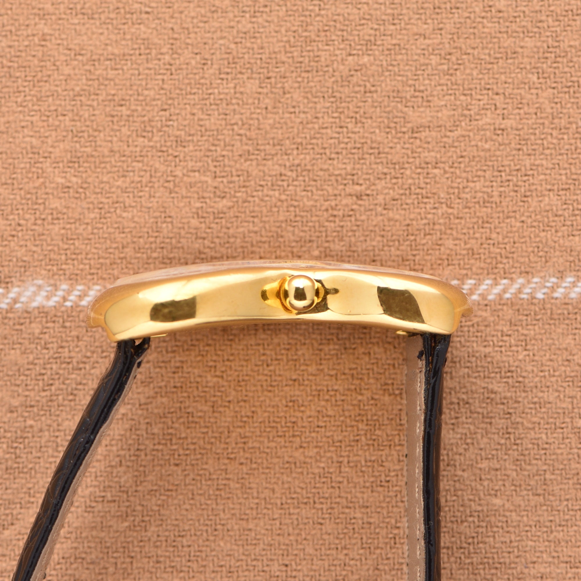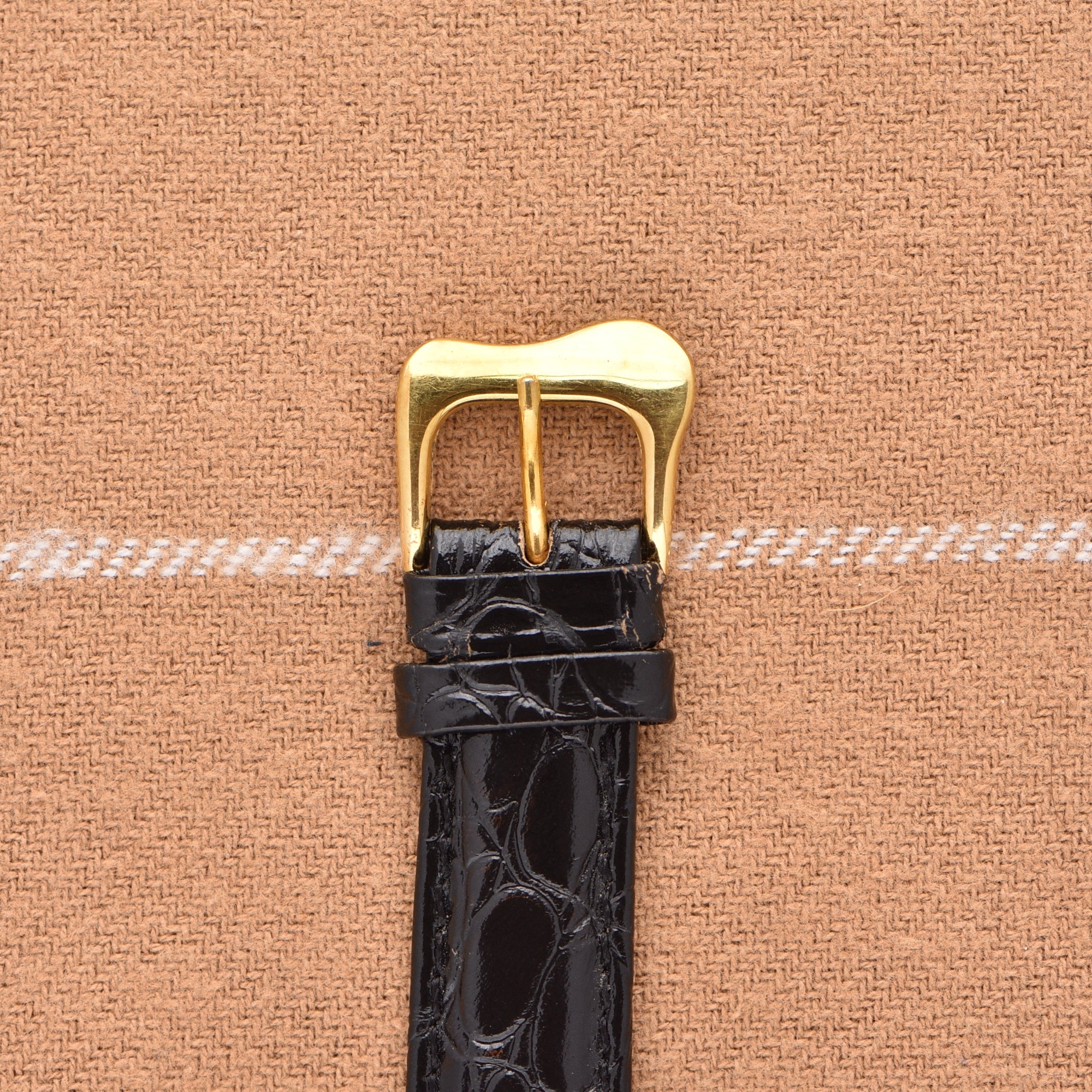 This dial is in very good condition with roman numerals. The gold-tone case looks just as good and is paired with the original gold buckle and strap. The watch has just been serviced with a new battery.