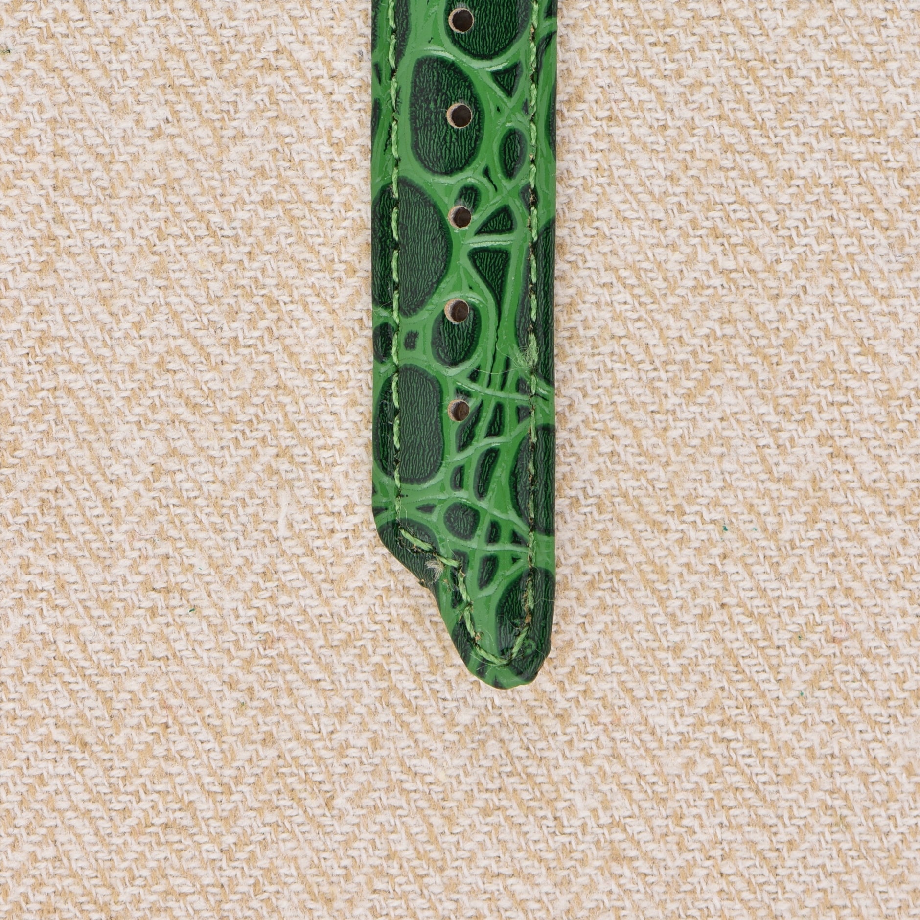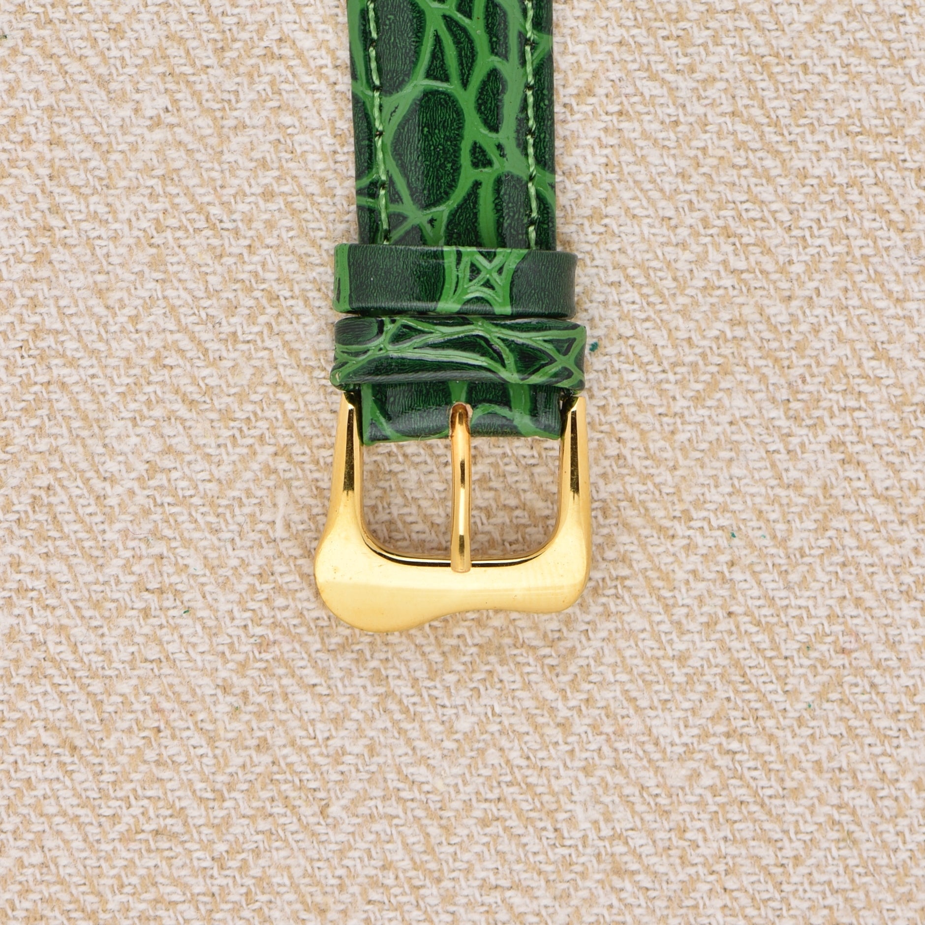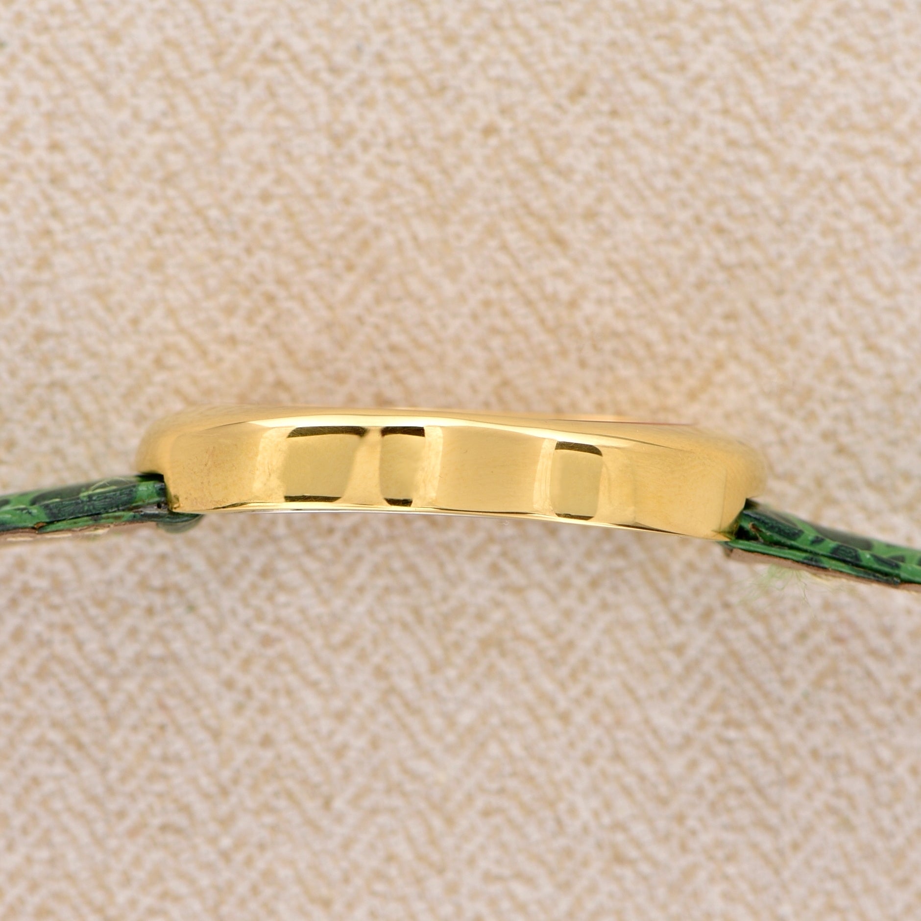 This dial is in very nice shape for its age. The crystal is in great condition with no dents or major wear. The gold-plated case is close to perfect with very light wear. The watch comes on an original new old stock green strap.