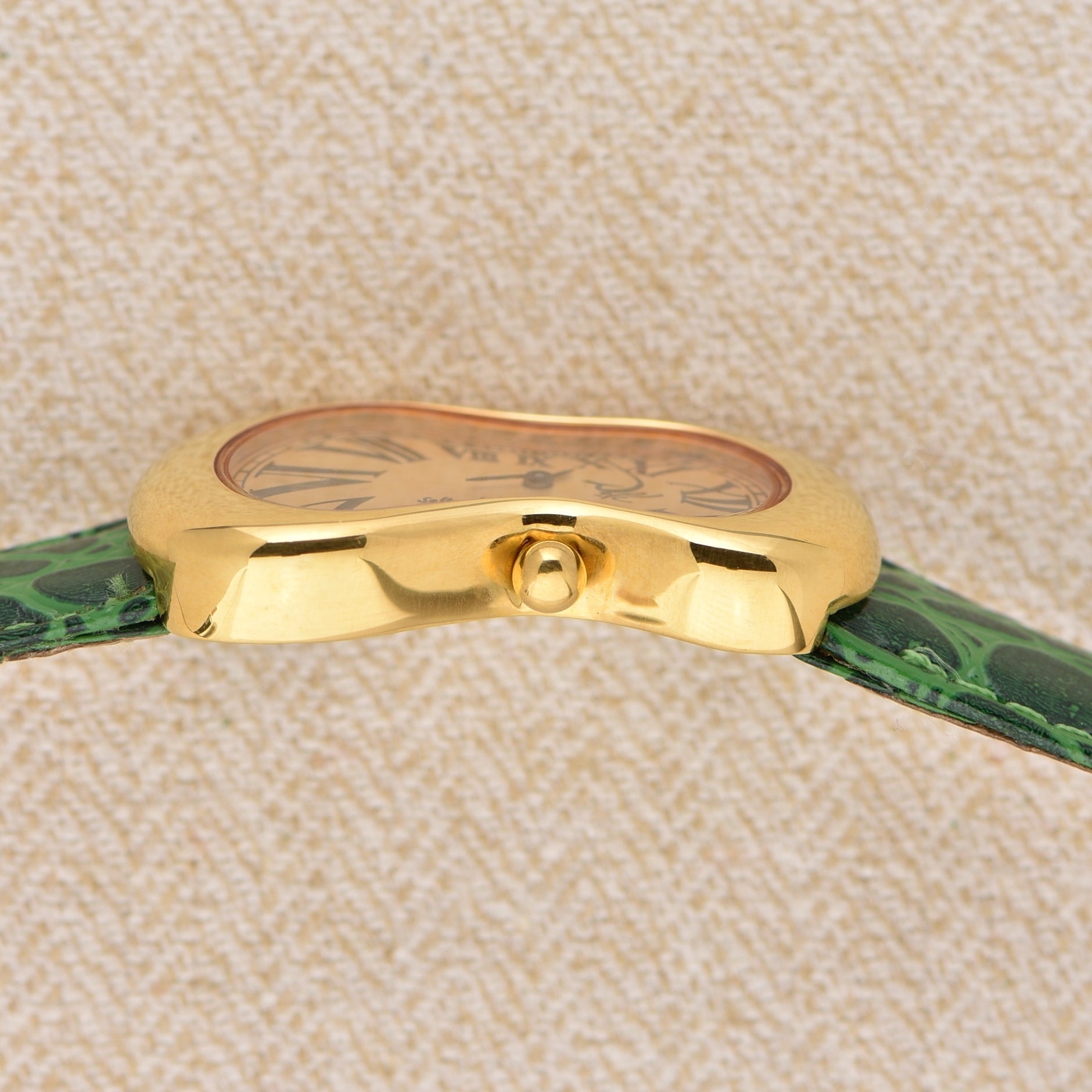 The Softwatch is known for its unique design, with a pear-shaped case and a dial that recalls the typical Cartier dial. It can be with or without writings on the dial, with the Softwatch inscription at six and the "Exaequo" at four on the index. The watch is powered by a quartz movement and comes with a paper box presenting the overall watch, warranty, and a full explanation of everything related to it.
