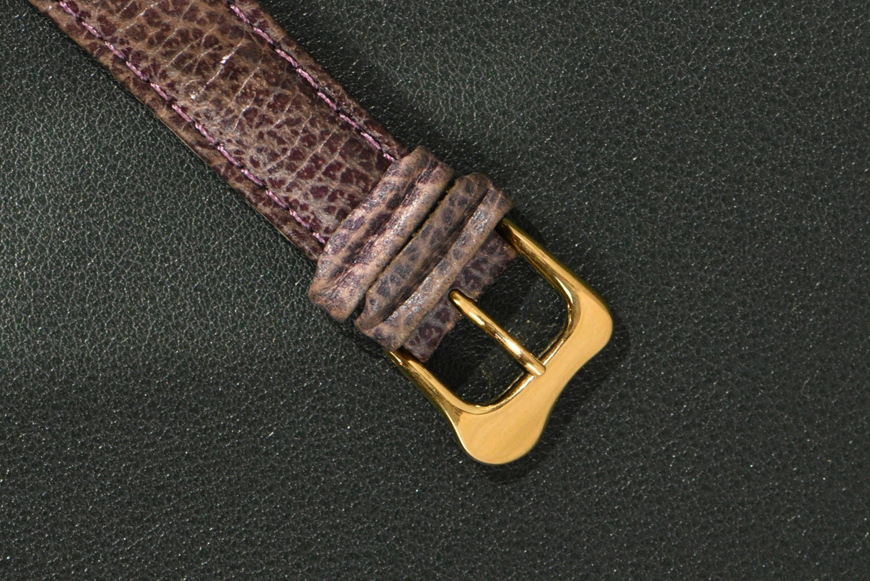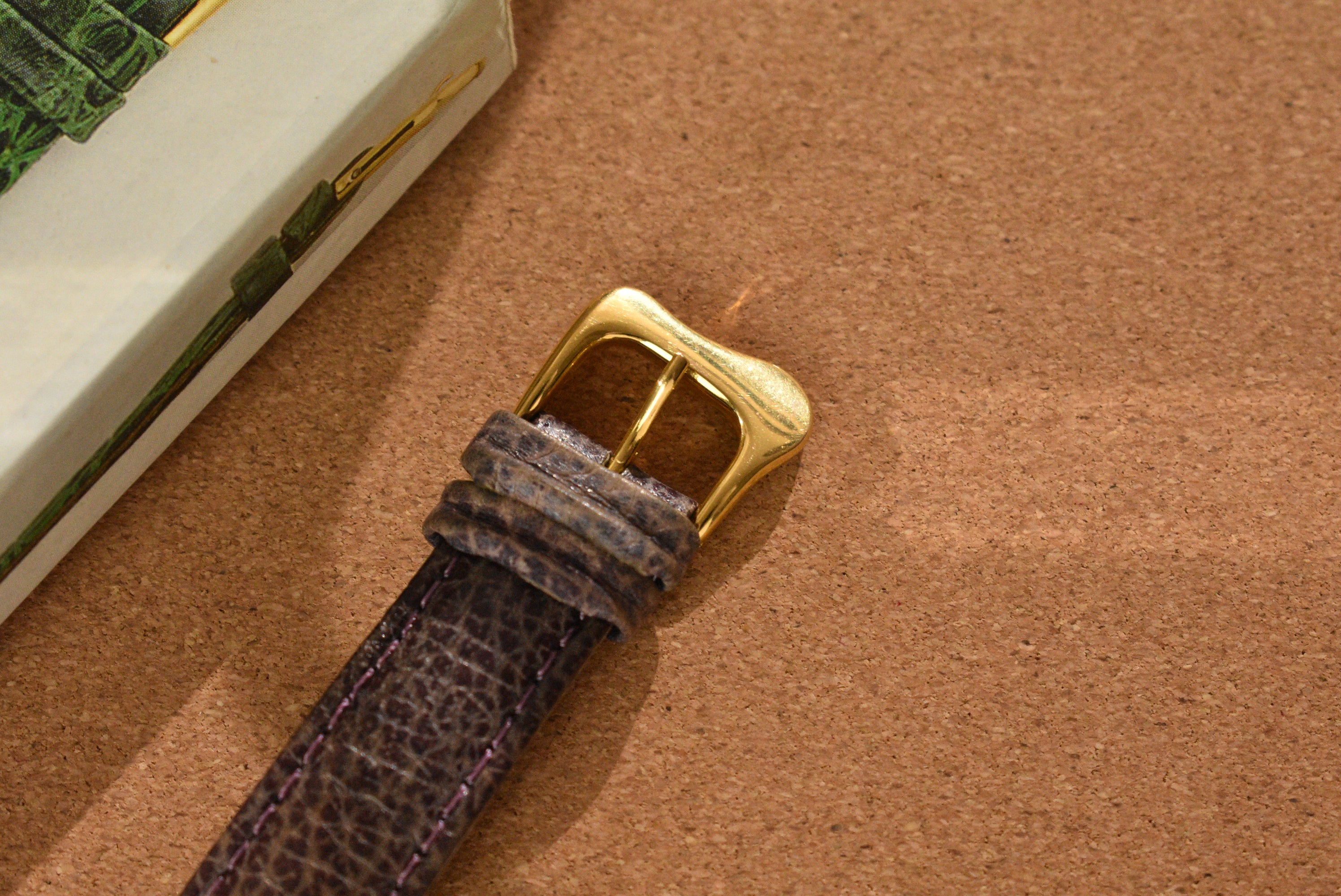 This dial is in very nice shape for its age. The crystal has some faint marks on it but 0 nicks or cracks. The gold-plated case has minor wear with some marks mainly noticeable on the top side of the case. The watch comes on a deep blue strap with its original strap, buckle, and box.
