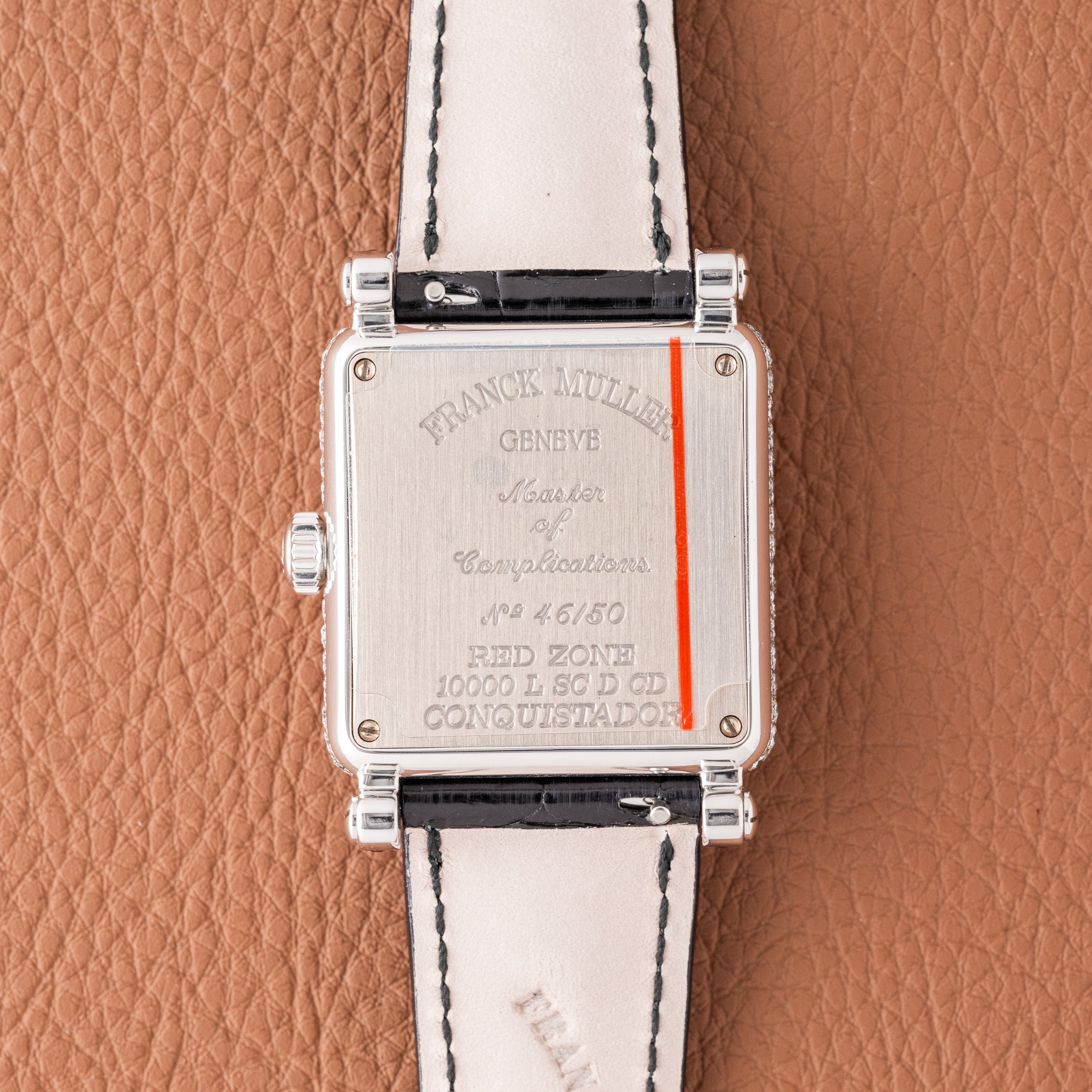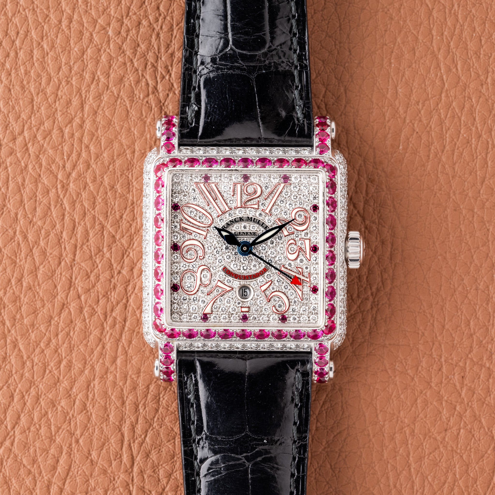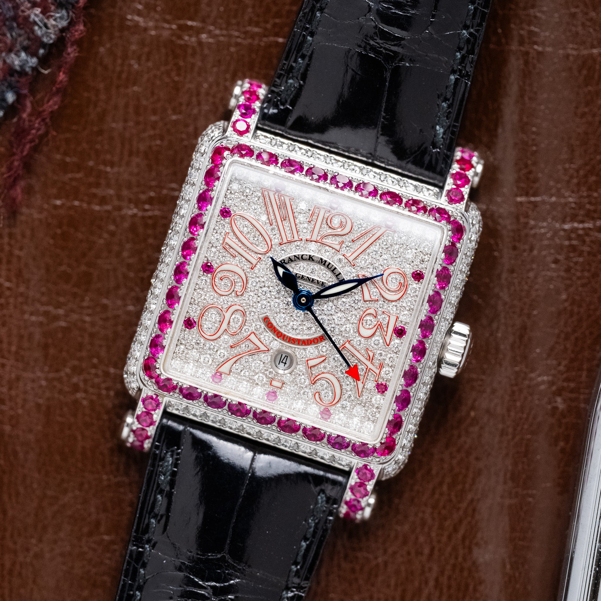 The Franck Muller Conquistador Red Zone is one of the brand’s most recognizable early limited editions, produced during the period when Franck Muller was pushing bold design and gemstone work into mainstream collector consciousness. The “Red Zone” name refers to the red arc on the dial, a subtle but distinctive detail that contrasts against the fully factory pavé diamond dial.