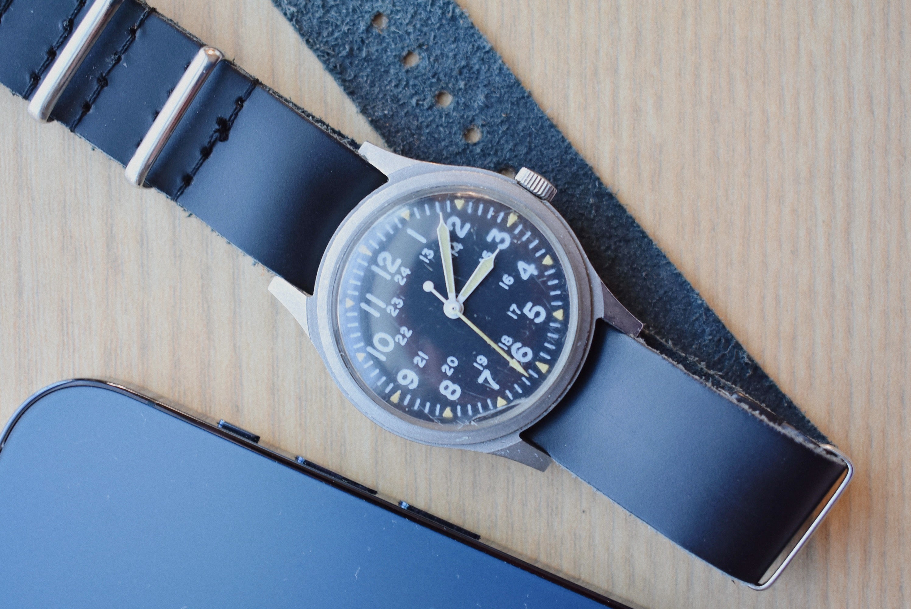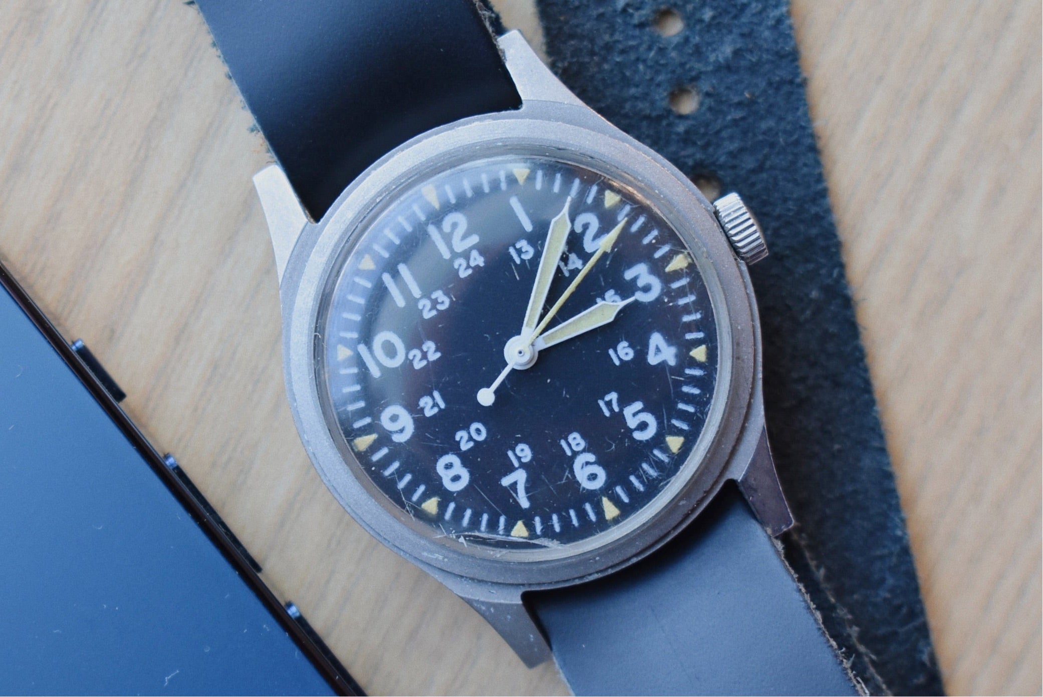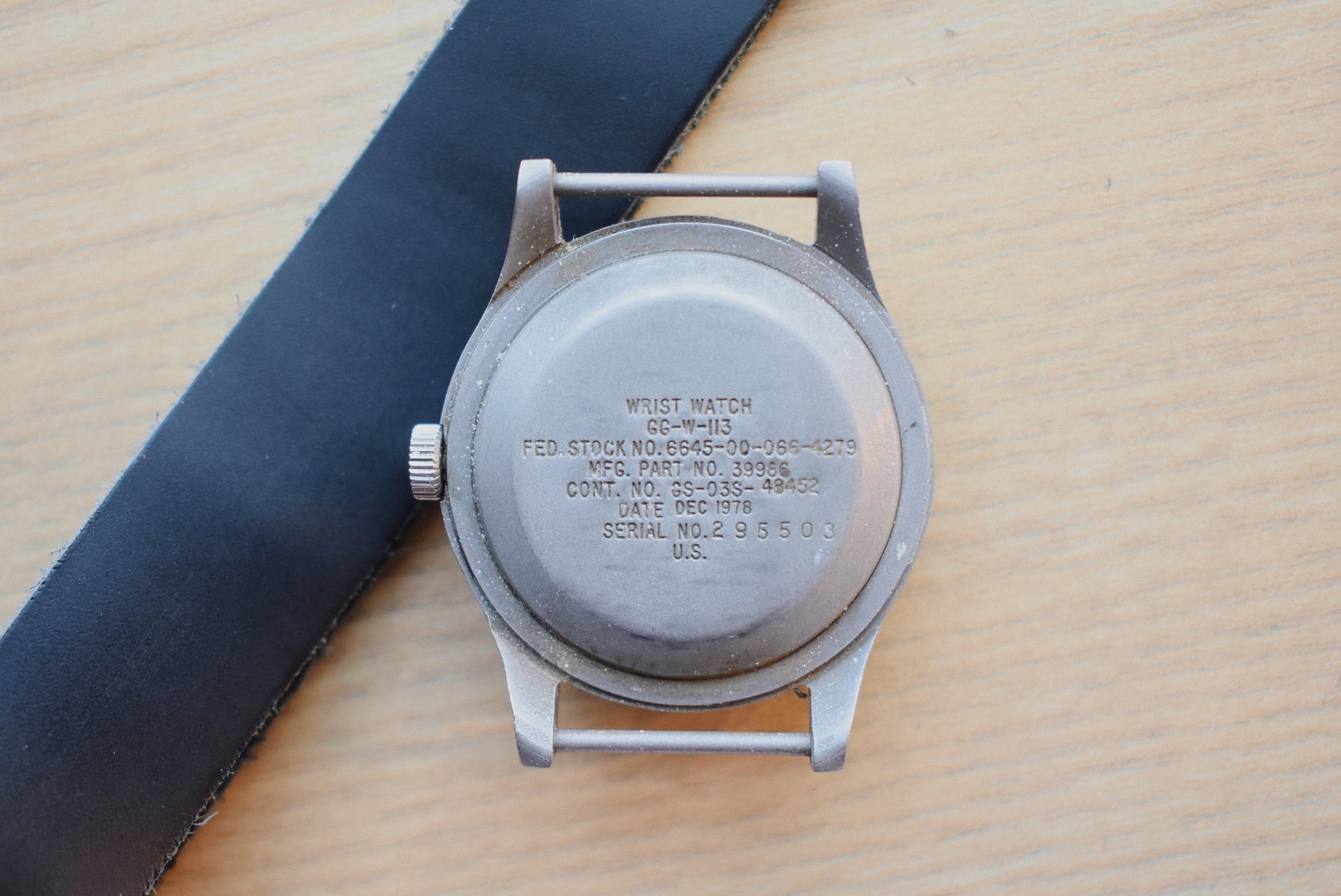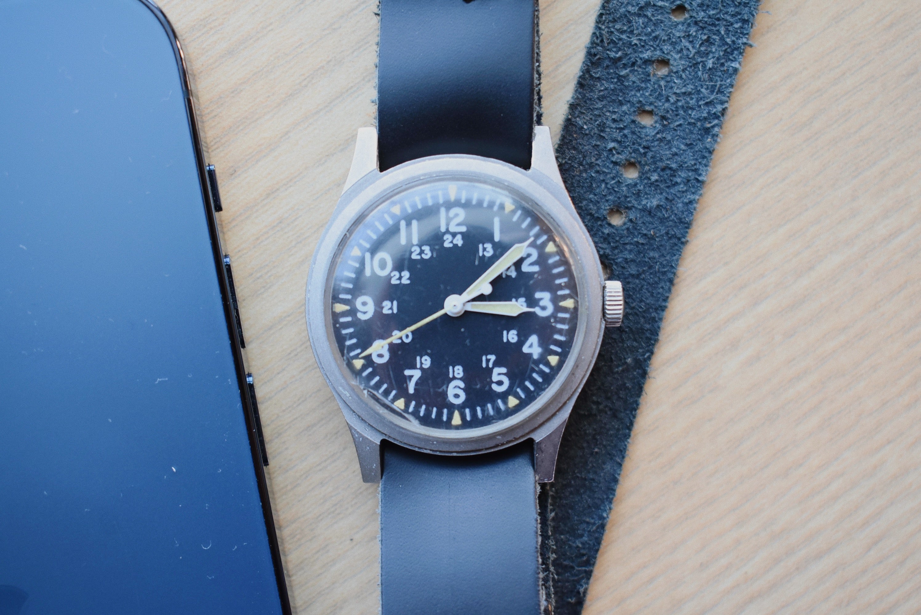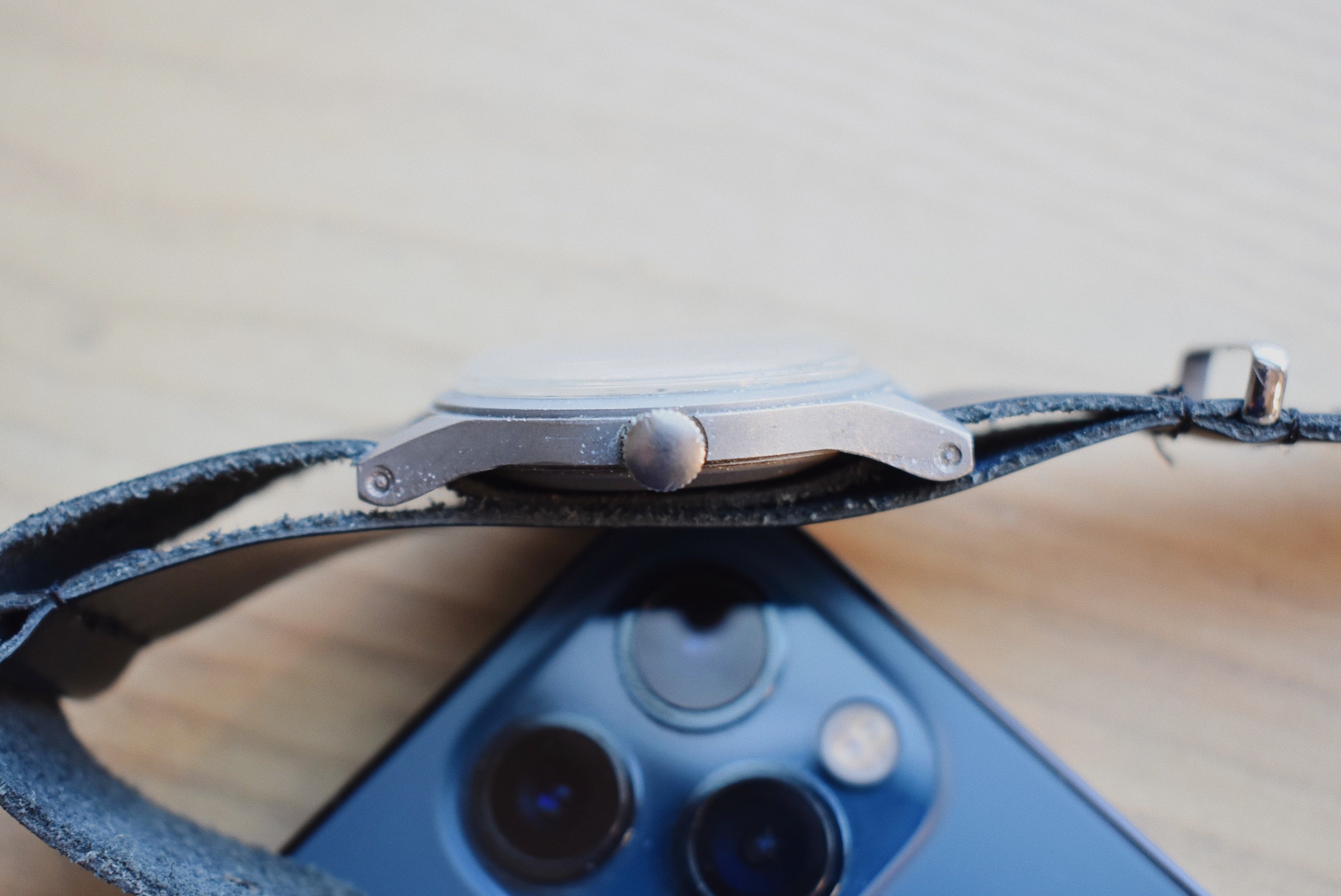 We always love getting military watches in! This Hamilton looks great with a beautiful dial. The patina has darkened into a beautiful pumpkin color while the hands have gained a creamy texture. The watch features a hacking movement, while the watch is in running condition it is good to note that the crystal is cracked by the 7. The watch also features welded lugs and an aftermarket leather NATO.