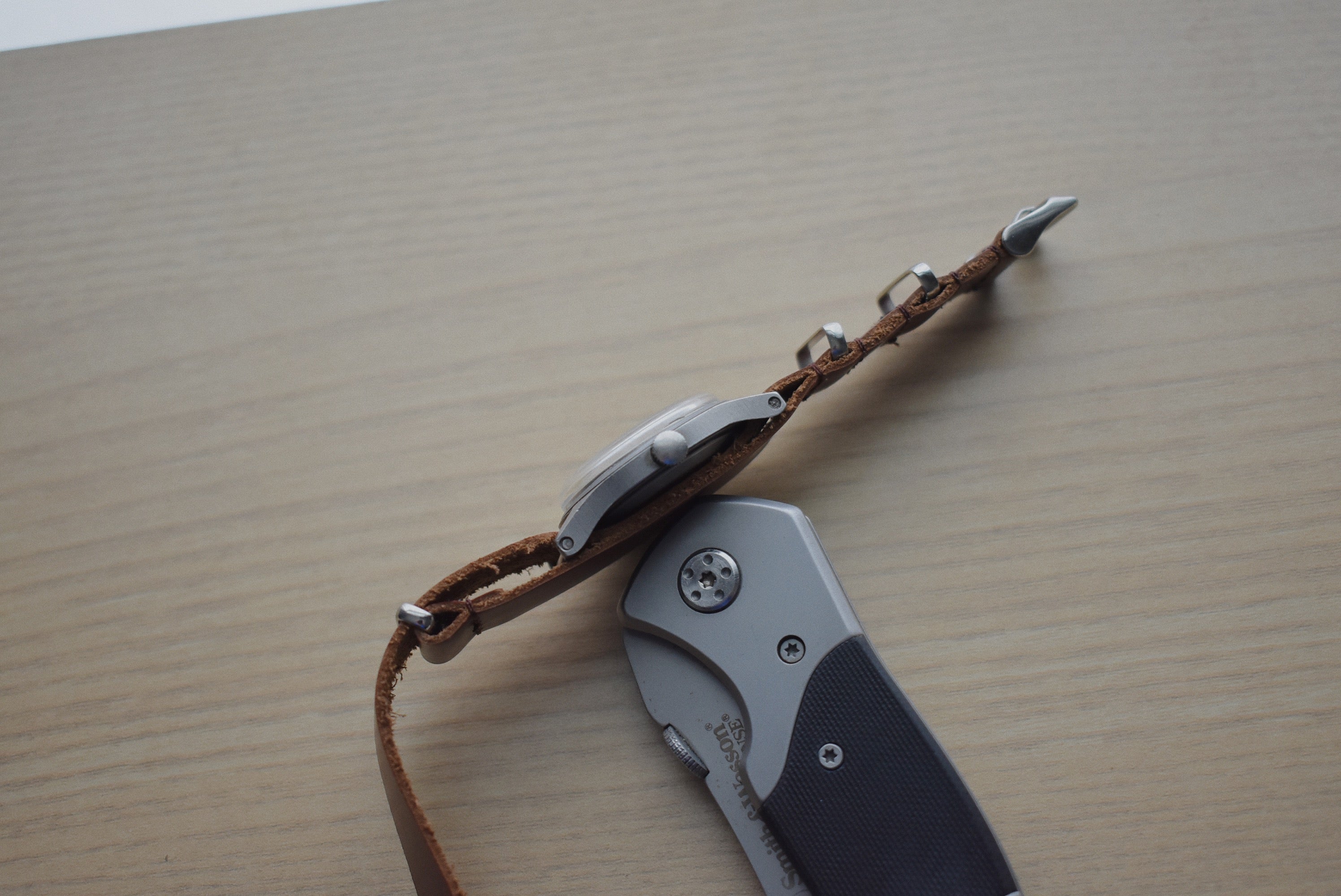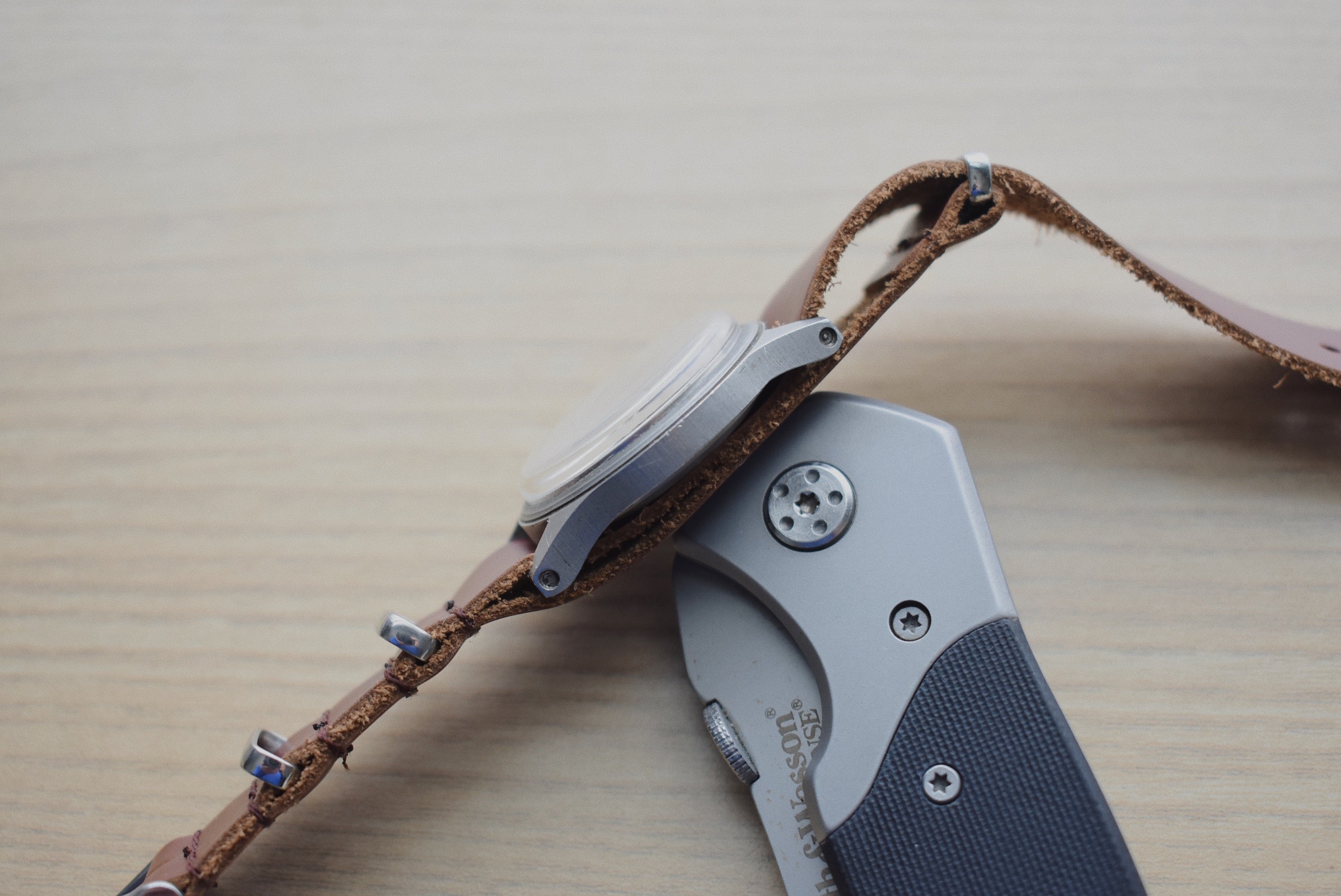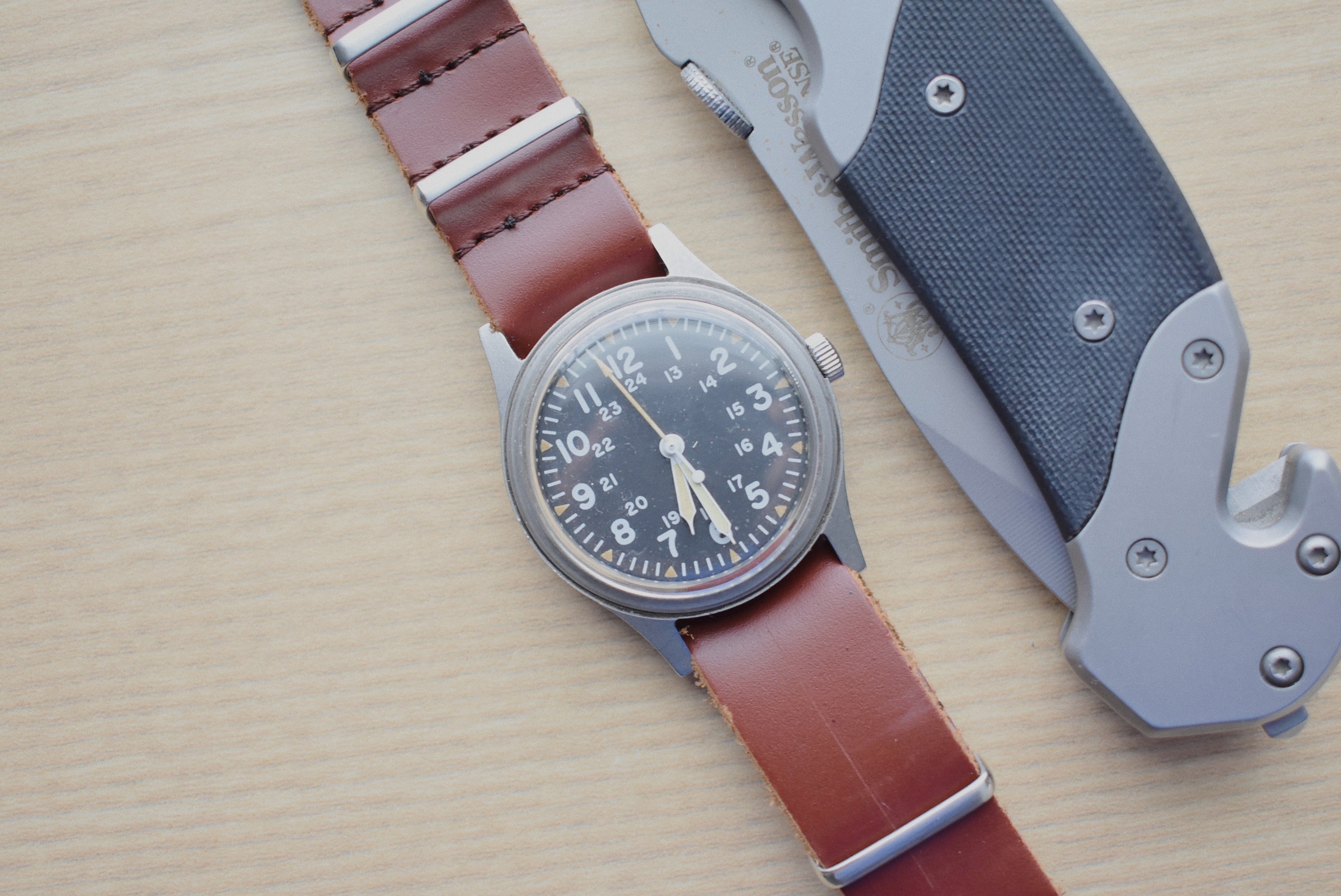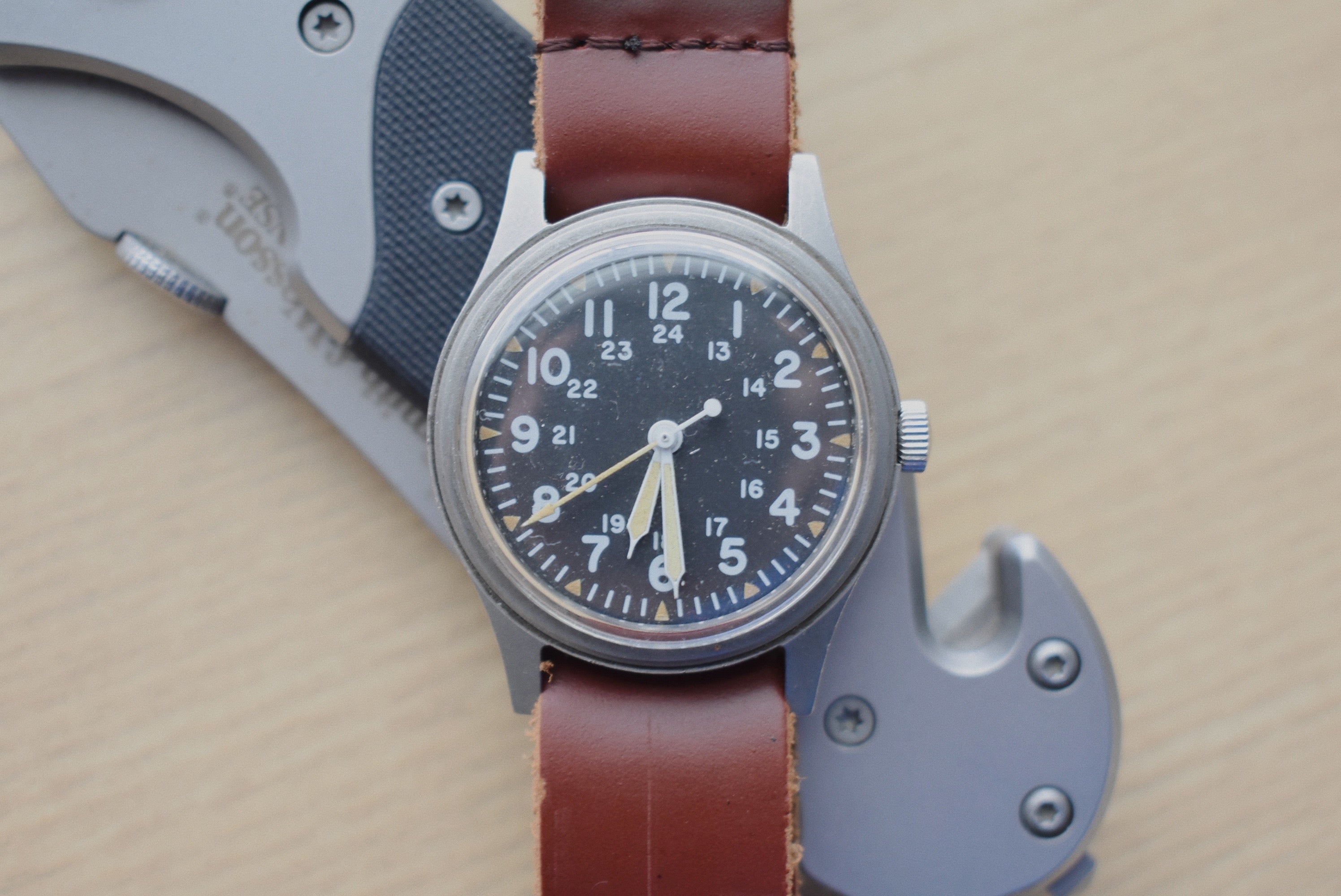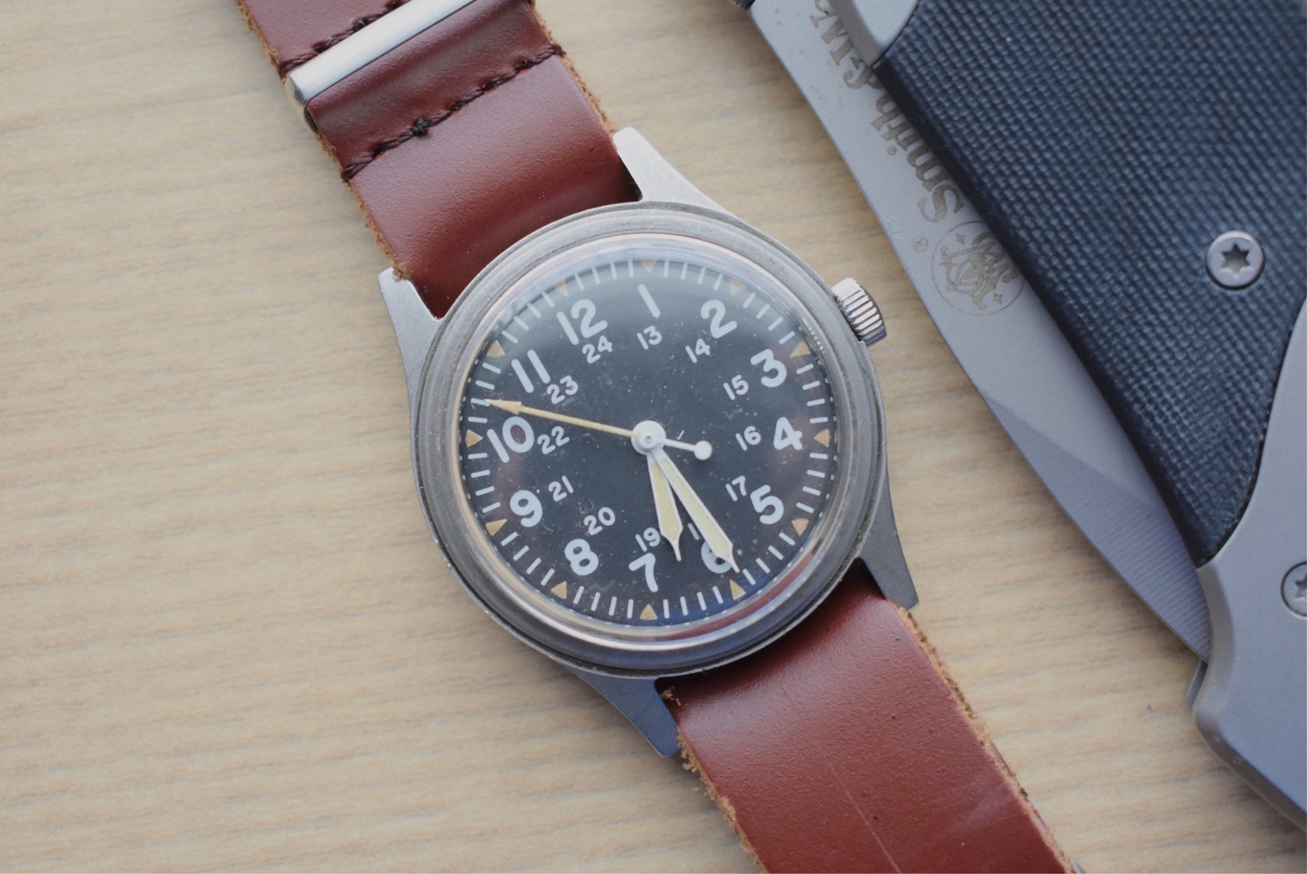 We always love getting military watches in! This Hamilton looks great with a beautiful dial. The patina has darkened into a beautiful pumpkin color while the hands have gained a creamy texture. The watch features a hacking movement, while the watch is in running condition it is good to note that the movement does wiggle some when the watch is wound. The watch also feature welded lugs and an aftermarket leather NATO.
