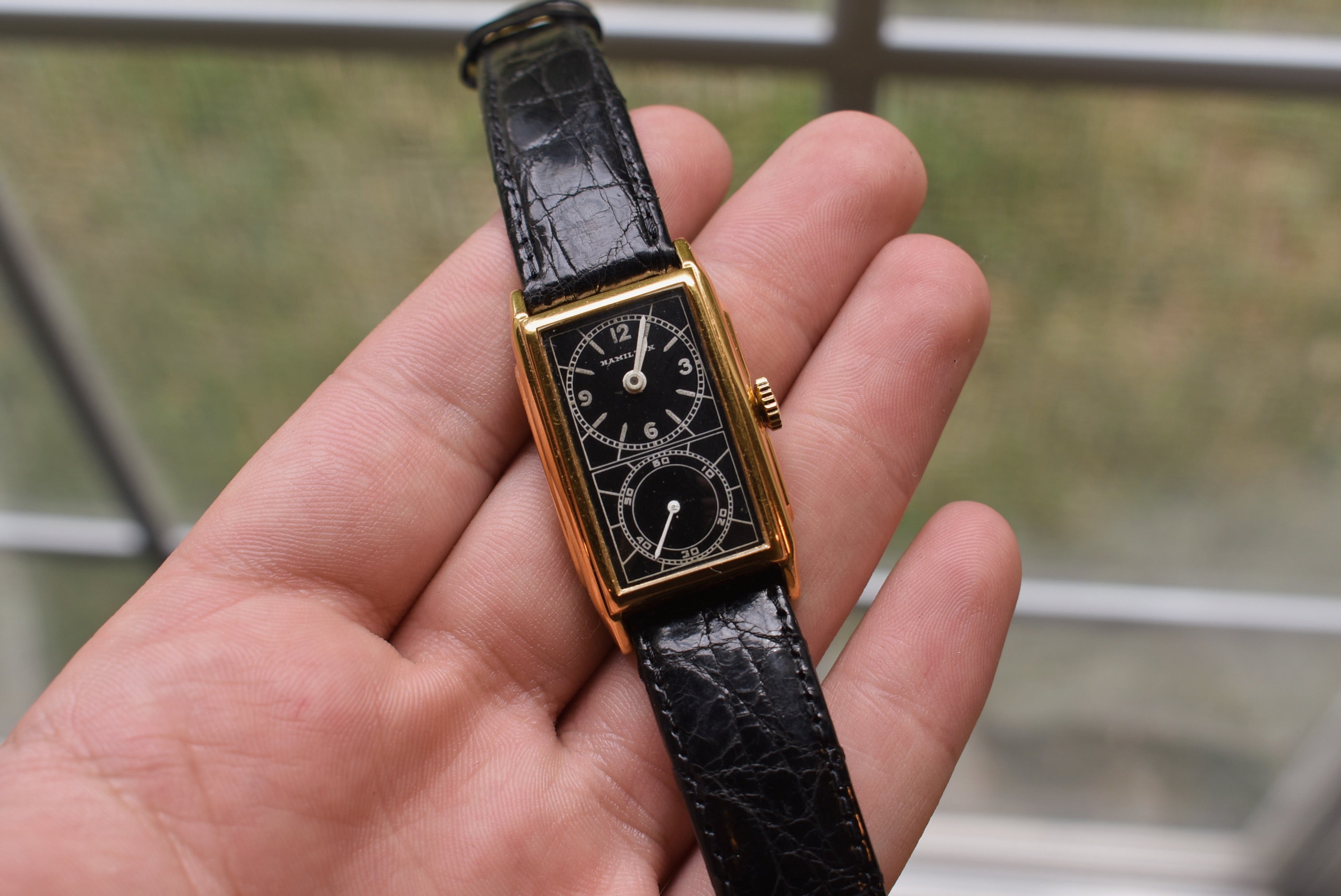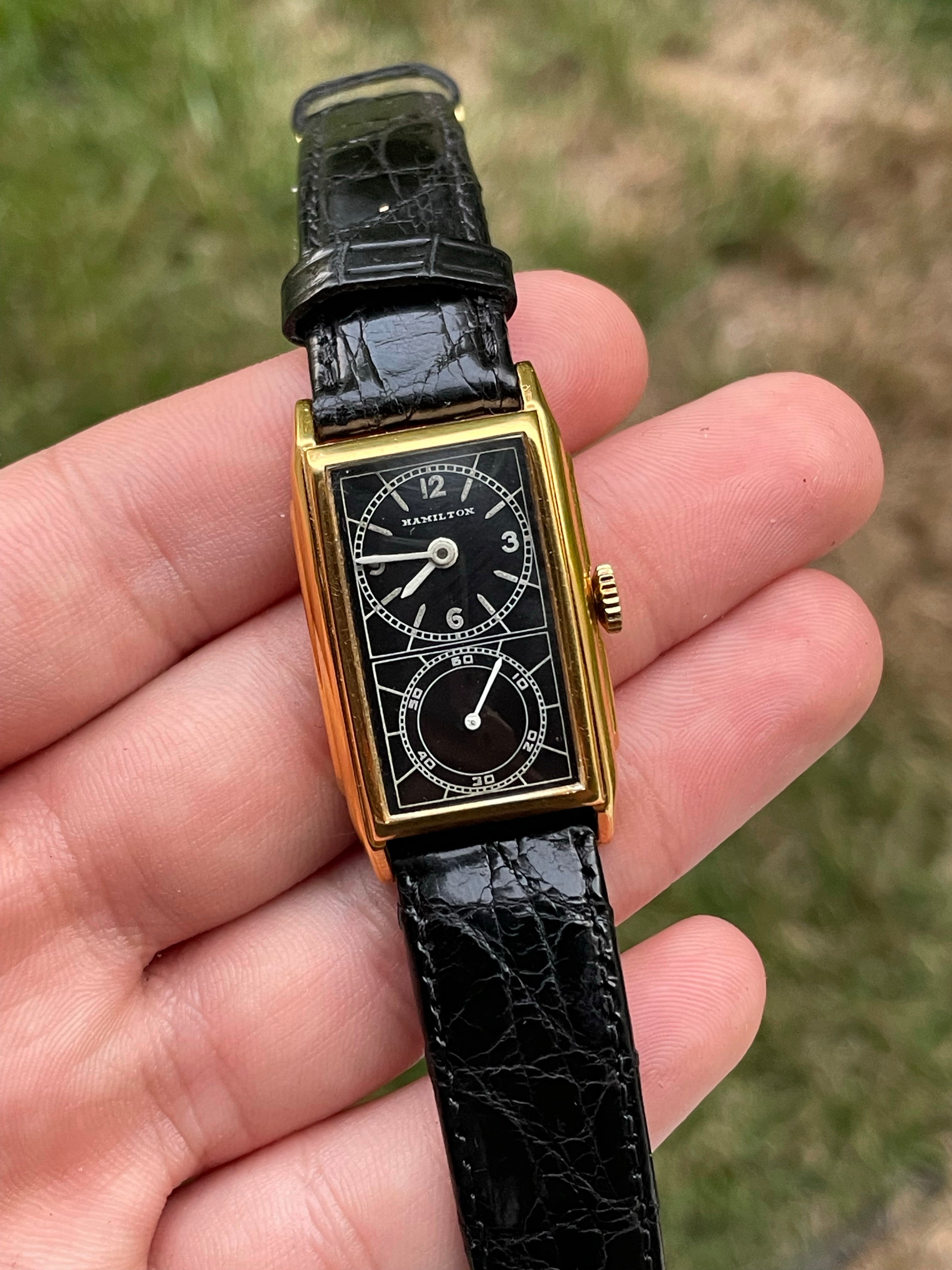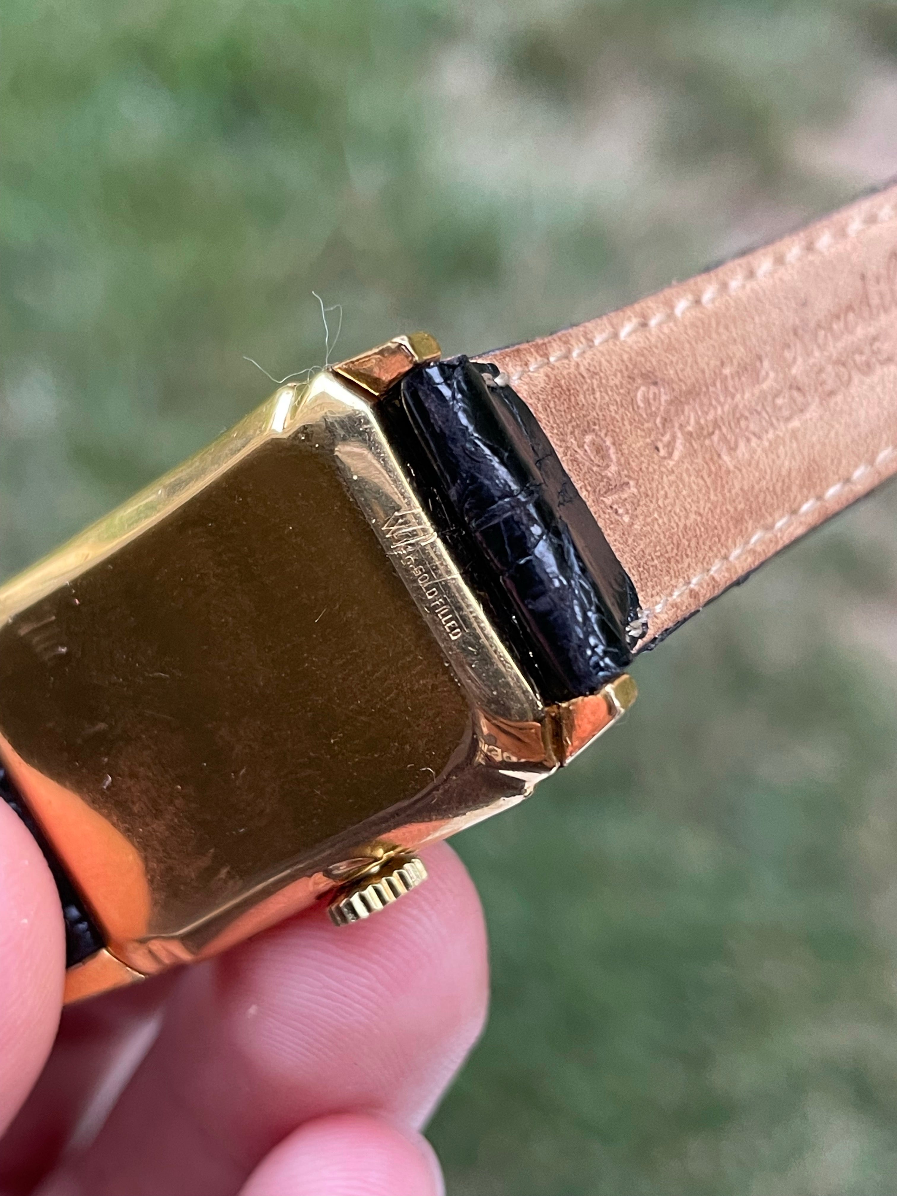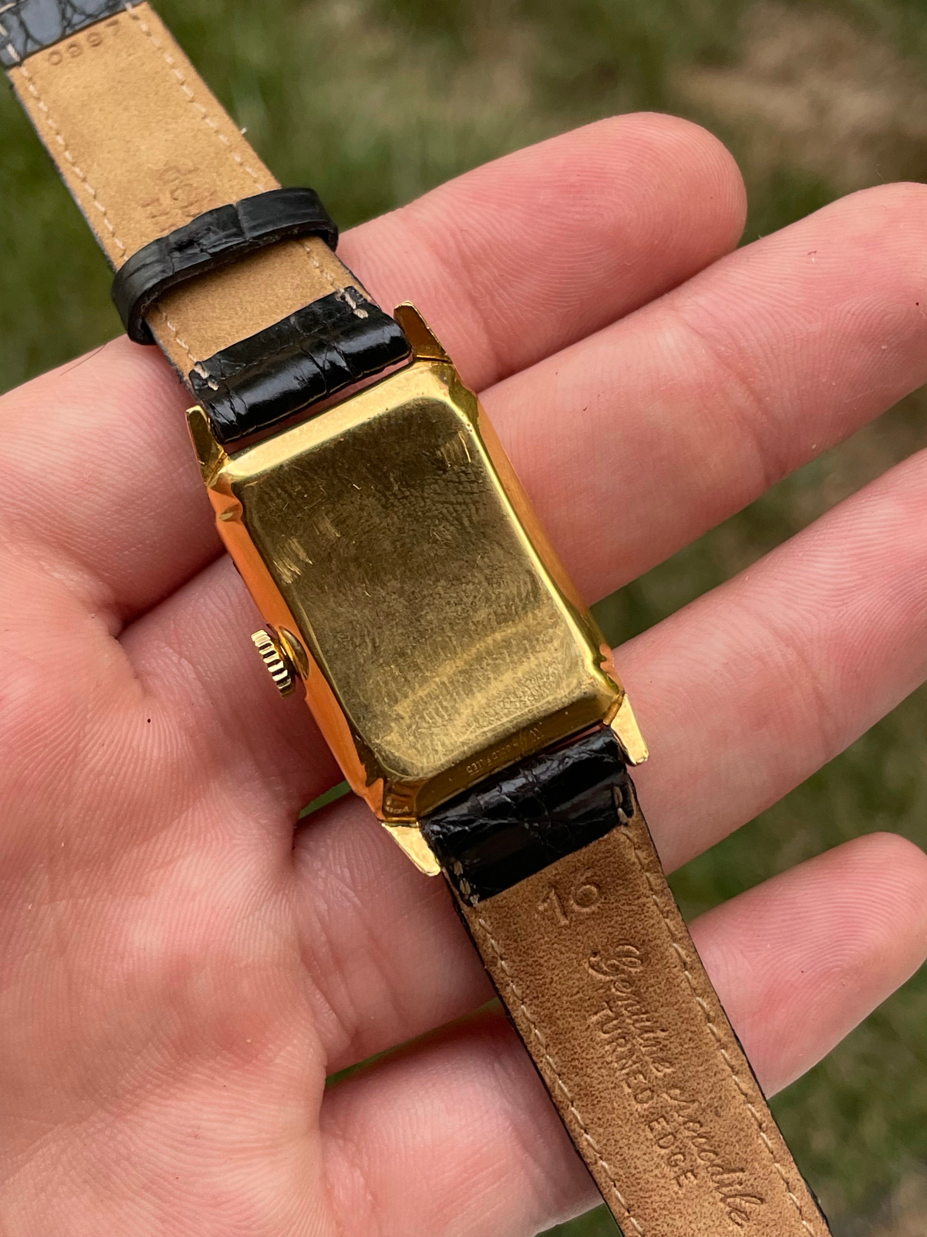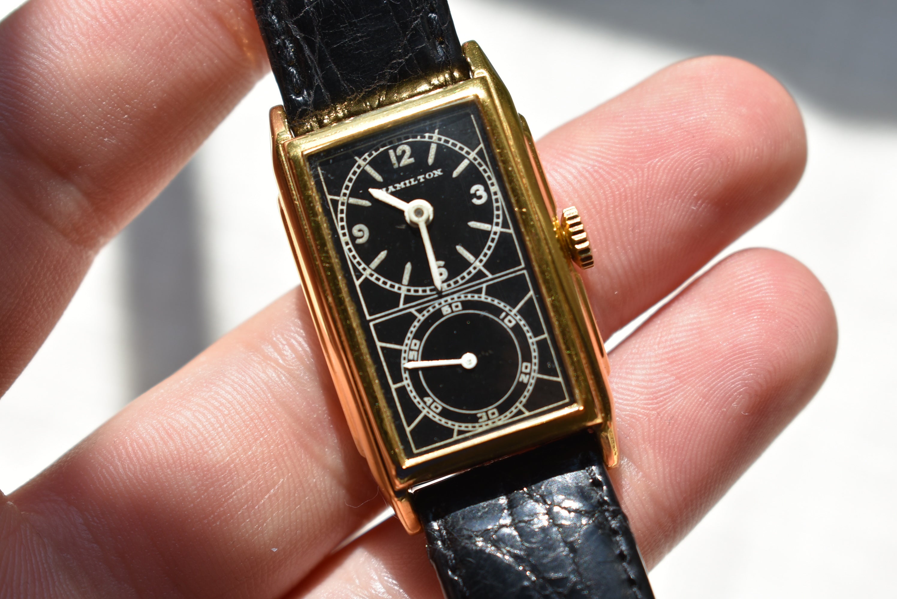 | This is a Vintage Hamilton Seckron Doctors Tank Watch Gold Filled. The watch has a brand new NOS Hamilton Crystal from the exact era. It is in great condition and running strong but has not been timed for accuracy and has no service records. The case is still in very good condition with very minimal wear and no tarnish on the caseback. This model dares to the 1940s |