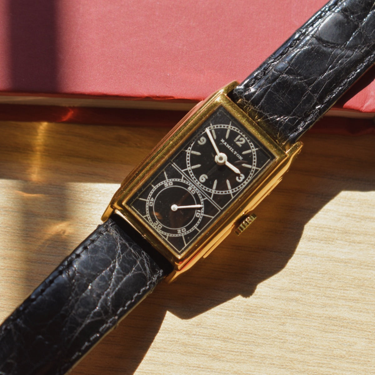 This is a Vintage Hamilton Seckron Doctors Tank Watch Gold Filled. The watch has a brand new NOS Hamilton Crystal from the exact era. It is in great condition and running strong but has not been timed for accuracy and has no service records. The case is still in very good condition with very minimal wear and no tarnish on the caseback. This model dates to the 1930s.
