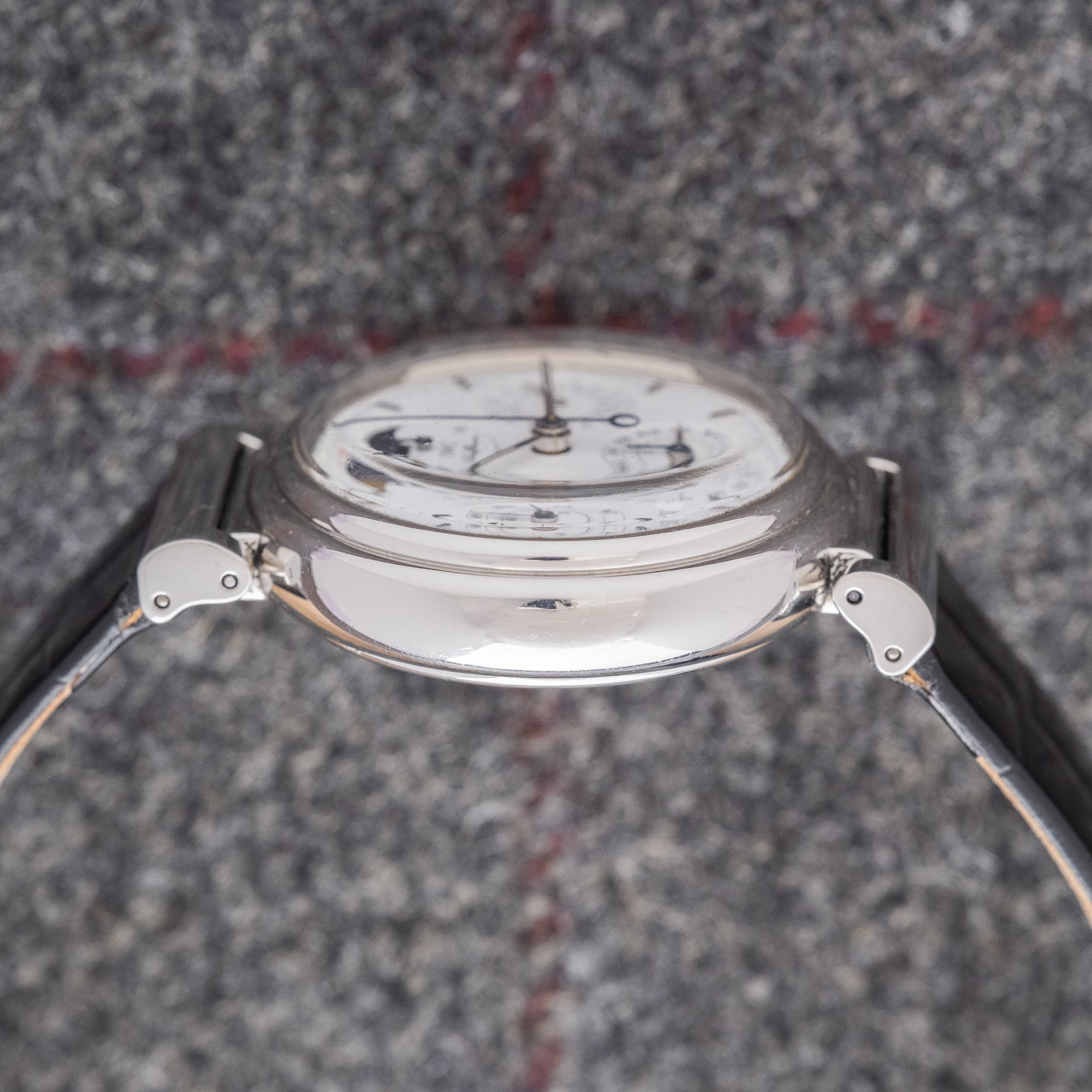 Dial: The dial is a very uncommon white example. White dials are mainly seen with precious metal perpetual calendars. The majority of steel examples are black dial examples. Only a handful ever hit the market with white dials.