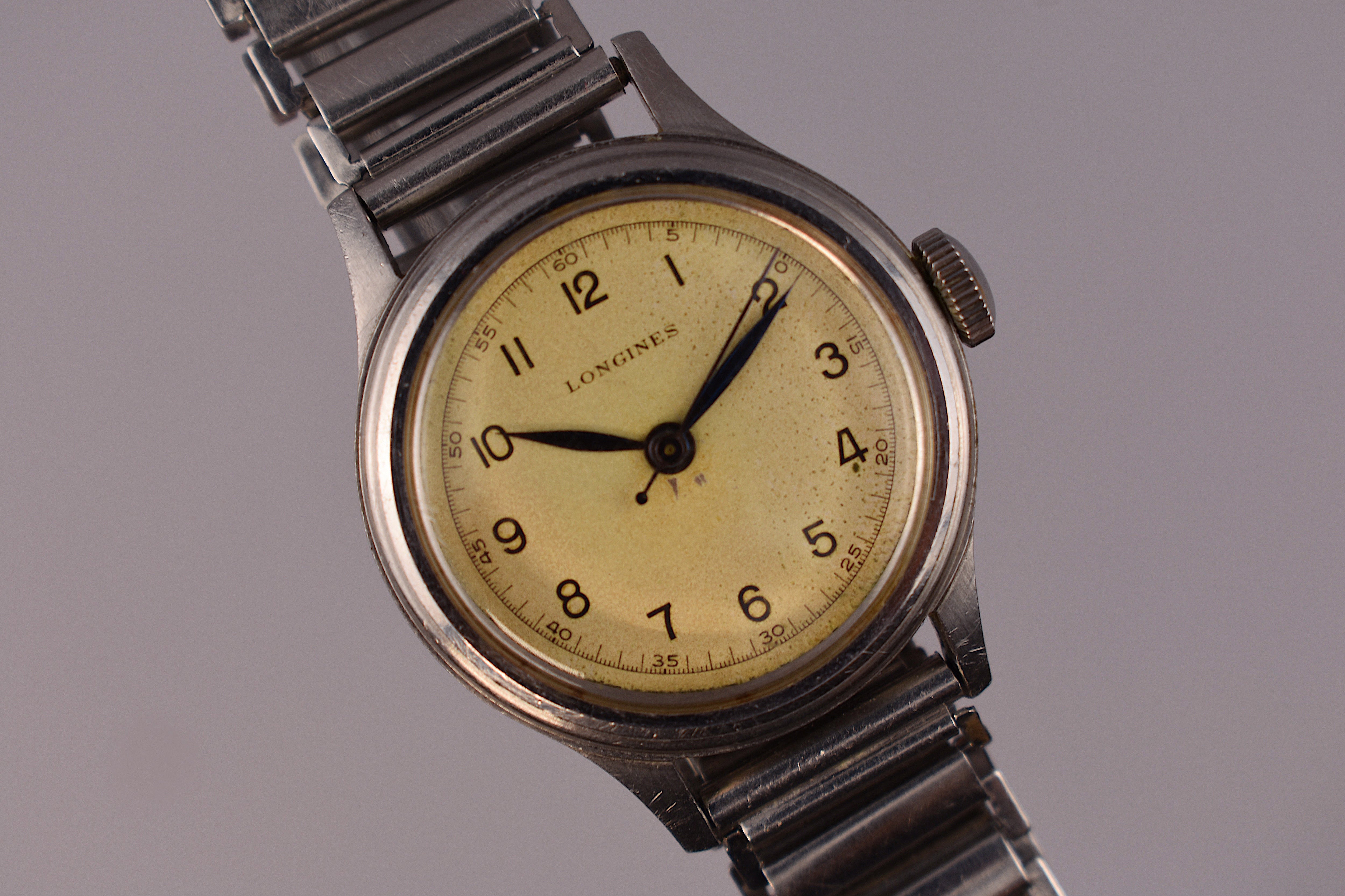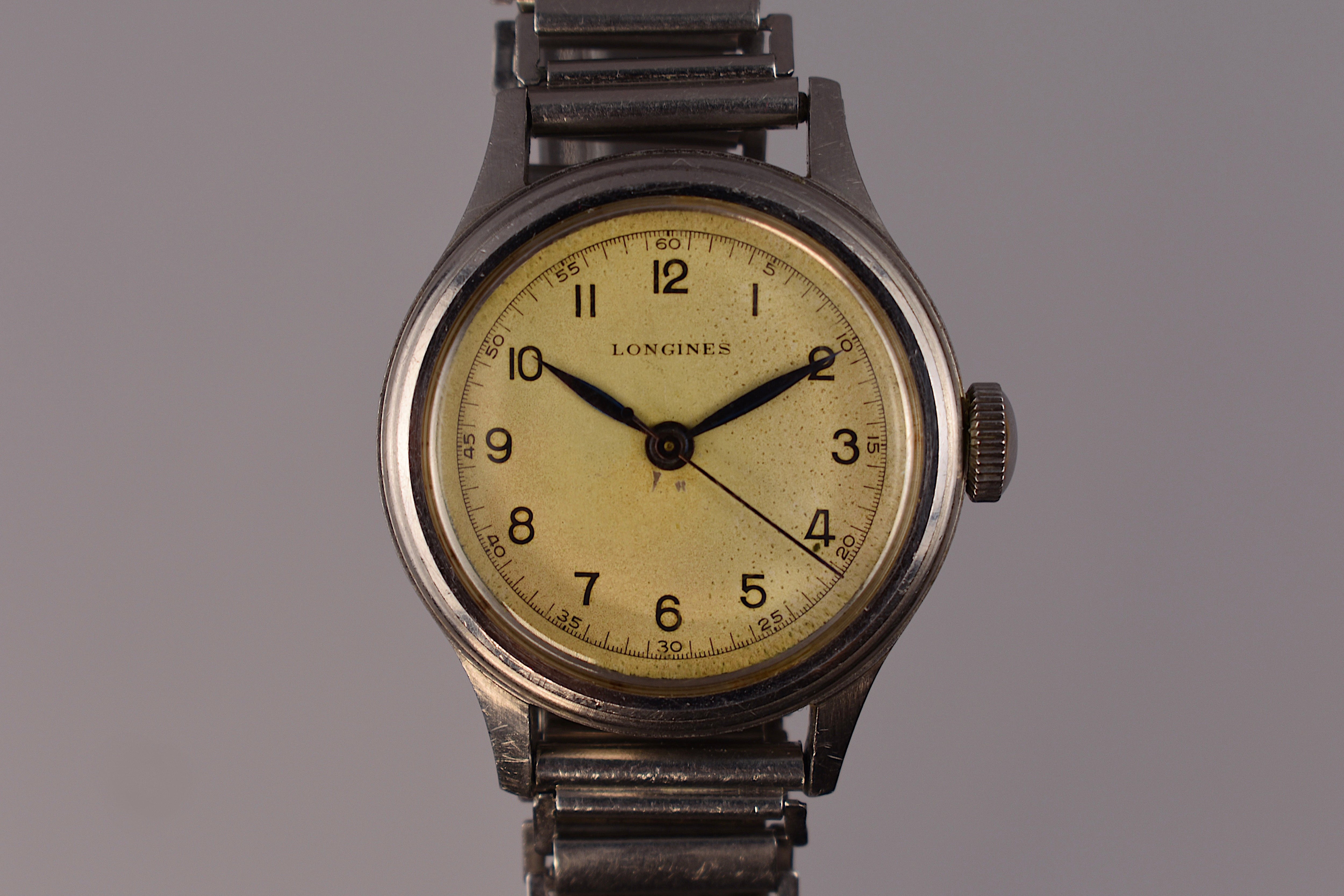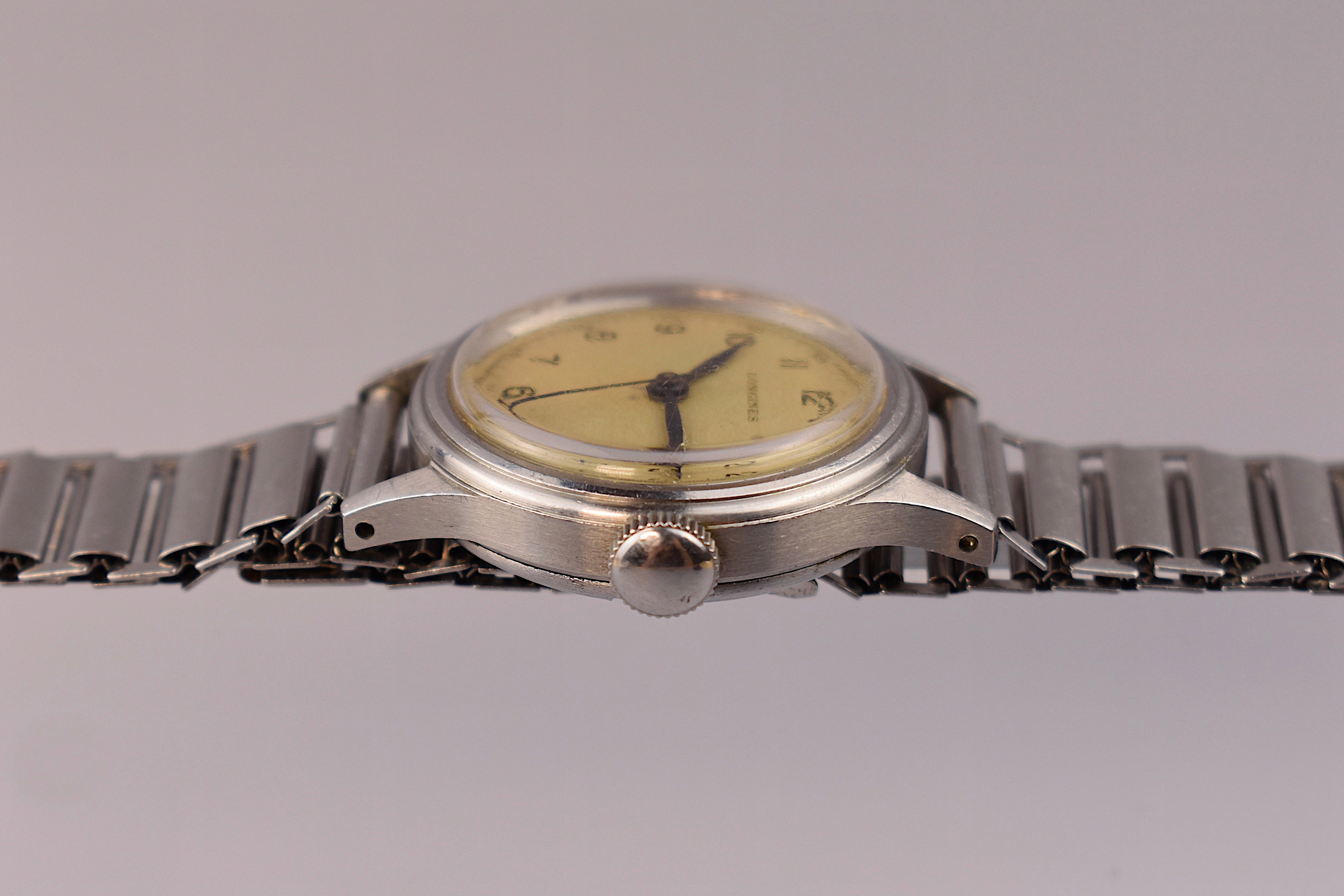 One of the most beautiful military watches from WW2. The thick step case is stunning. The crown is big and easy to grip. The dial is simple and clean. The hands are blue and stunning. While all these things are amazing, what makes this even better is the original Forstner Bonklip bracelet. These bracelets were made so that pilots can easily strap these on the outside of there jackets while flying. A rare siting as always with these Sei Tacche step cases and we love them!