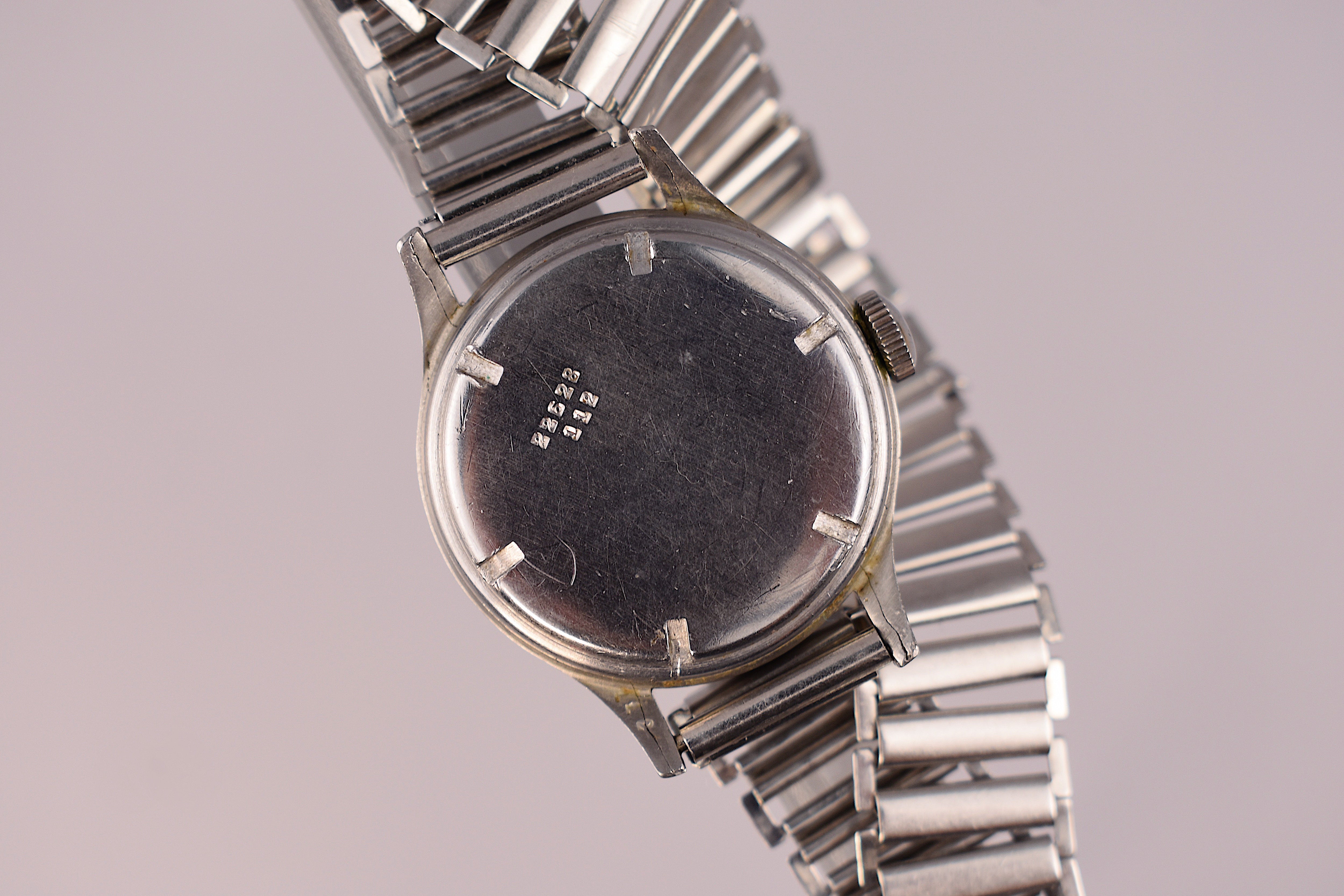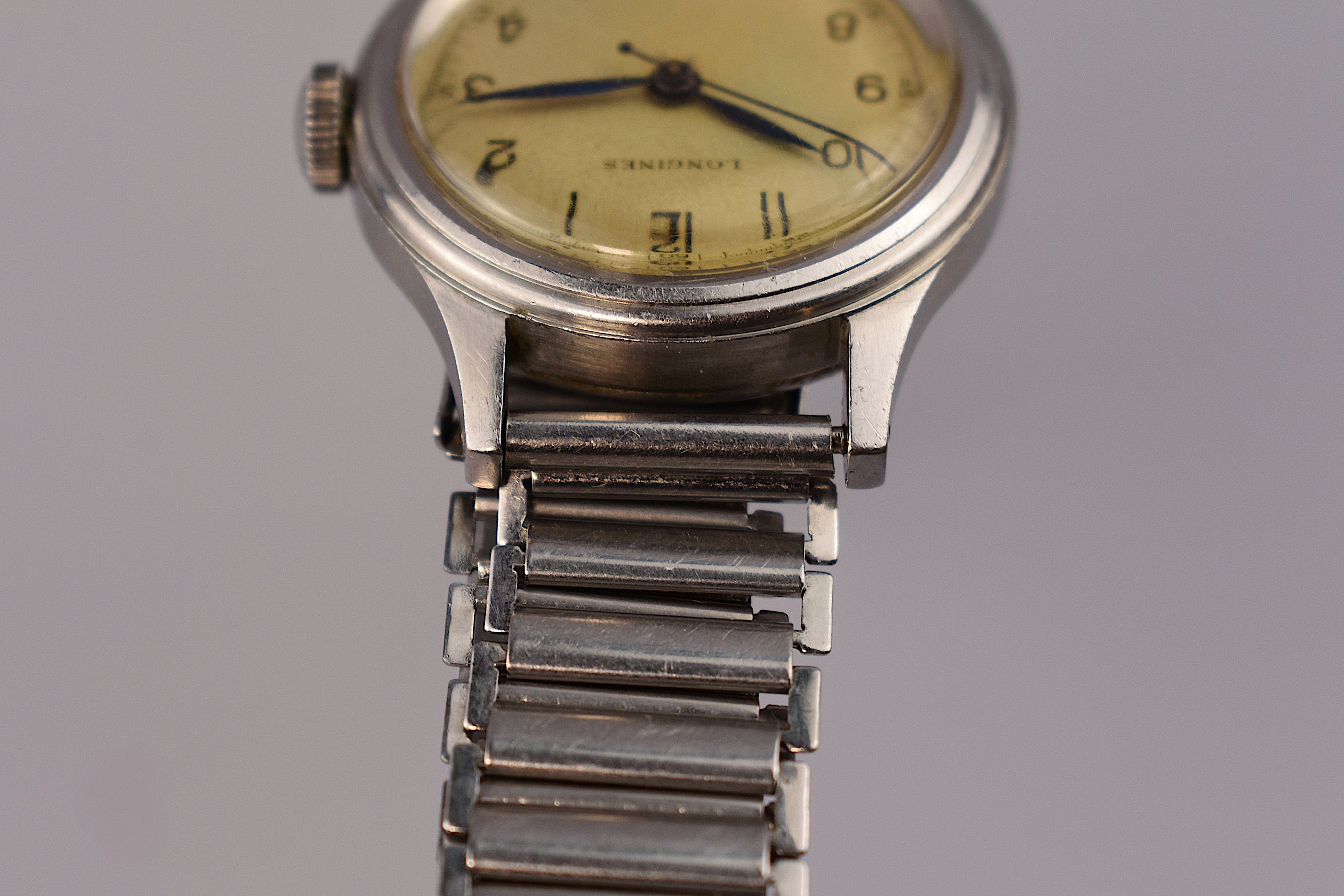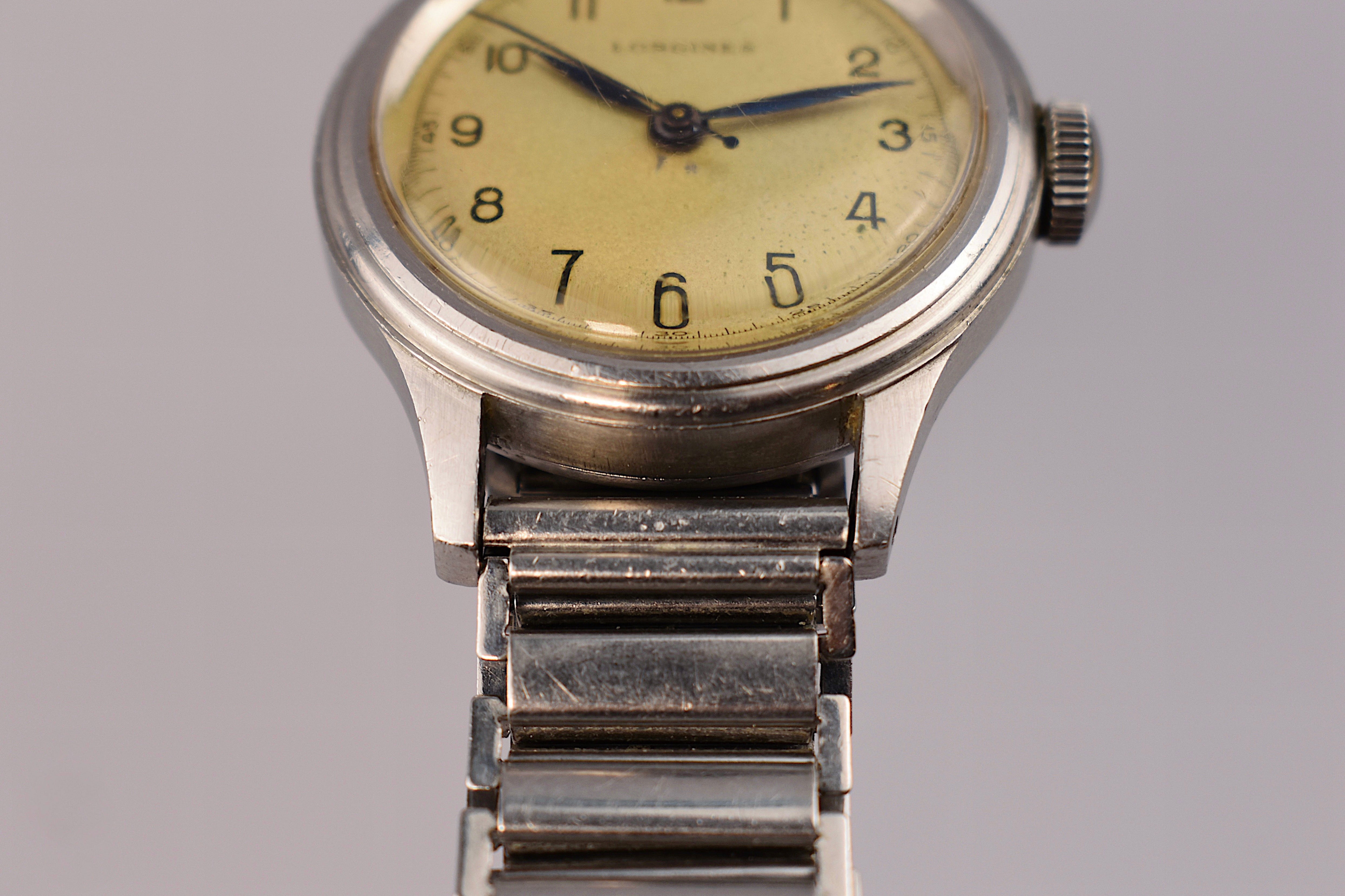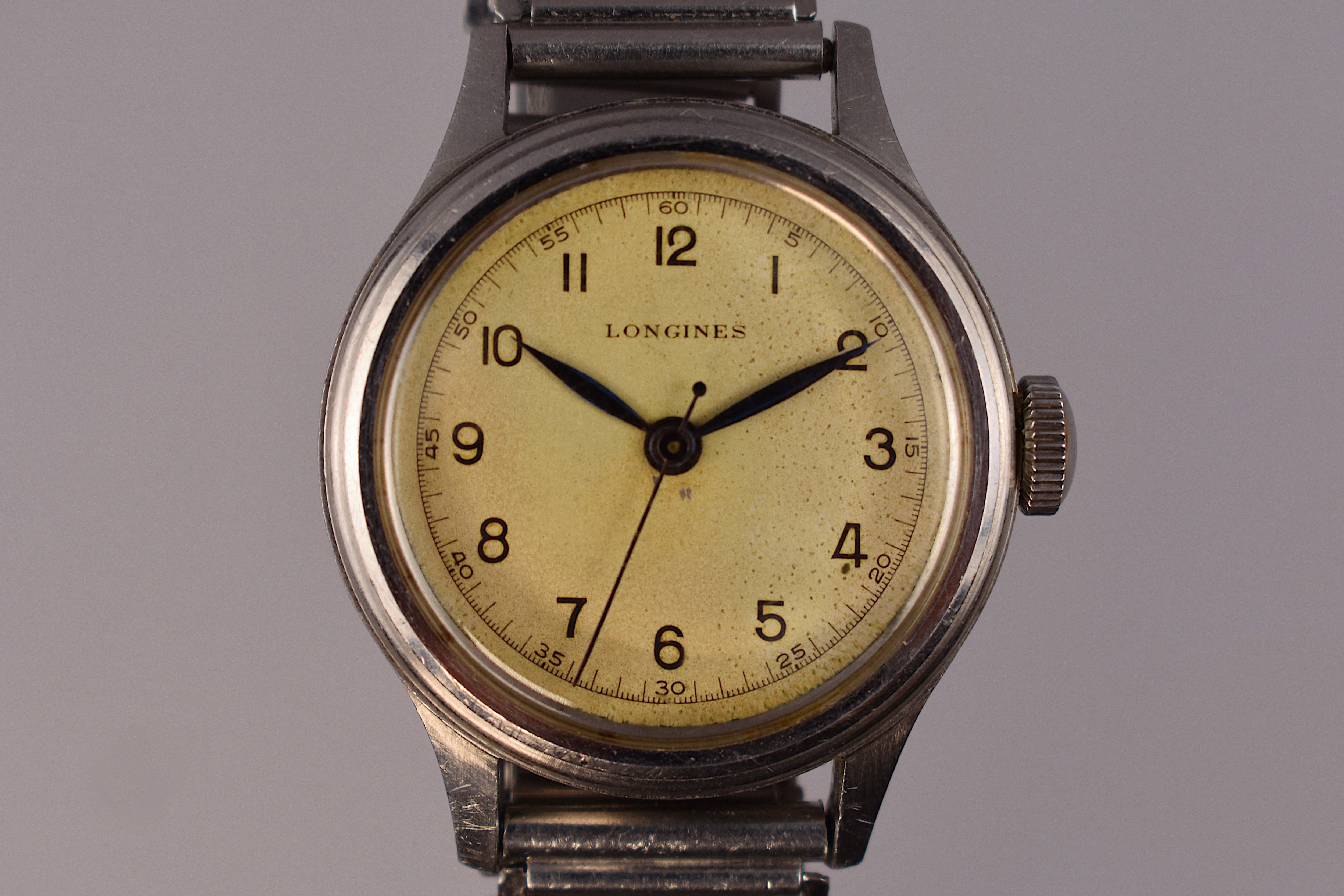 One of the most beautiful military watches from WW2. The thick step case is stunning. The crown is big and easy to grip. The dial is simple and clean. The hands are blue and stunning. While all these things are amazing, what makes this even better is the original Forstner Bonklip bracelet. These bracelets were made so that pilots can easily strap these on the outside of there jackets while flying. A rare siting as always with these Sei Tacche step cases and we love them!