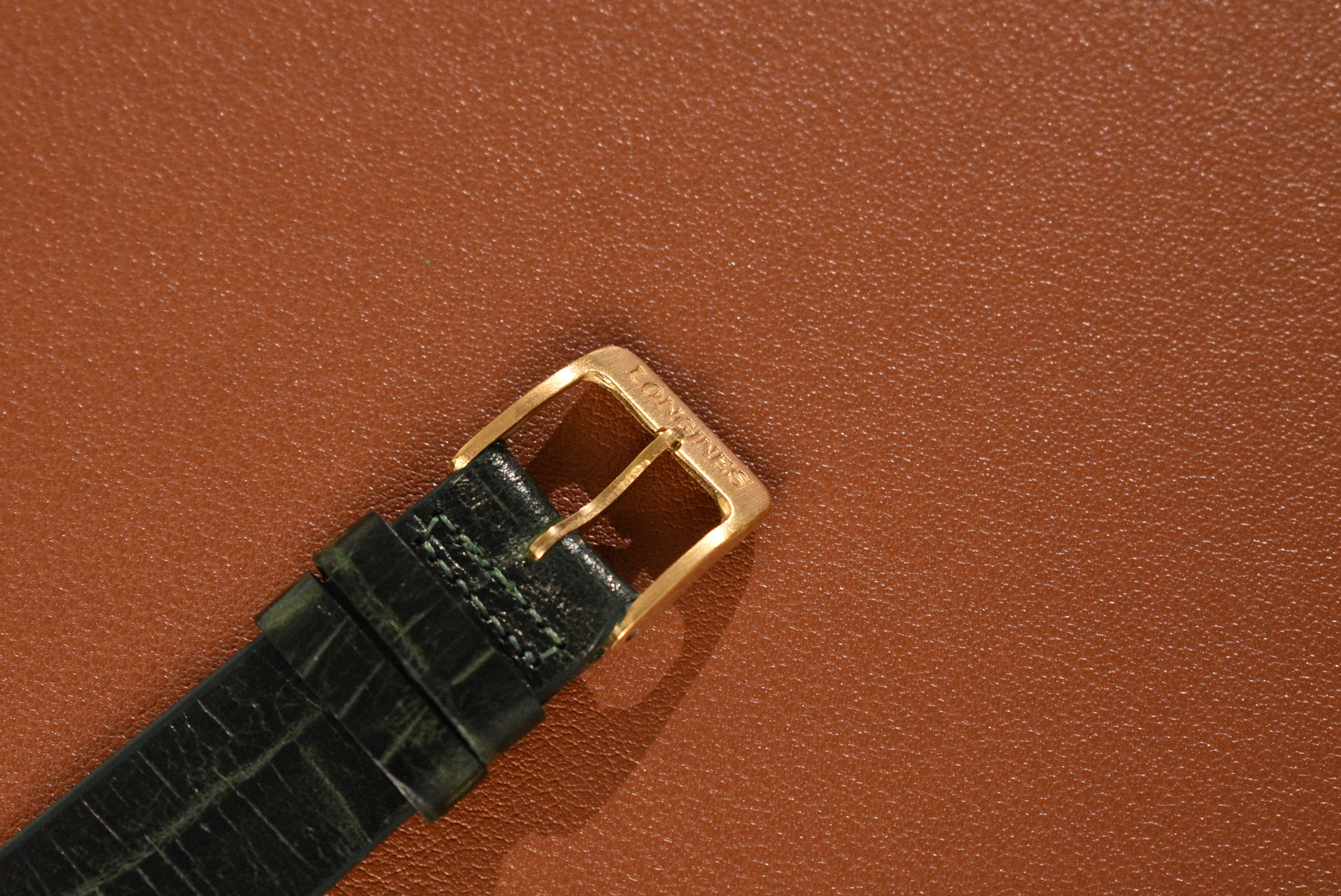 The condition of this Longines is amazing. Minimal wear throughout the watch. Its paired with its original buckle and suede pouch. The watch has a manual winding movement. The plating on the jumbo case has no peeling or wear.