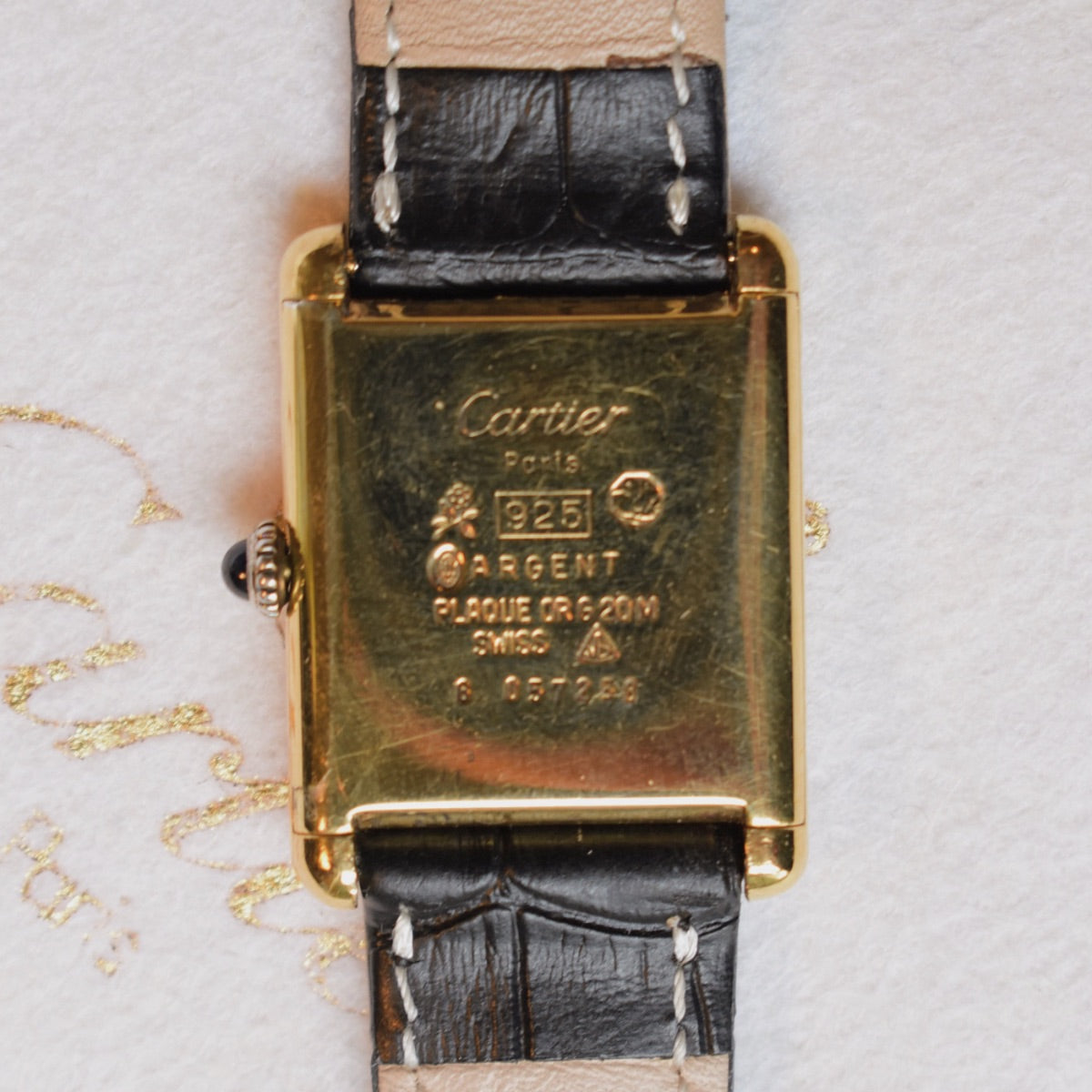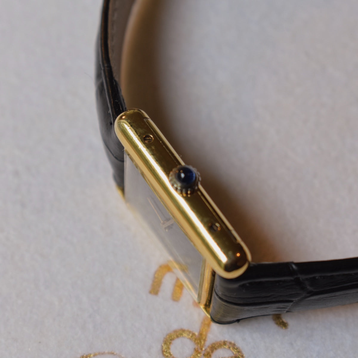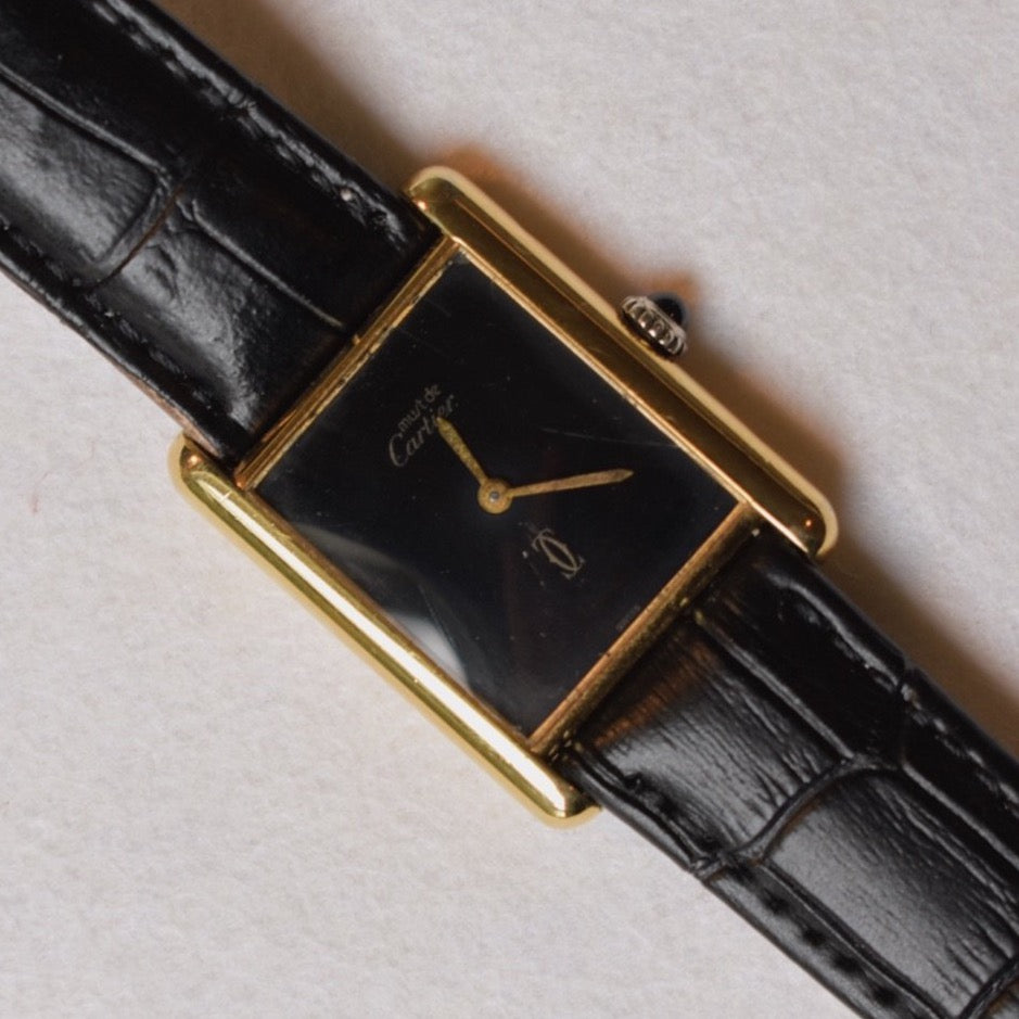 This is a Must De model and features a 23x31mm case. The Cartier features a manual movement and is running great. The dial is all black with gold hands. The dial has also gained a very slight ghost fade and some hairline marks that give this example great character. The case is in good condition with very little wear.