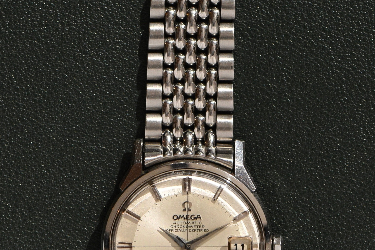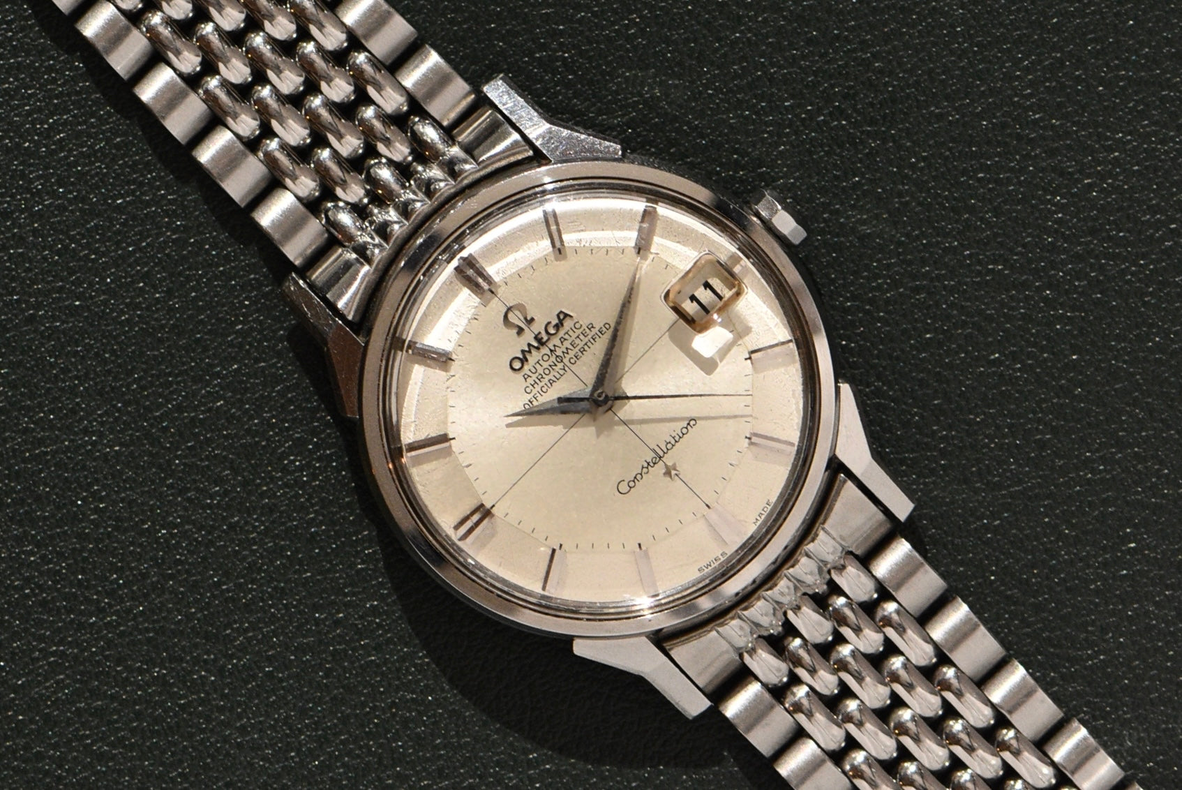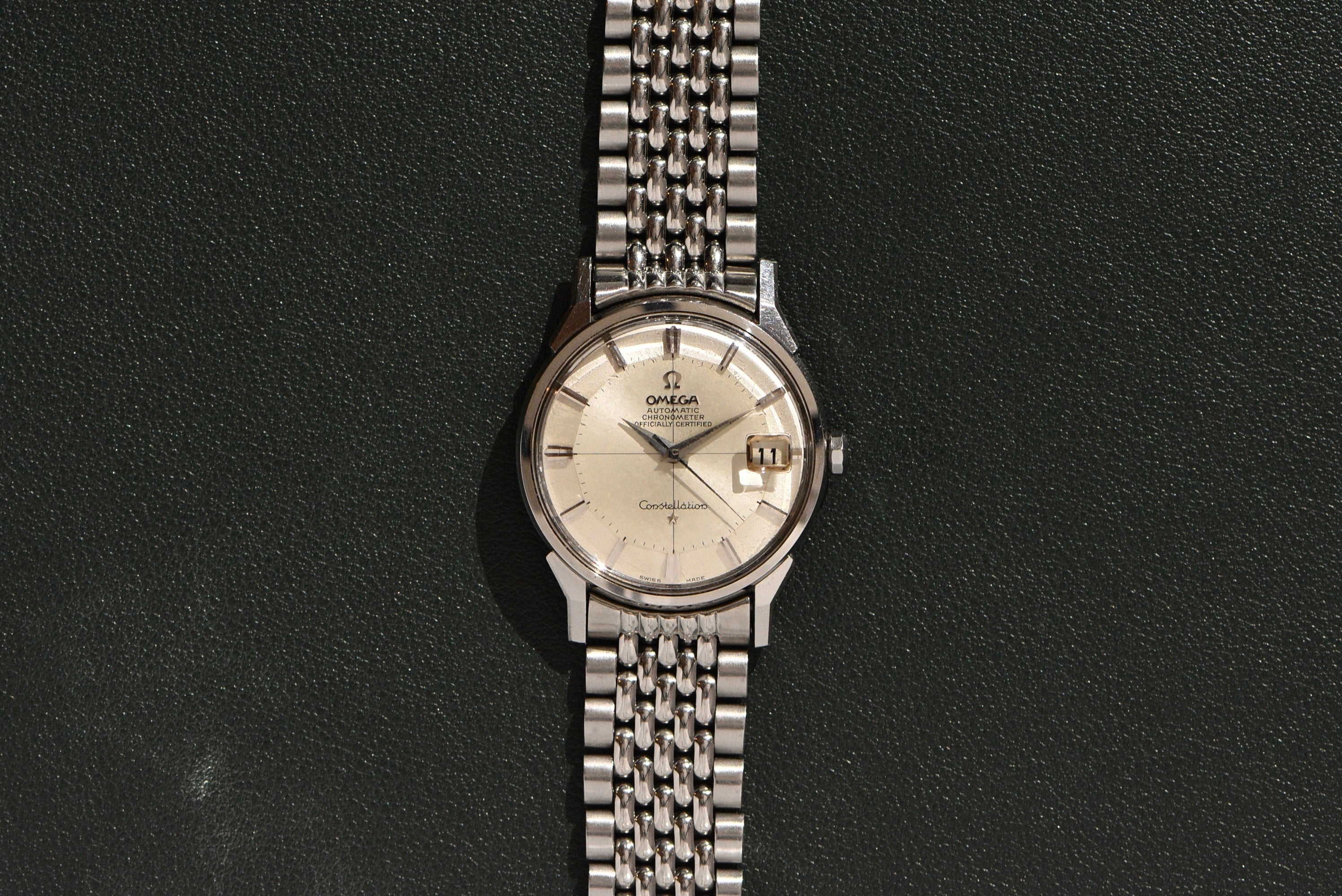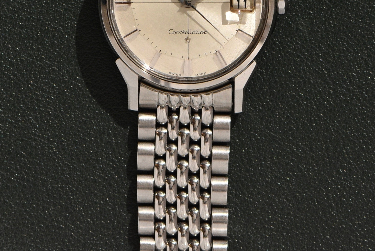 Another Constellation in this condition is ridiculous. The dial is literally perfect. The unpolished case does show signs of wear but nothing out of the norm. It has its original omega-stamped crystal and constellation crown. The Calibre 561 housed inside is very clean and dates to the late 1960s. With the beads of rice bracelet, we added an extension because of the bracelet size.