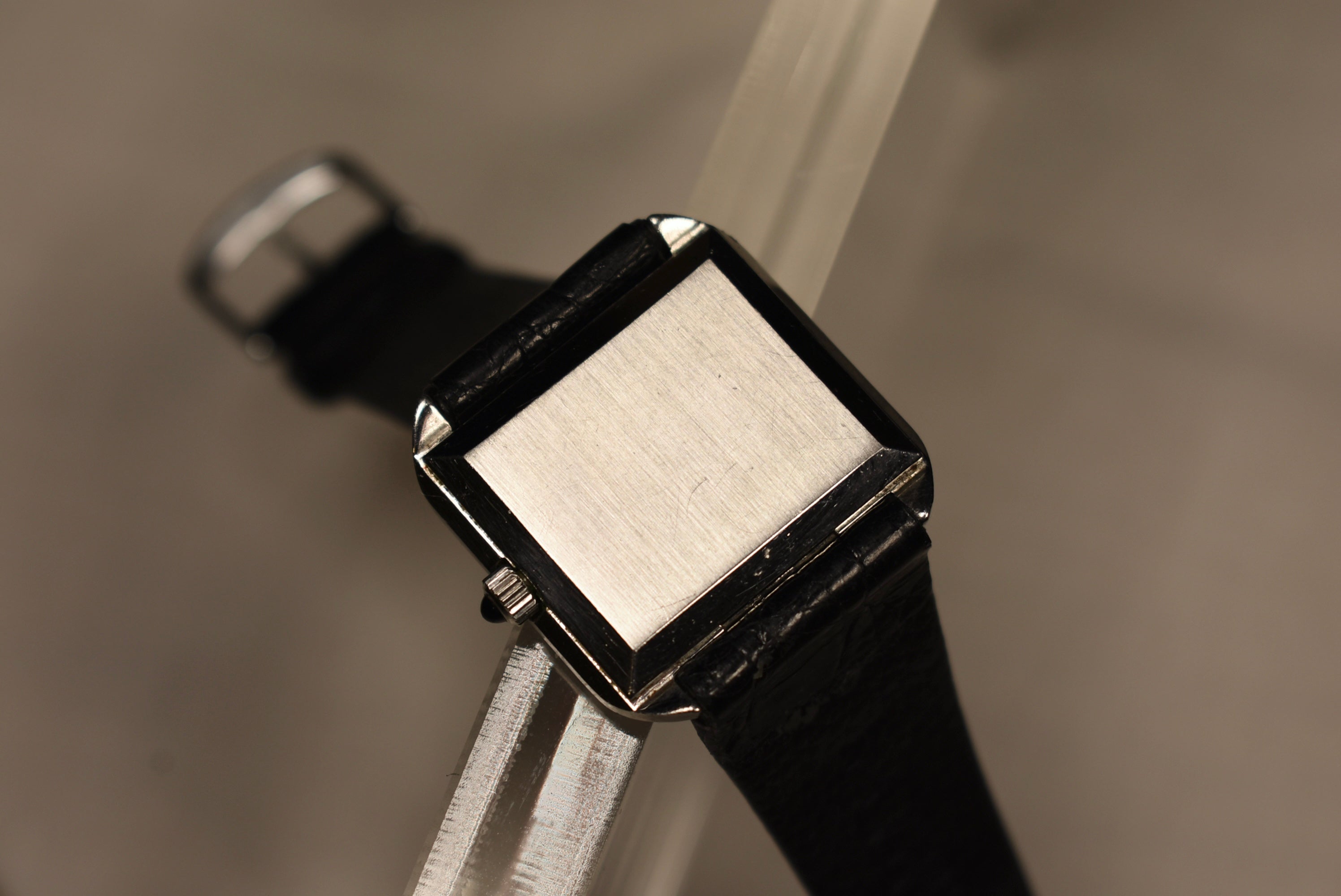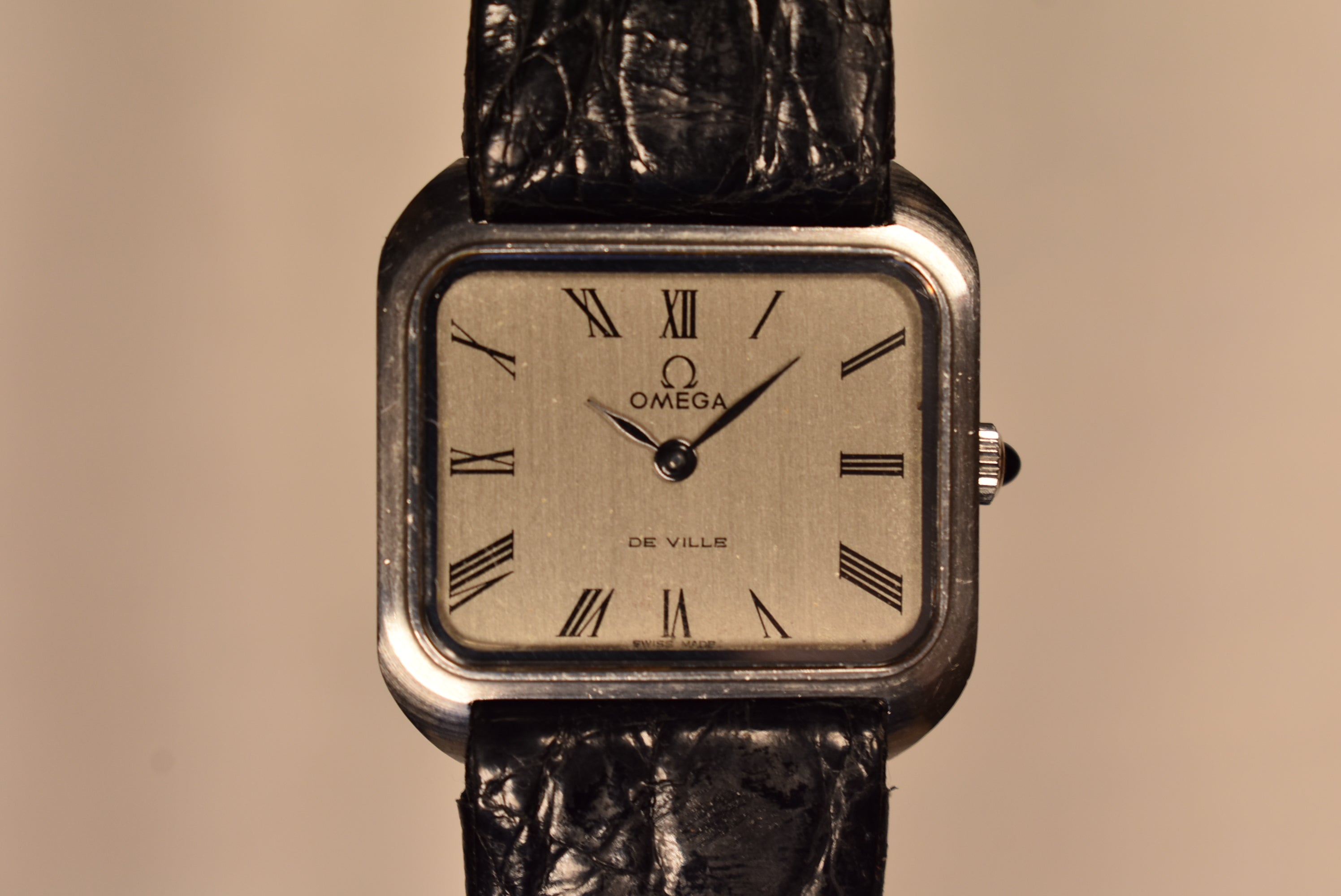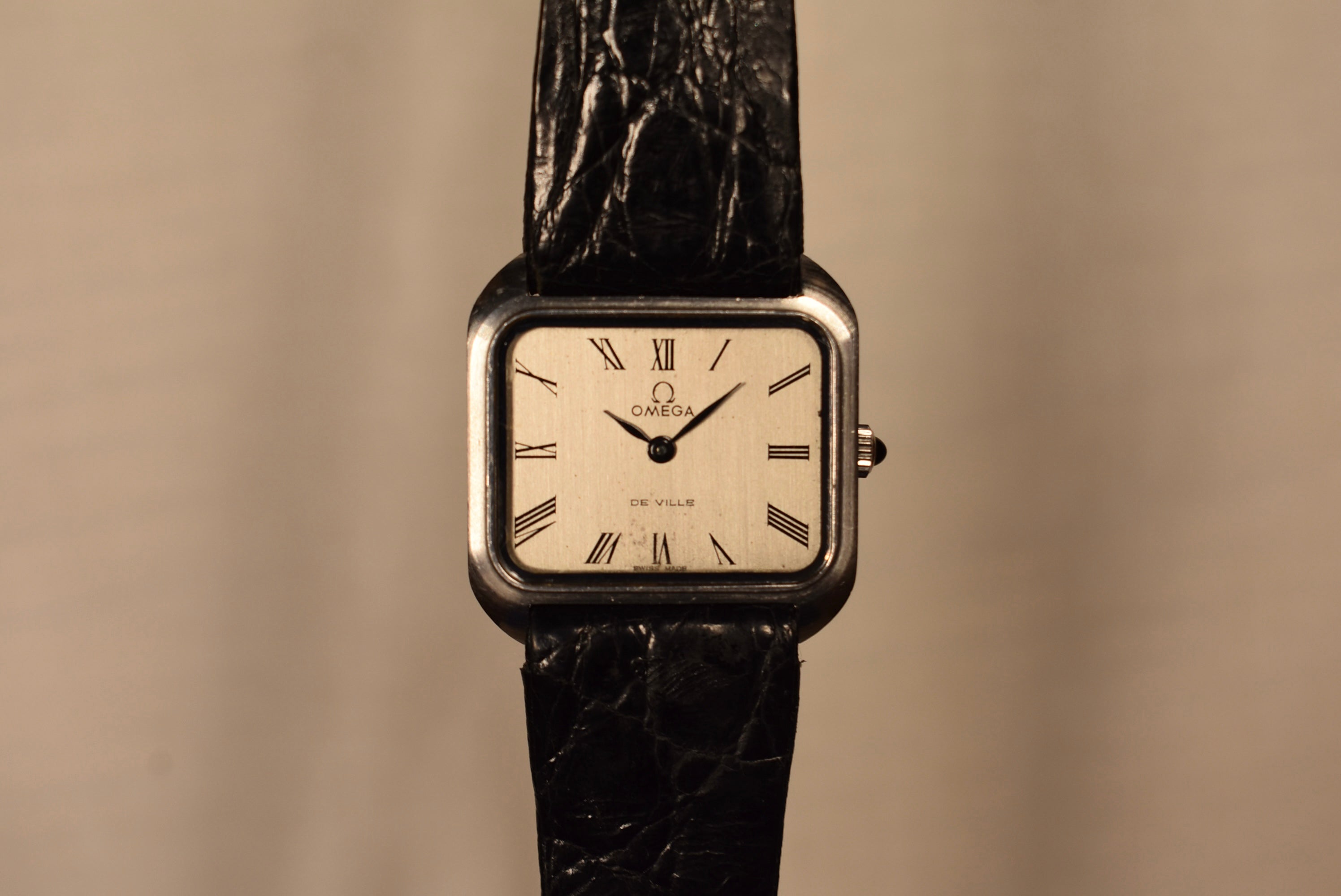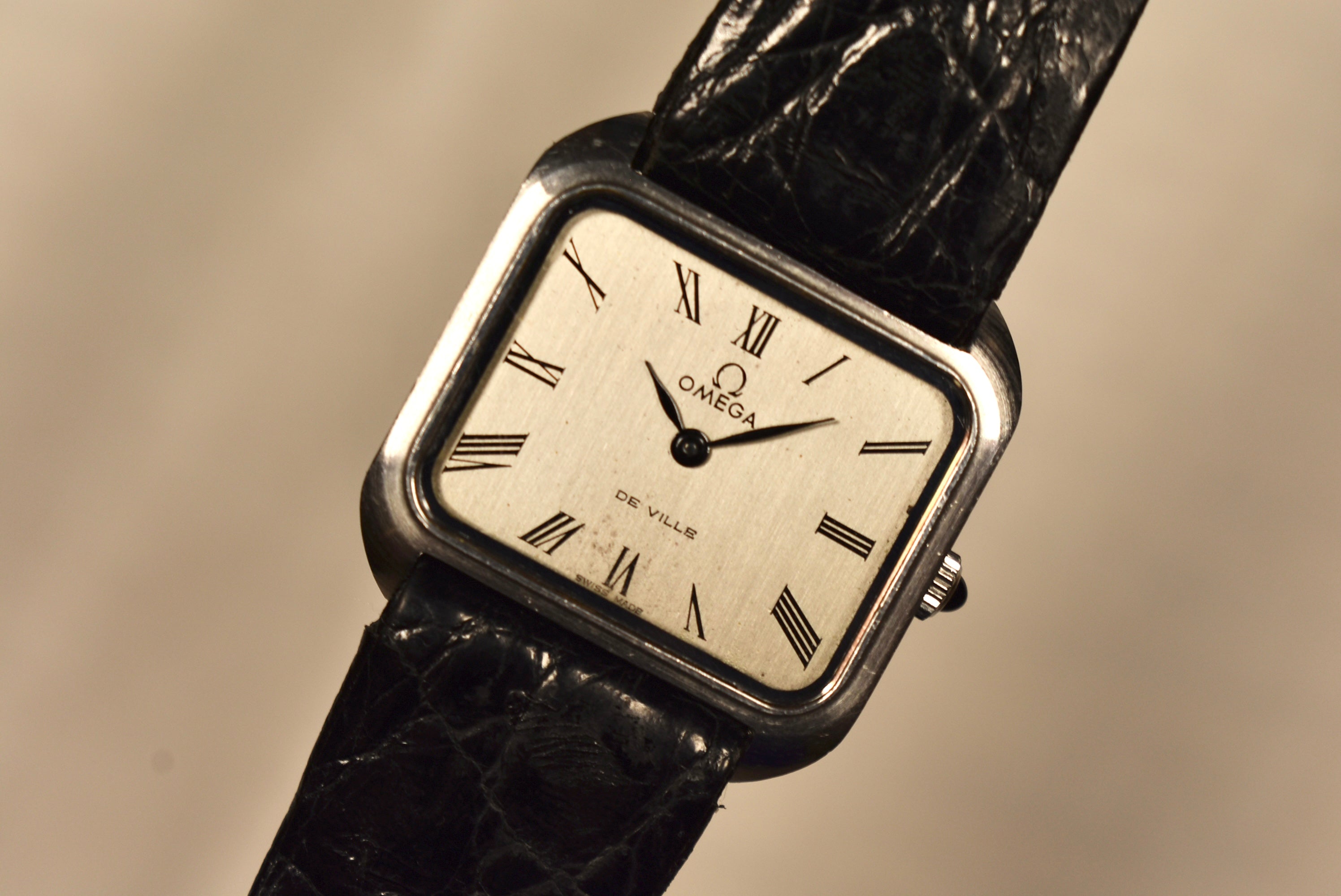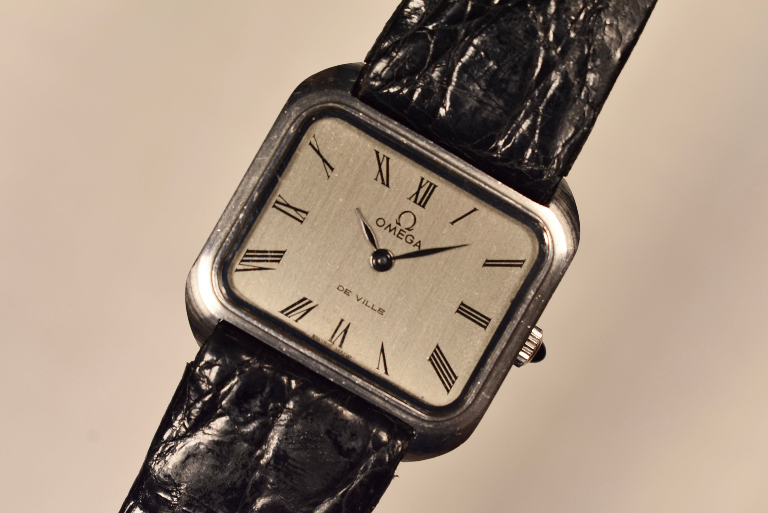 This rare Omega Deville is a great piece for any tank lover. The watch features a linen-like dial and a sapphire crown. The case size is 28x28.5mm and is only 6mm thick. The dial does have some patina to it but it is not an eyesore. The manual movement keeps the watch thin and small and looks great. The dial features roman numerals and the case is in great condition.
