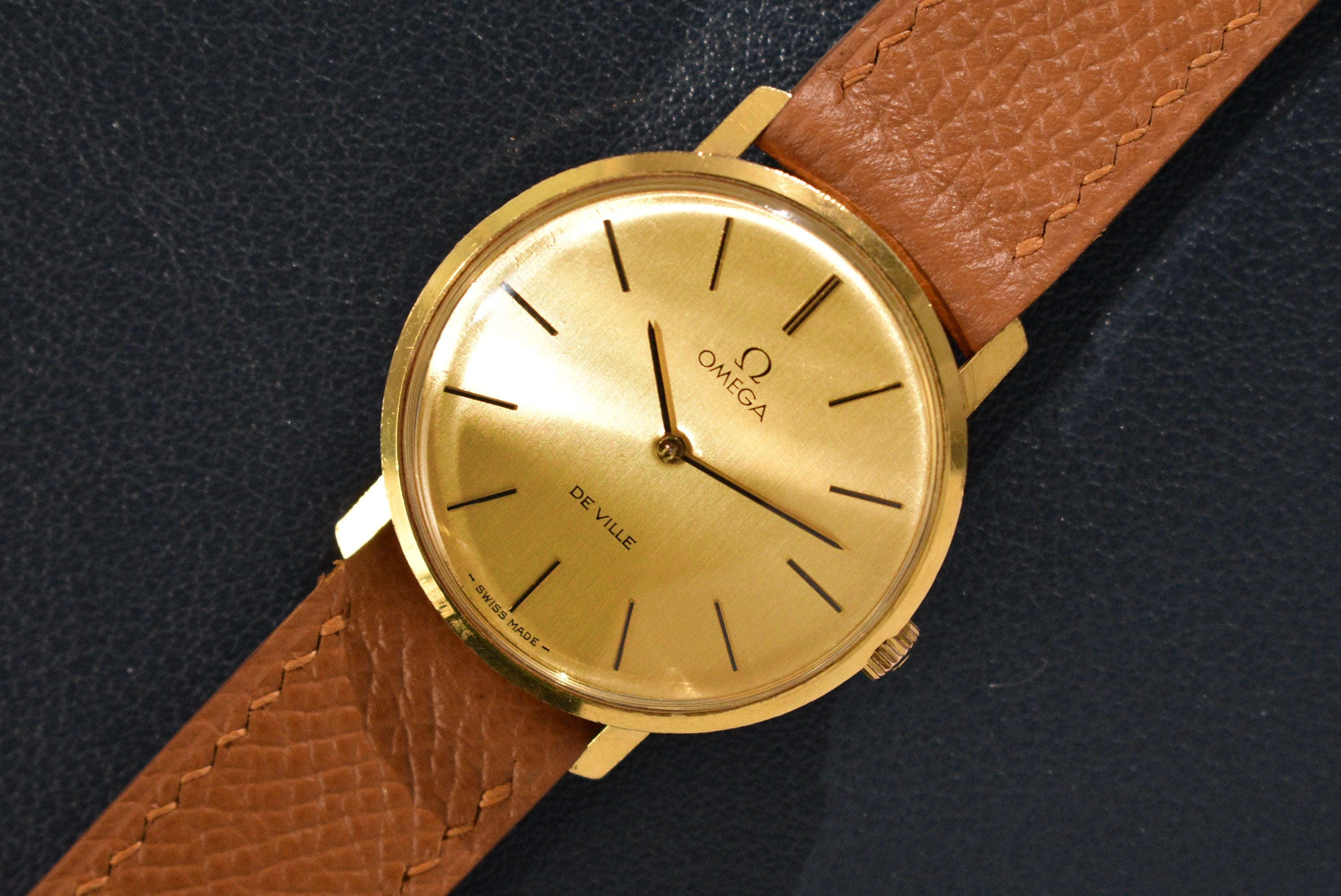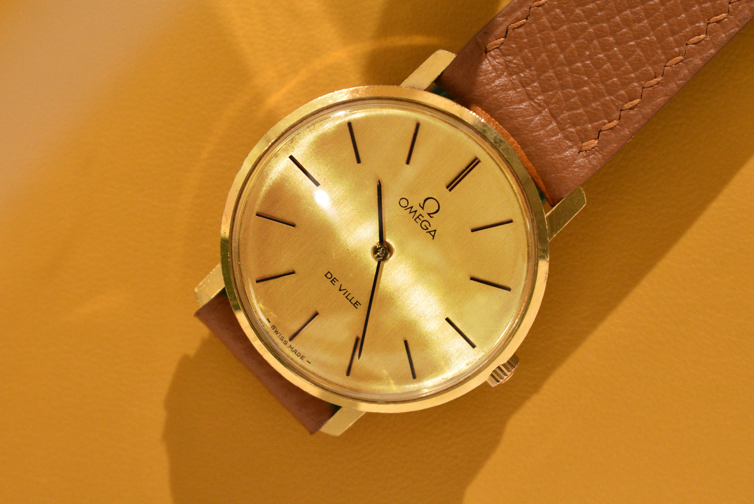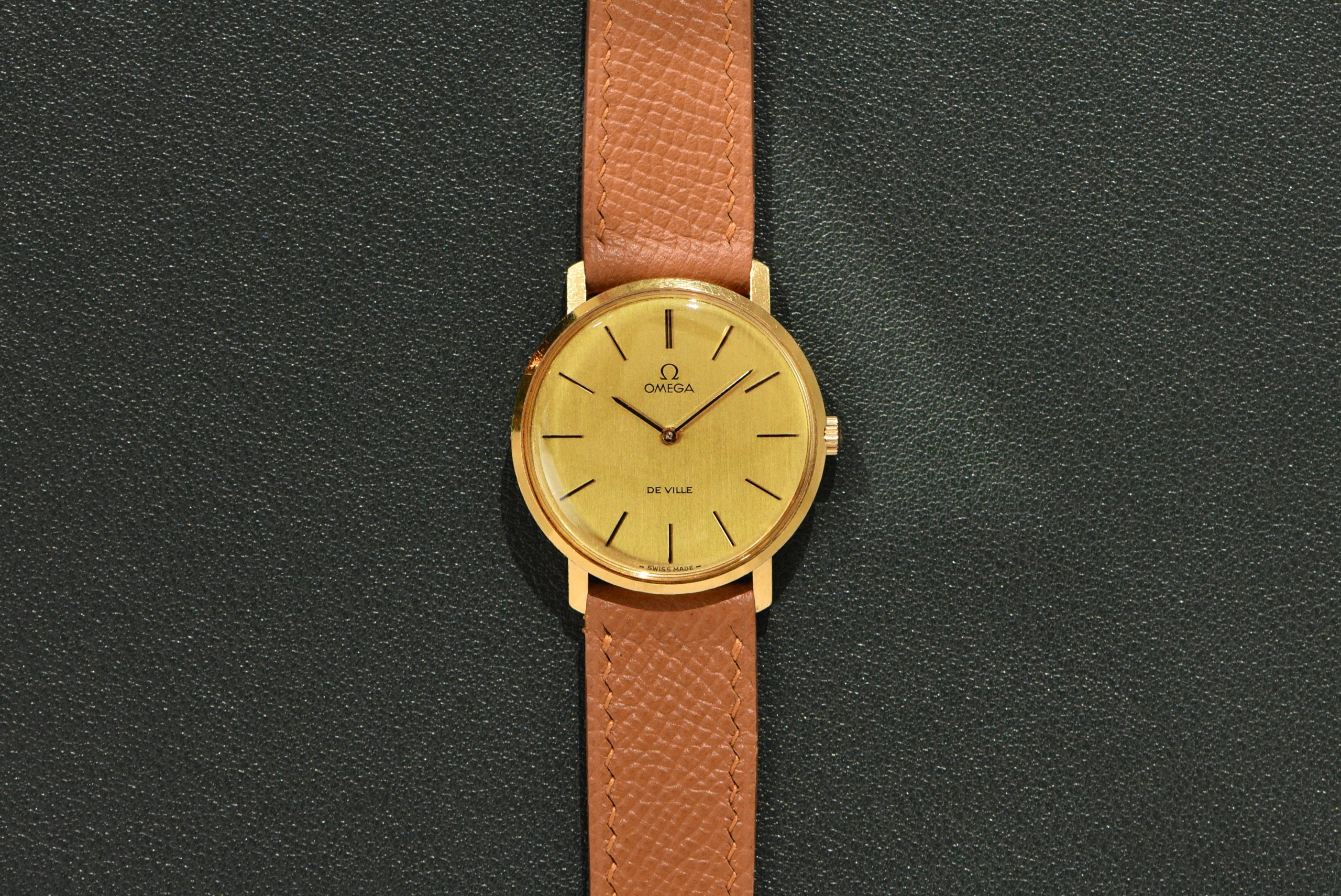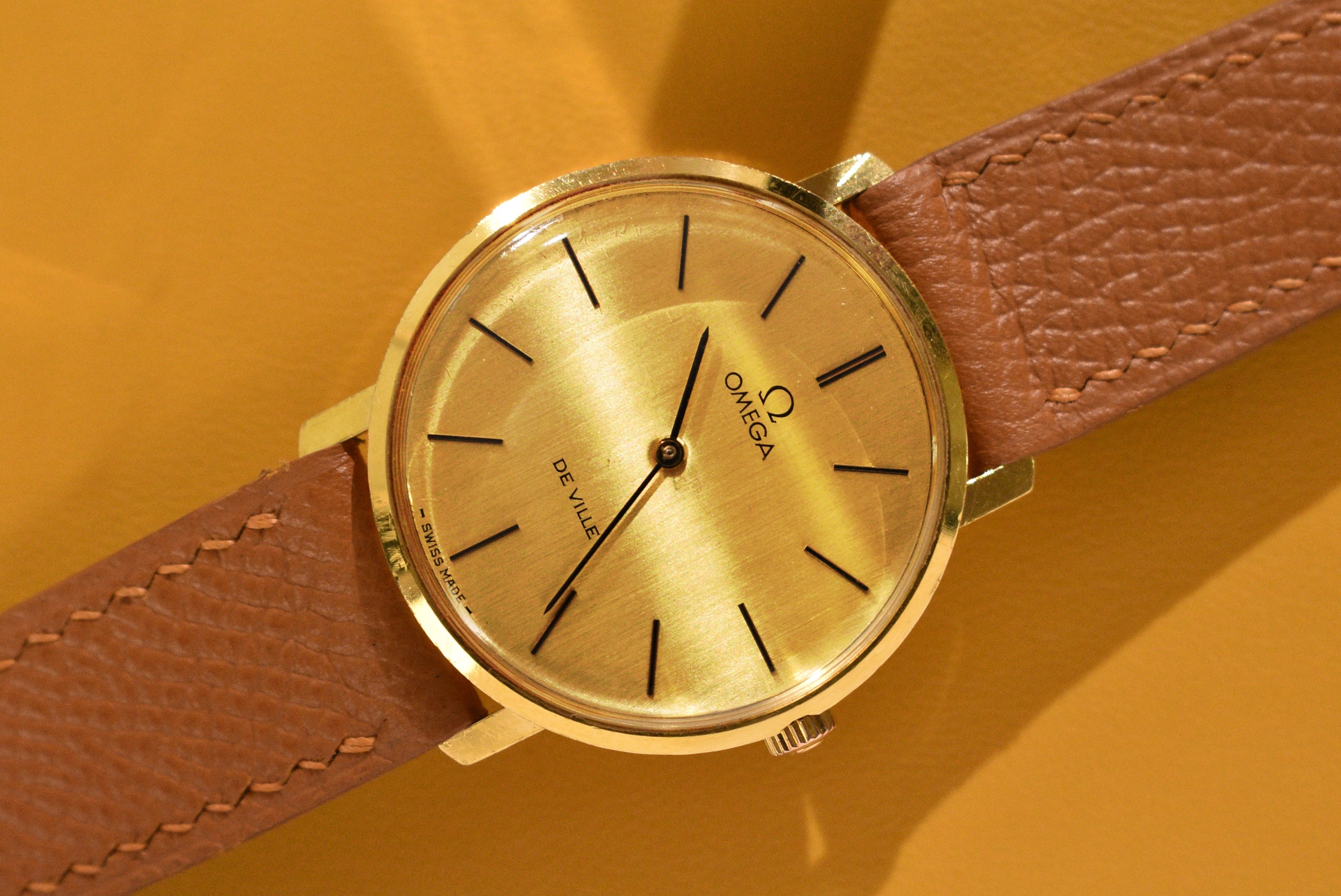 Here is a great option for something truly different and special in the vintage market. A solid gold Omega De Ville with one of the coolest dials ever. The amount of light this gold dial reflects is insane. If you are looking to add a bit of bling, something that truly stands out, in your collection, then this is it. The brushed finish gold dial has a cat's eye effect to it that you would often see with rare gemstones. Paired with a solid gold case, this omega is stealth wealth.