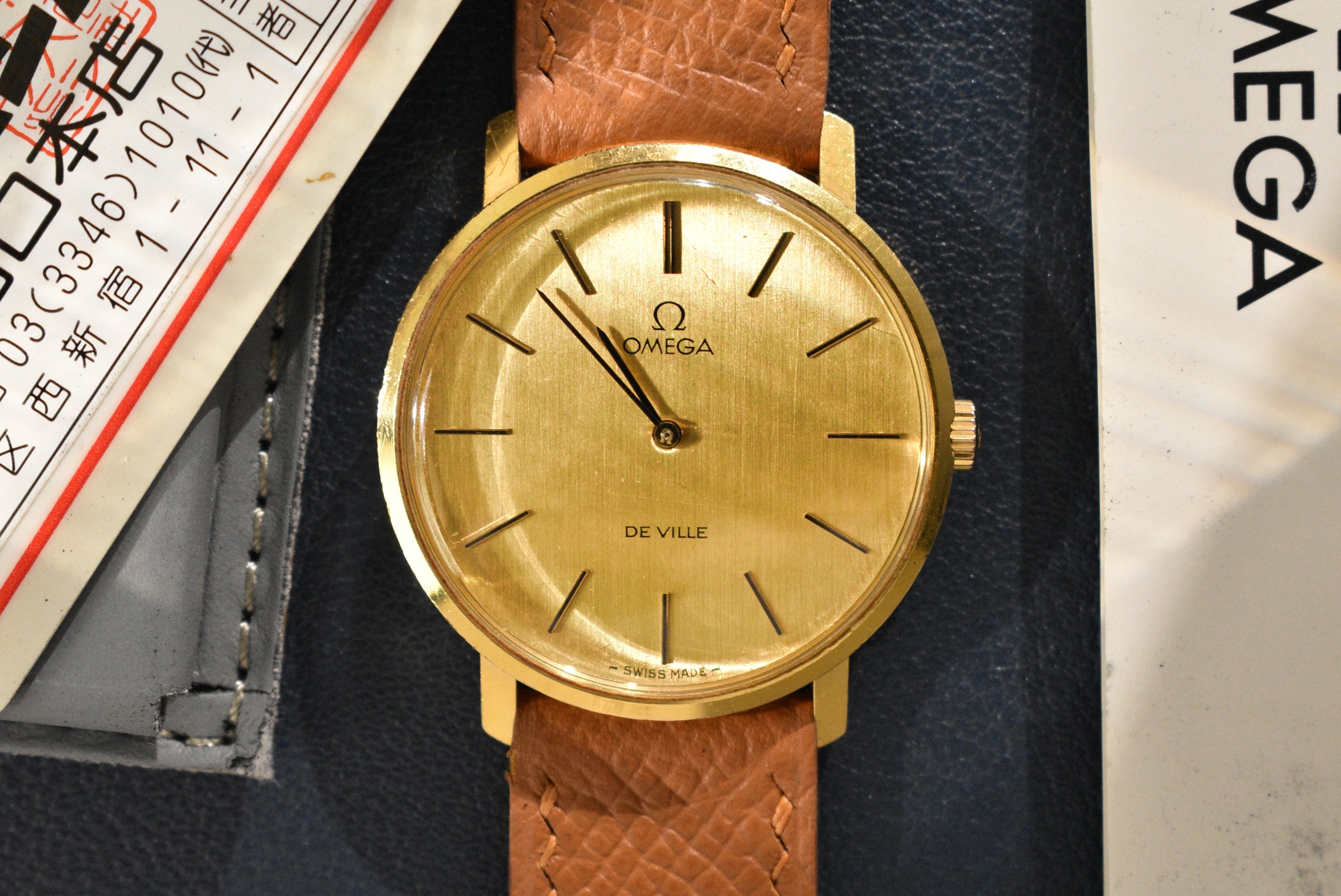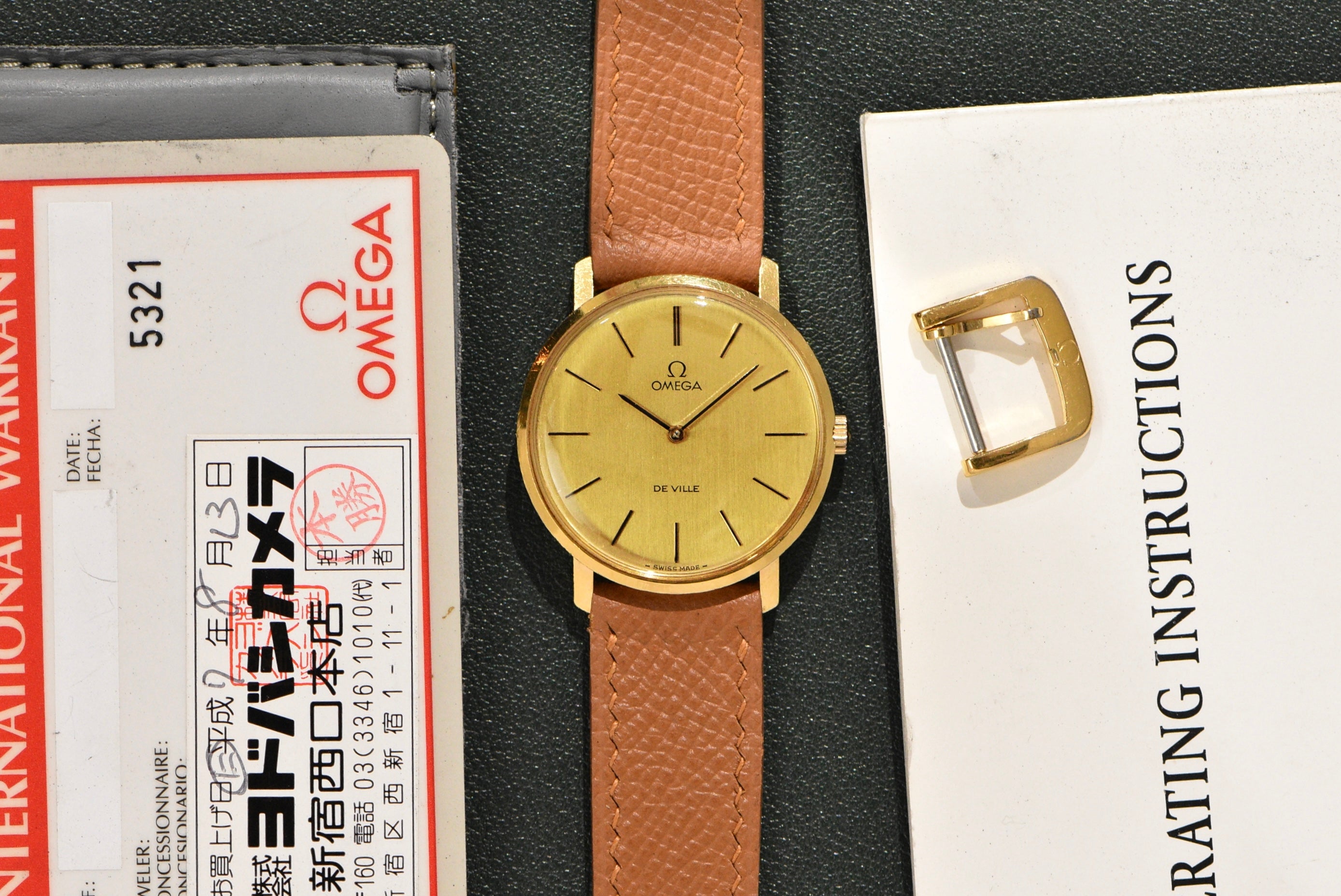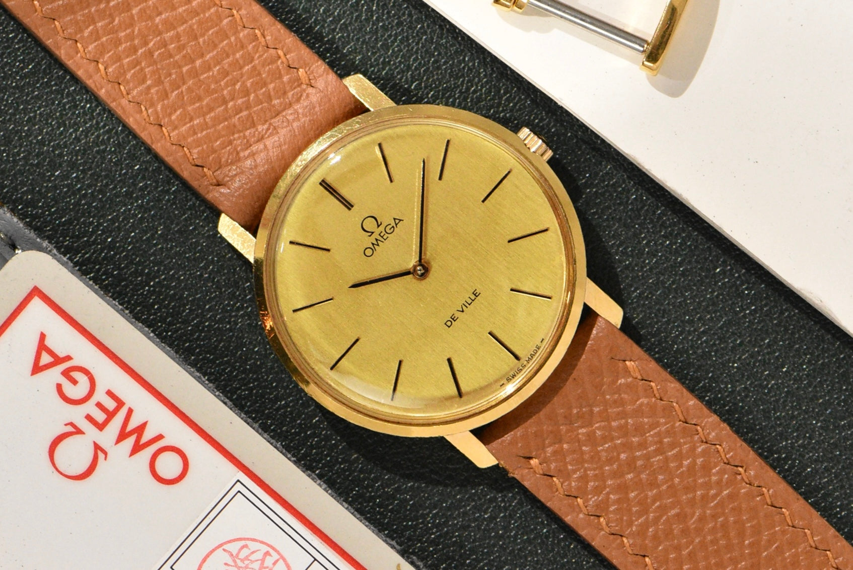 Here is a great option for something truly different and special in the vintage market. A solid gold Omega De Ville with one of the coolest dials ever. The amount of light this gold dial reflects is insane. If you are looking to add a bit of bling, something that truly stands out, in your collection, then this is it. The brushed finish gold dial has a cat's eye effect to it that you would often see with rare gemstones. Paired with a solid gold case, this omega is stealth wealth.