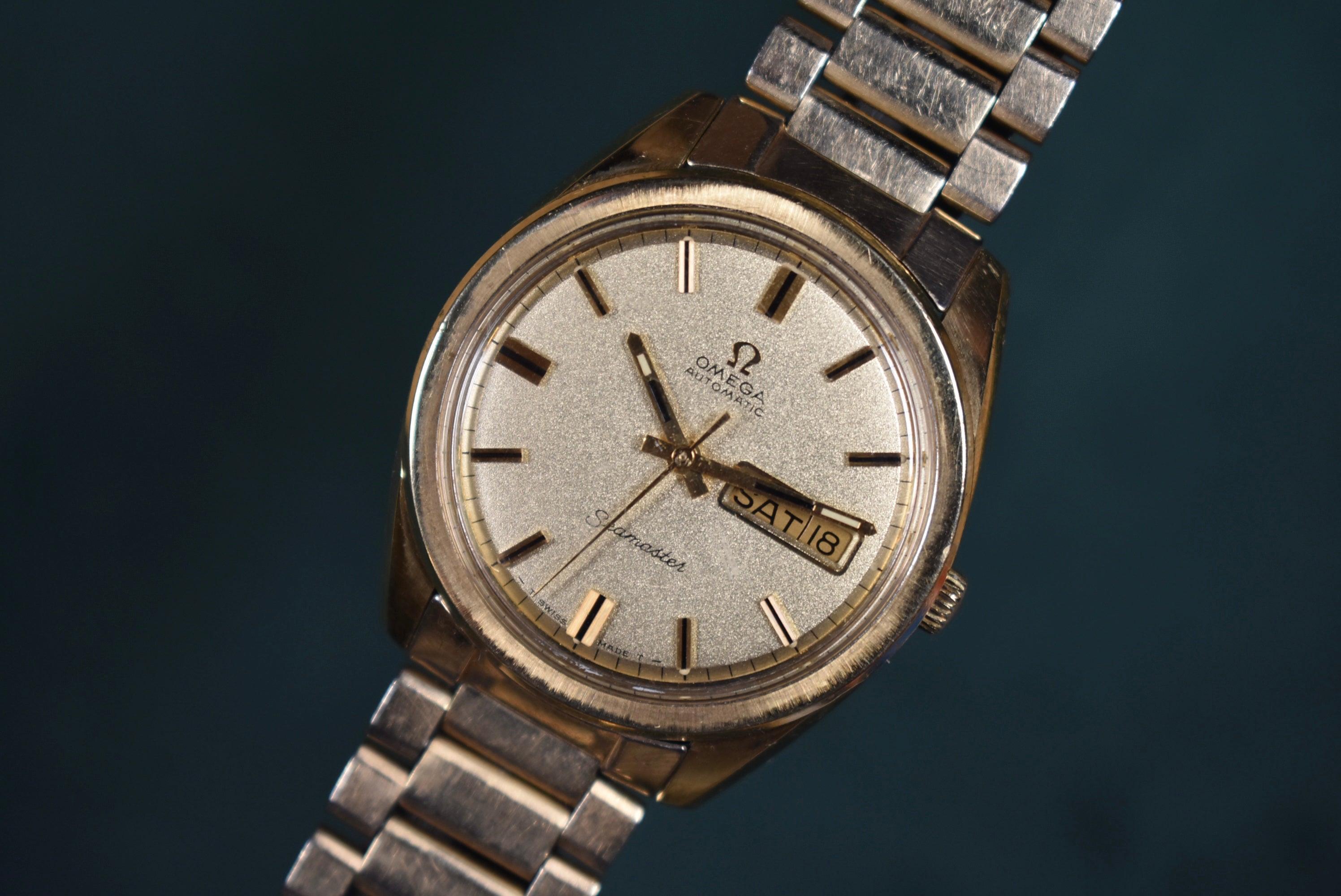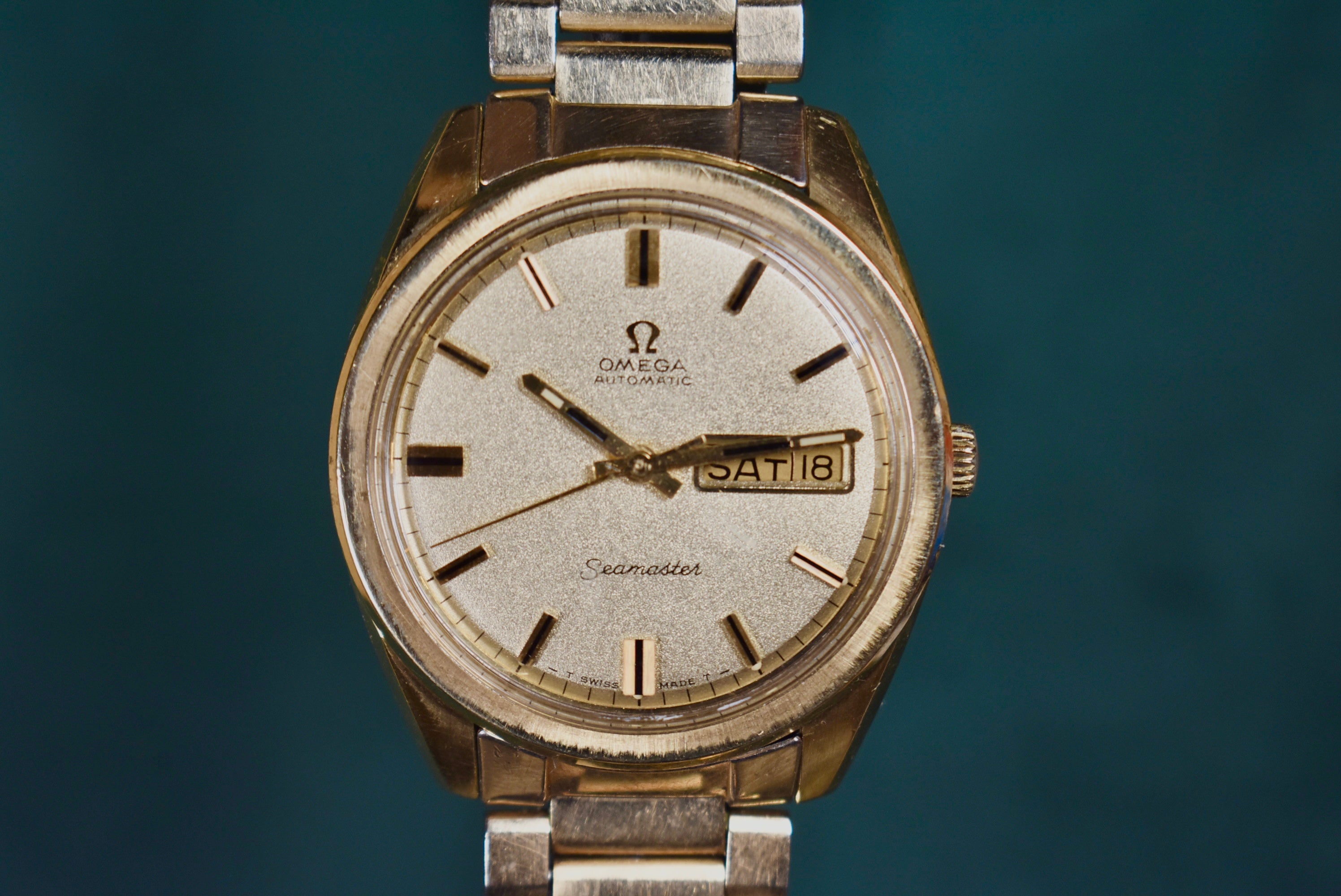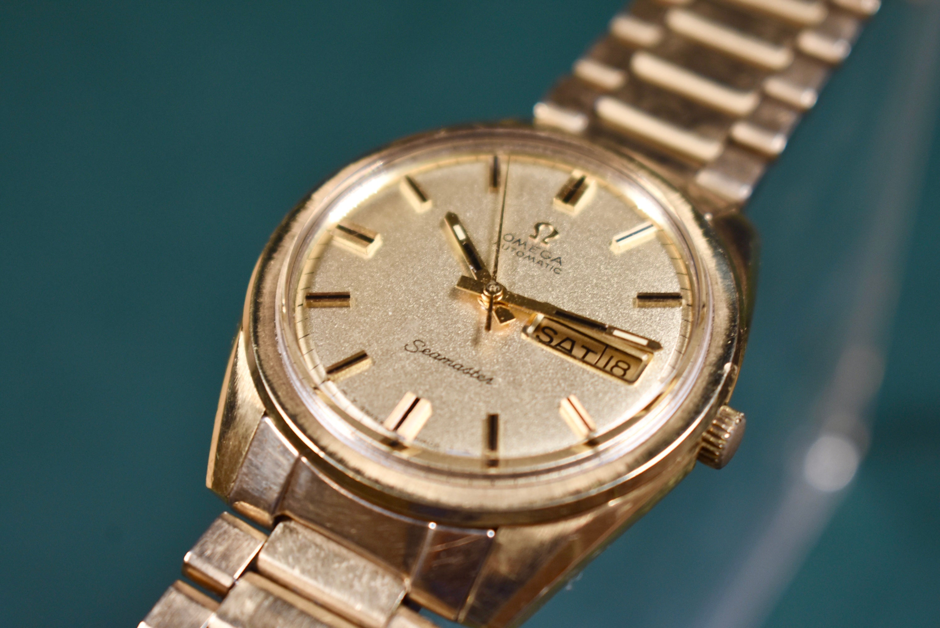 This beautiful Omega Seamaster dates back to 1969. This reference, 166.032, features the automatic caliber 750. The case and original bracelet are both 14K goldfilled. The stunning dial features a sparkle effect with a matching gold-tone day date wheel. The crown is original but does have wear on the top side. The case sits at  36.5mm and looks great on the wrist. The bracelet is also an original Omega bracelet and is also a rare flat link model.