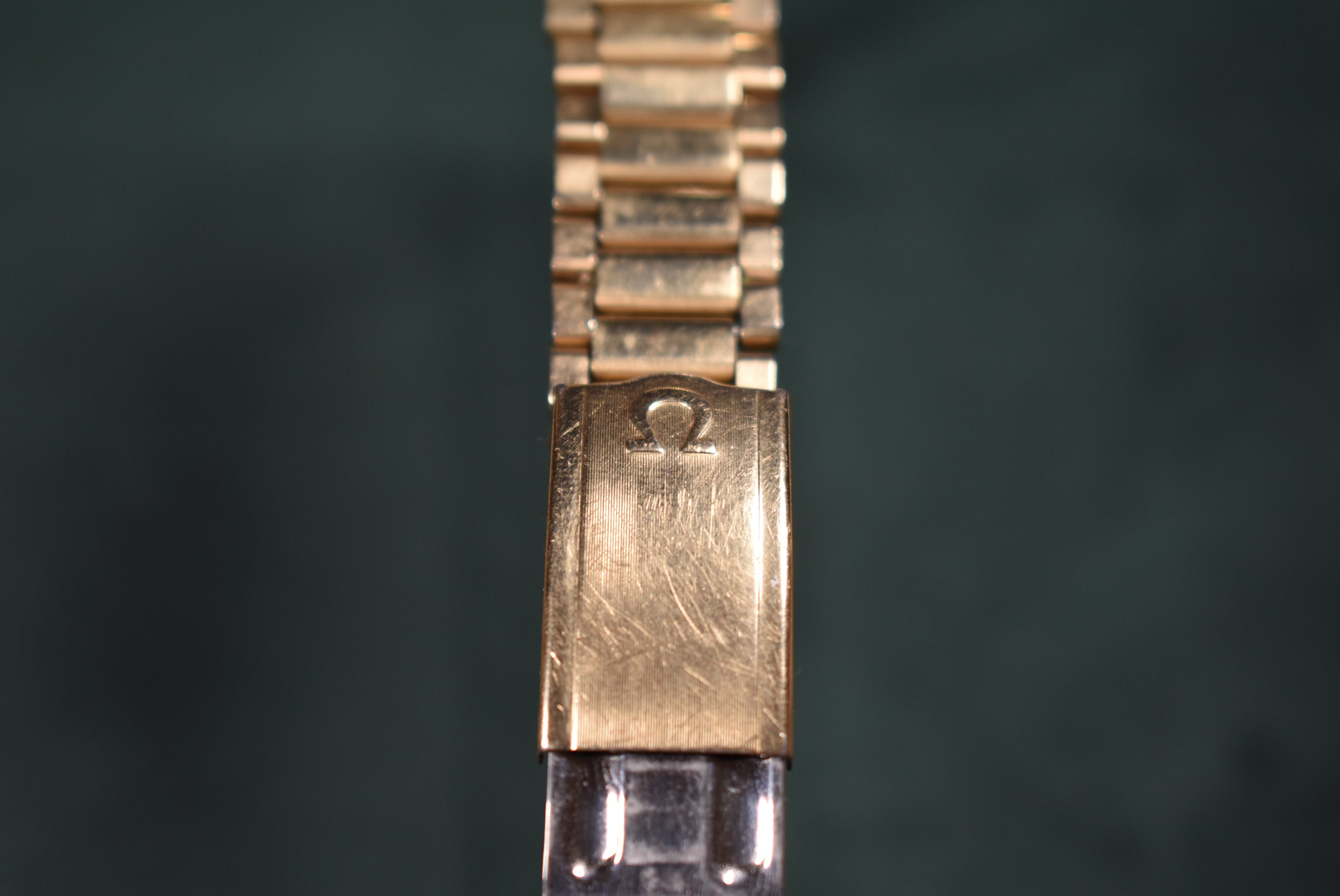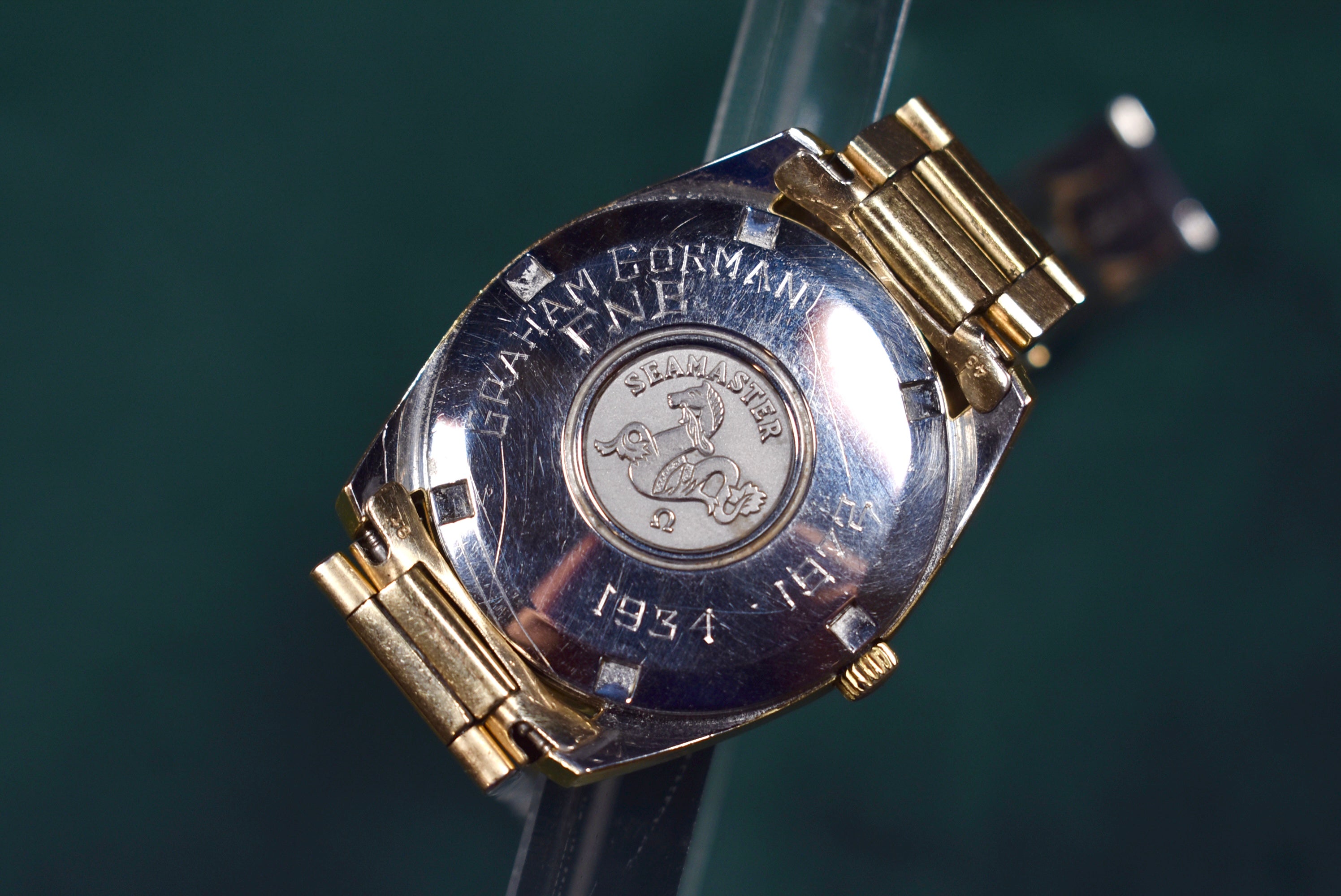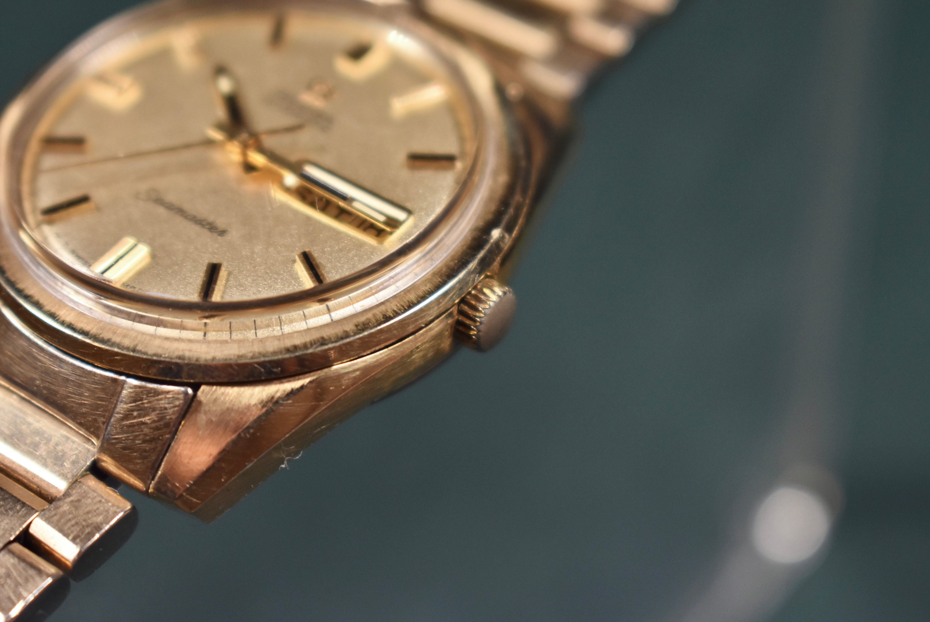 This beautiful Omega Seamaster dates back to 1969. This reference, 166.032, features the automatic caliber 750. The case and original bracelet are both 14K goldfilled. The stunning dial features a sparkle effect with a matching gold-tone day date wheel. The crown is original but does have wear on the top side. The case sits at  36.5mm and looks great on the wrist. The bracelet is also an original Omega bracelet and is also a rare flat link model.