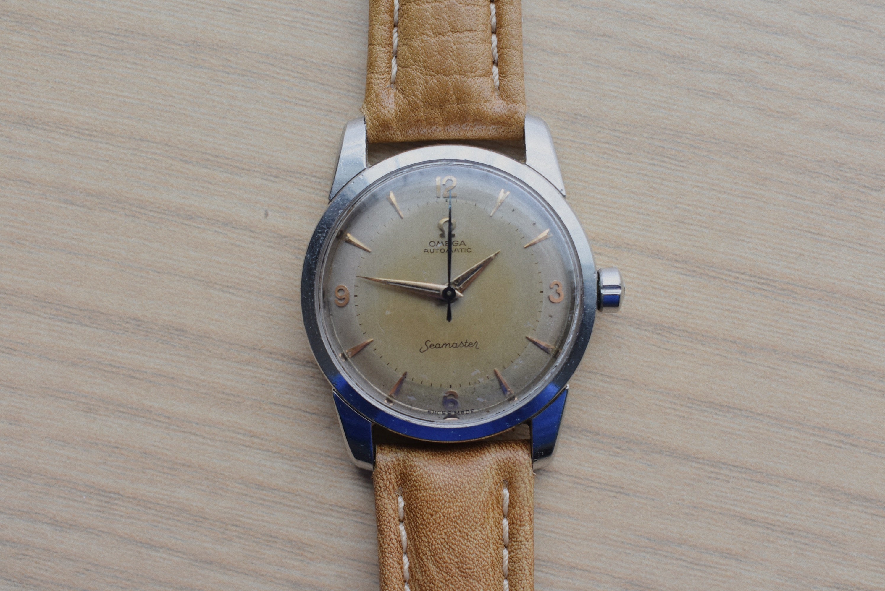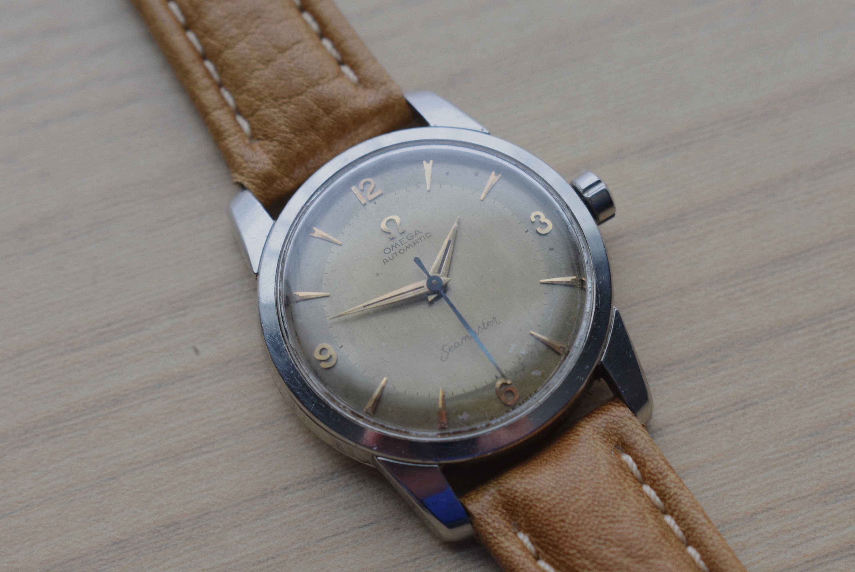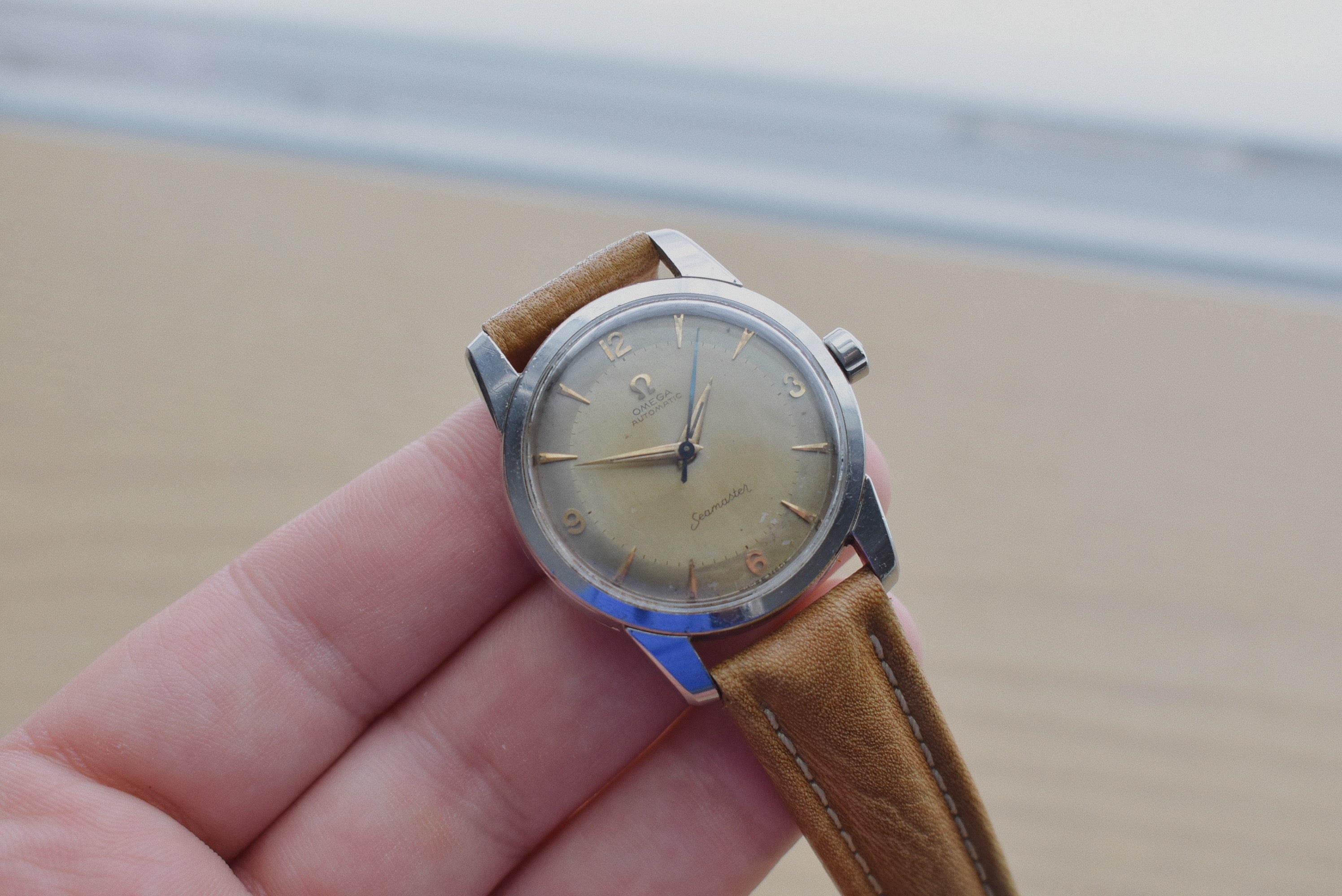 One of the best vintage watches money can buy. The Omega Seamaster with a chunky case, what more could you ask for. The dial has gained a toasty tropical patina which looks great with the blues seconds hand. The dial has almost turned gold. One of the prettiest Seamaster examples we’ve had in a while, the pairing of the yellow strap just give the dial so much more pop.