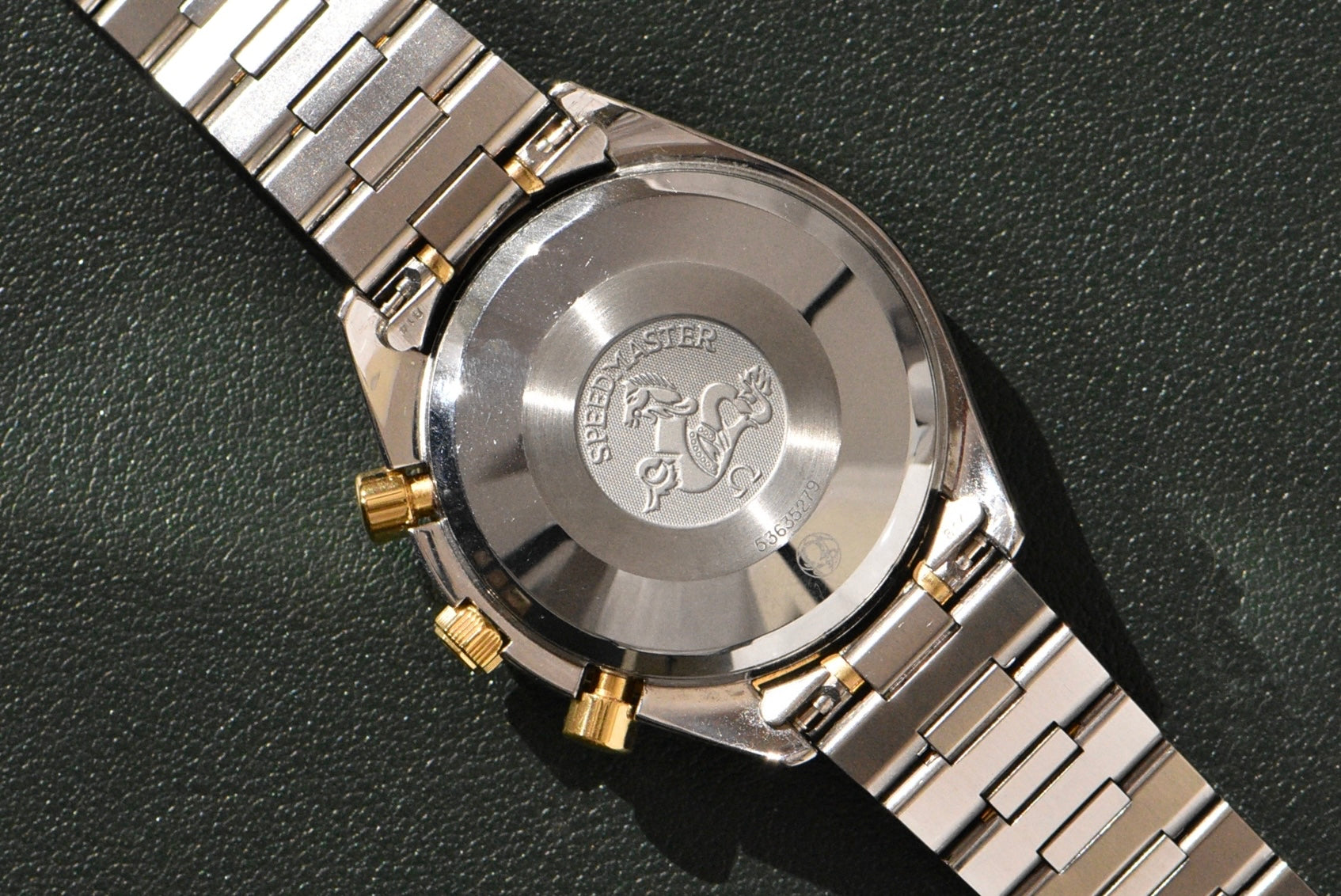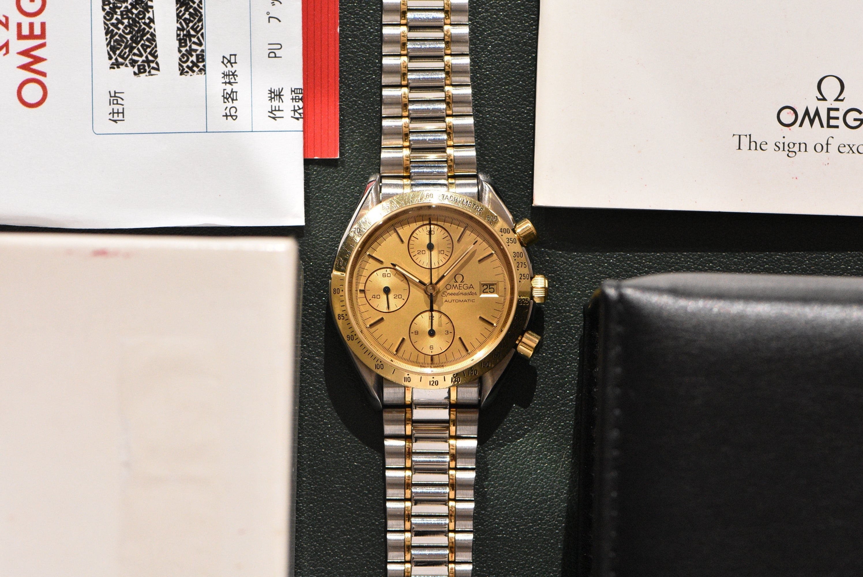 This Speedmaster is in great condition for its age. The watch was serviced not too long ago by Omega and has the service papers to show. The dial condition is perfect and the bezel has very normal wear. The very large bracelet is still nice and stiff. This SPeedy also comes with its original and rare large black omega box.