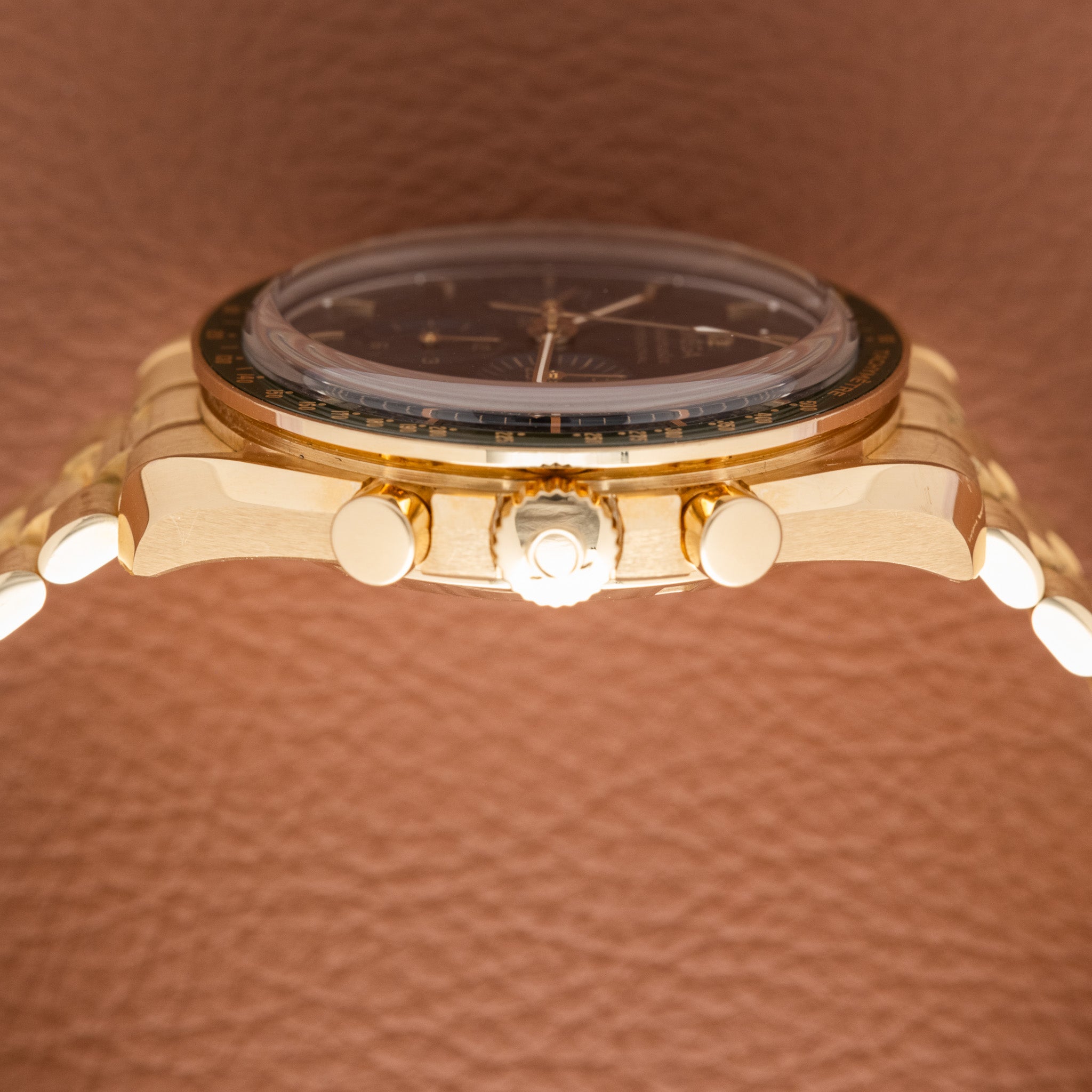 Gold Speedmasters have long existed alongside the steel Moonwatch, but this reference stands apart due to its updated movement architecture and contemporary finishing standards. It represents Omega’s effort to merge heritage, precious metal execution, and modern chronometry into a single, cohesive package.