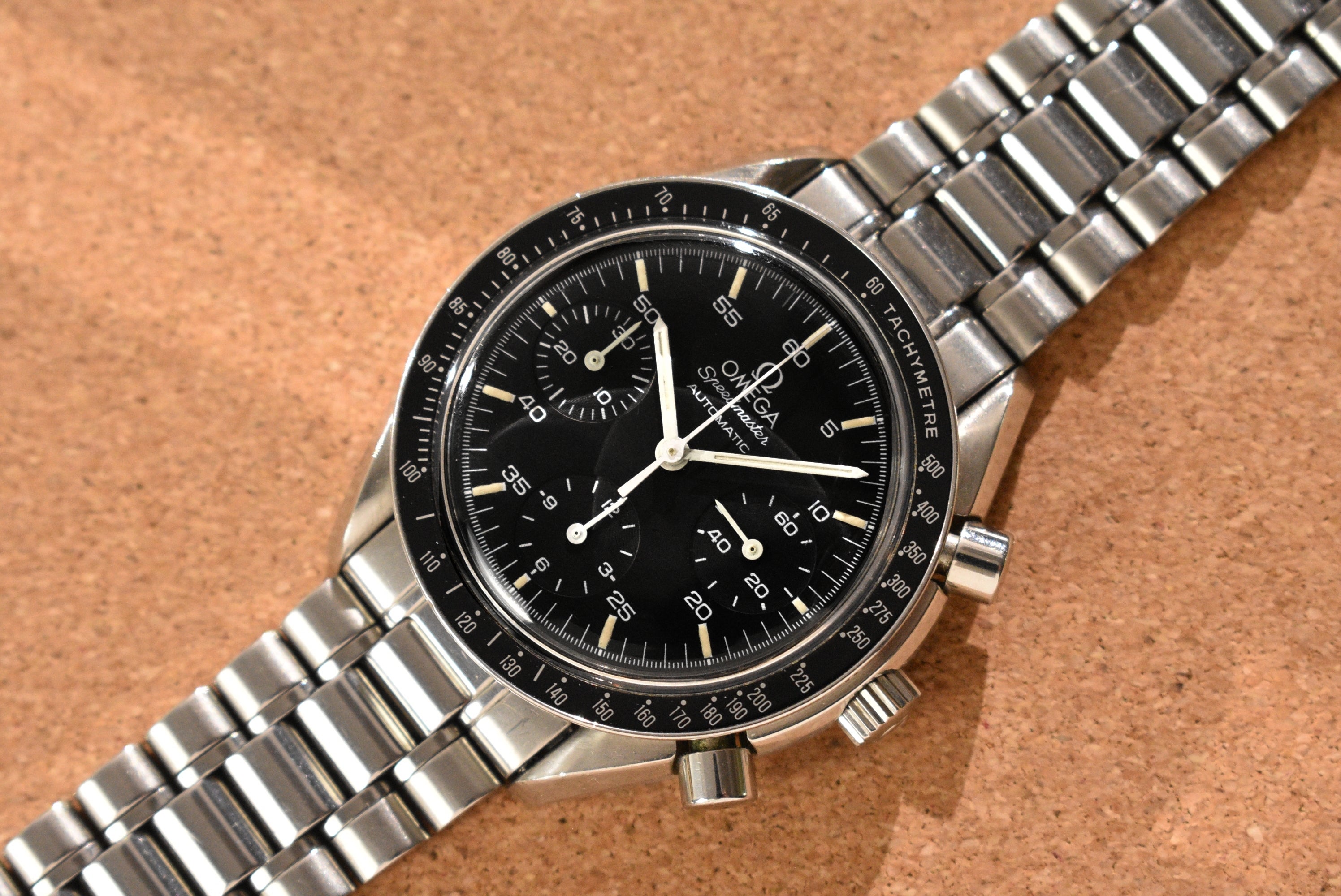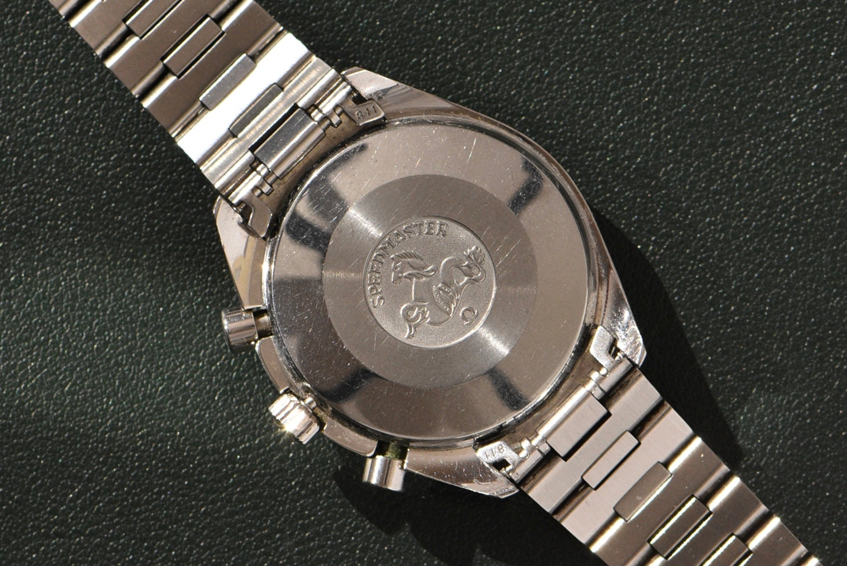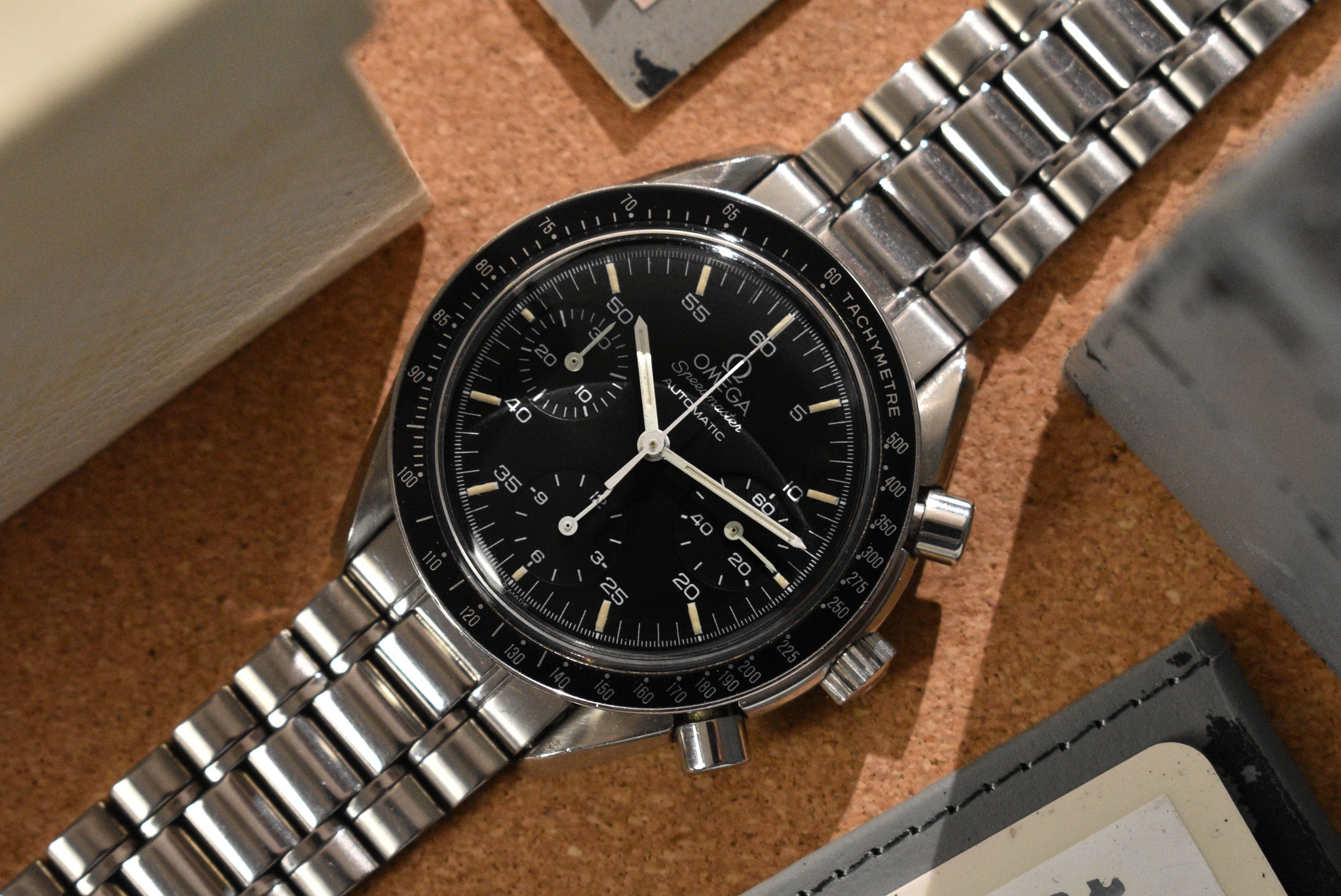 This Speedmaster has seen normal wear for its age. The crystal has minor markers with the original Omega stamp in the center. The bracelet is in great condition and still has so much life left to it. The case and bezel have regular wear with no serious dents. There are some small flea bites on some of the edges but no big gashes. The watch also comes with a complete set as seen. The best part is, this is an early example with creamy tritium lume.