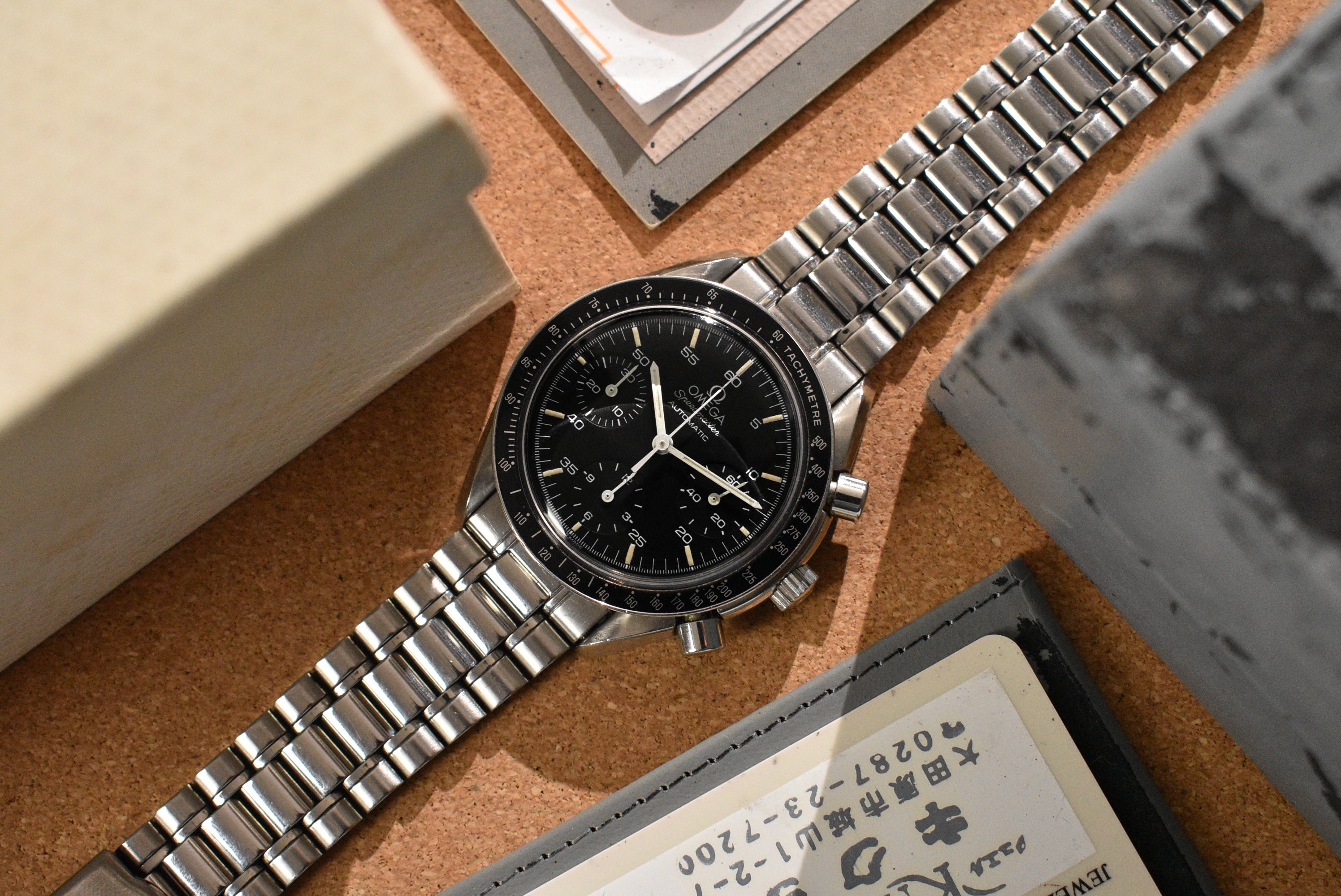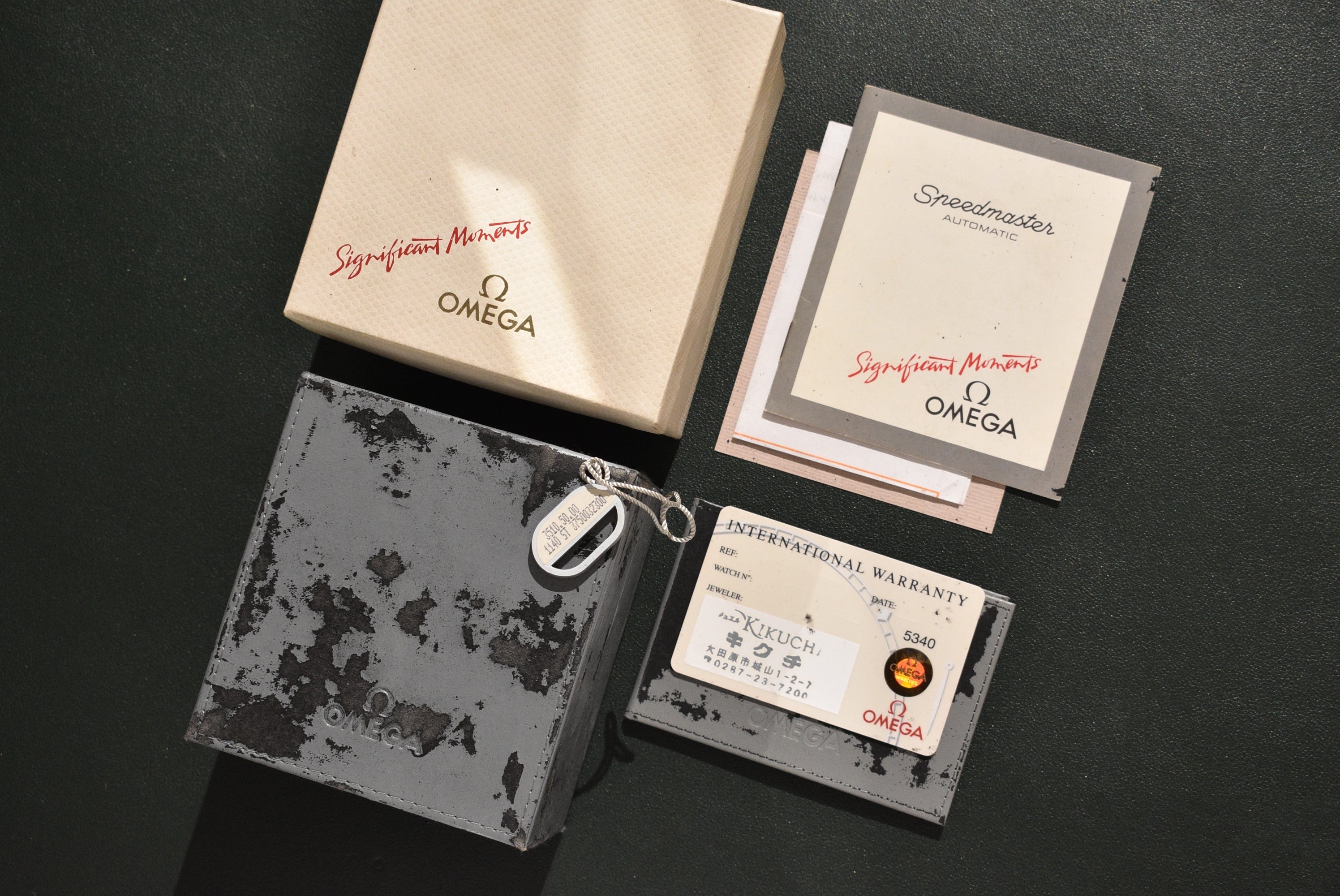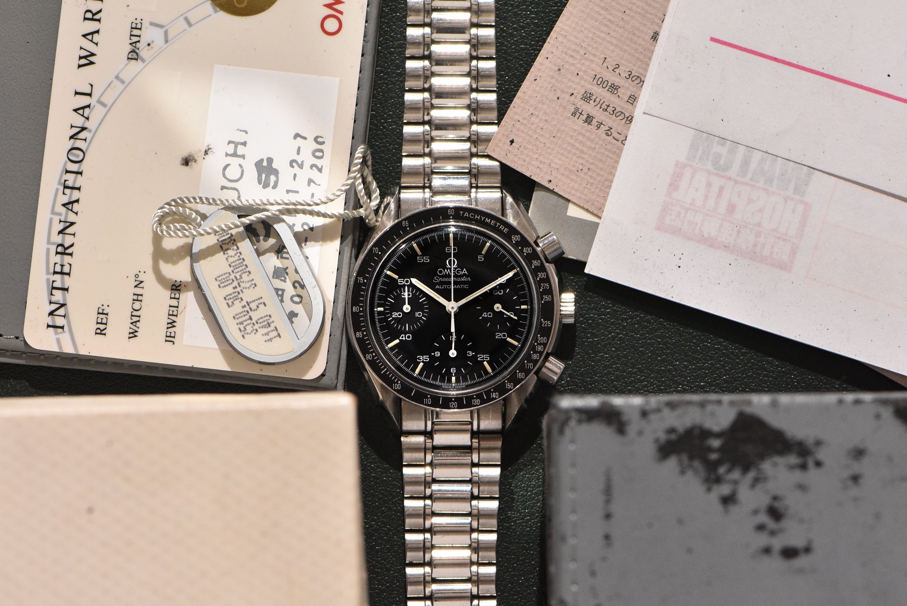 This Speedmaster has seen normal wear for its age. The crystal has minor markers with the original Omega stamp in the center. The bracelet is in great condition and still has so much life left to it. The case and bezel have regular wear with no serious dents. There are some small flea bites on some of the edges but no big gashes. The watch also comes with a complete set as seen. The best part is, this is an early example with creamy tritium lume.