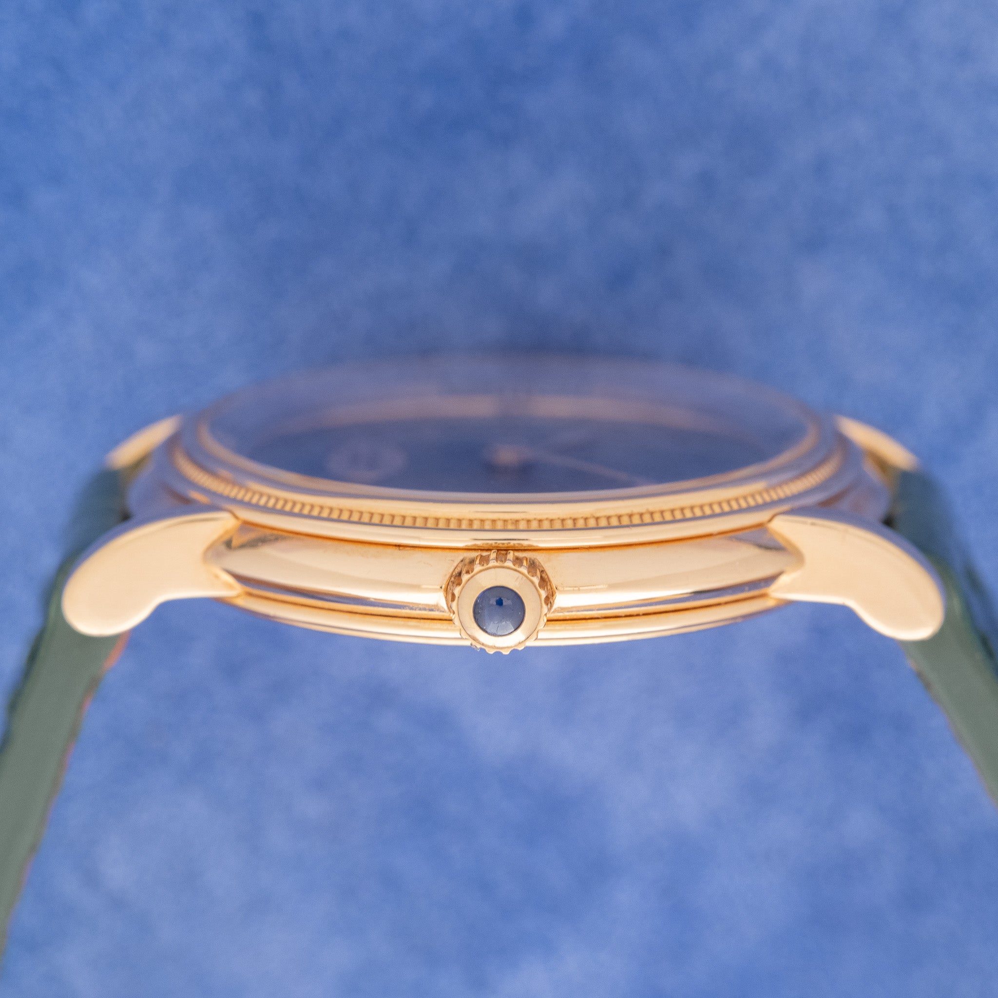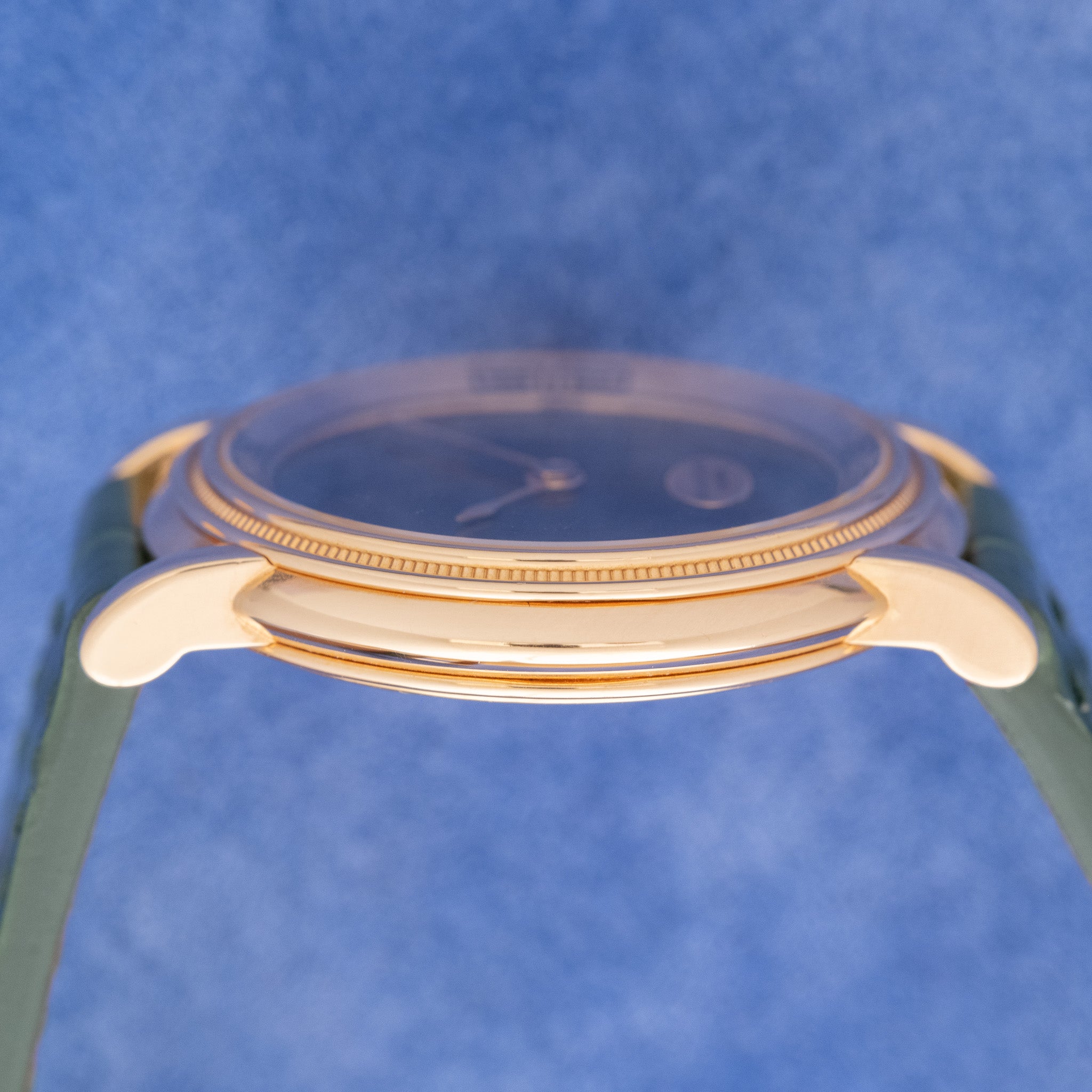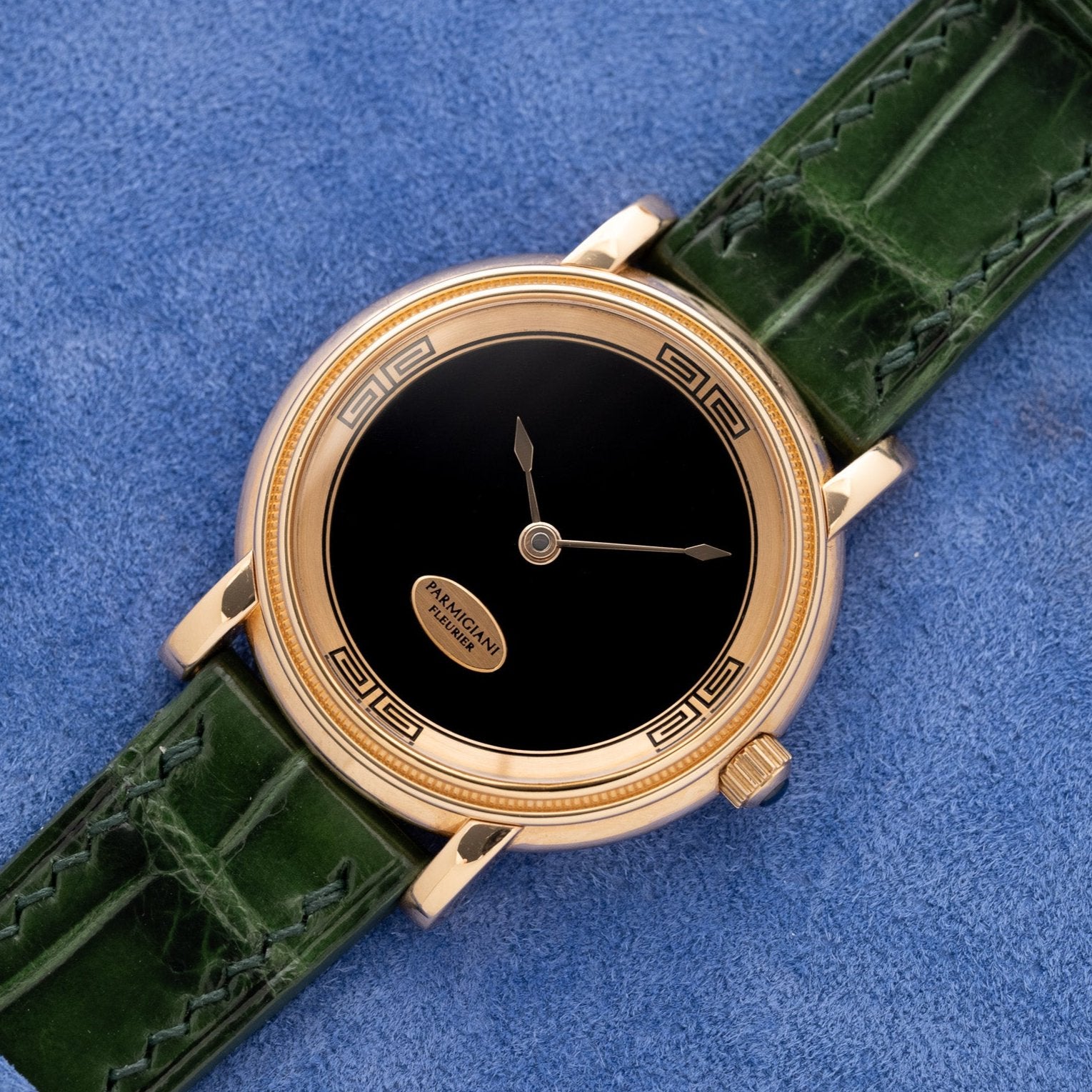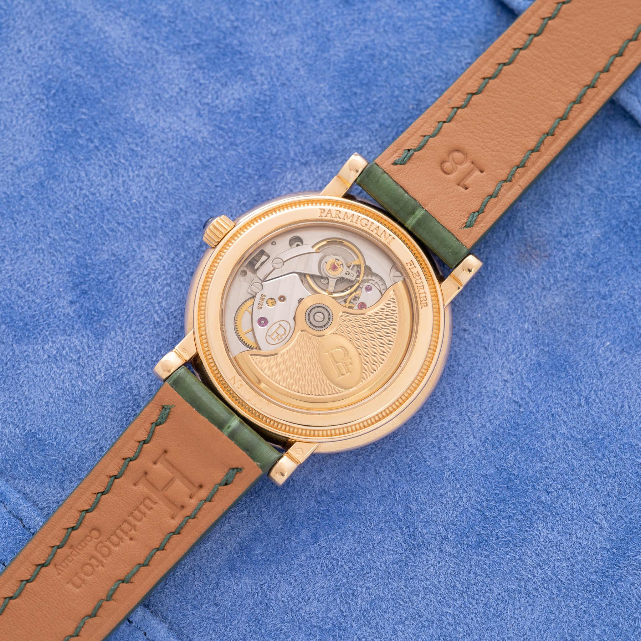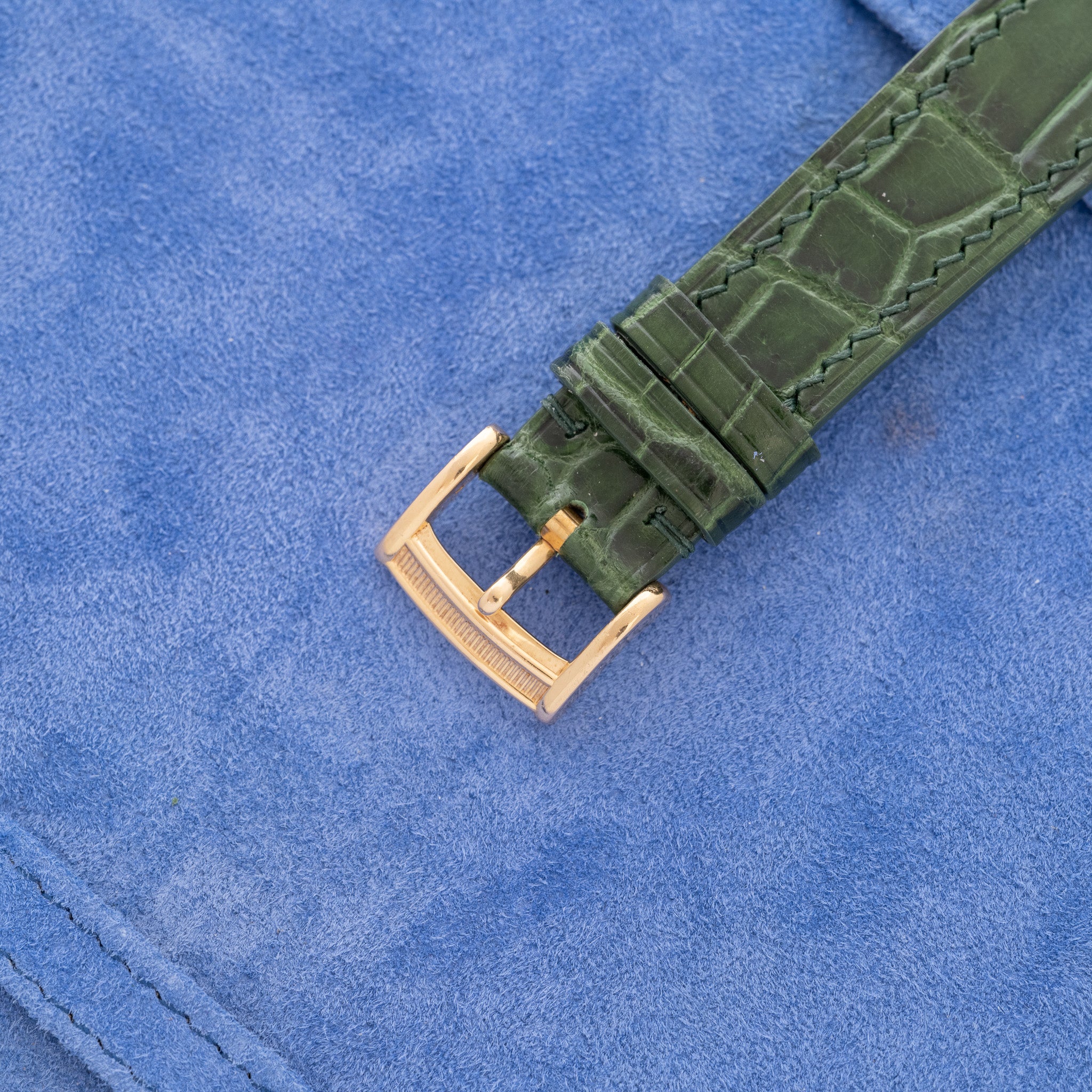 Strap & Buckle: The watch comes with its original black alligator strap along with an additional Huntington Company green alligator strap and its original 18K rose gold Parmigiani signed buckle.