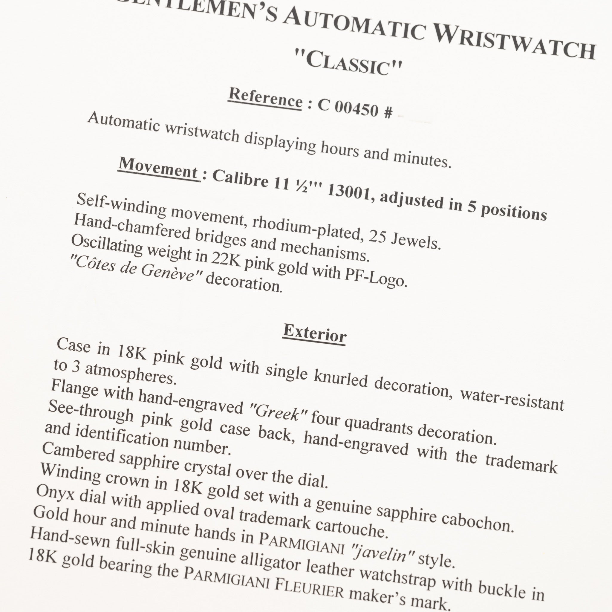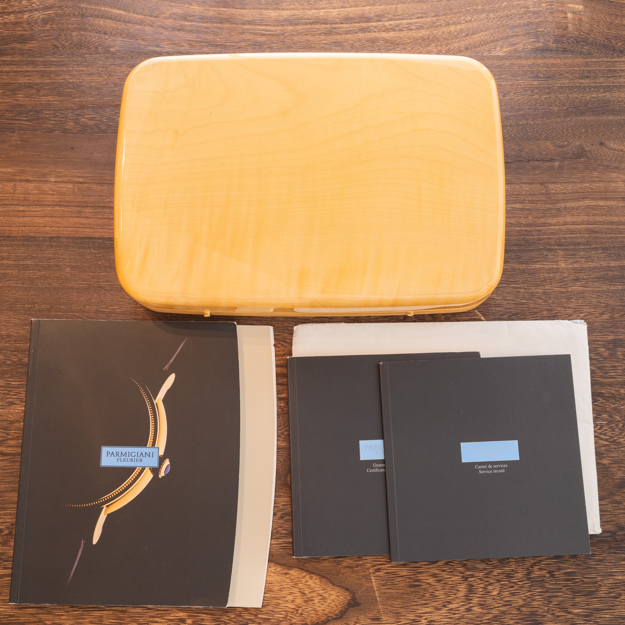 Movement: Automatic 25-jewel in-house Parmigiani caliber with 22K rose gold guilloche-engraved rotor and Côte de Genève finishing.