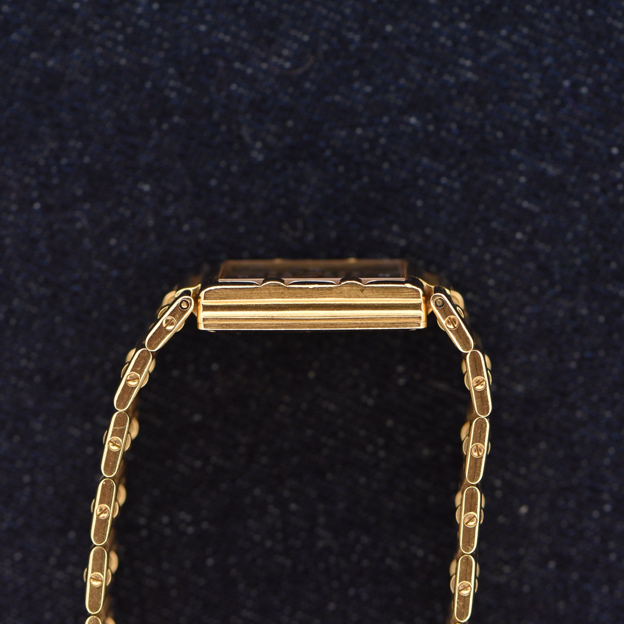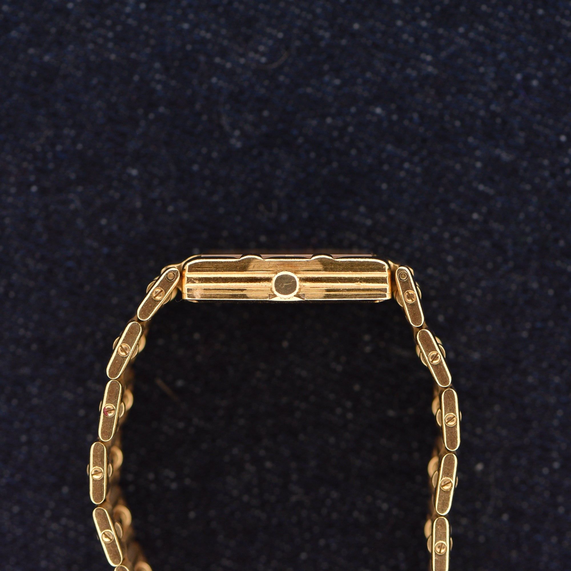 The gold case and bracelet are in nice condition with normal wear. The Onyx on the dial is clean with no cracks, and all the diamonds on the pave center and hour markers are intact.