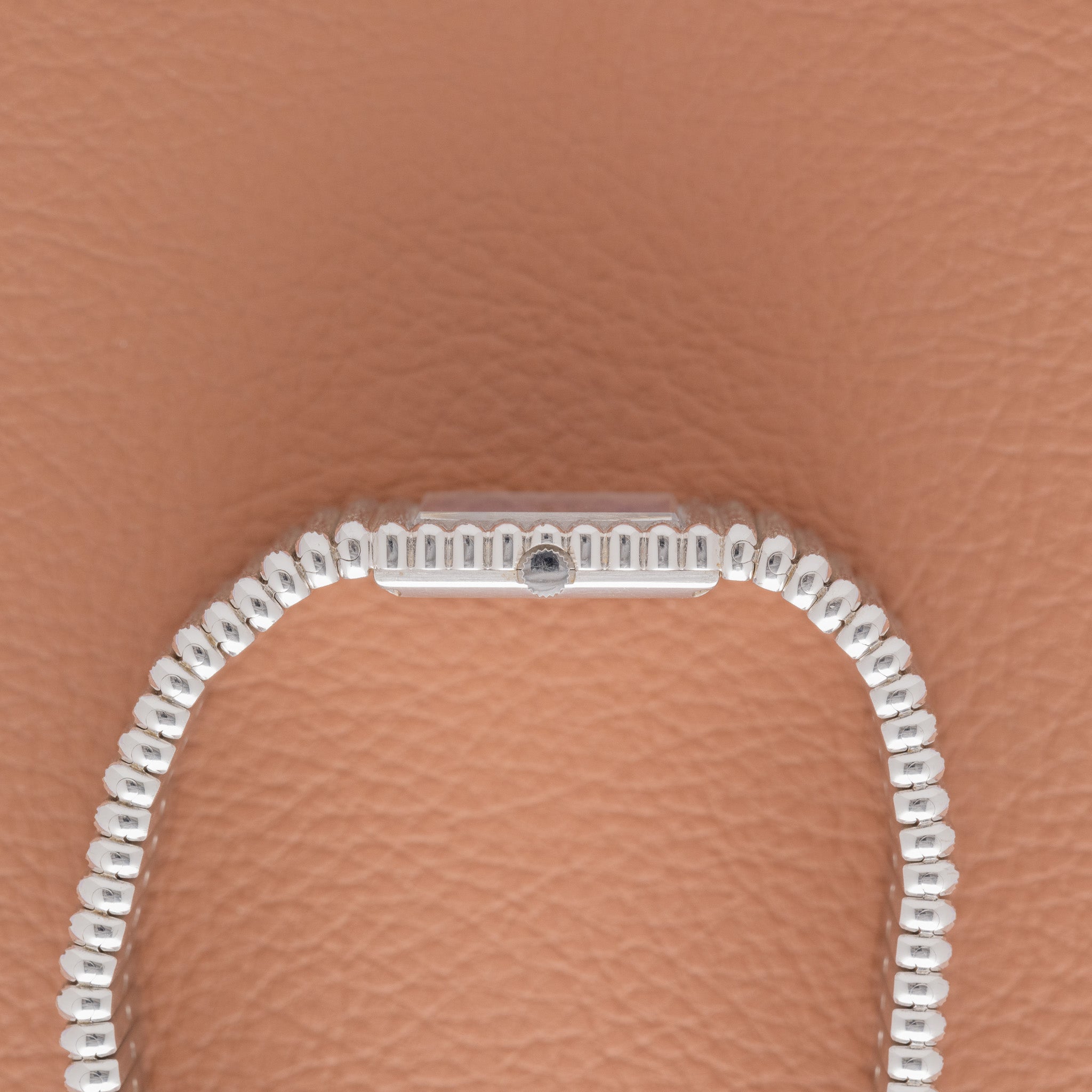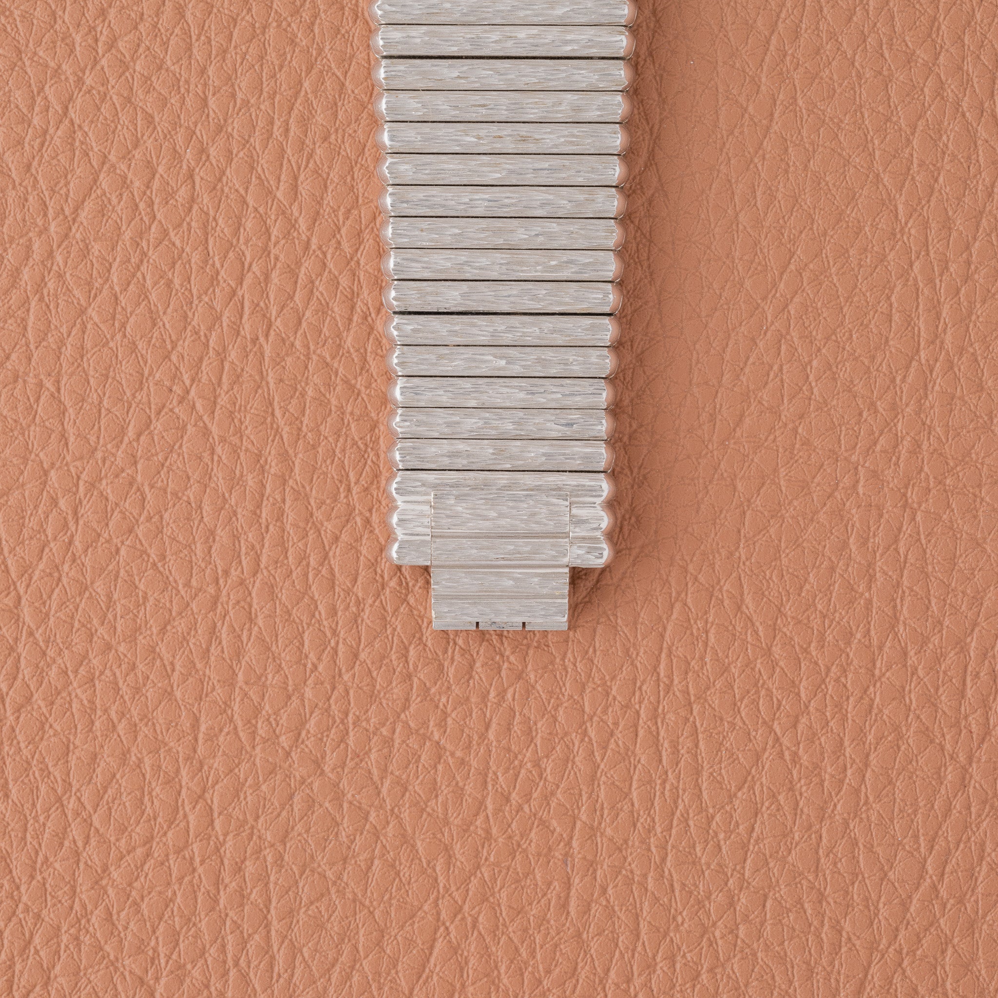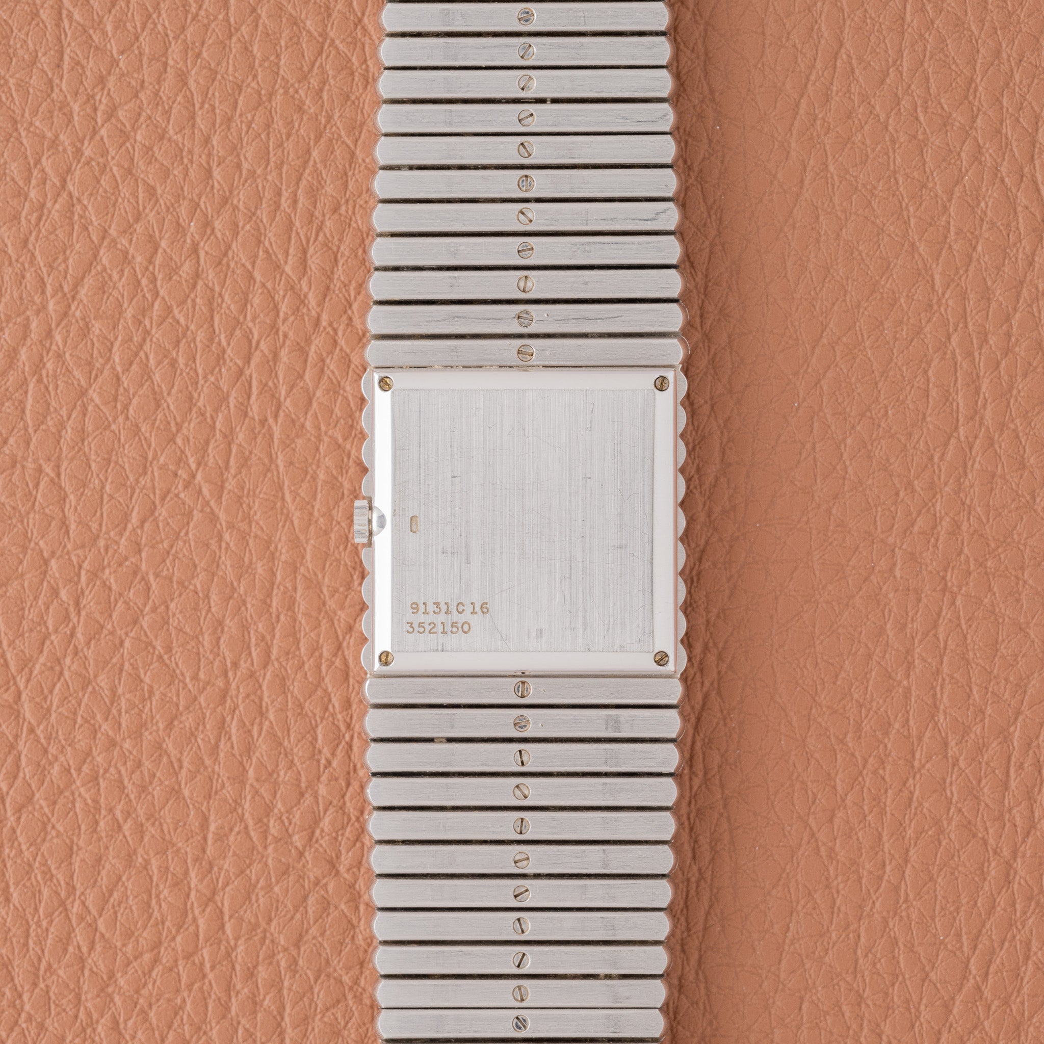 Reference 9131 C16 in white gold with a full integrated bark bracelet is a strong example of that philosophy. The ribbed bracelet construction flows directly into the square case, creating a continuous presence on the wrist rather than a separate head and strap. This design language is unmistakably period-correct and highly collectible today.