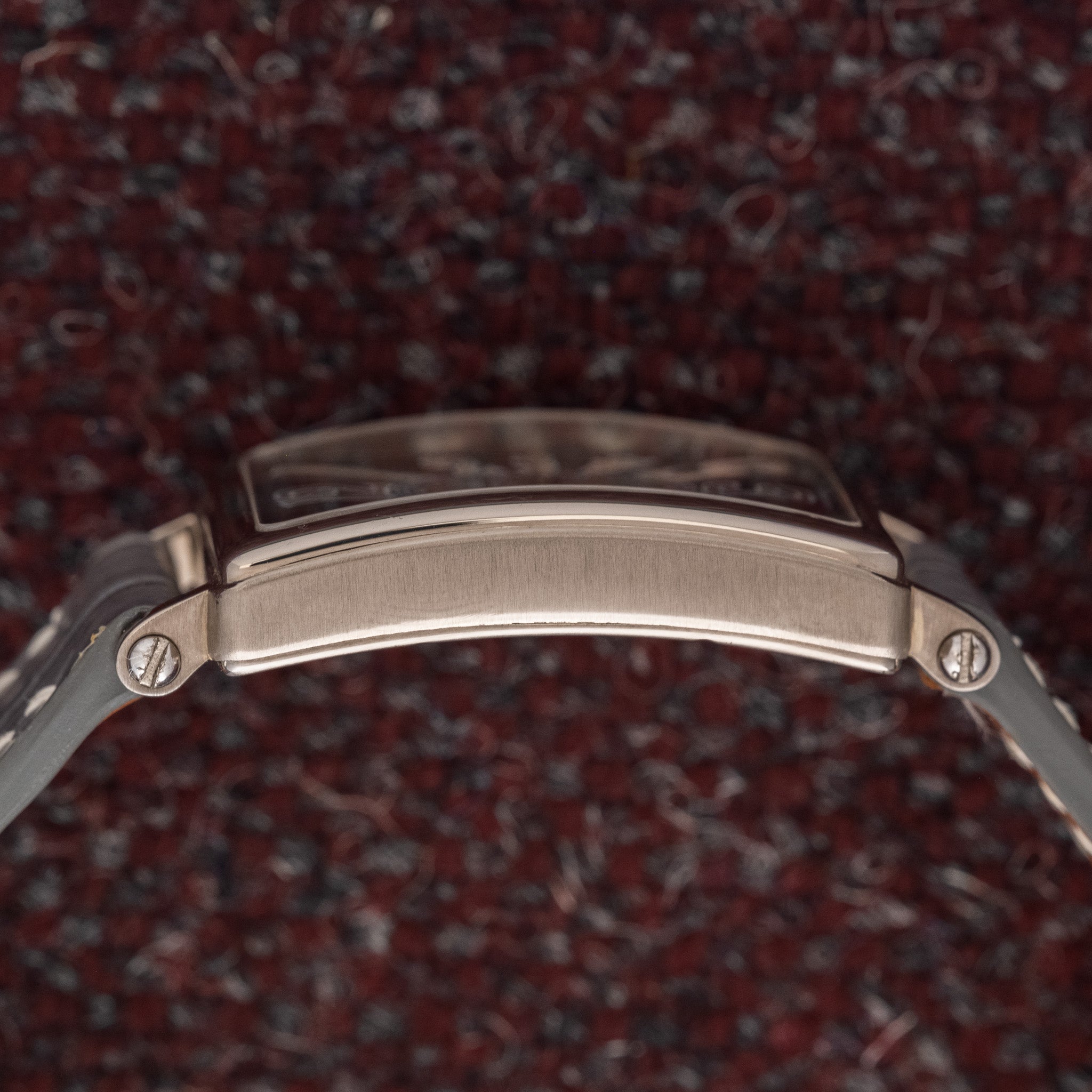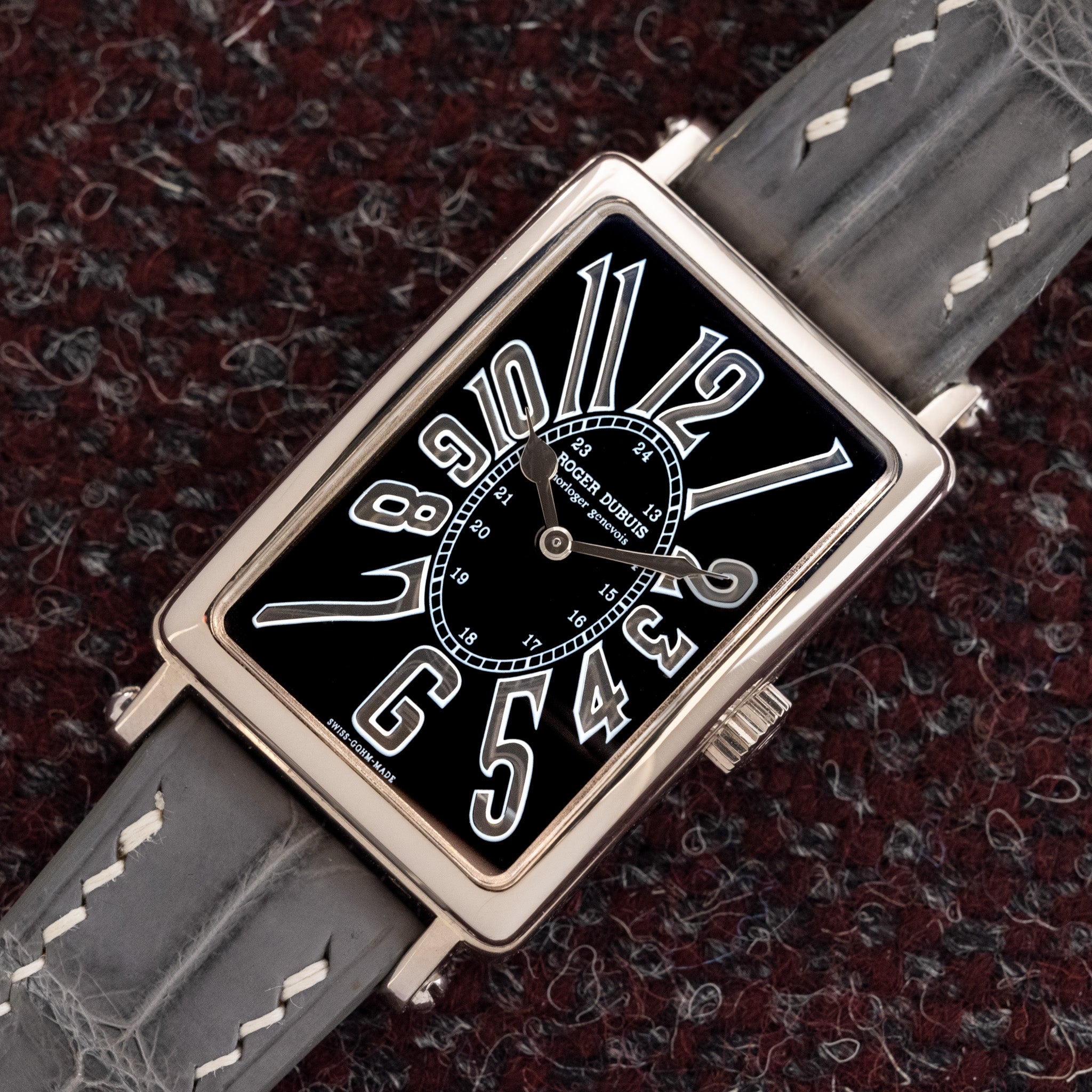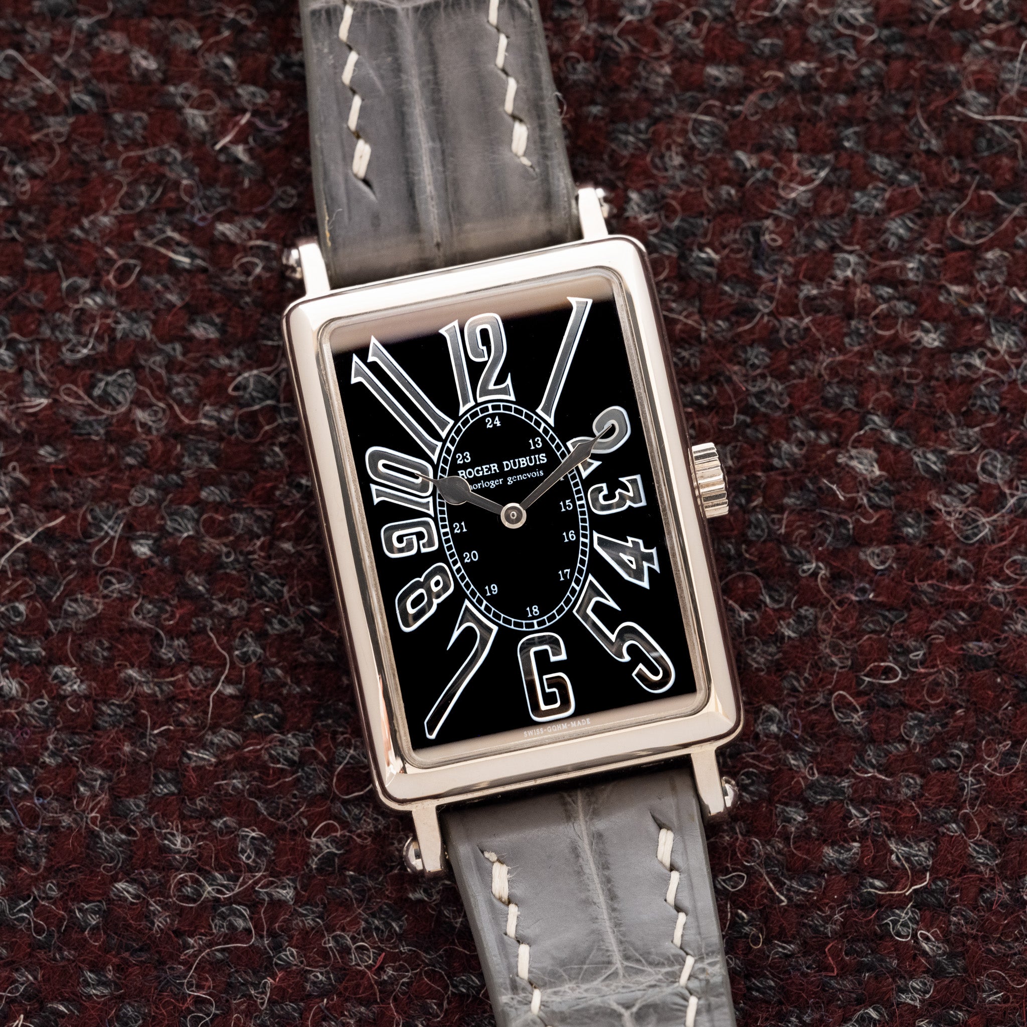 This particular example boasts a near perfect case size for those interested in elegant, dressy design watches. The case dimensions are well proportioned and wear as if it was a larger version of a Cartier Tank. If you have ever experienced the Cartier Tank Automatique from the 1970’s, this watch offers a similar shape but with the addition of lugs. But, where the Much More sets itself apart from the Cartier Tank is in the finishing. Without a doubt each and every component of this watch greatly surpasses the Cartier Tank. The 18K white gold case, in unpolished condition, has significant heft. The dial treatment is much more sophisticated in design and we are particularly fond of the black dial, silver metallic exploded numerals wrapped in white surrounds, and white chemin de fer railroad track which ties the design together beautifully. Housed within the watch is the in-house produced Geneva Sealed manual movement which is artfully displayed in the open display caseback. This particular example is in nearly flawless overall condition and comes complete with papers and its original Roger Dubuis signed 18K white gold buckle. We love the Cartier Tank Louis Cartier and its important place in history, but from a quality perspective, it cannot compete with the Much More.