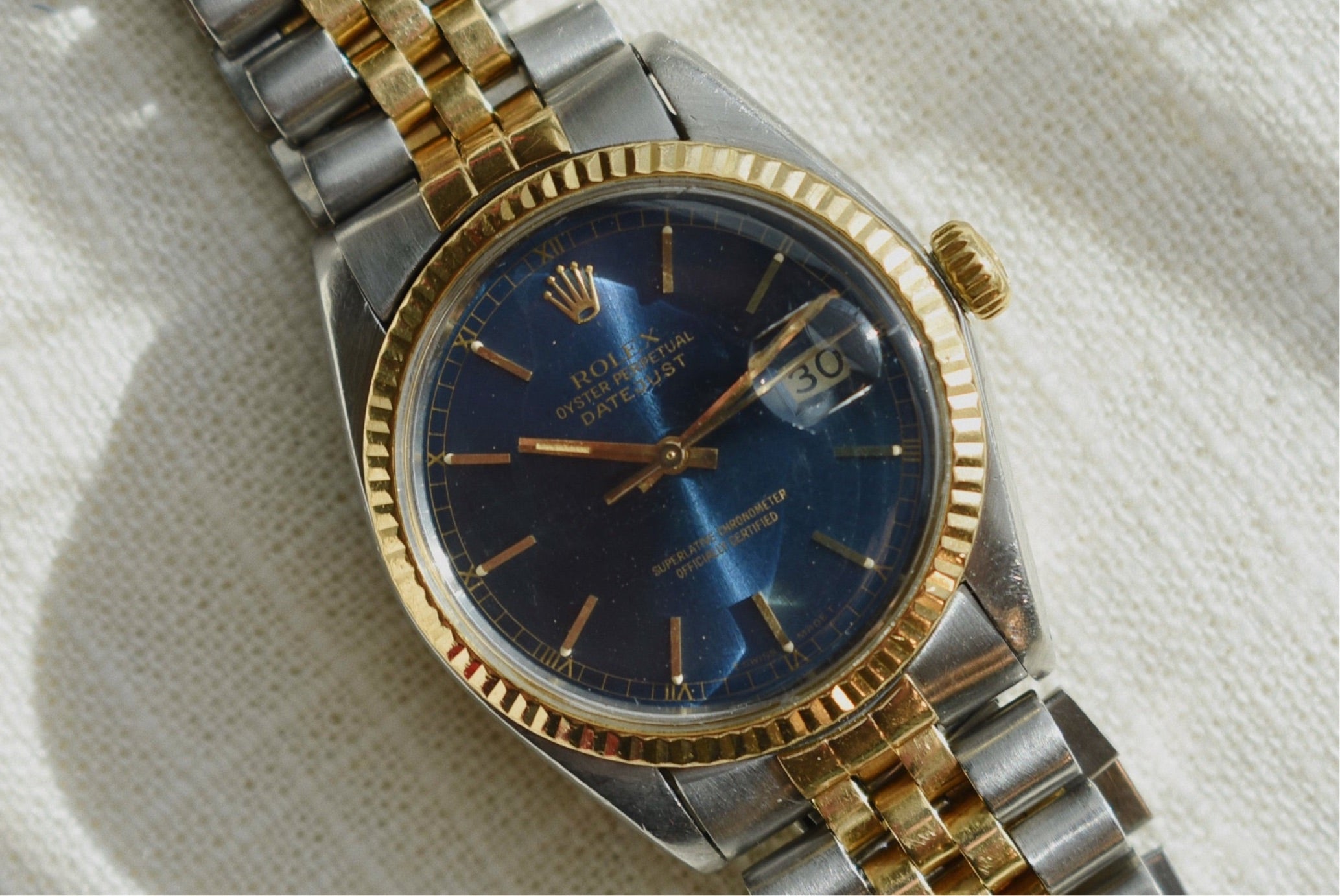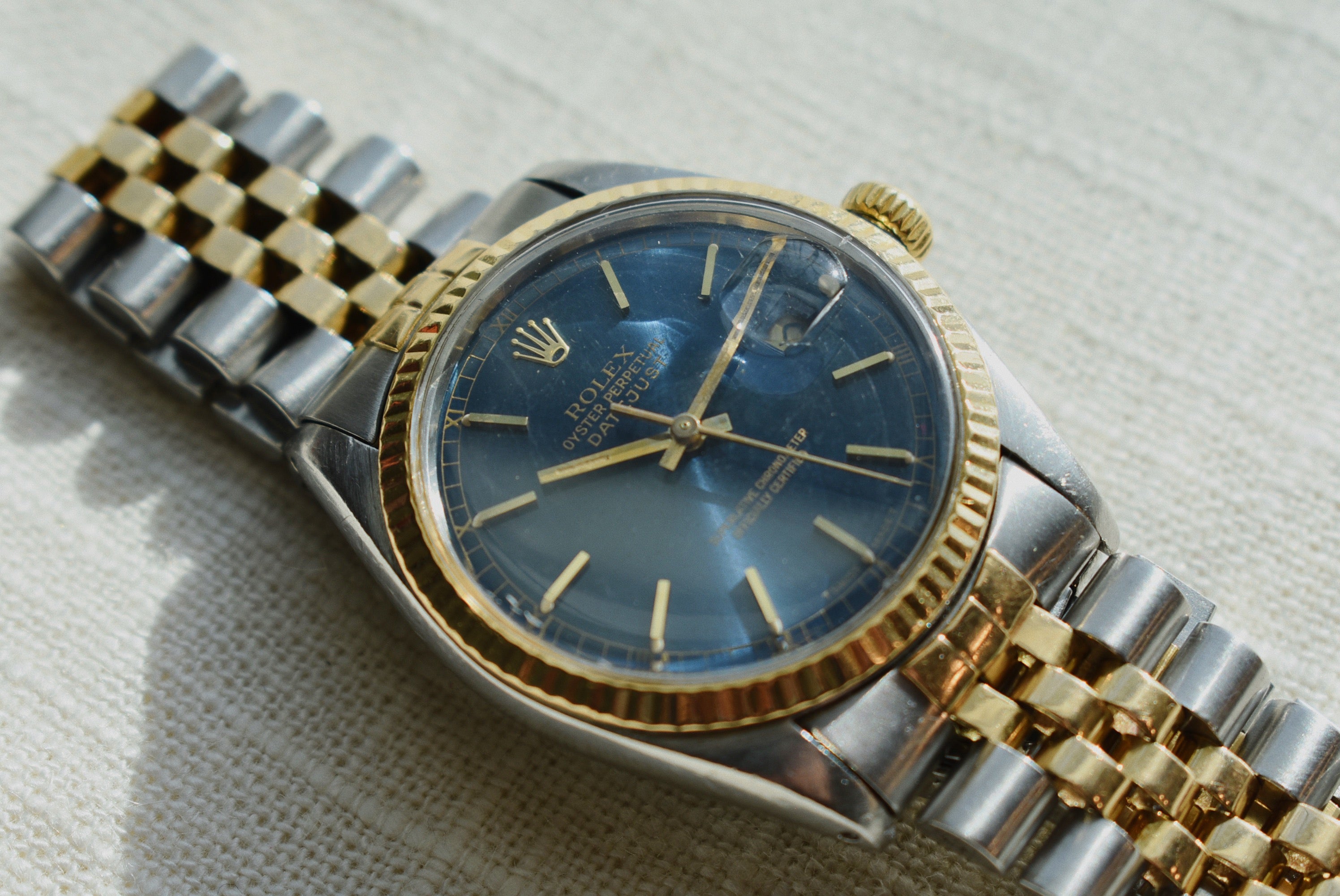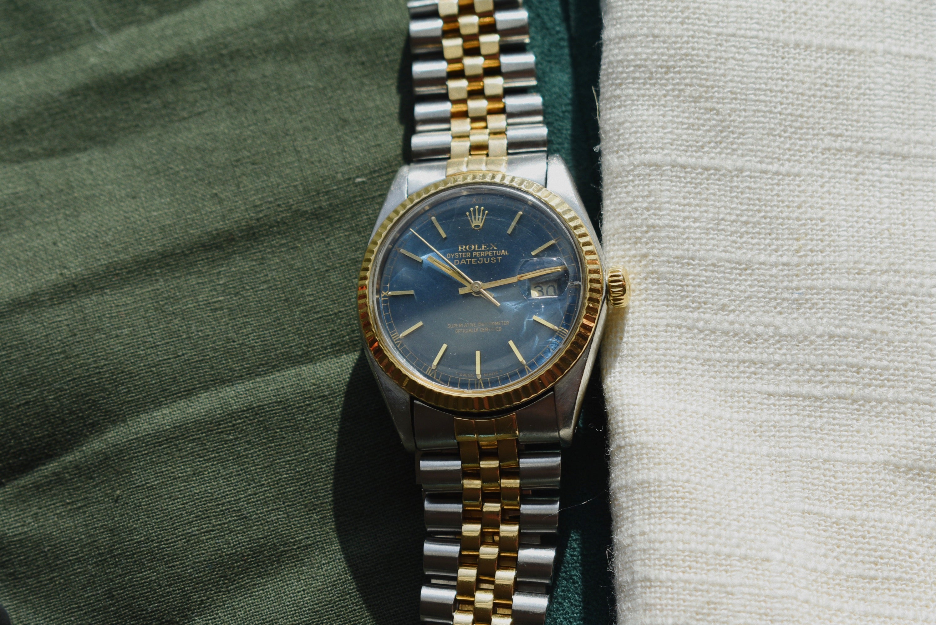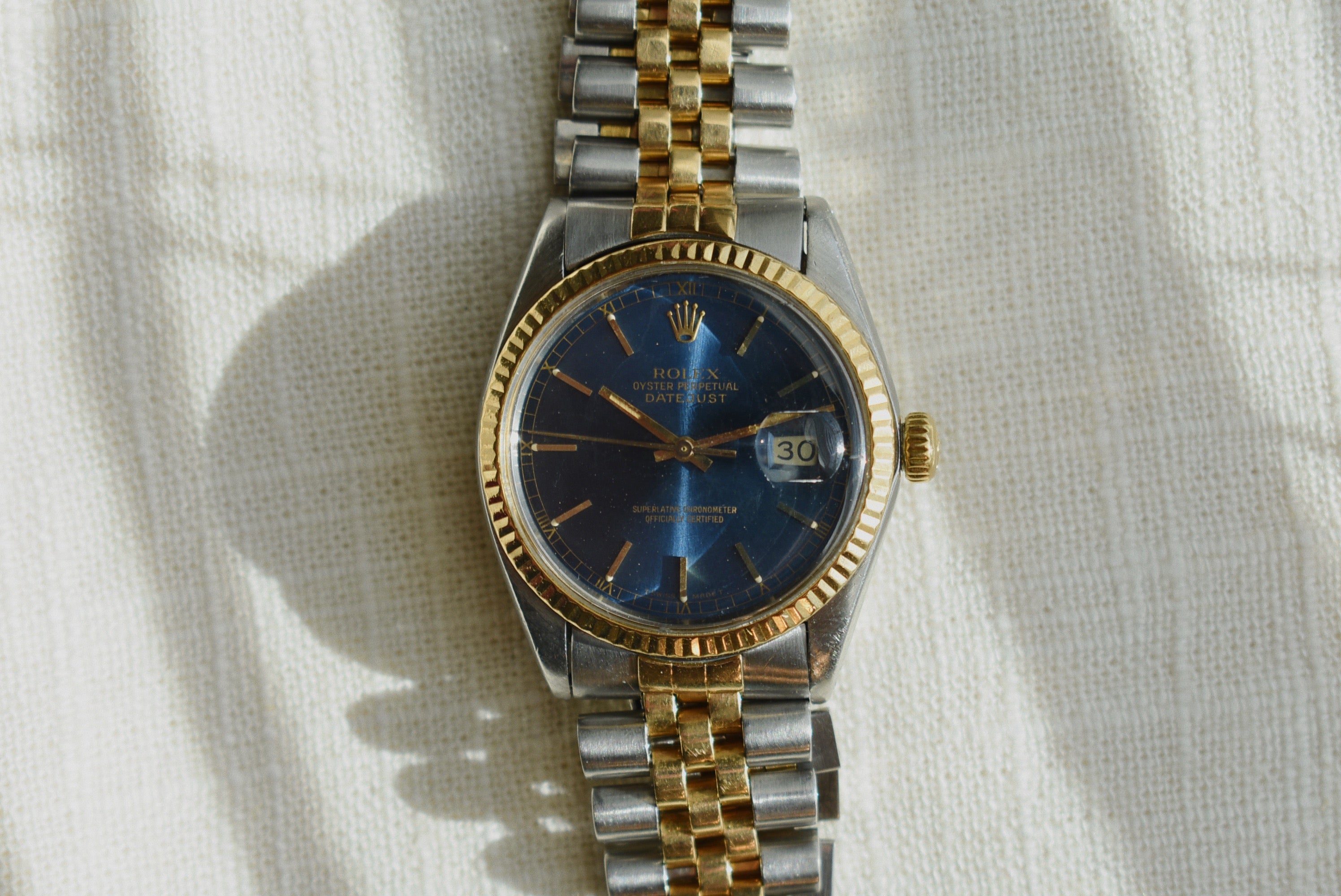 A Rolex Datejust you don’t see everyday. A two tone with a beautiful rich blue dial. The watch looks great for its age and photos don’t do it justice.