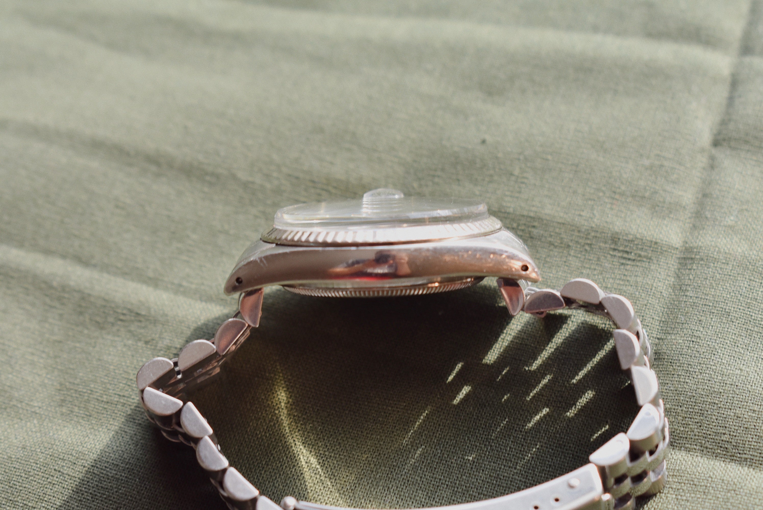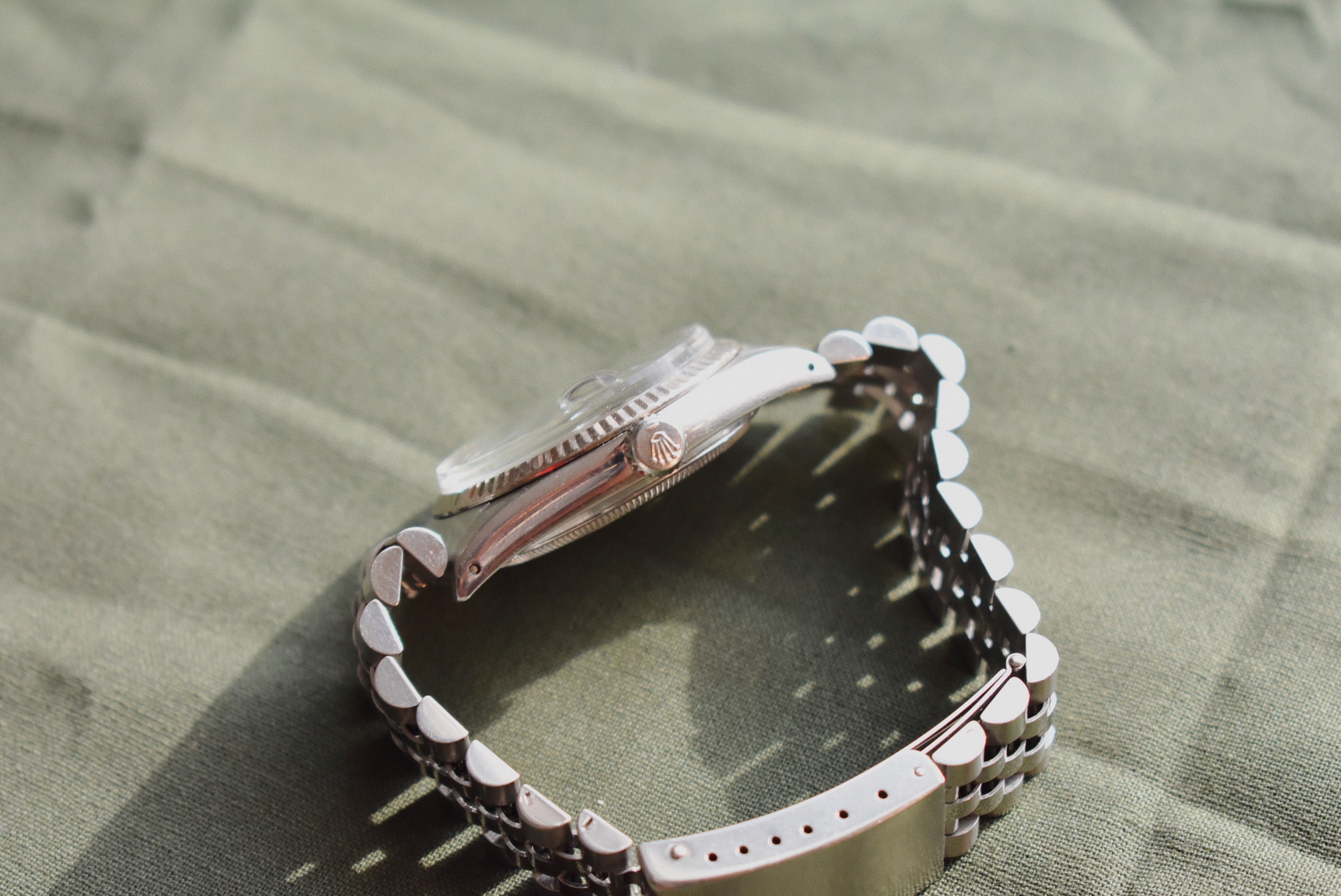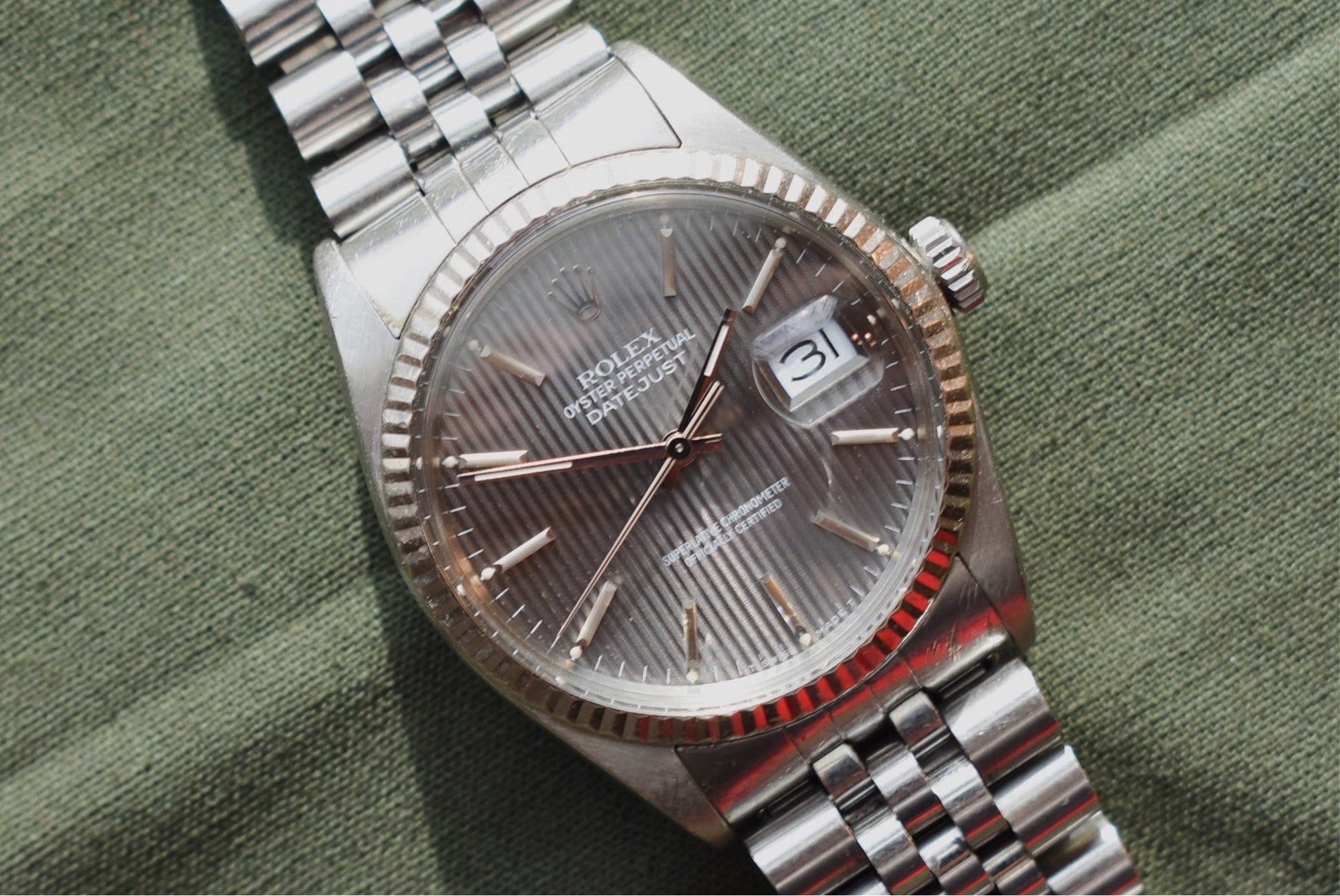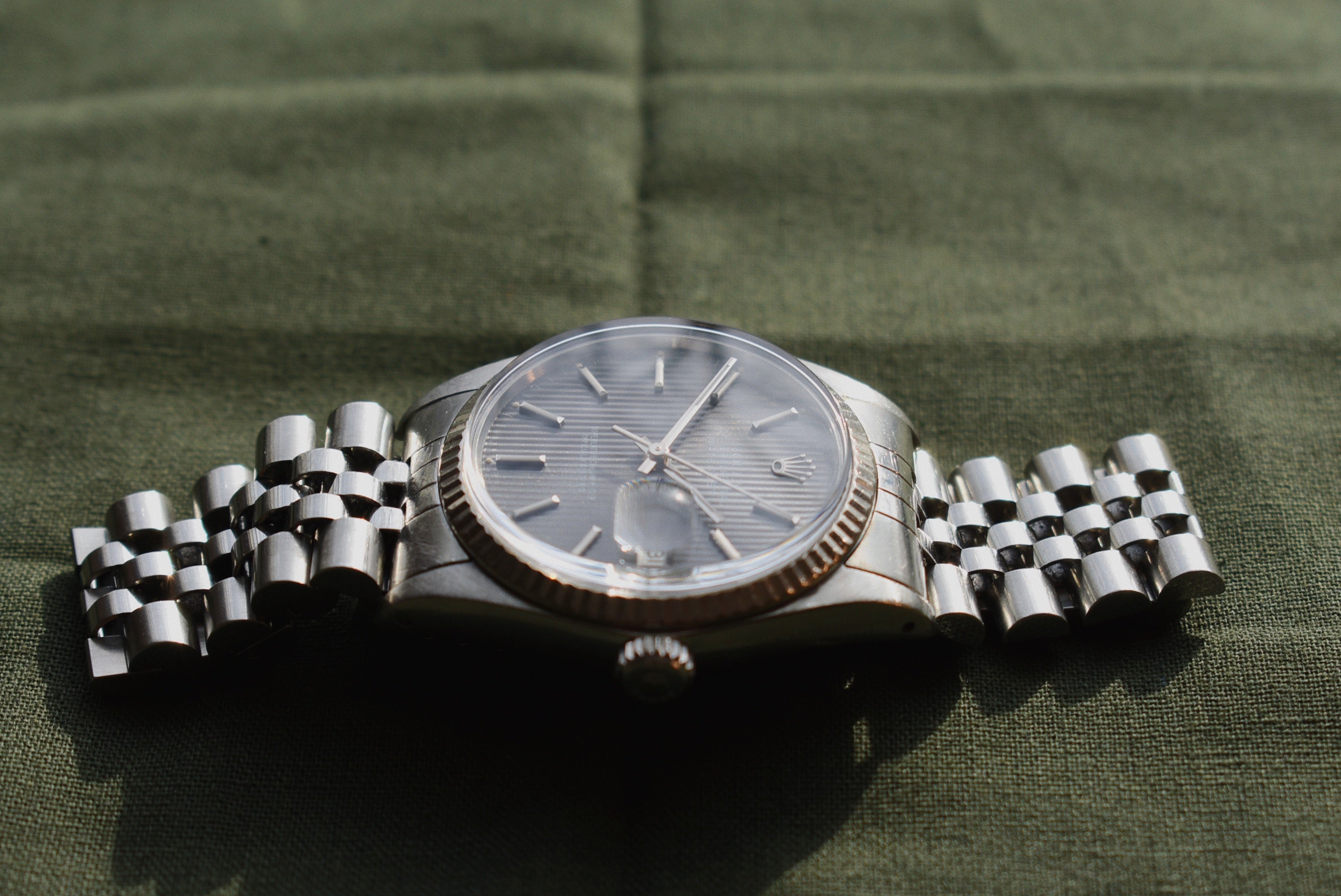 A Grey Tapestry dial is just too good to pass up on. Tapestry, pinstripe, corduroy. The Tapestry dial goes by a few names and has a few dial colors but the grey is one of the best. A beautiful light slate color, sunlight bounces off it like it’s nothing.