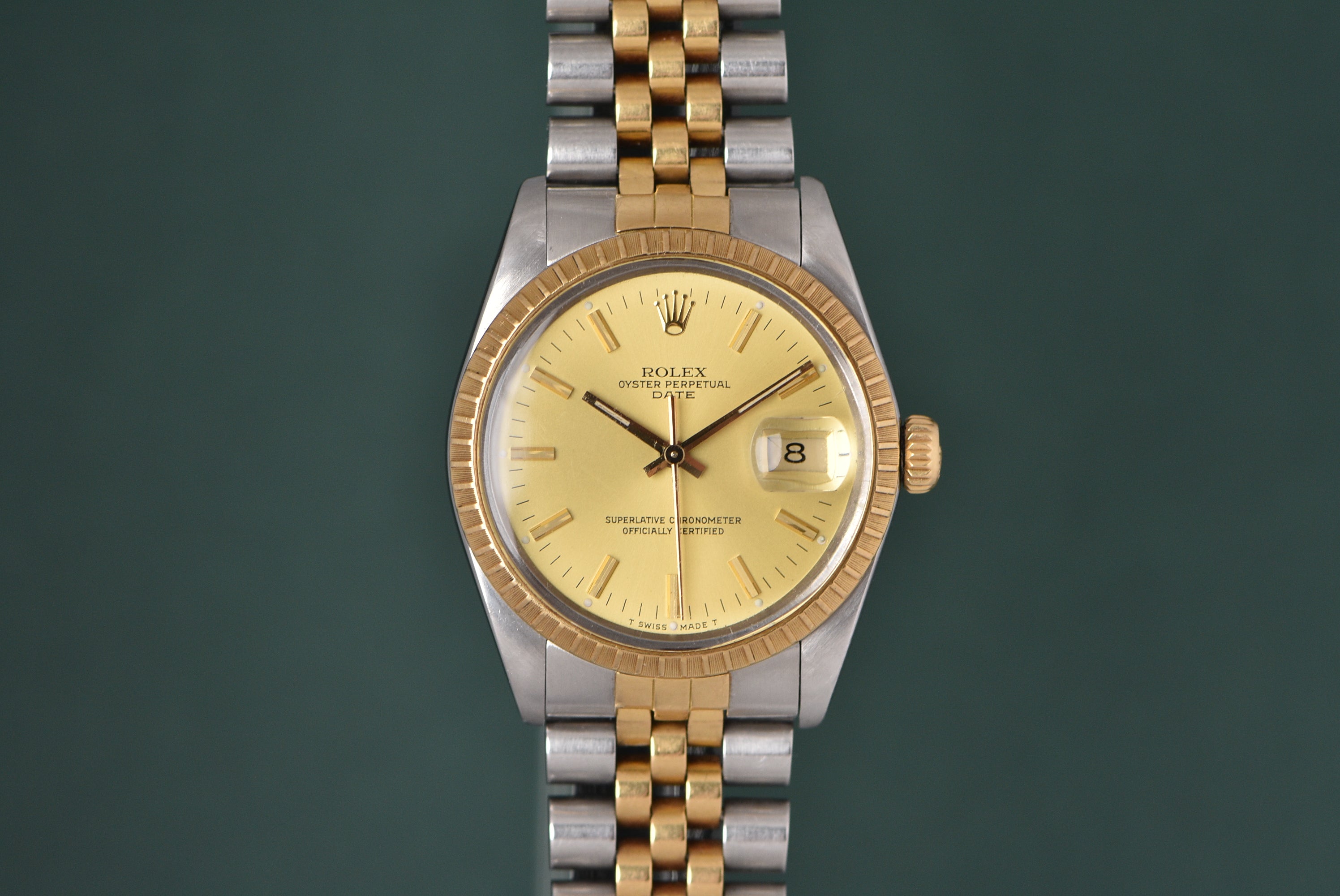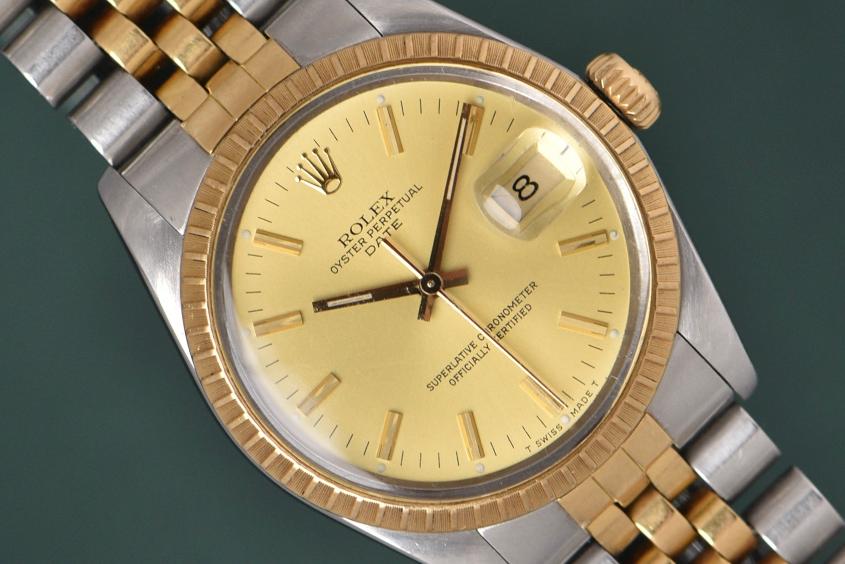 1987 Rolex Date 15053 Gold Engine Turn Bezel