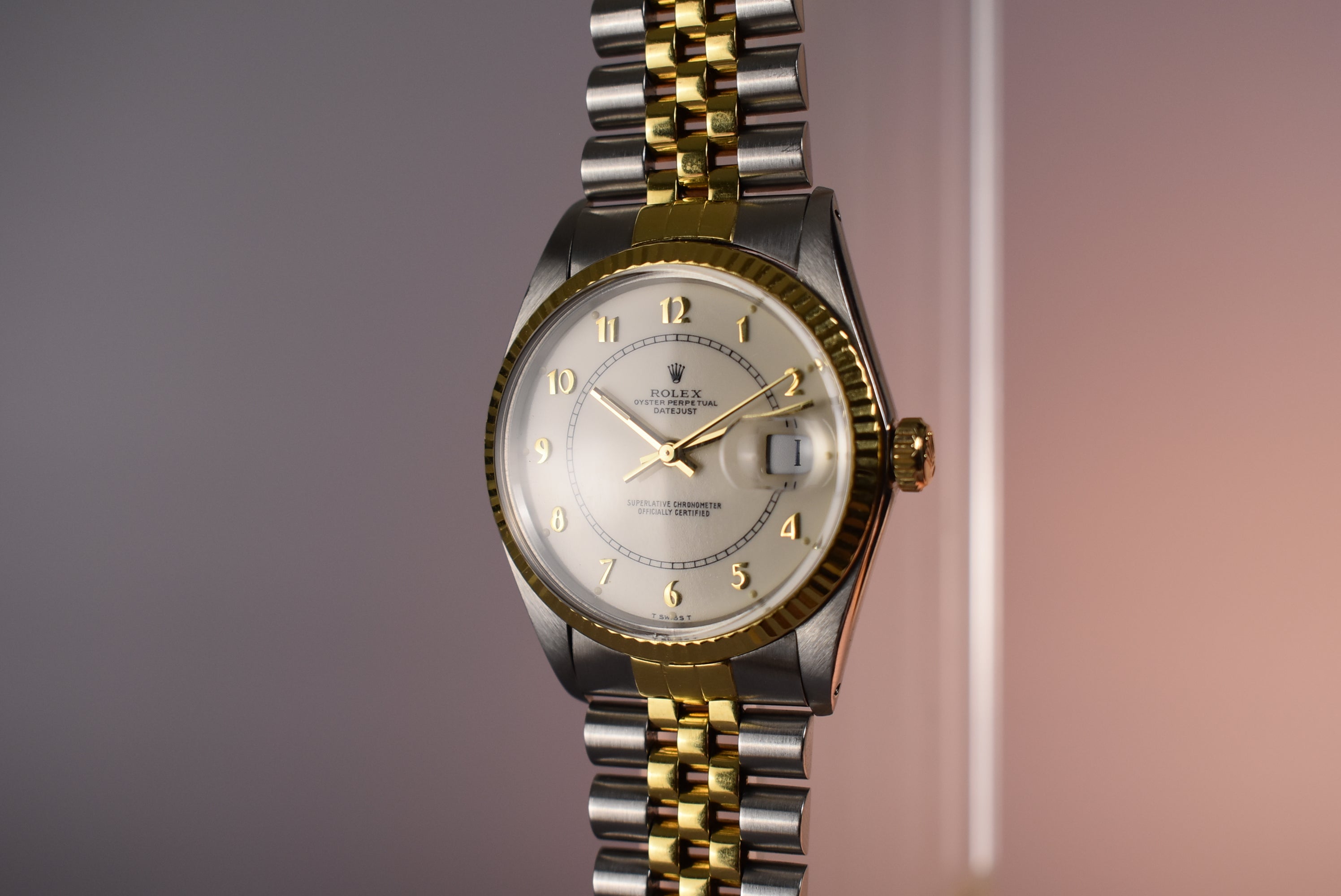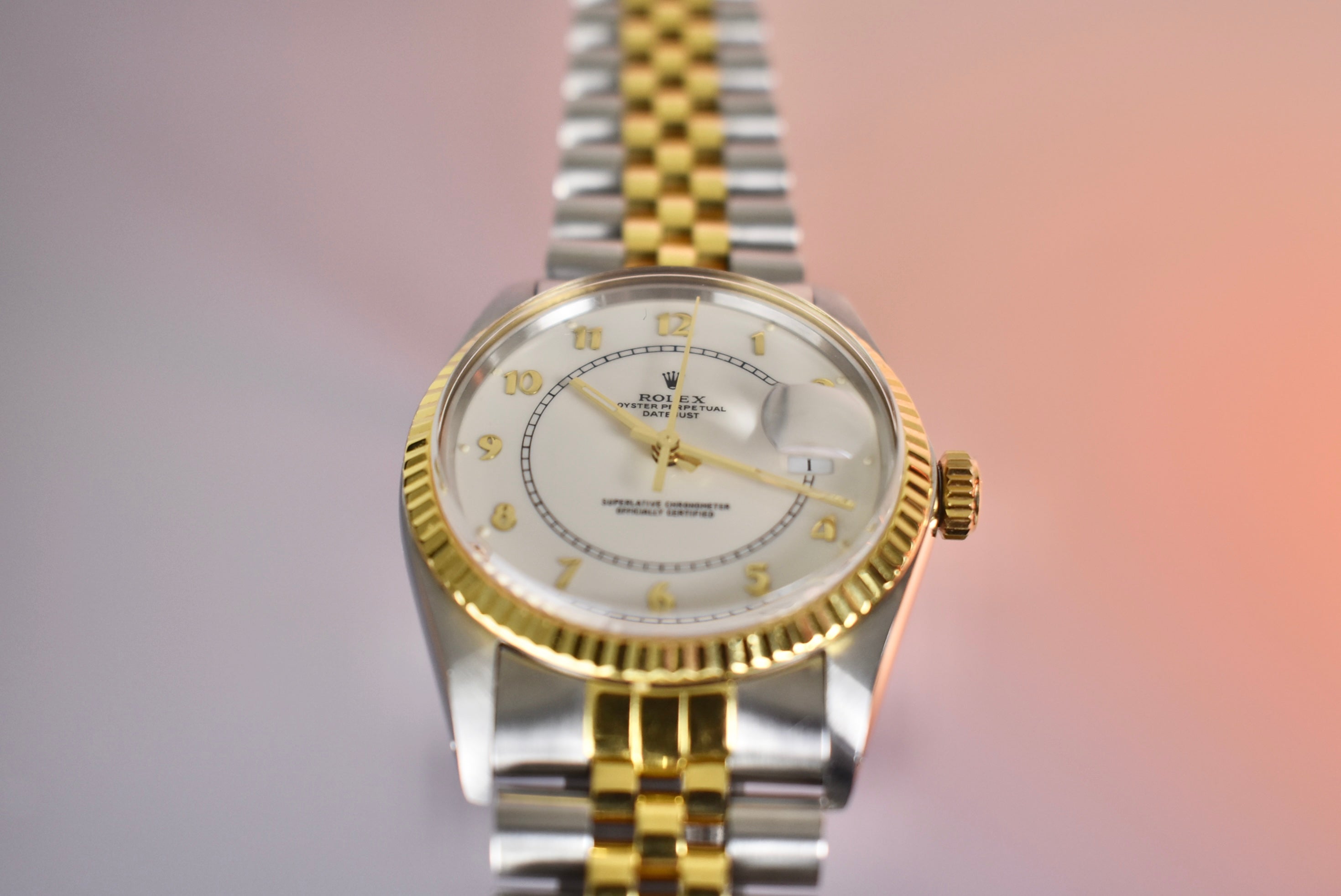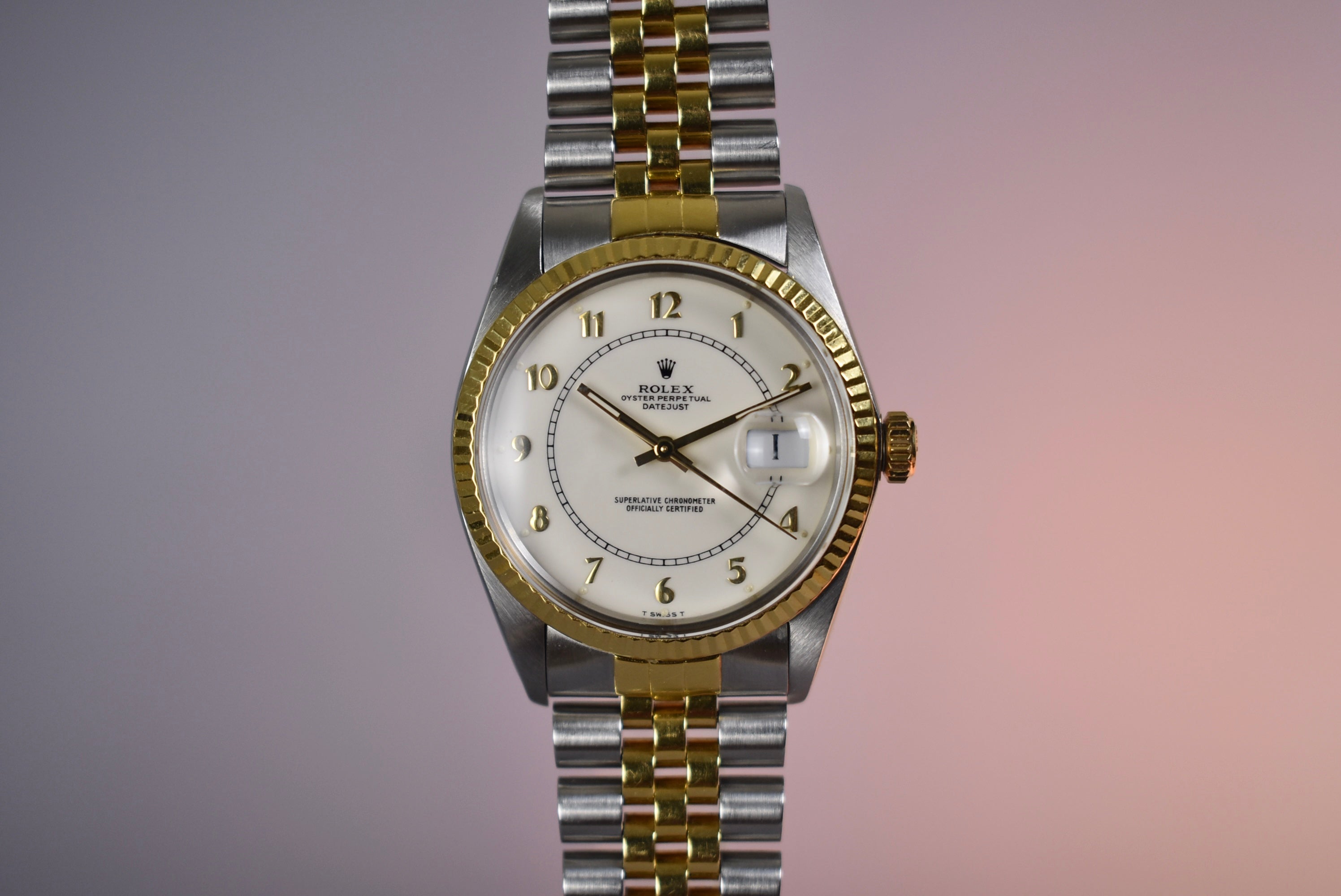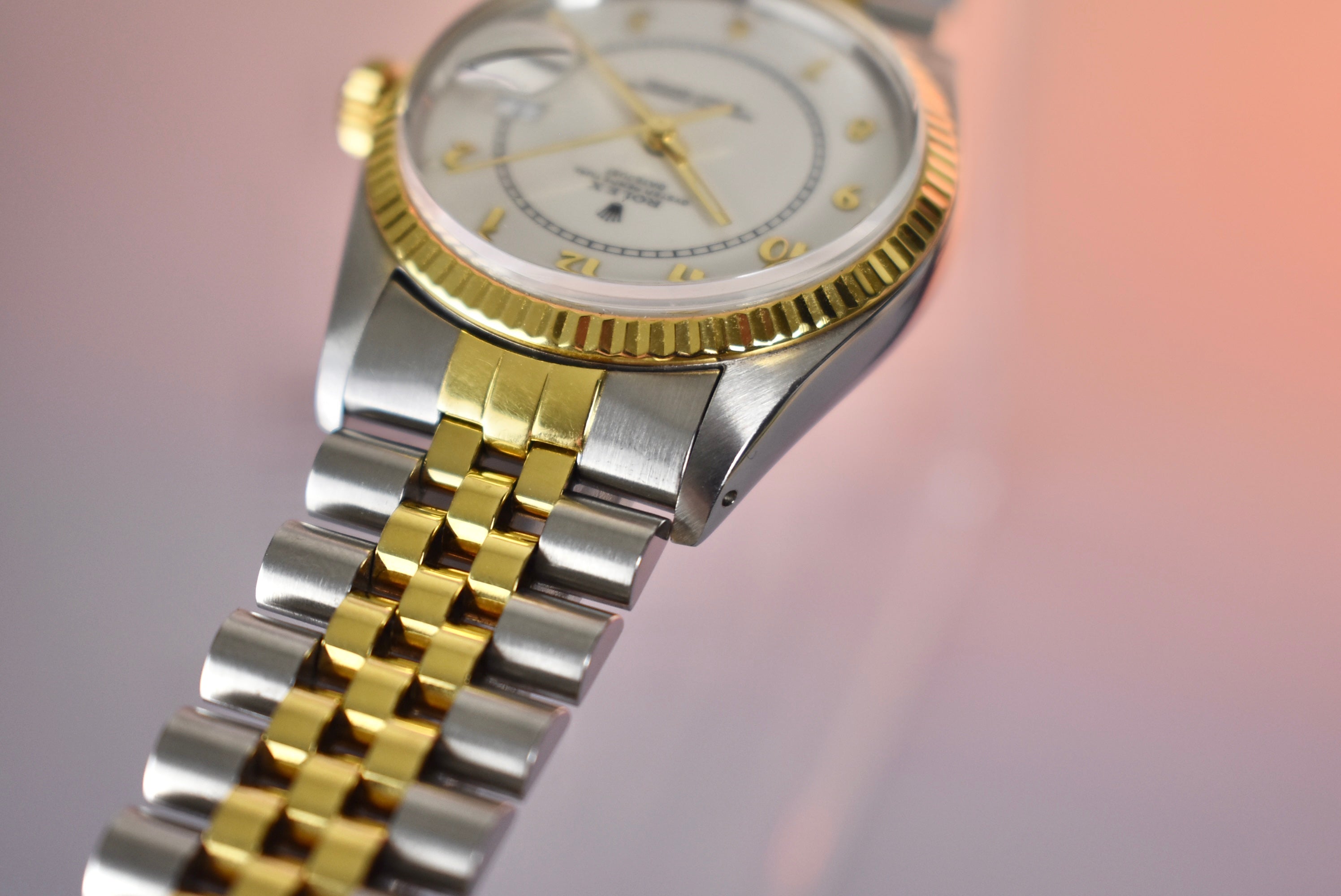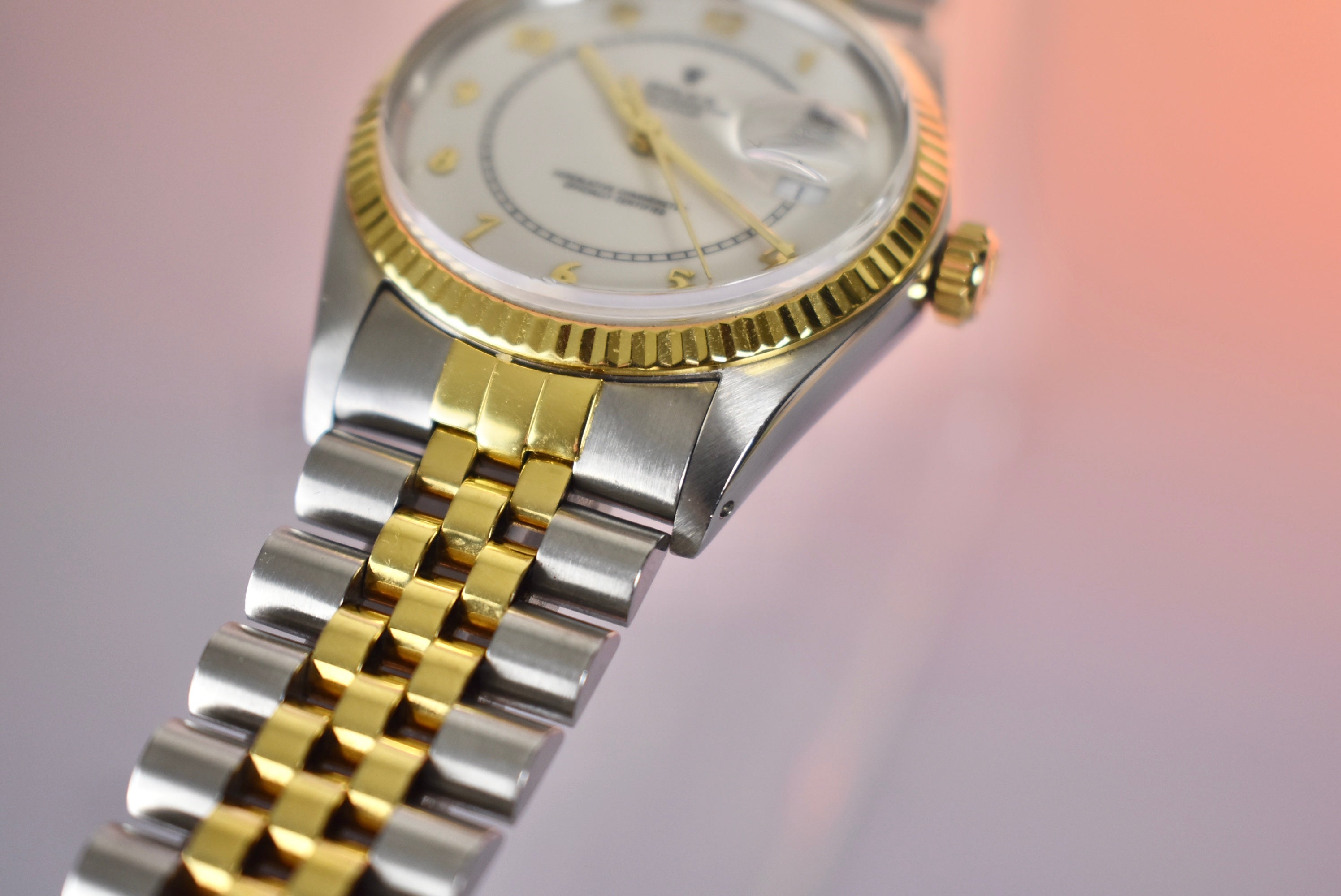 A first for us and not the last thats for sure. The Boiler Gauge Rolex dial is one not many know exists and there are also very few in the market. This example is the two-tone 16013 and has the ivory Boiler Gauge dial. The center track mark and classy numerals make this watch very unique compared to other Datejust. This also comes with the Rolex Service card and papers from a recent, 2017, service.