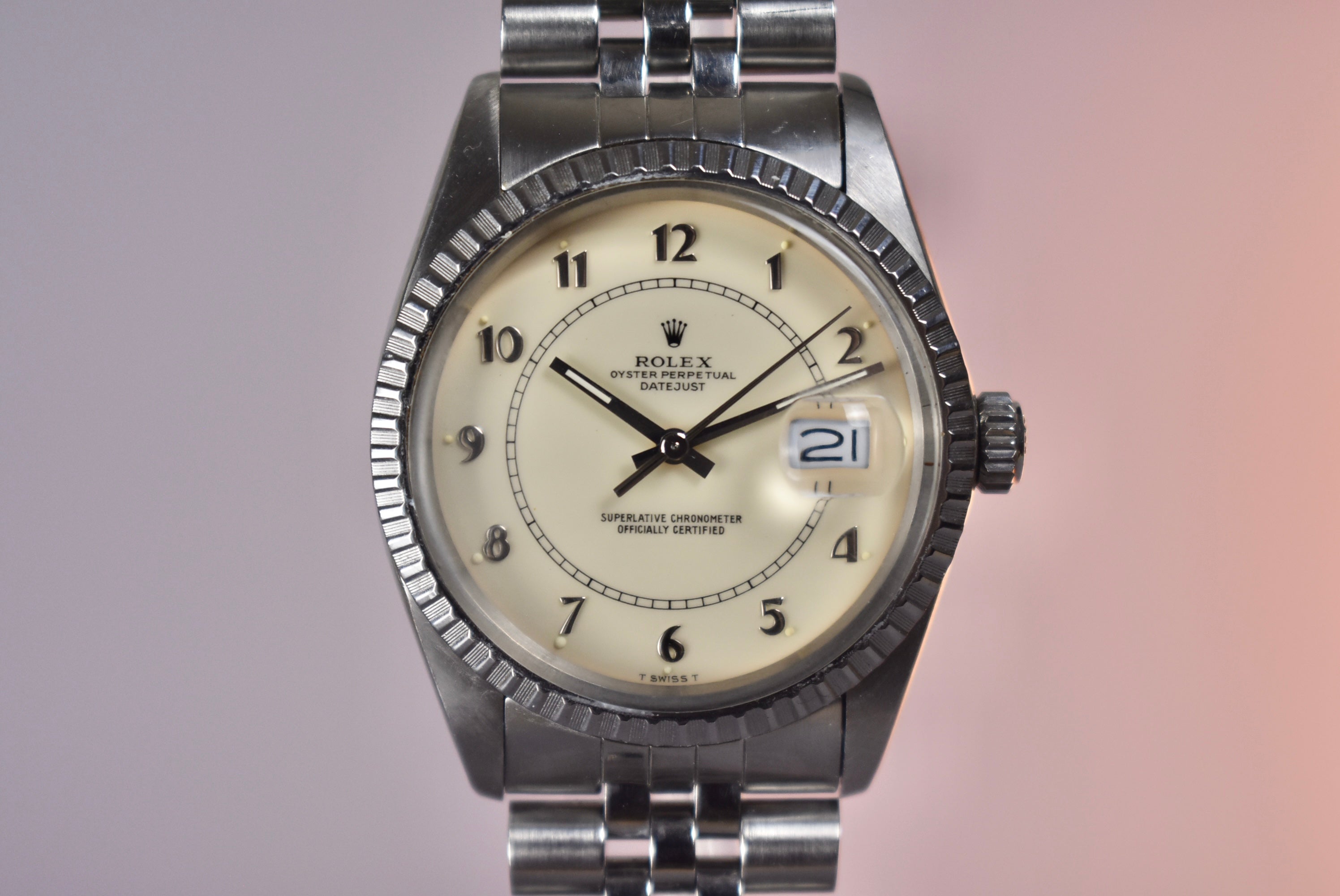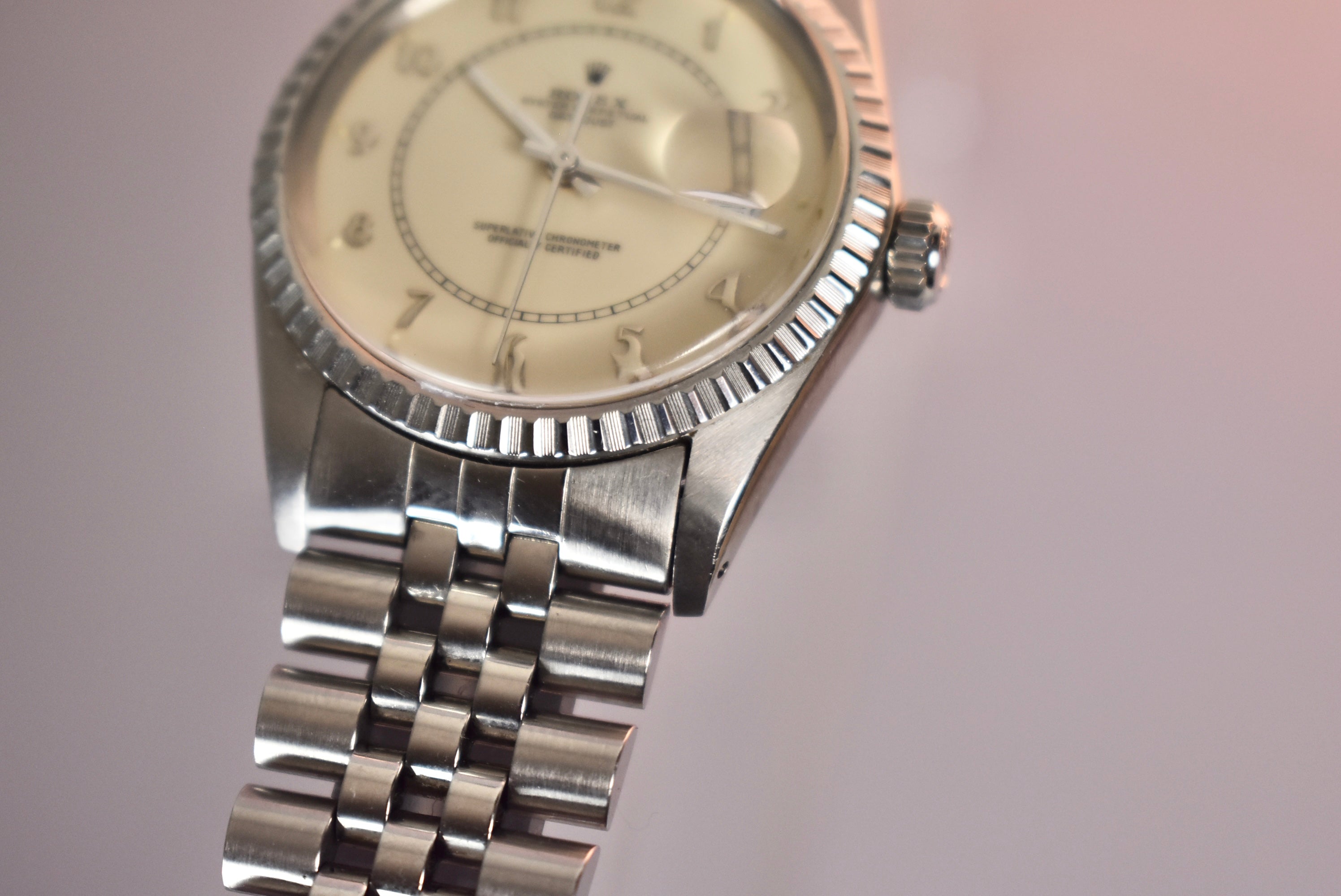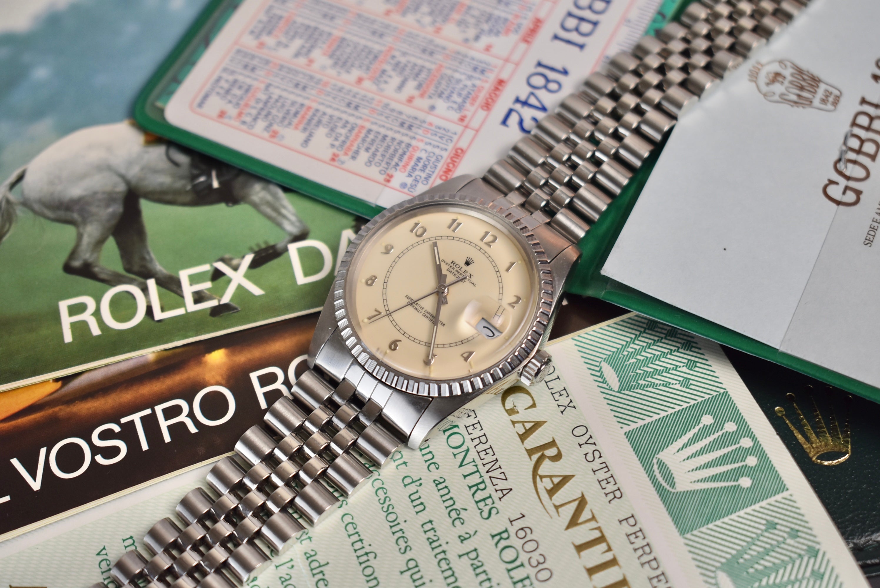 The Boiler Gauge Rolex dial is one not many know exists and there are also very few in the market. This example is the all steel with an ivory Boiler Gauge dial. The center track mark and classy numerals make this watch very unique compared to other Datejust. The watch also comes with box and papers and the original receipt from Gobbi in Milano.