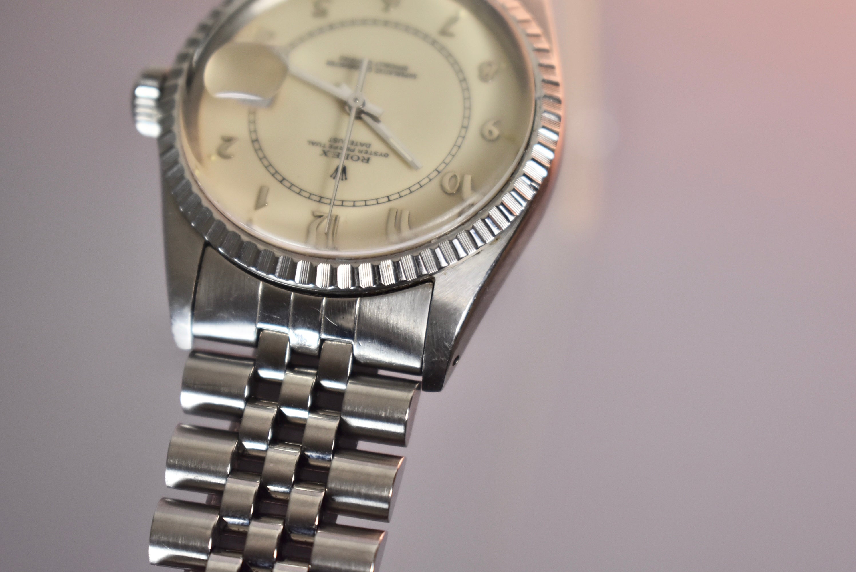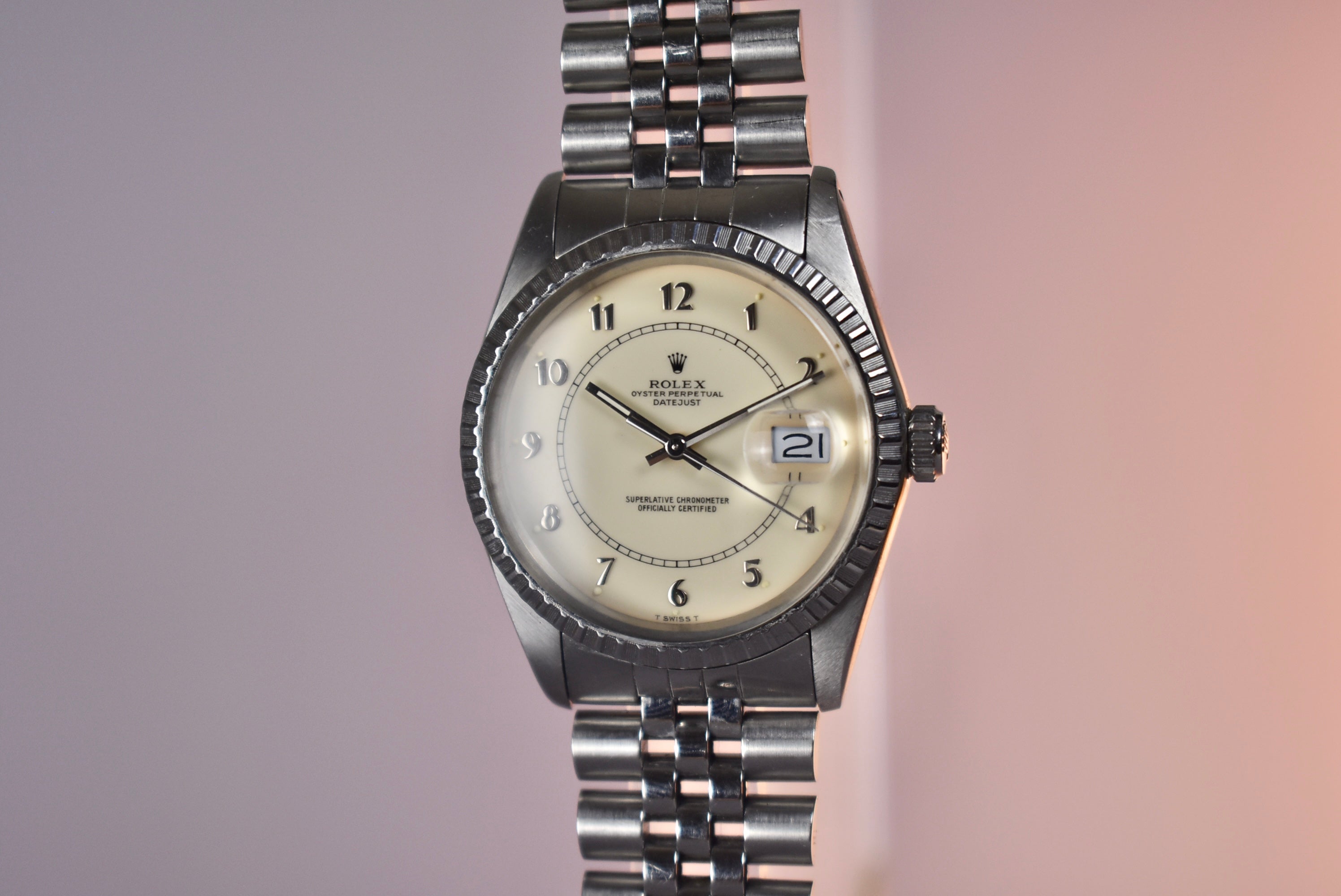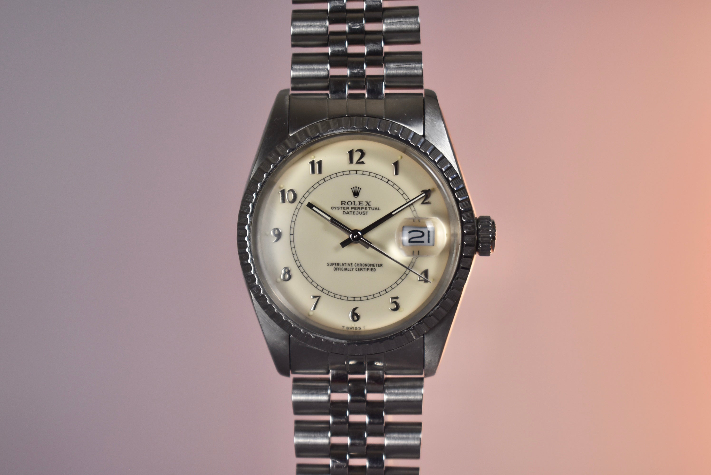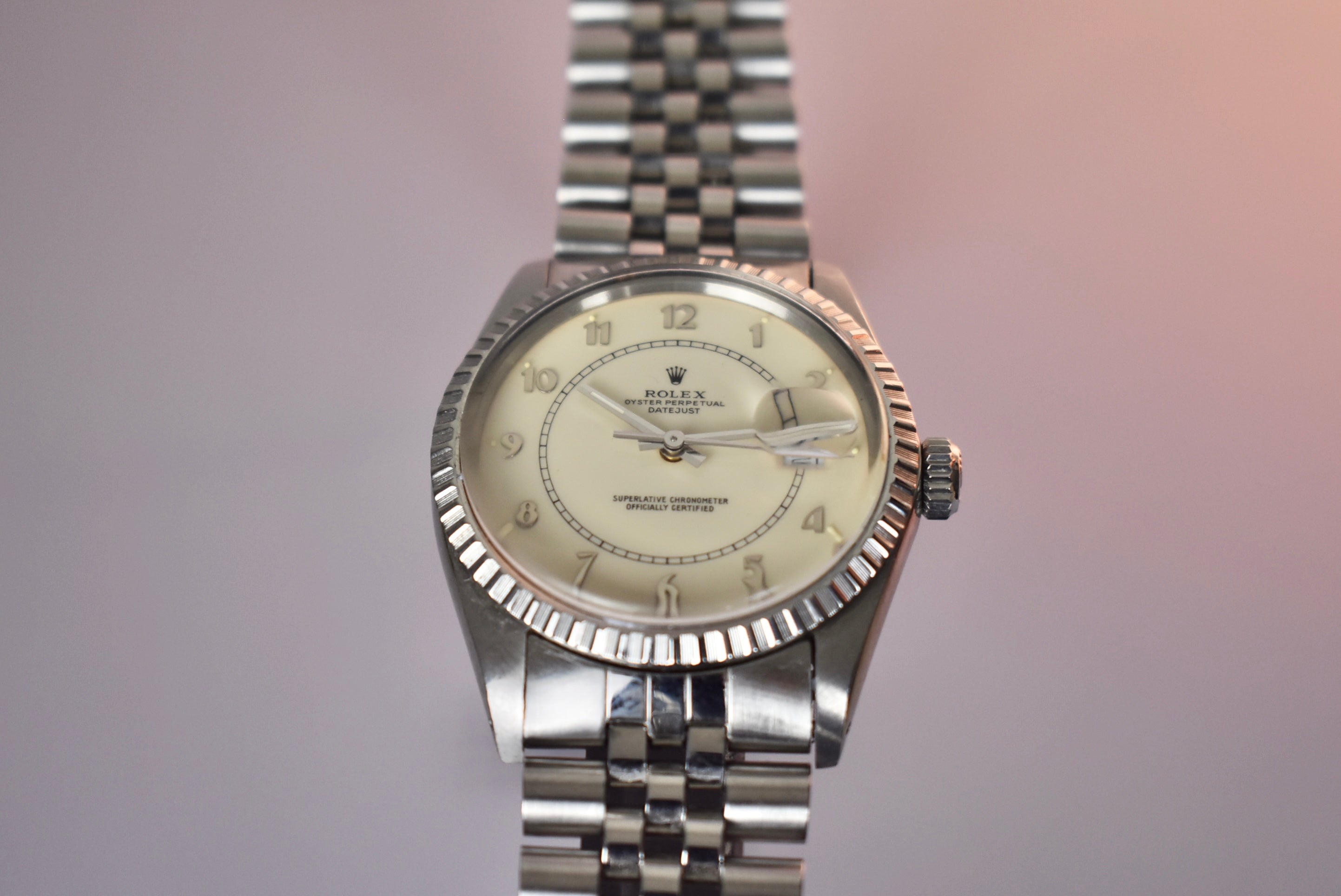 The Boiler Gauge Rolex dial is one not many know exists and there are also very few in the market. This example is the all steel with an ivory Boiler Gauge dial. The center track mark and classy numerals make this watch very unique compared to other Datejust. The watch also comes with box and papers and the original receipt from Gobbi in Milano.