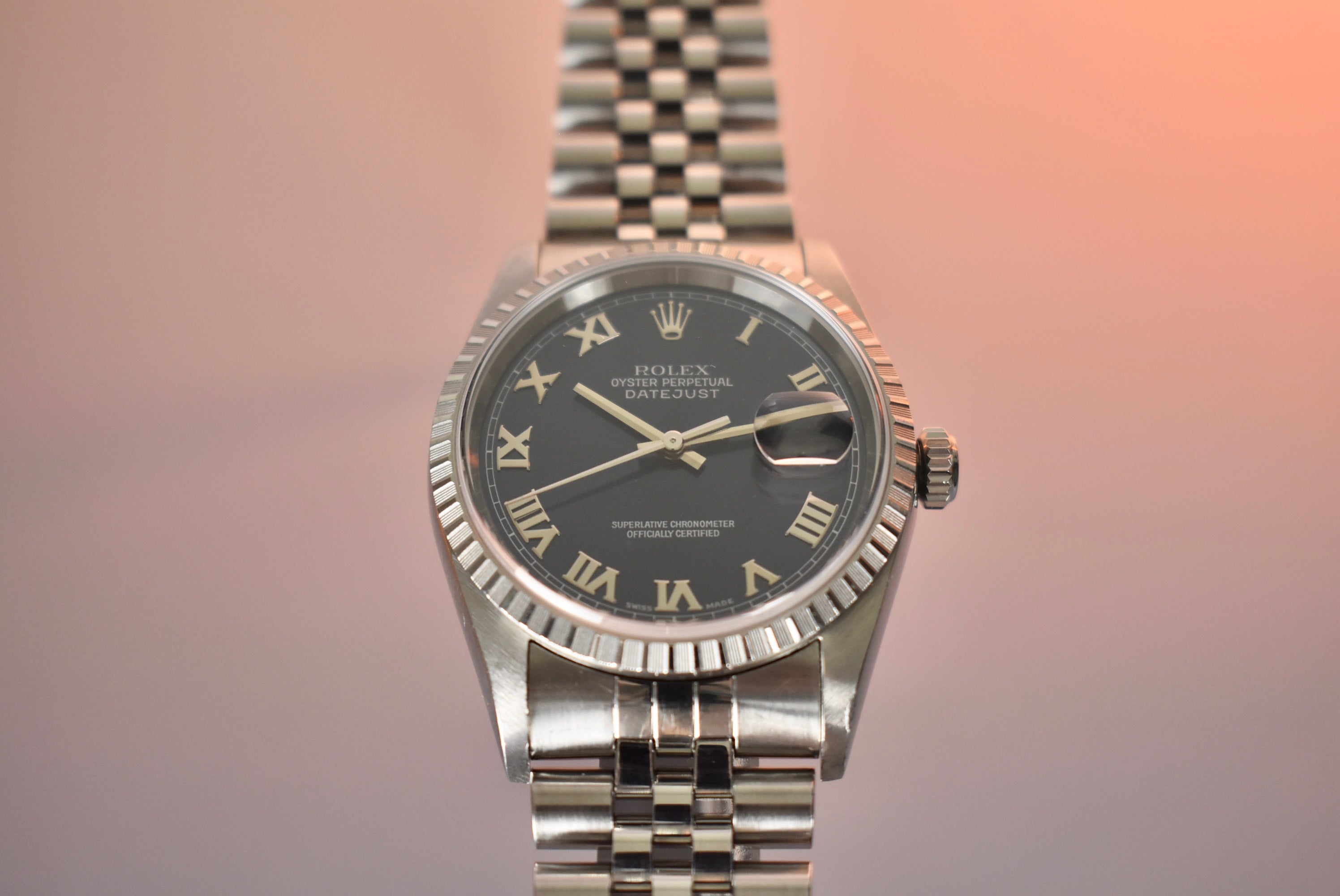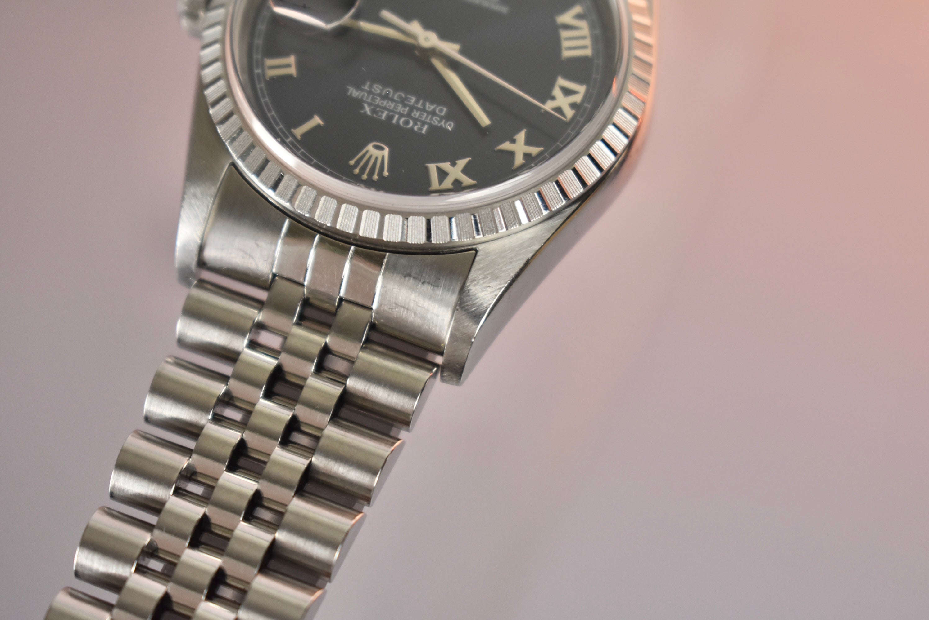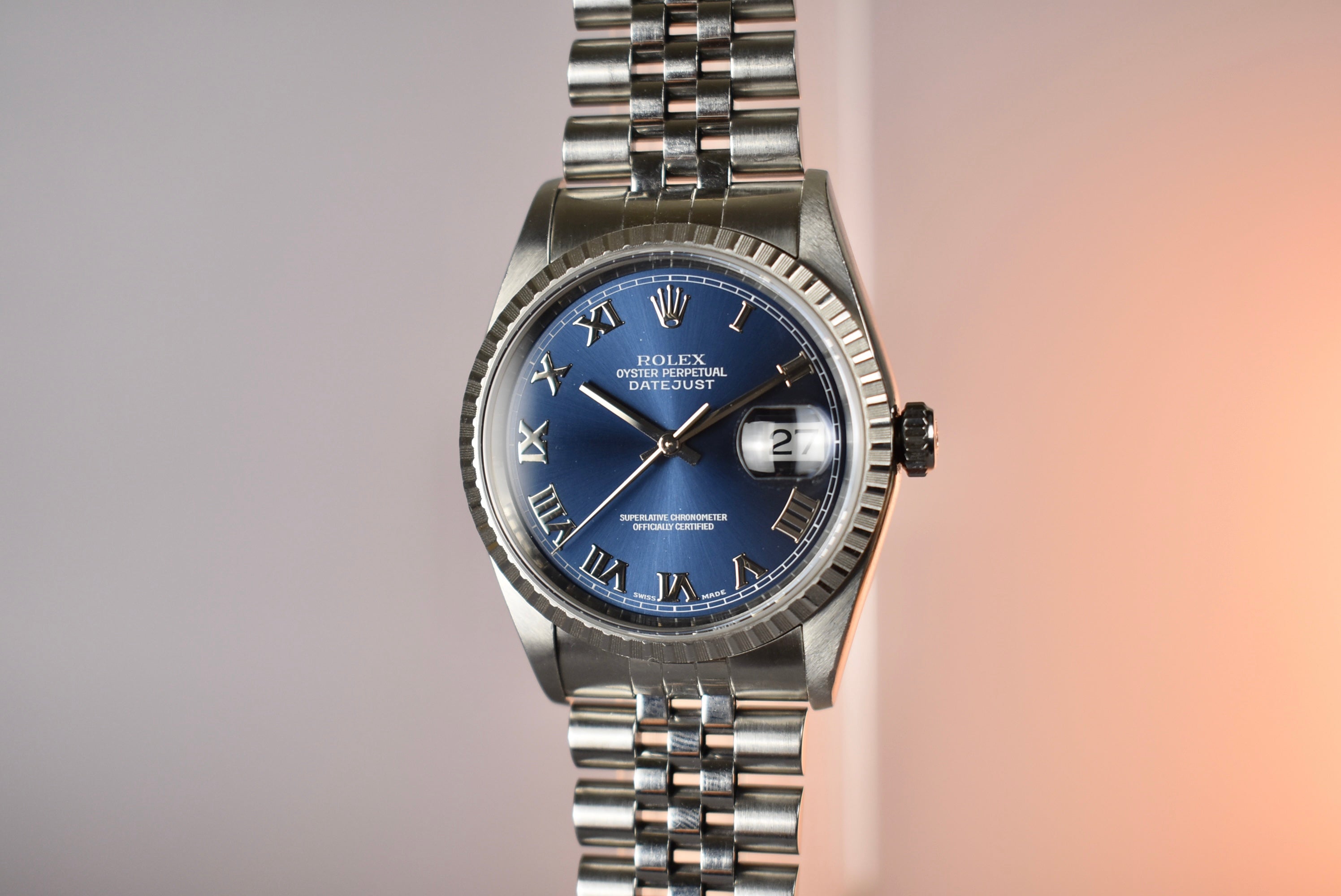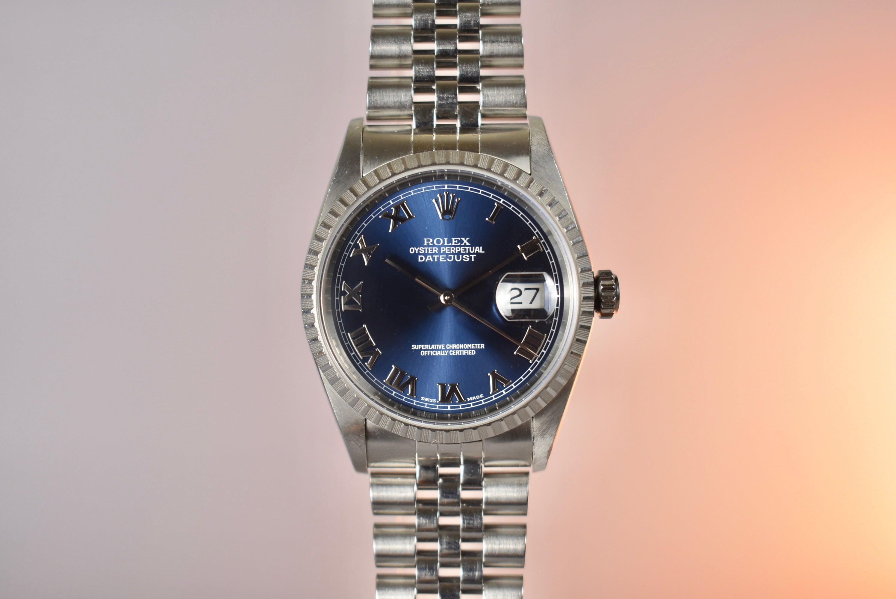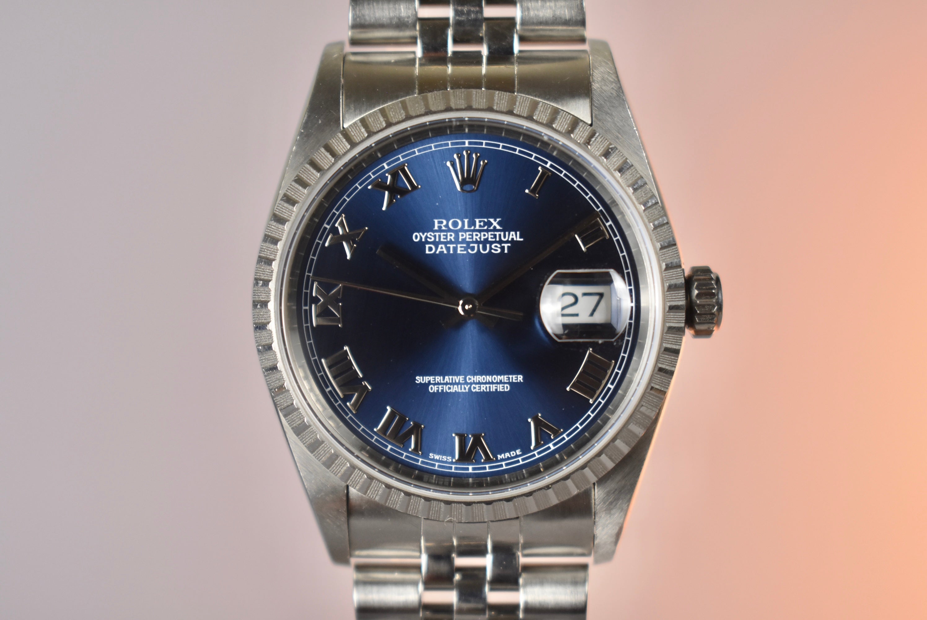 Blue is always a go two in the Rolex space. This 16220 comes with a stunning Blue Roman dial. The engine turned bezel makes this a bit more unique then the fluted bezel 16234 and works perfectly with the applied numerals.