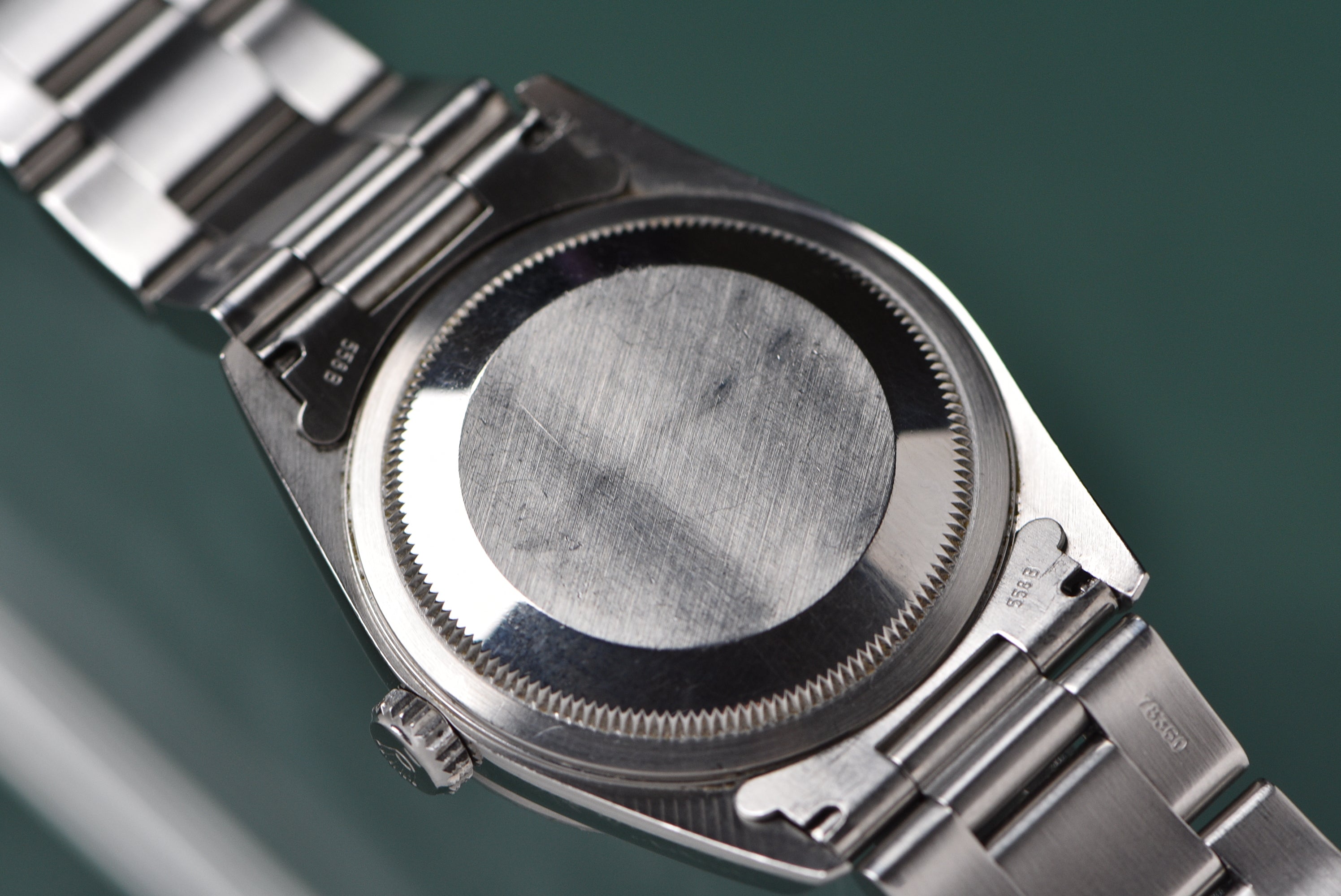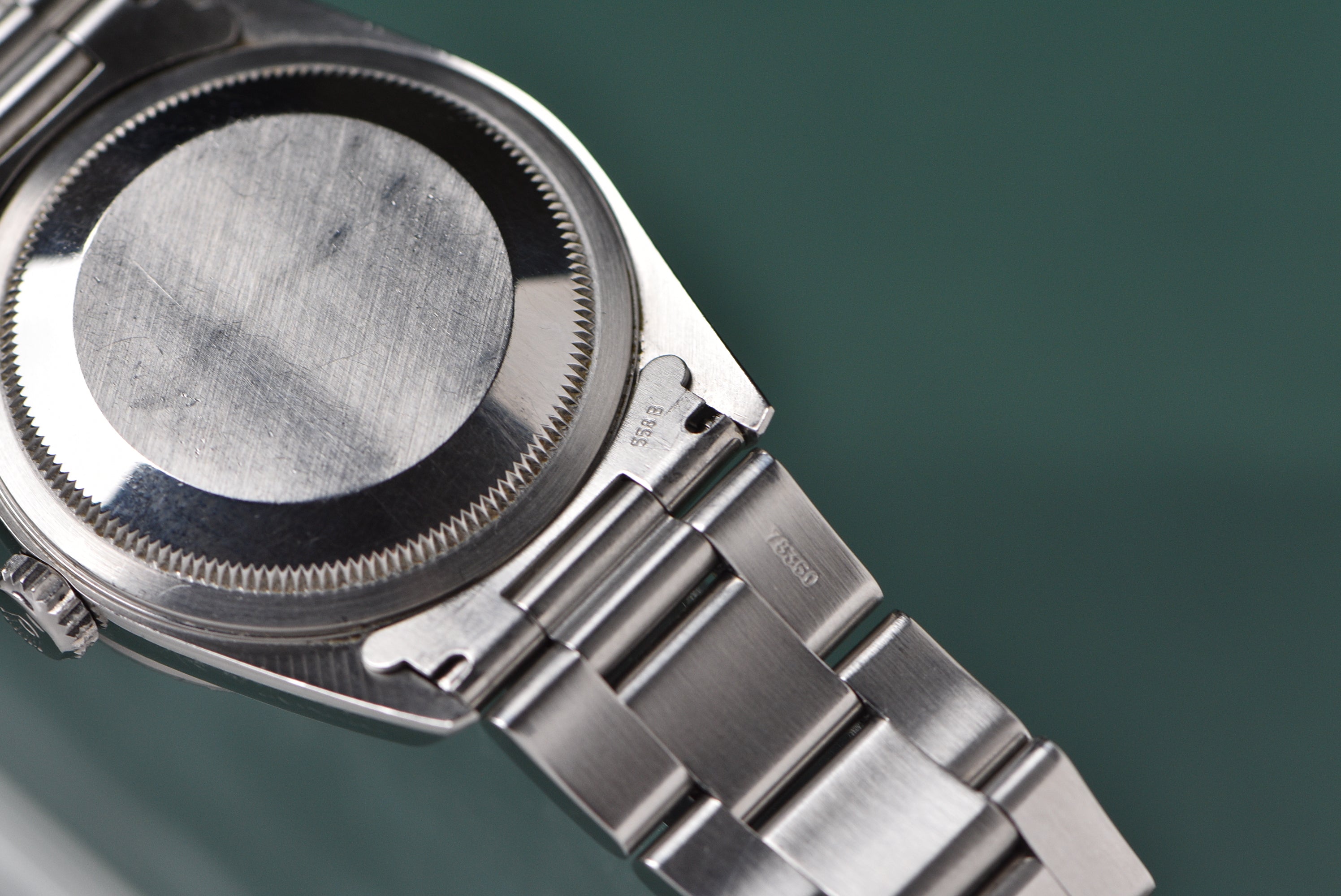 The case and bracelet are unpolished and do show some signs of wear; however, there are no major dings or dents. The dial is in perfect condition with no signs of wear or aging. The watch is a K serial with the bracelet code stamped 'DT-1'.