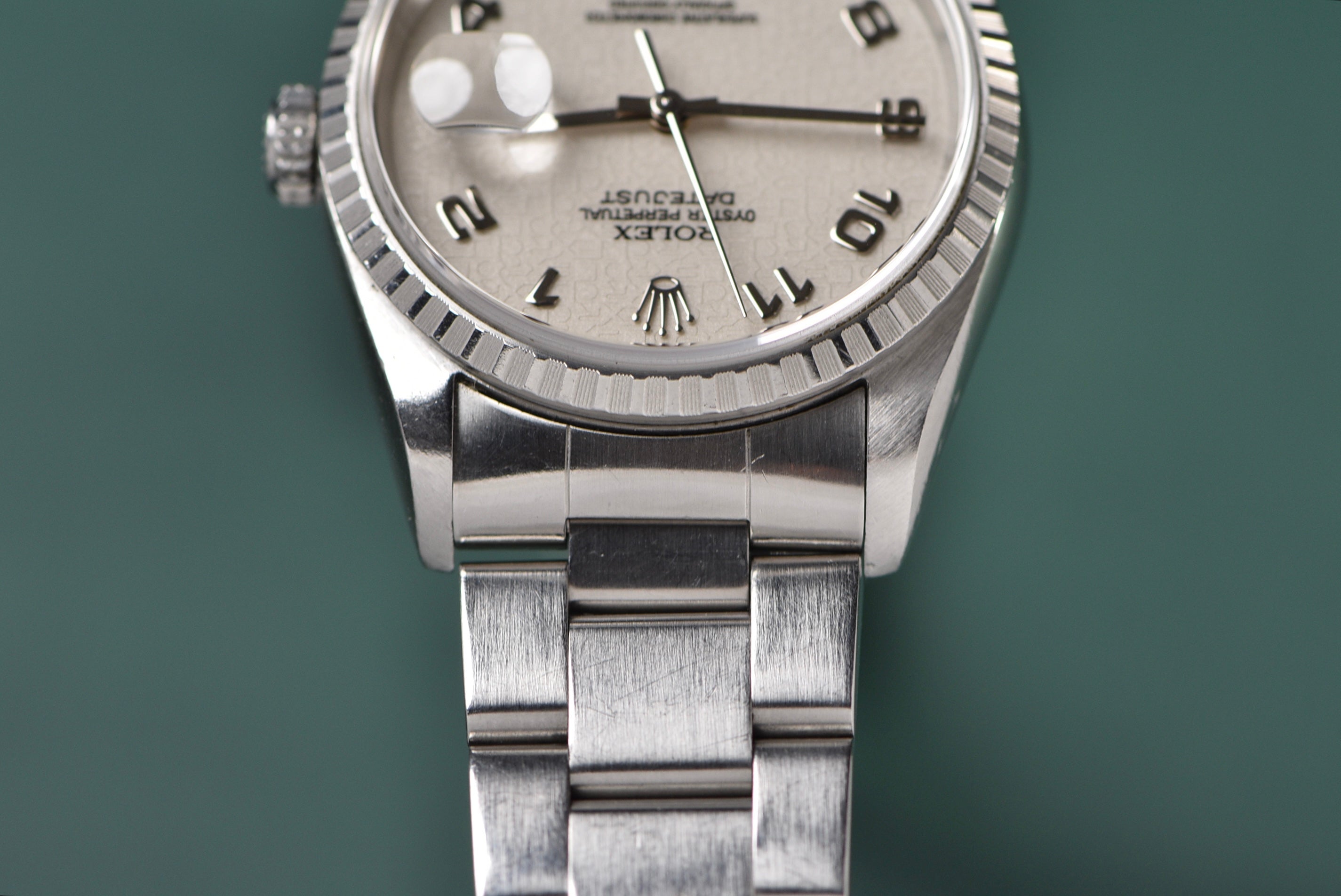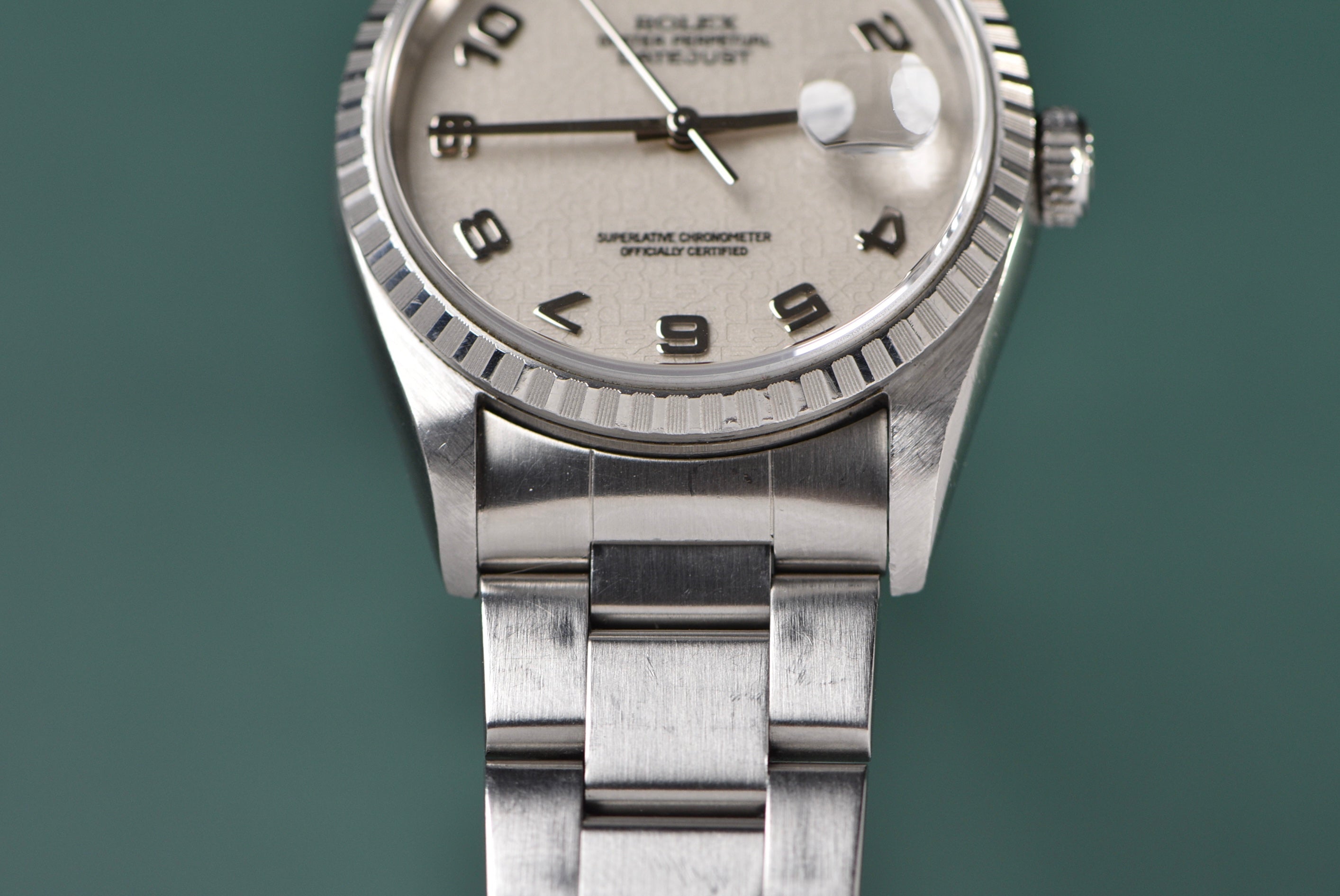 The Rolex Datejust is an icon and has seen hundreds if not thousands of variations and different designs. The reference 16220 was Rolex's idea of dressing down the Datejust. With an engine turn bezel and oyster bracelet, the Datejust gets a bit more sporty. This one is even cooler because of its dial. A rare Ivory Anniverary dial with large Arabic numerals. When it comes to Datejusts, this dial is one of the nicest ones from the 162xx era.